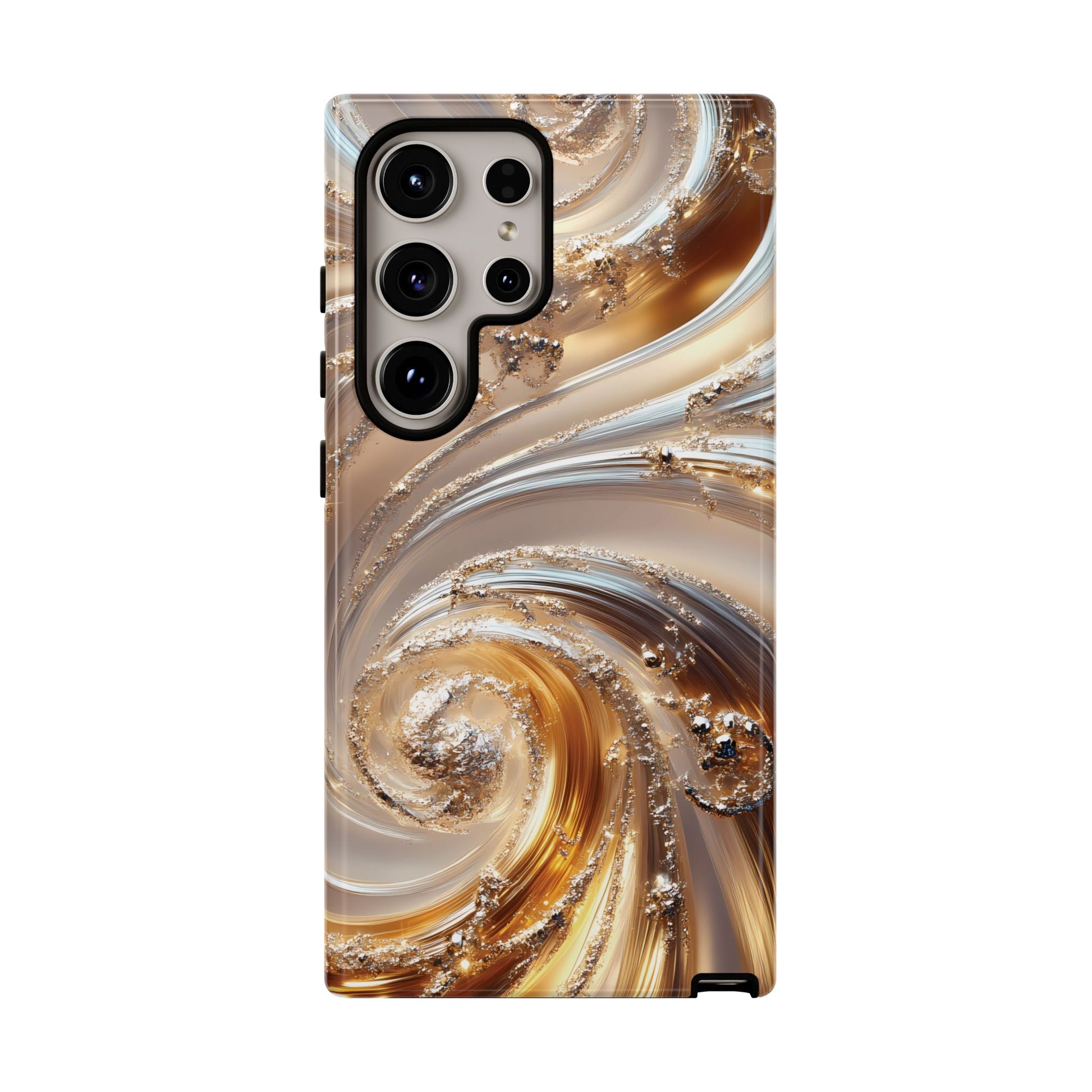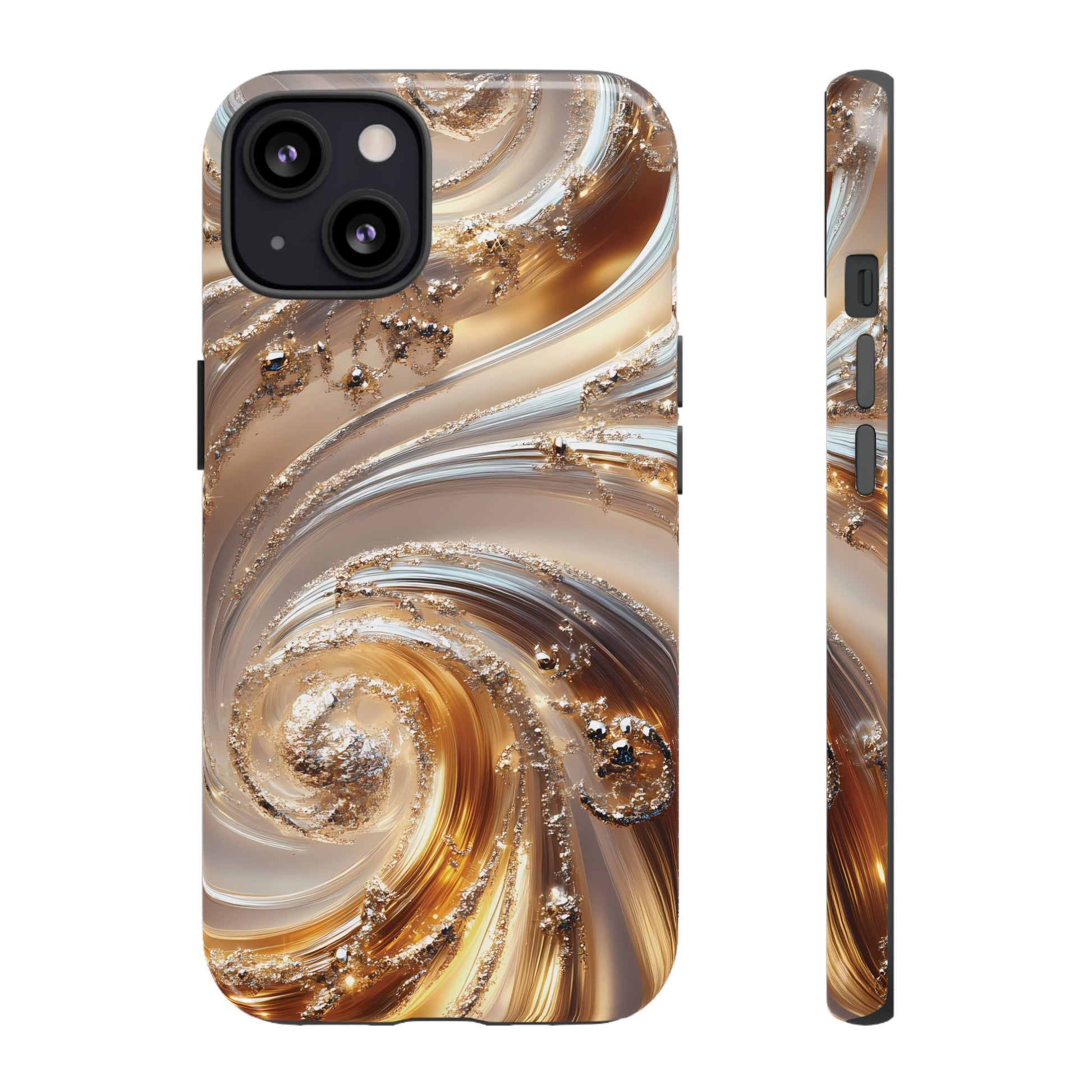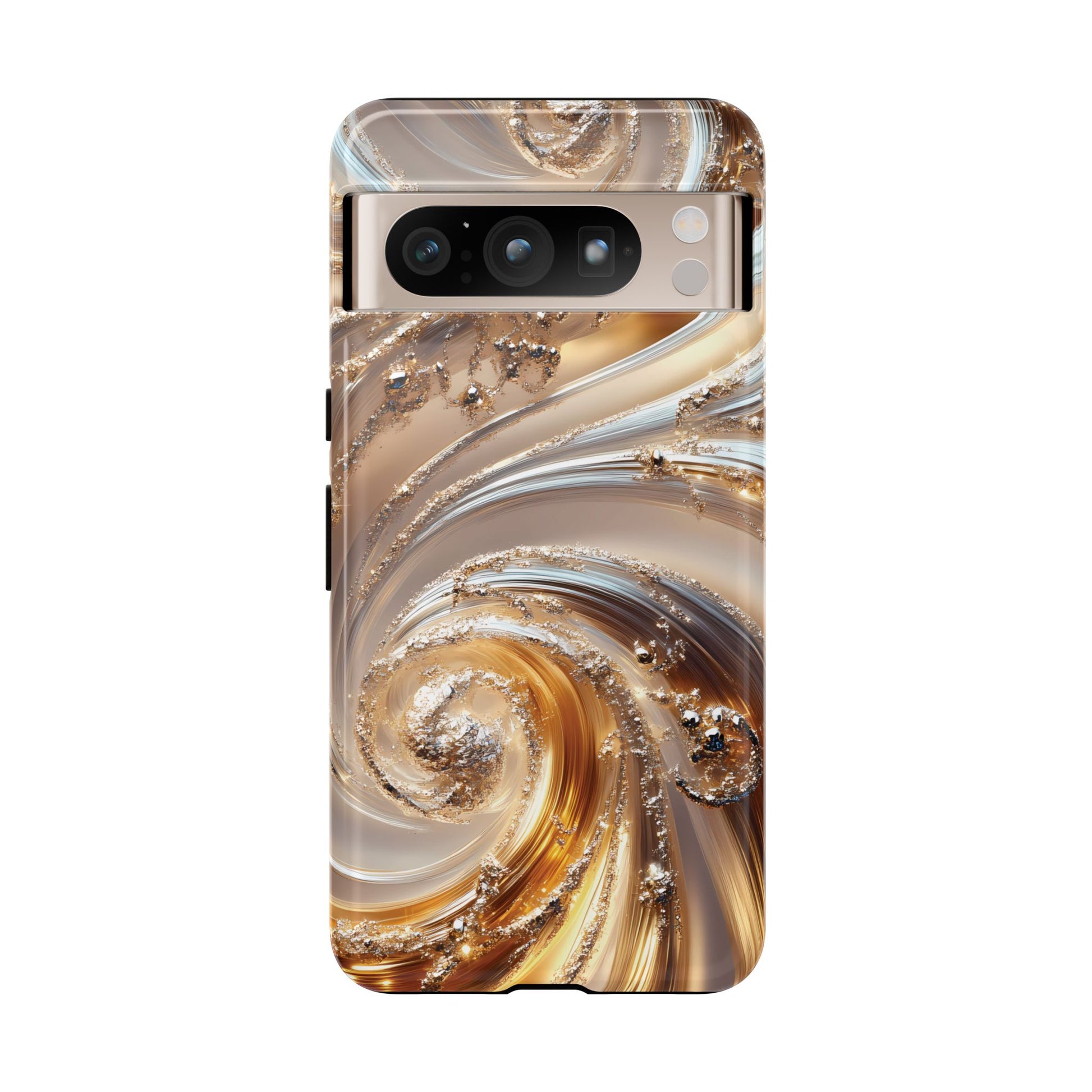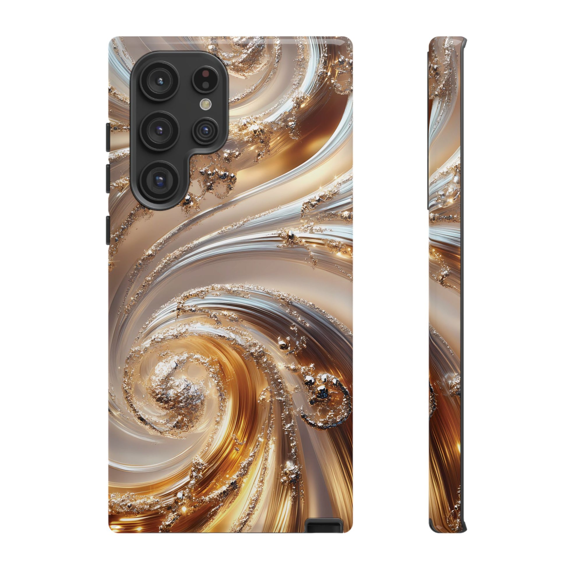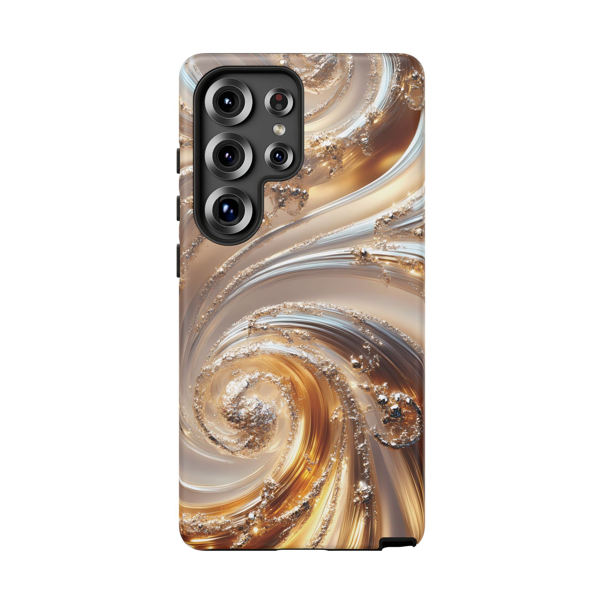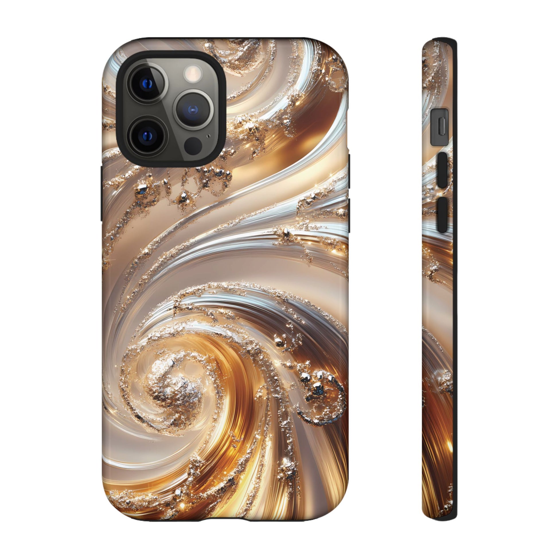 Inspired by modern luxury and high-end aesthetics, this phone case features photorealistic swirls of gold and platinum, set against a softly illuminated backdrop. A must-have for lovers of elegant, refined style.
