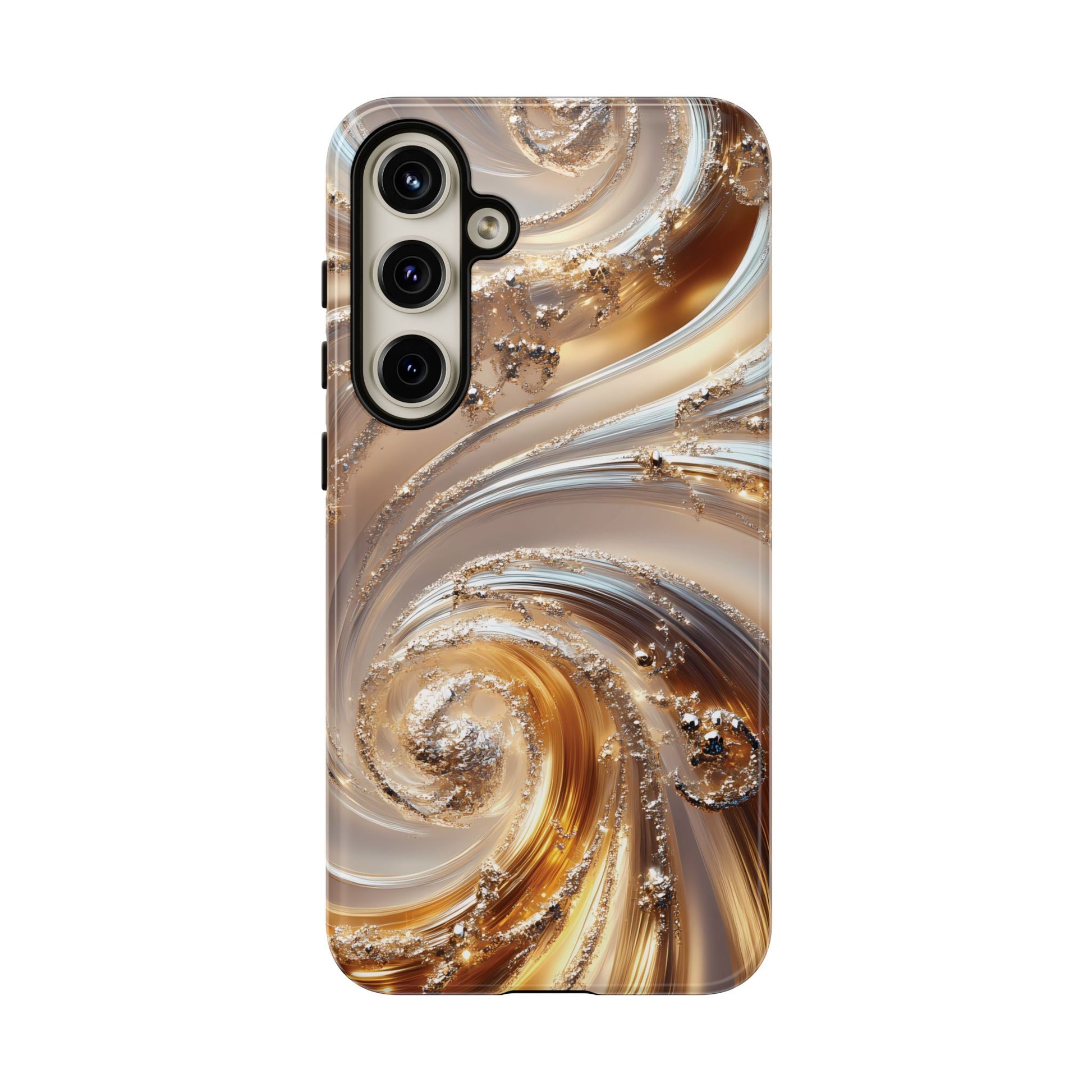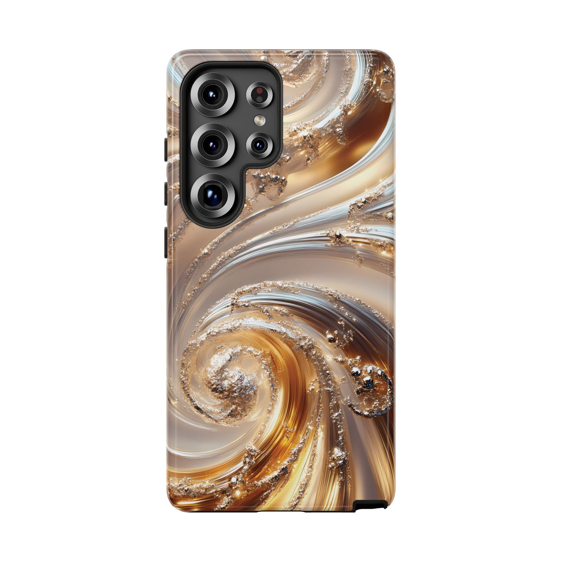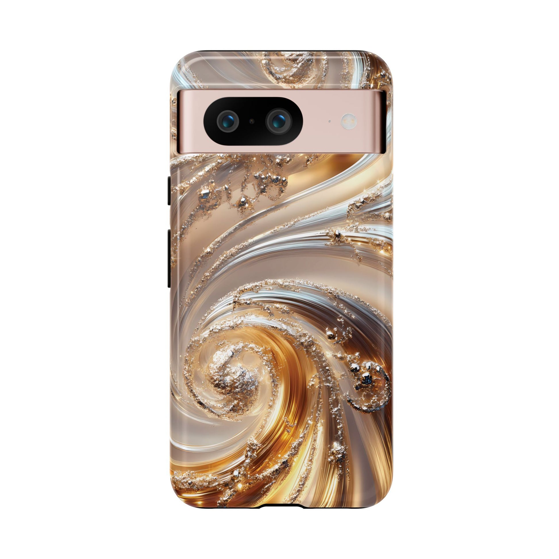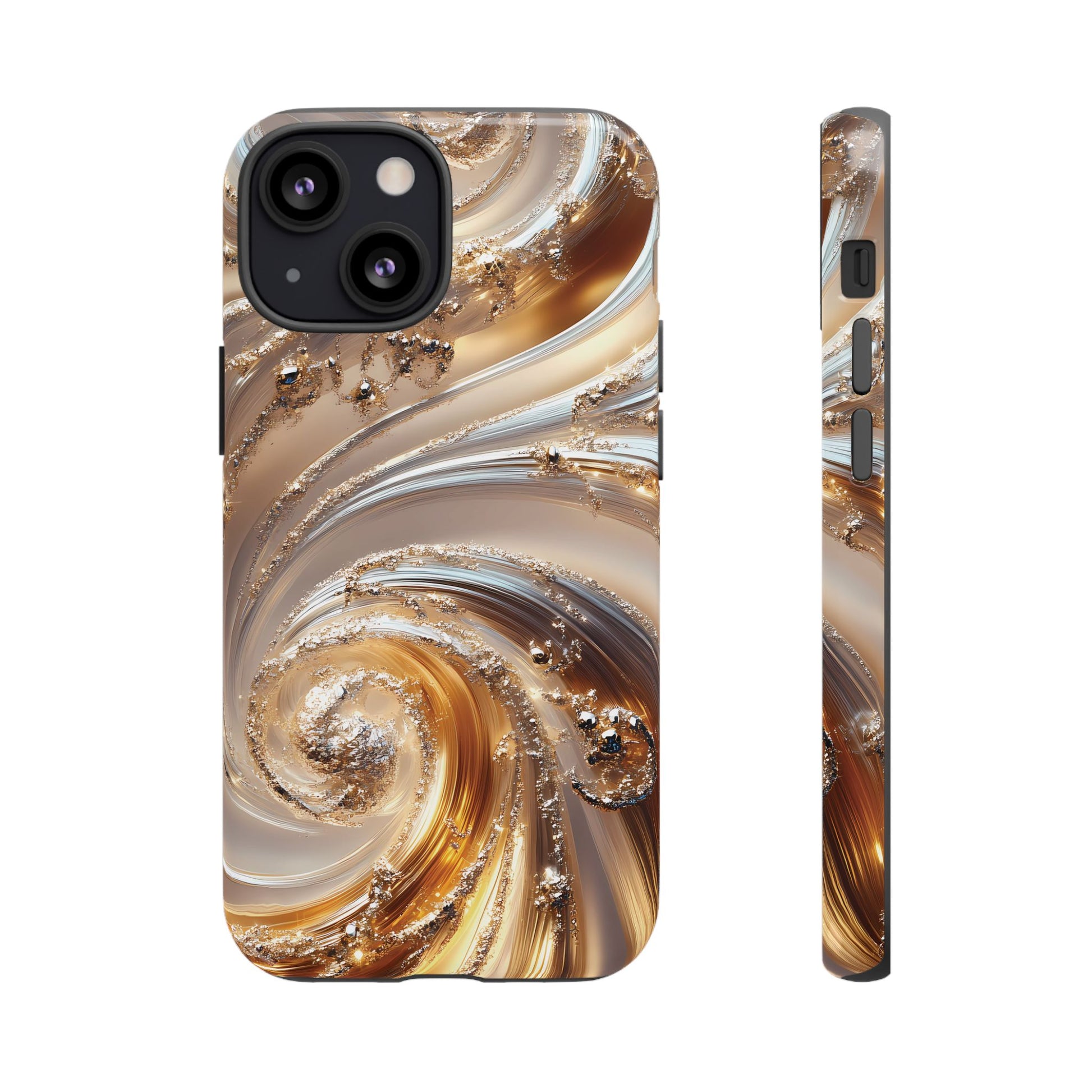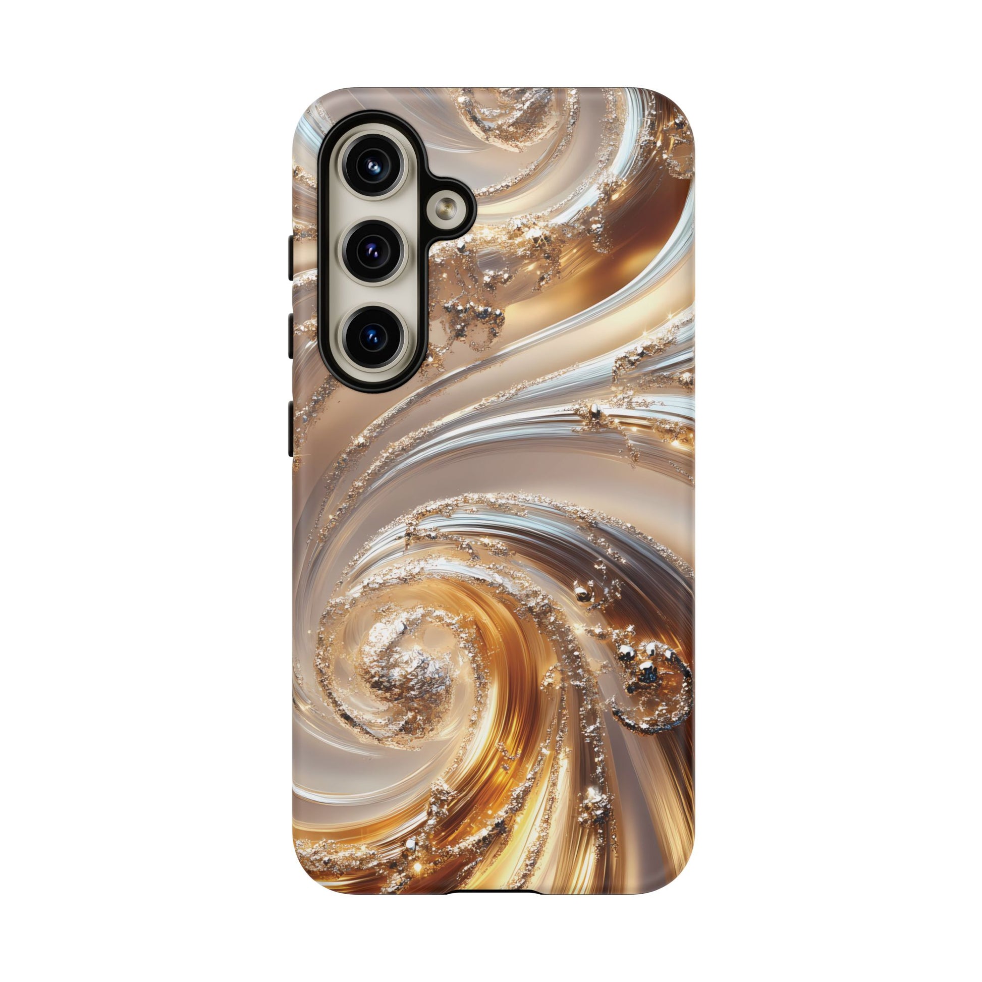 Inspired by modern luxury and high-end aesthetics, this phone case features photorealistic swirls of gold and platinum, set against a softly illuminated backdrop. A must-have for lovers of elegant, refined style.