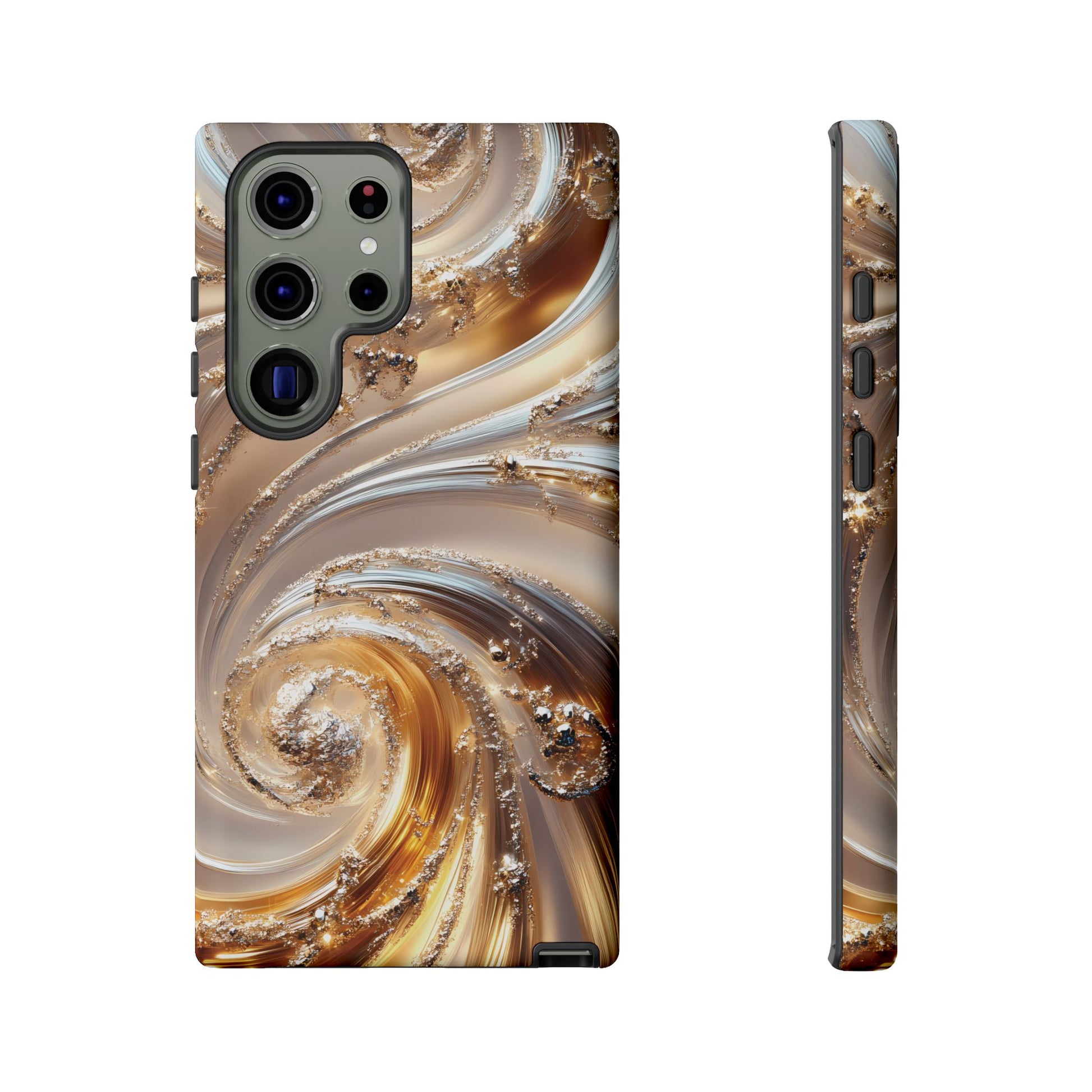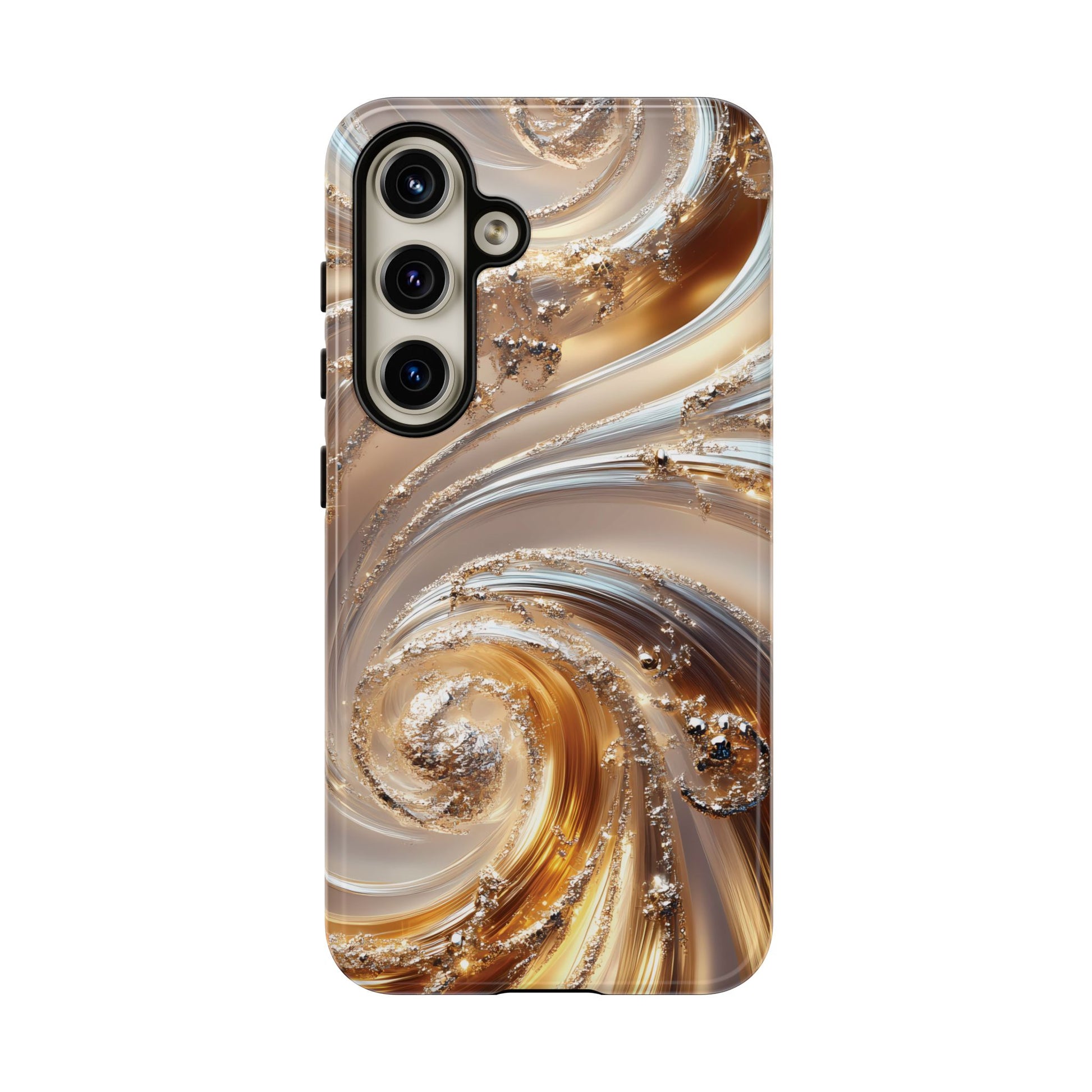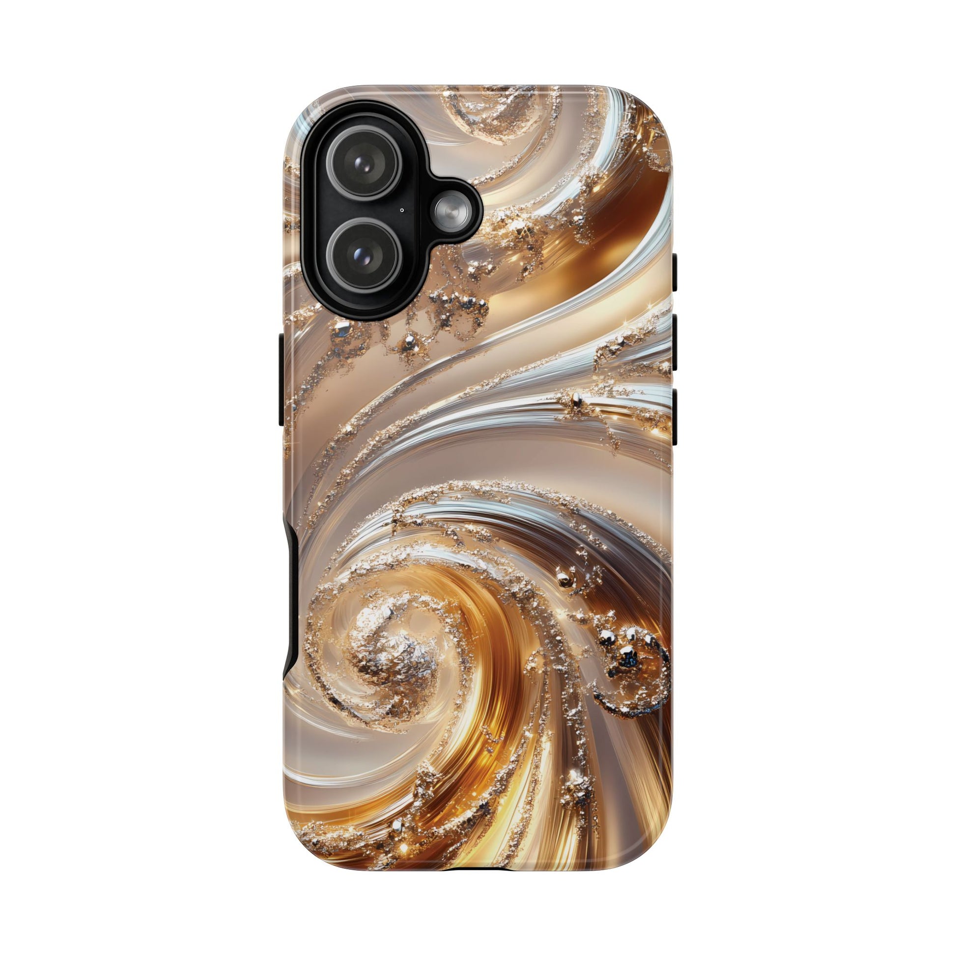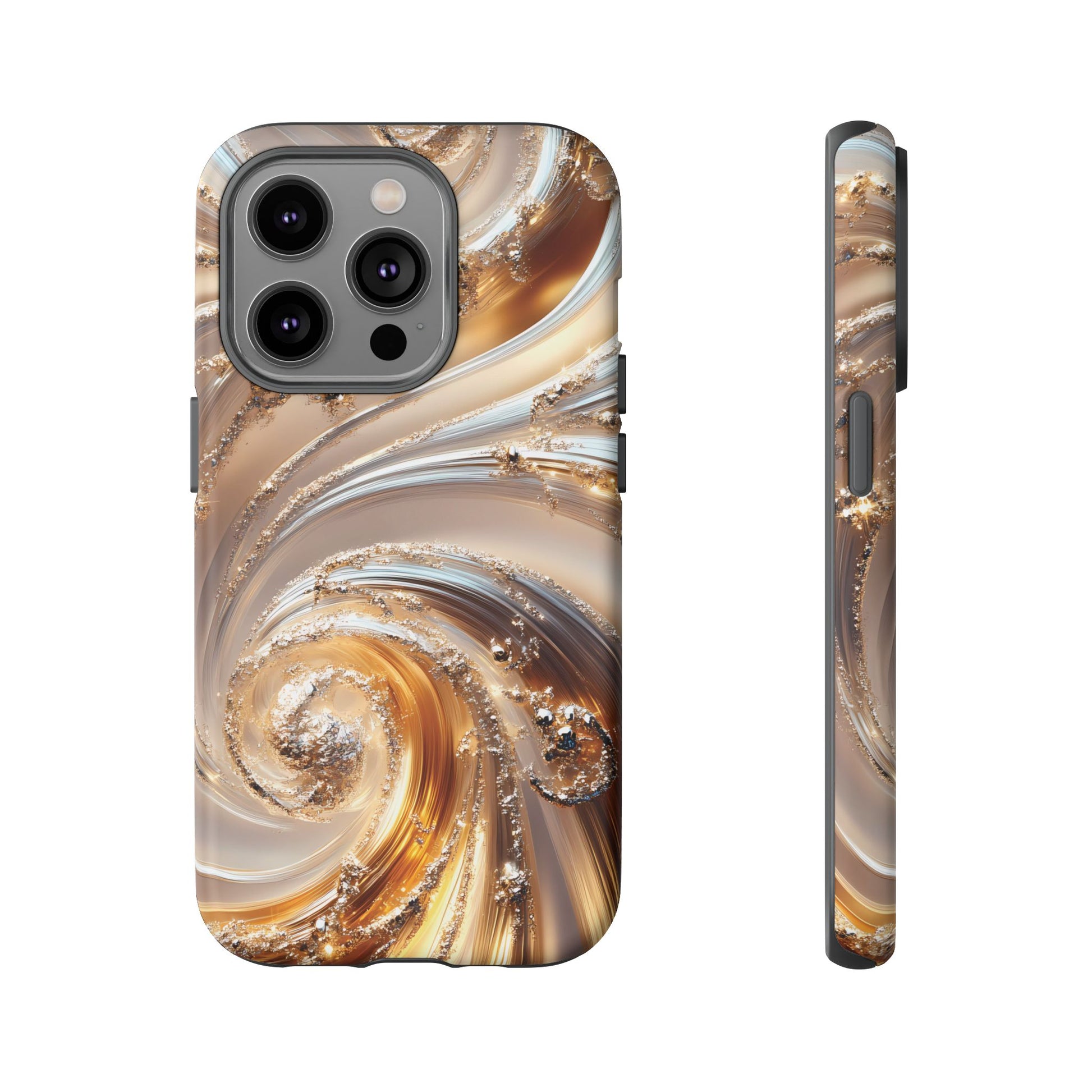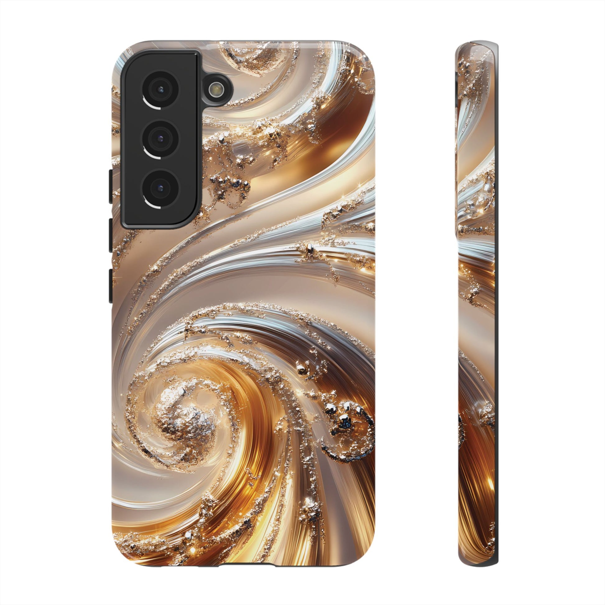 Inspired by modern luxury and high-end aesthetics, this phone case features photorealistic swirls of gold and platinum, set against a softly illuminated backdrop. A must-have for lovers of elegant, refined style.