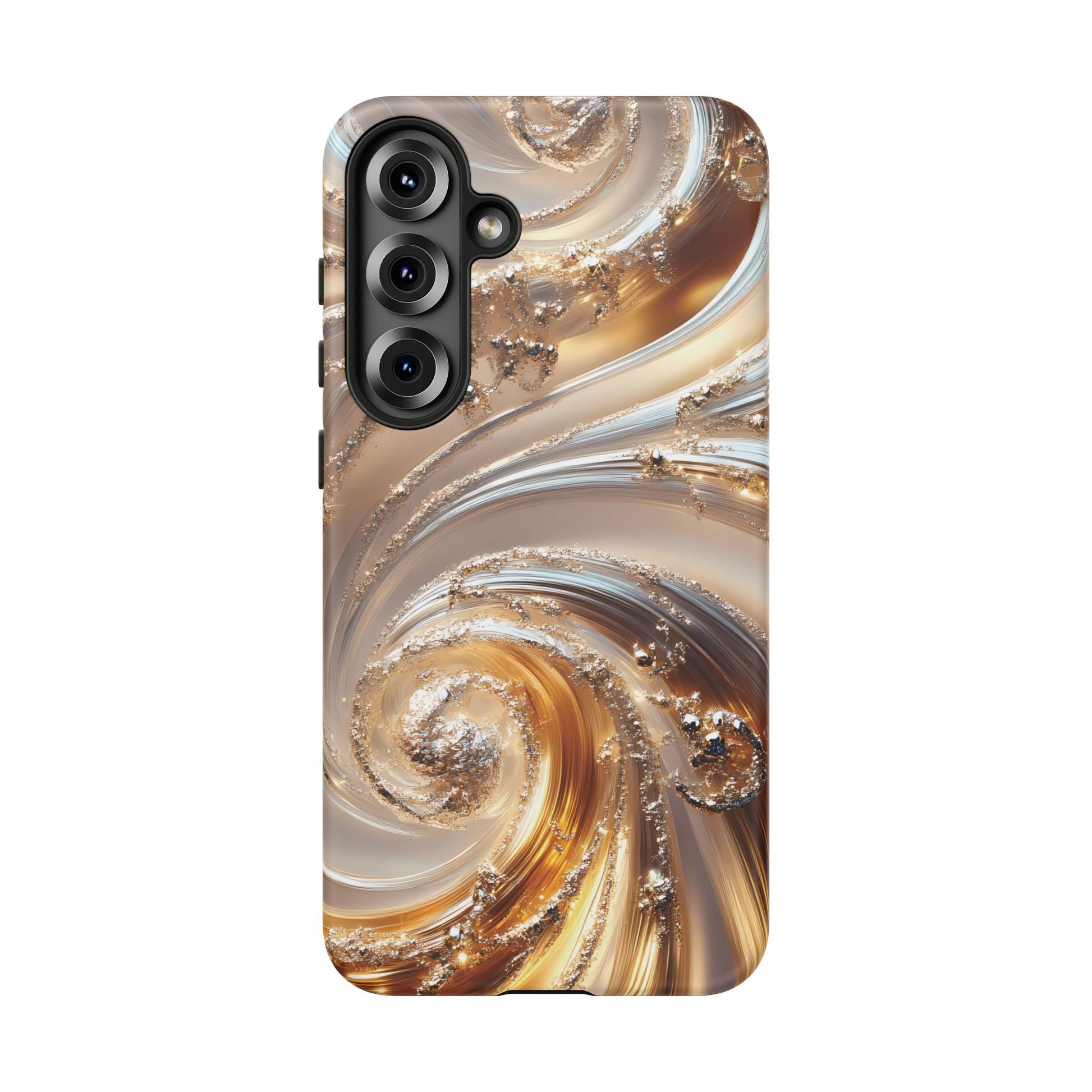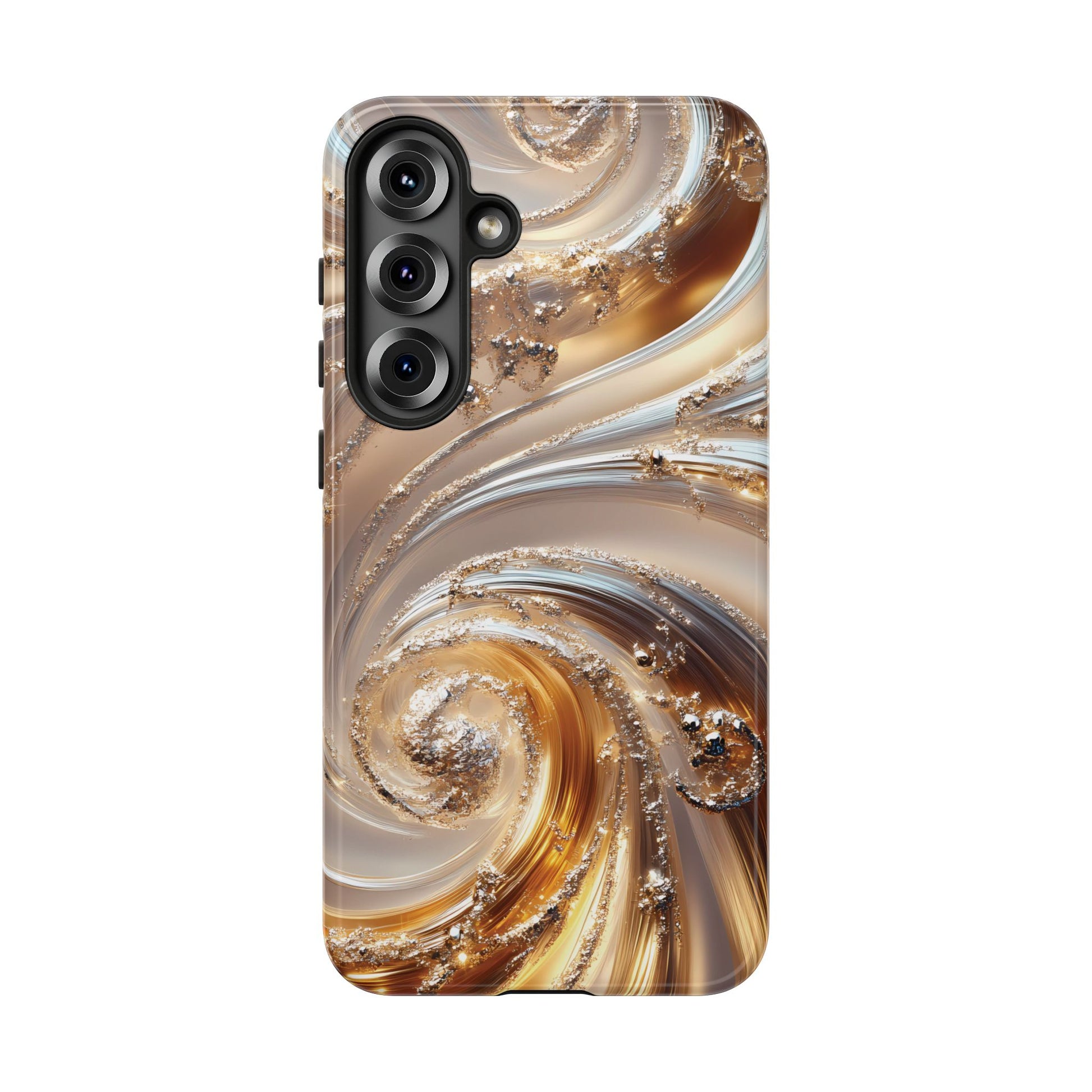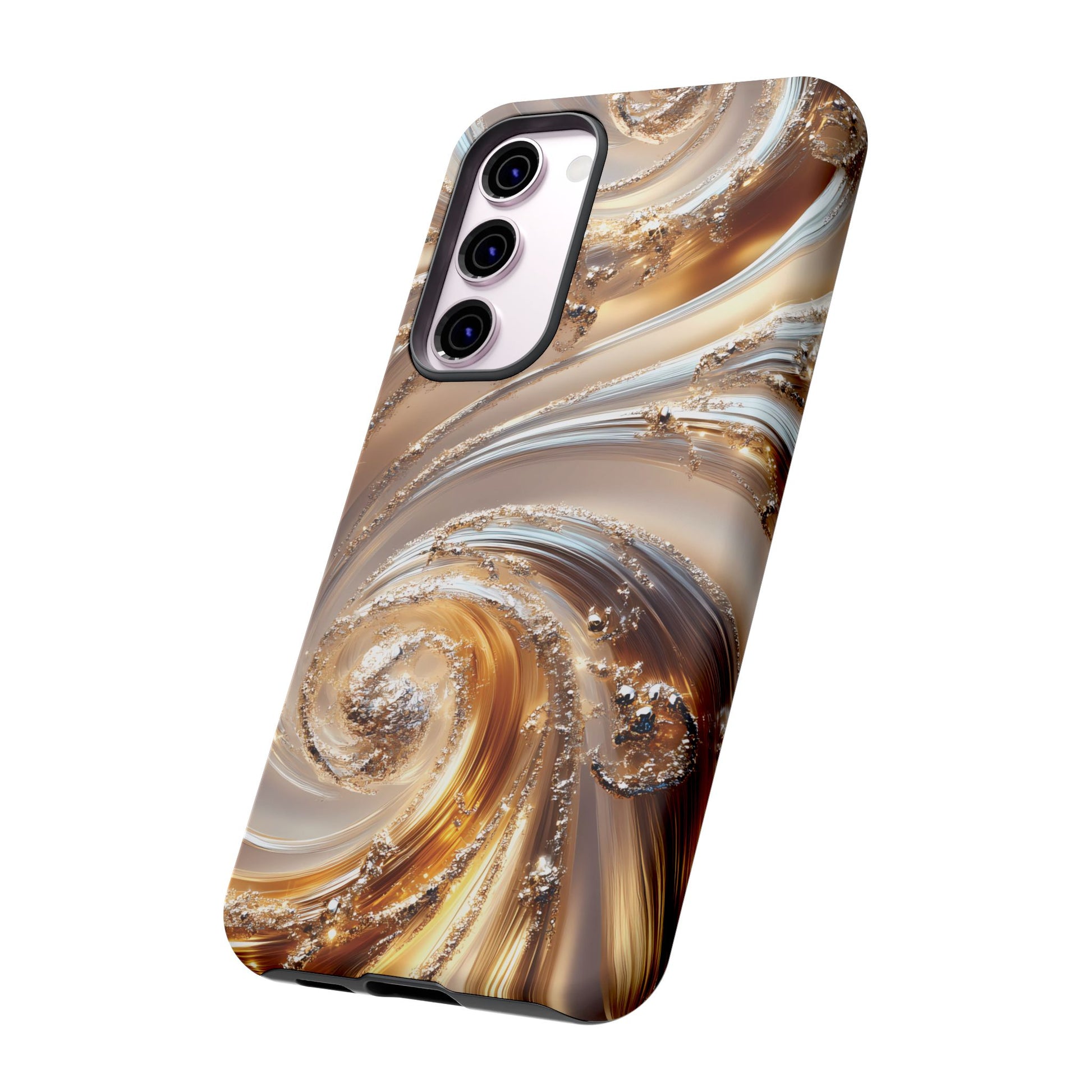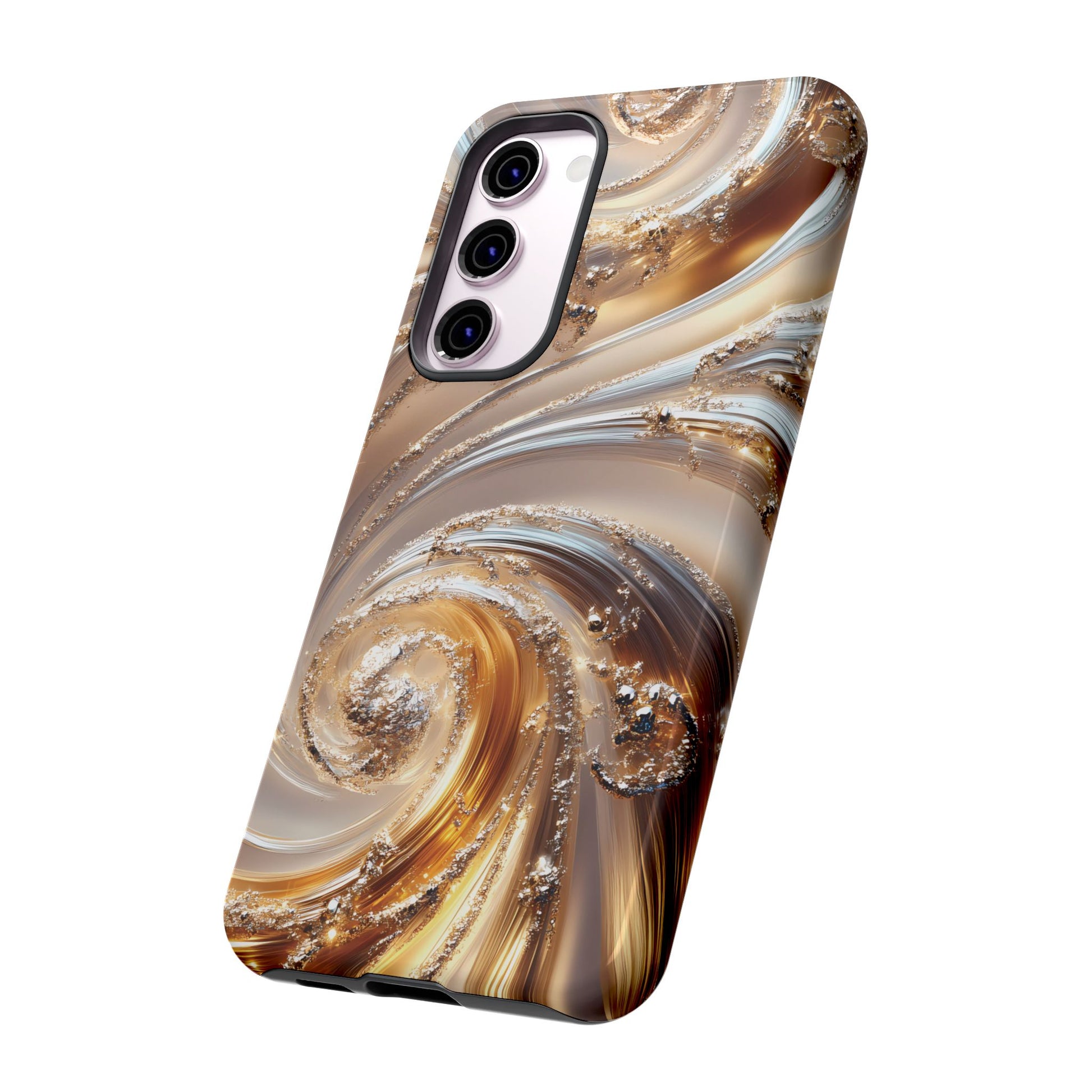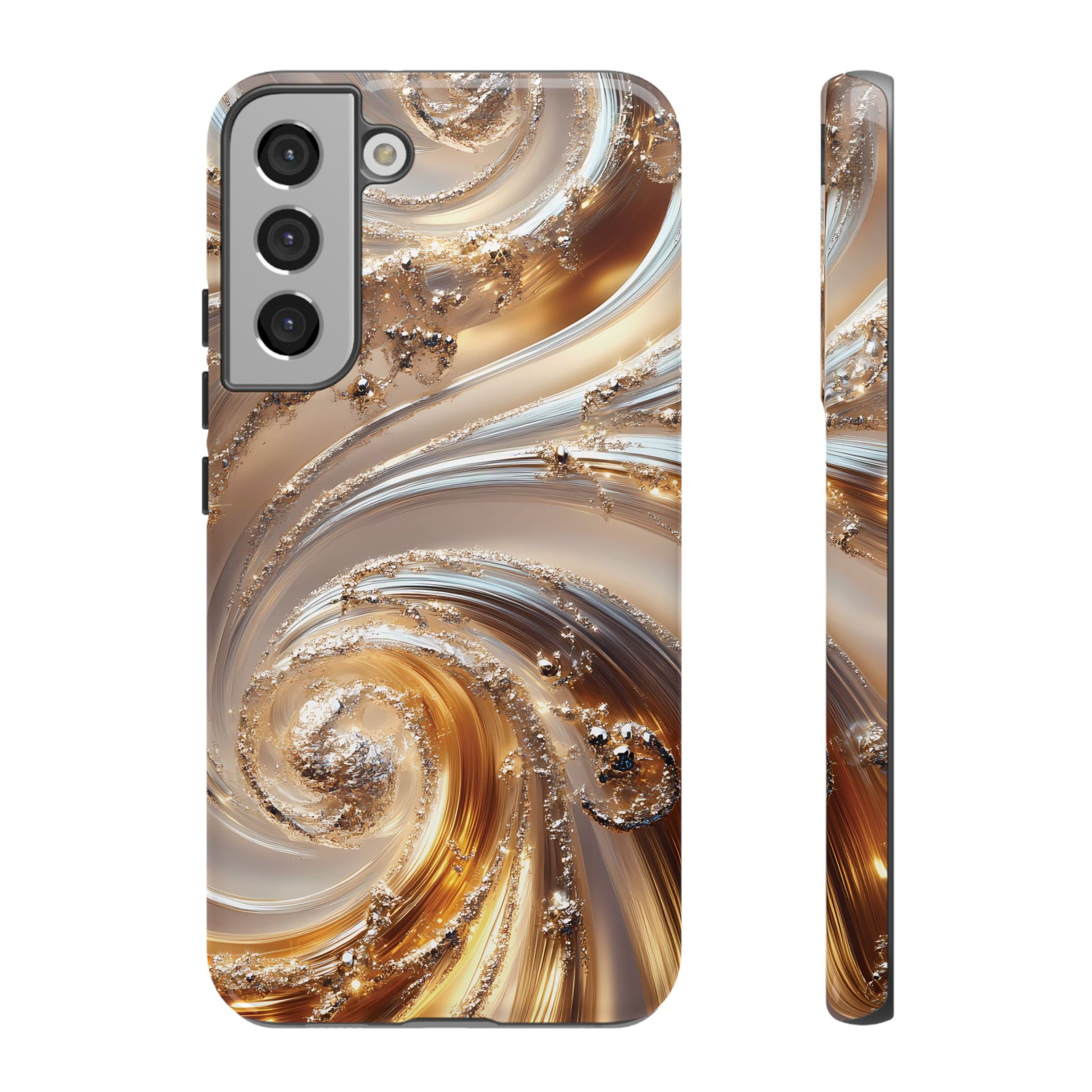 Inspired by modern luxury and high-end aesthetics, this phone case features photorealistic swirls of gold and platinum, set against a softly illuminated backdrop. A must-have for lovers of elegant, refined style.