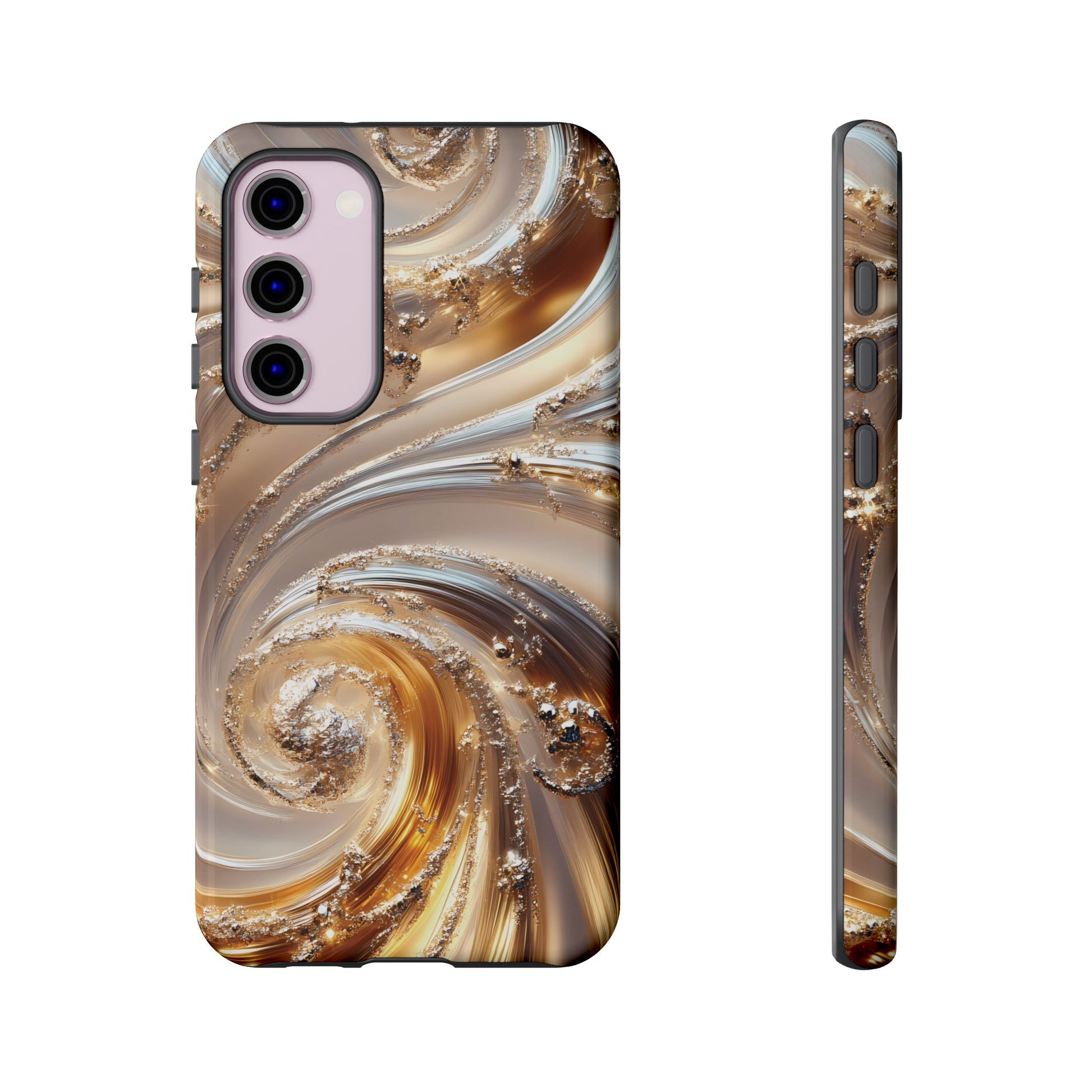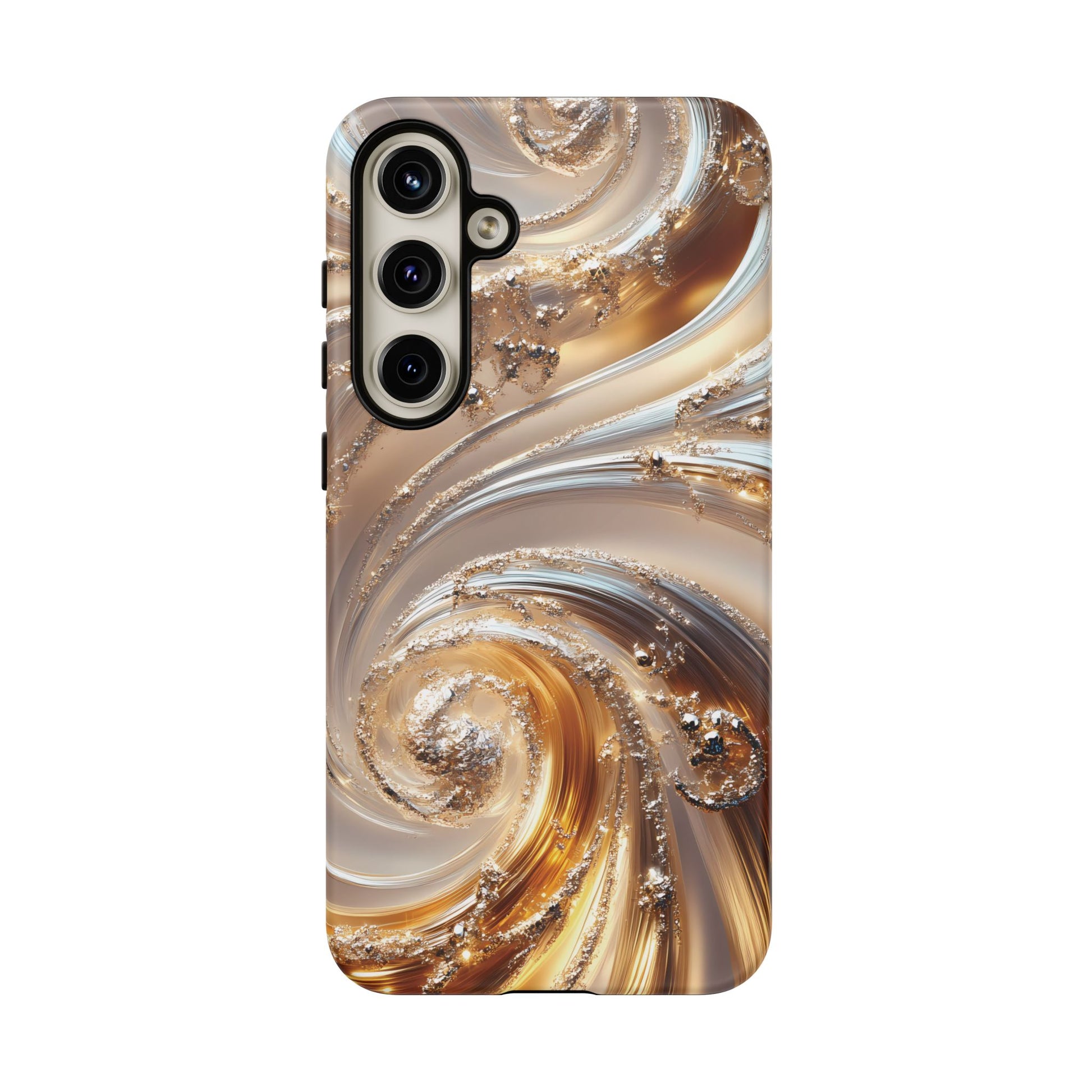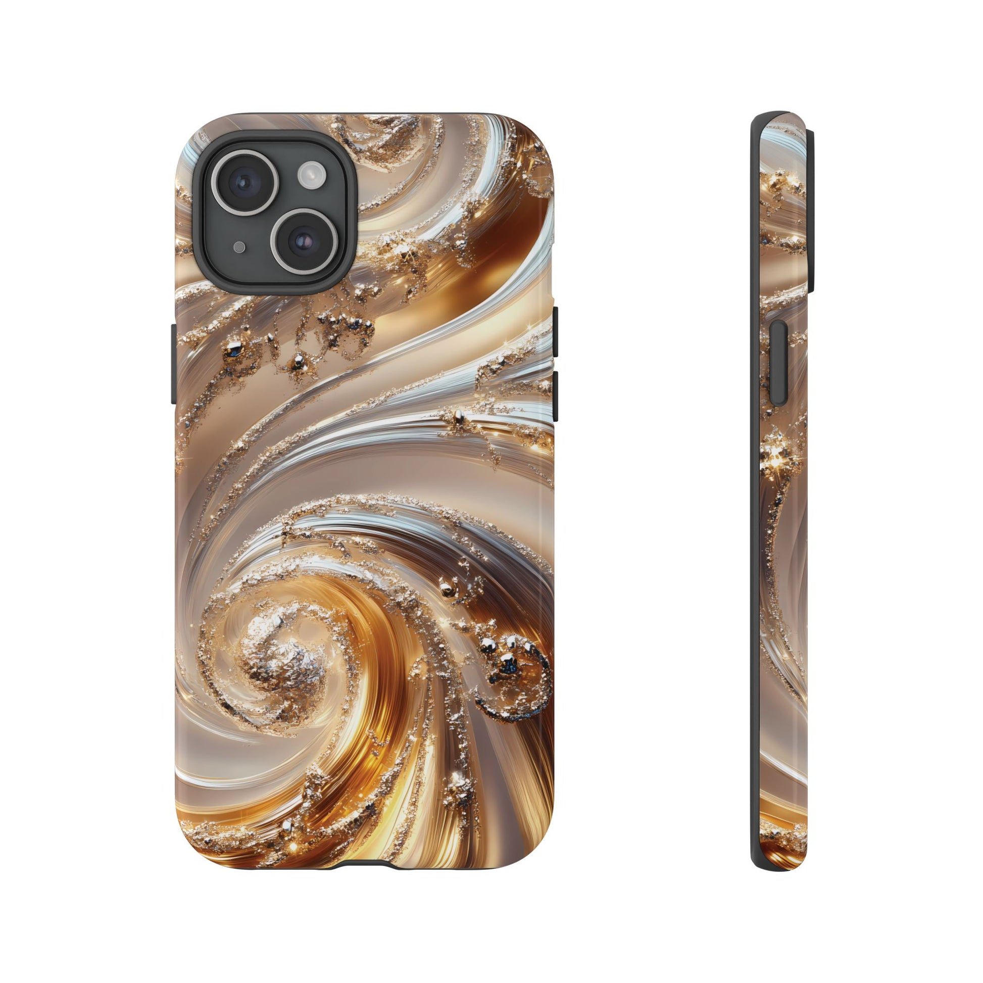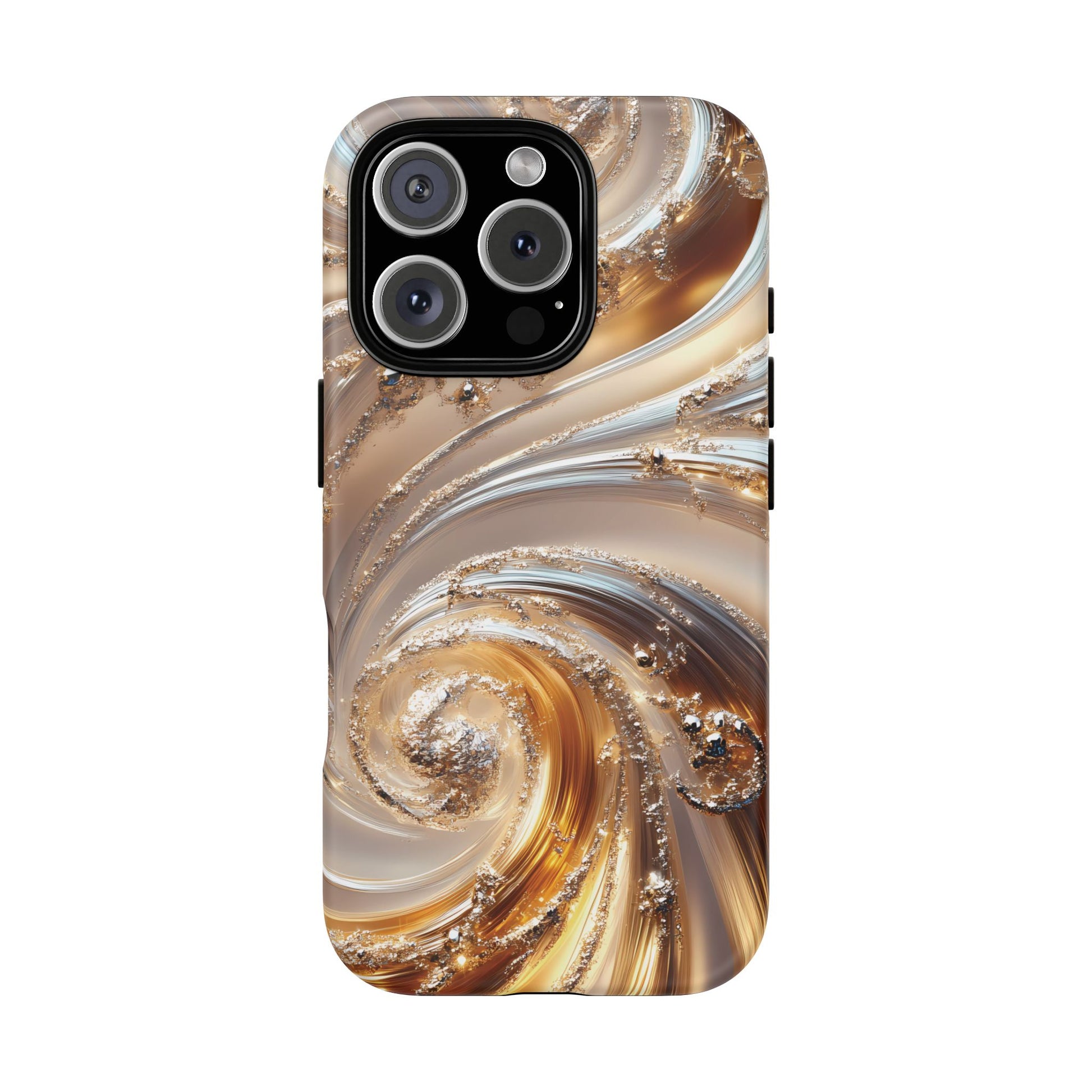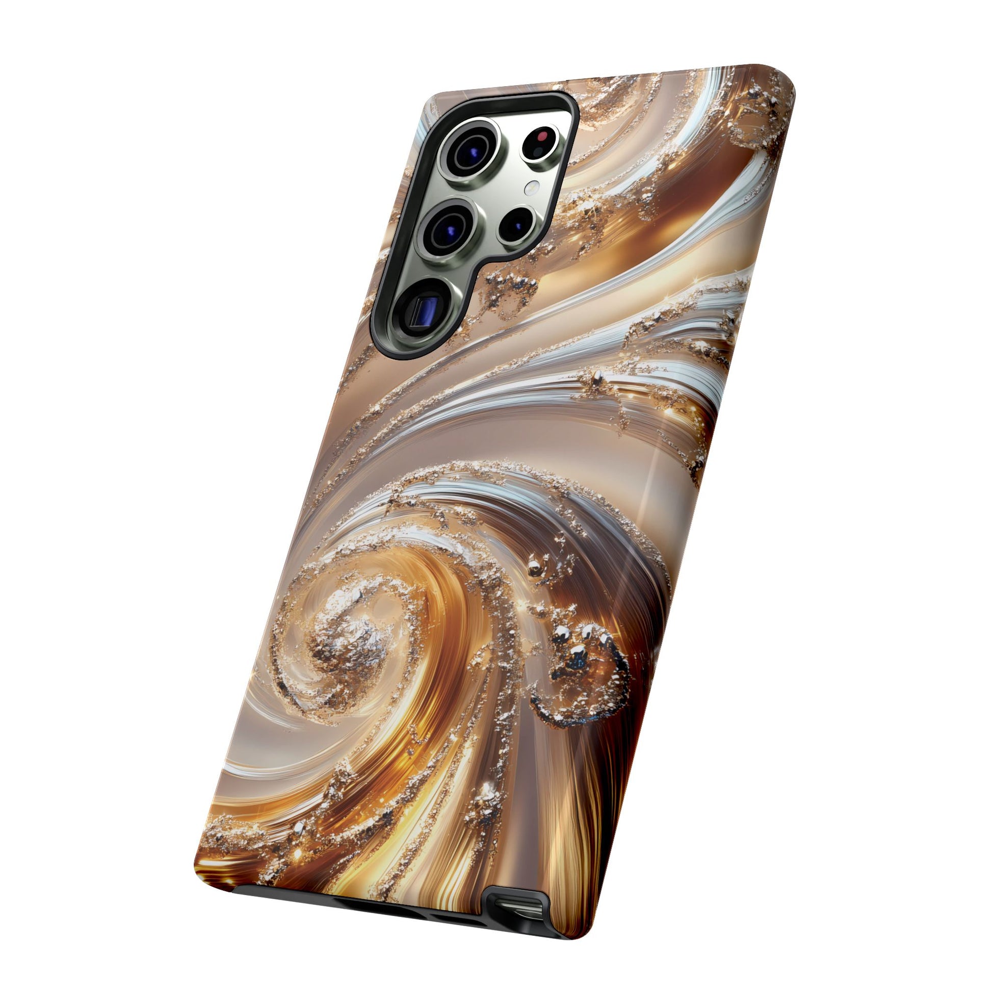Inspired by modern luxury and high-end aesthetics, this phone case features photorealistic swirls of gold and platinum, set against a softly illuminated backdrop. A must-have for lovers of elegant, refined style.