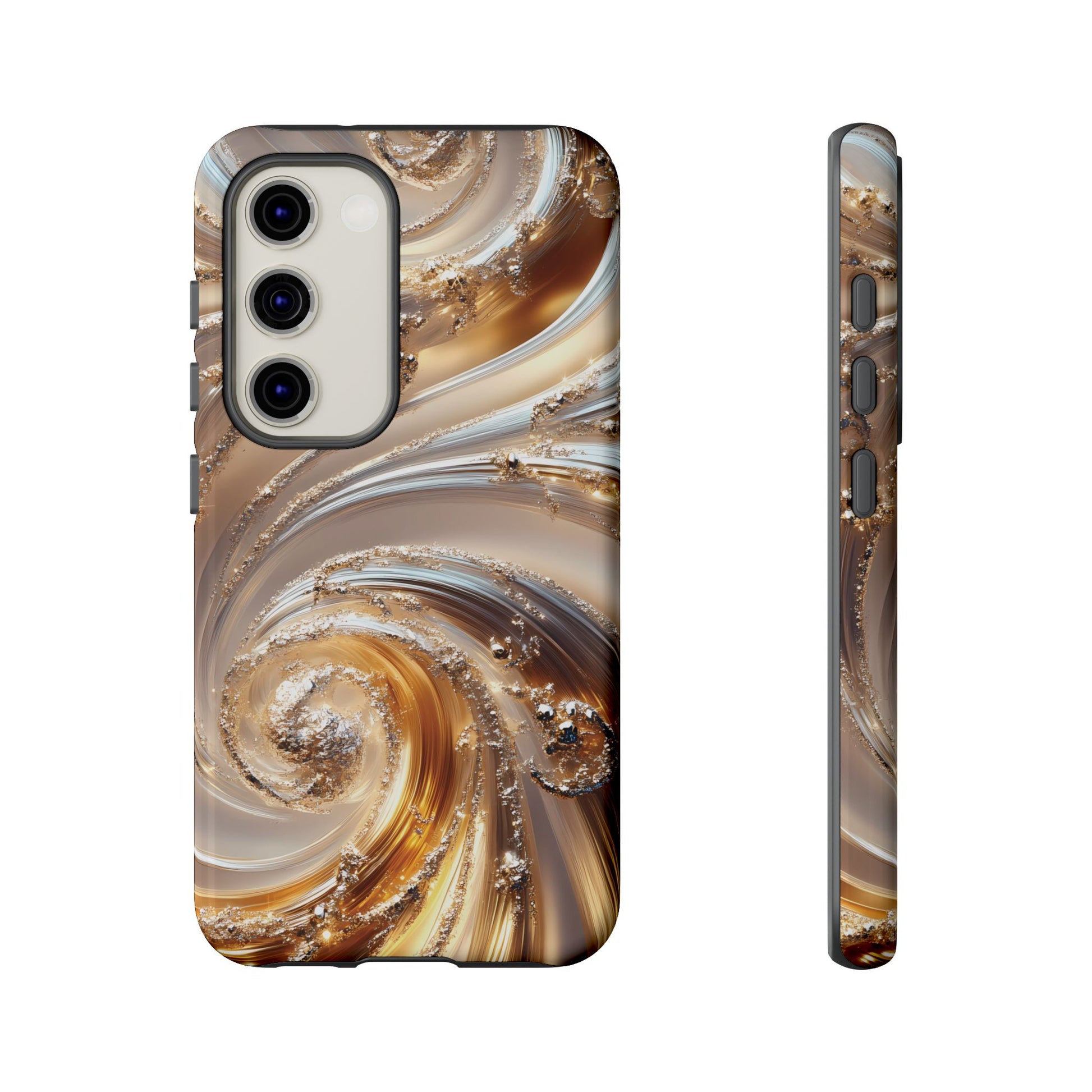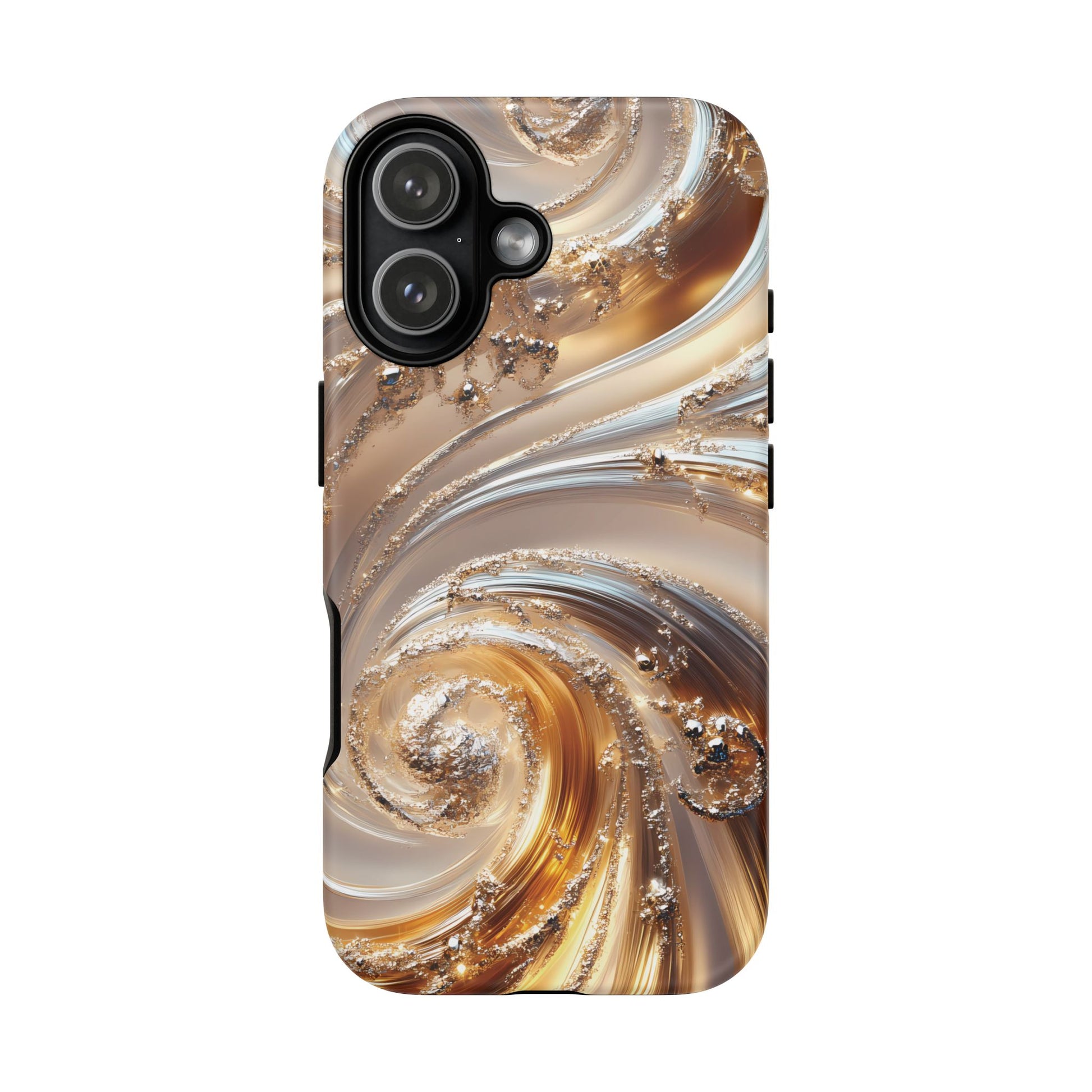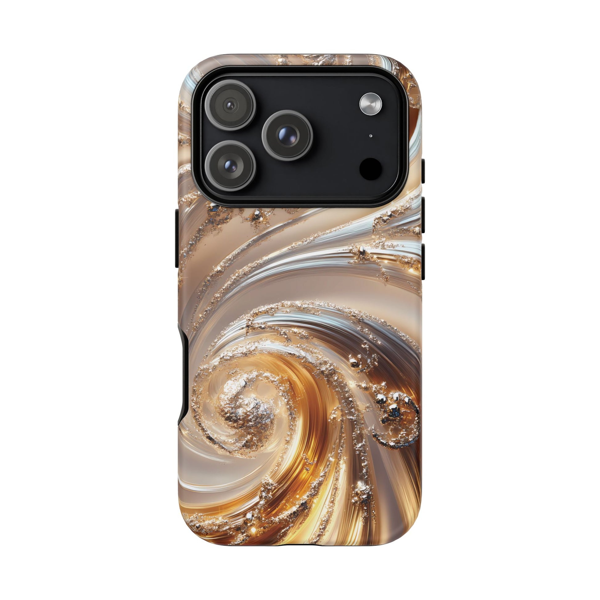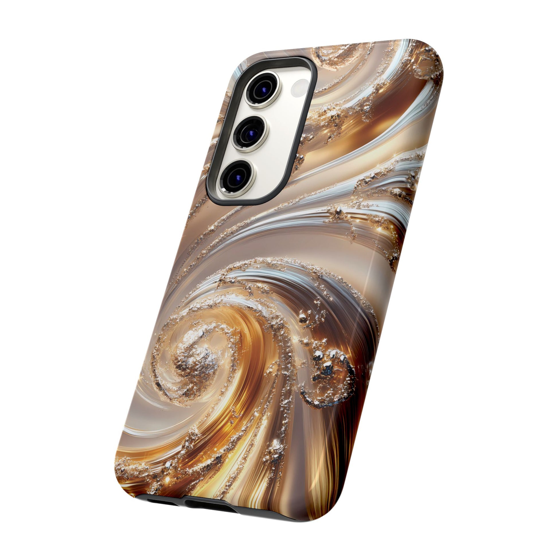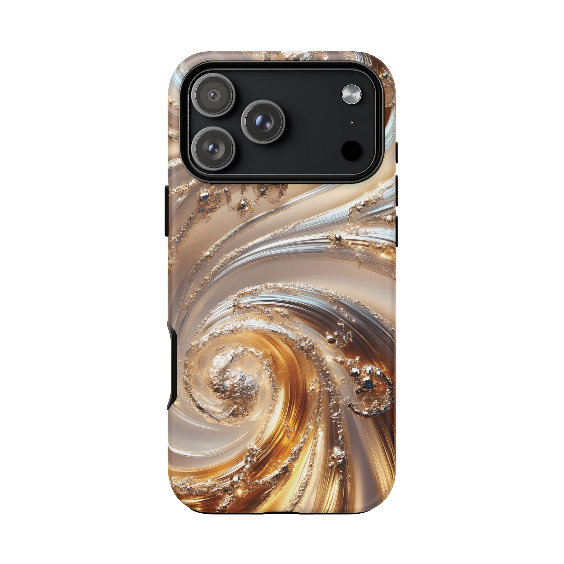 Inspired by modern luxury and high-end aesthetics, this phone case features photorealistic swirls of gold and platinum, set against a softly illuminated backdrop. A must-have for lovers of elegant, refined style.