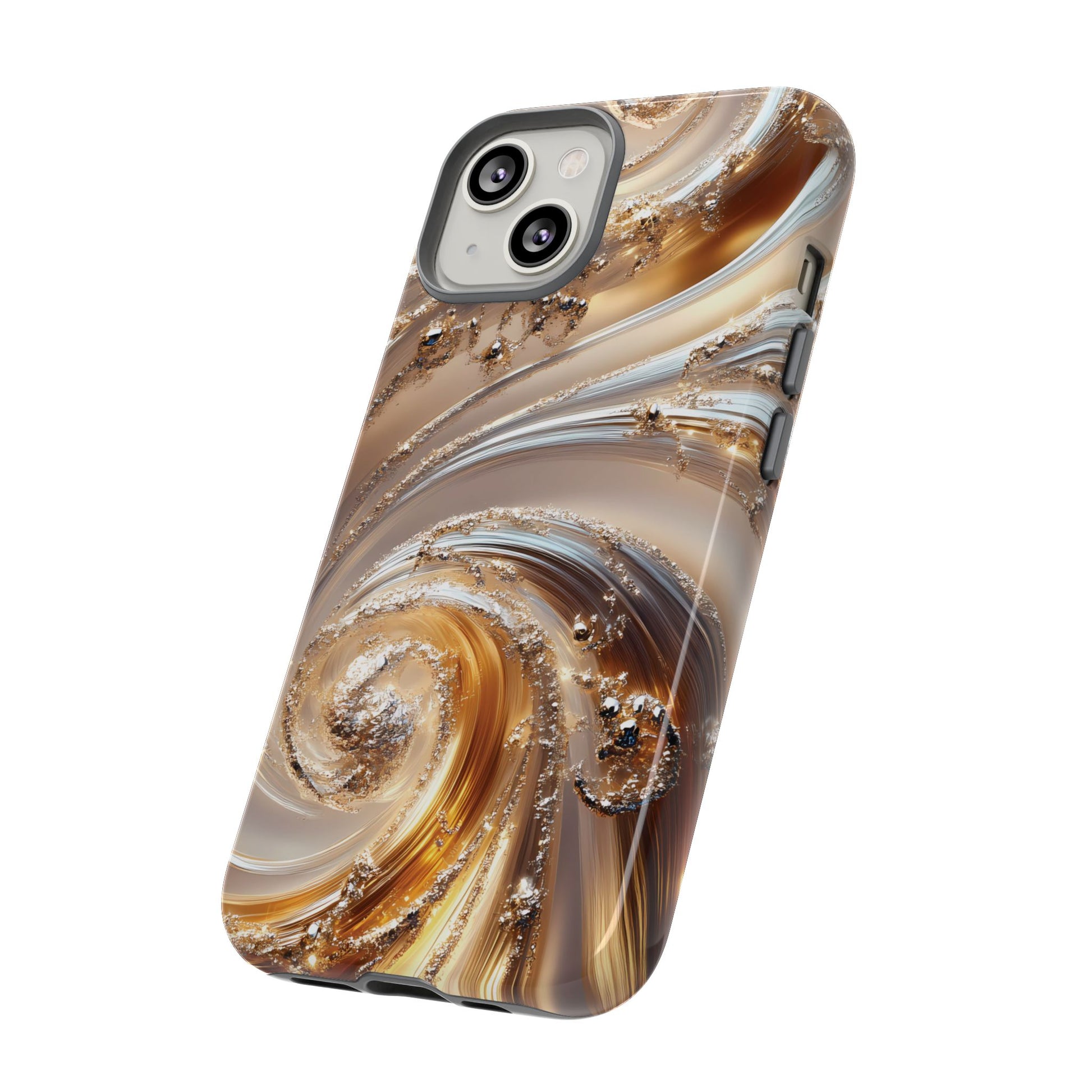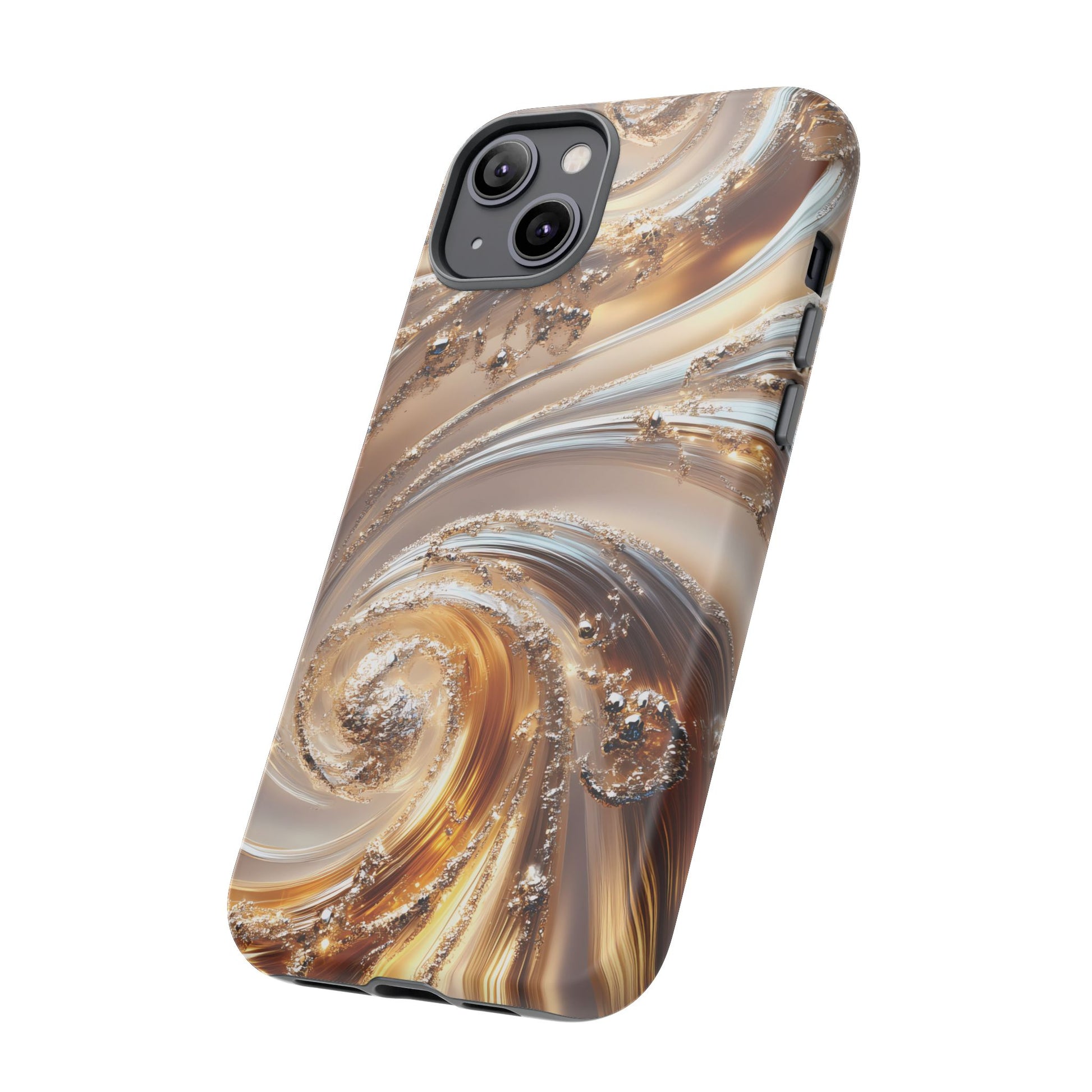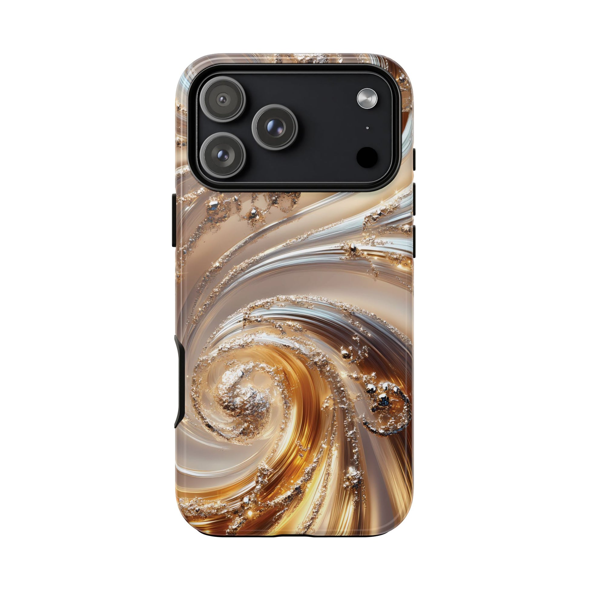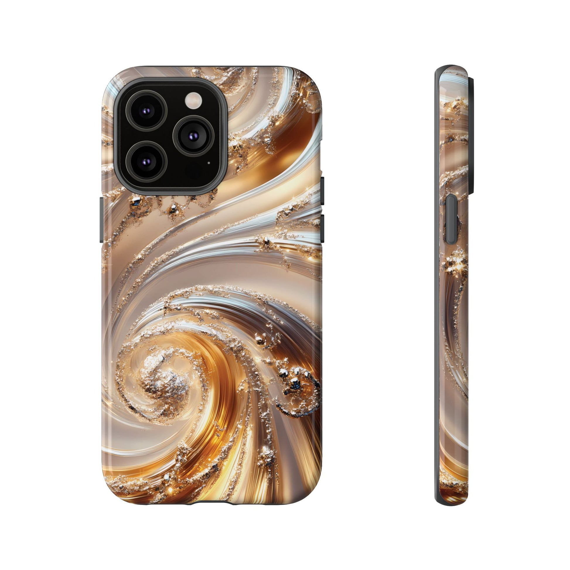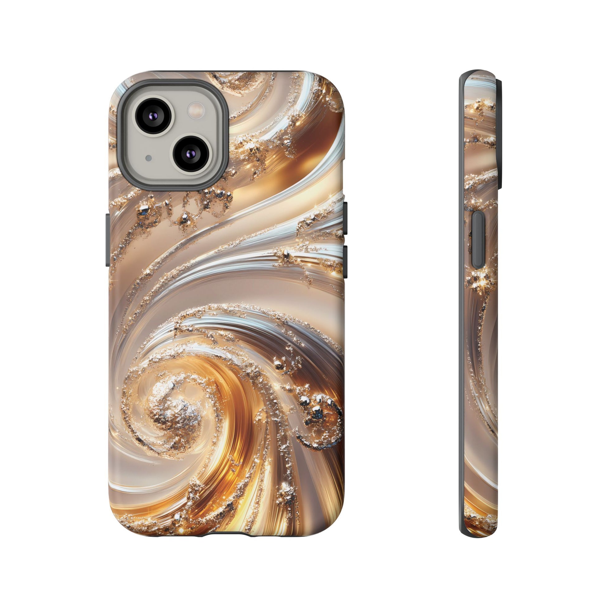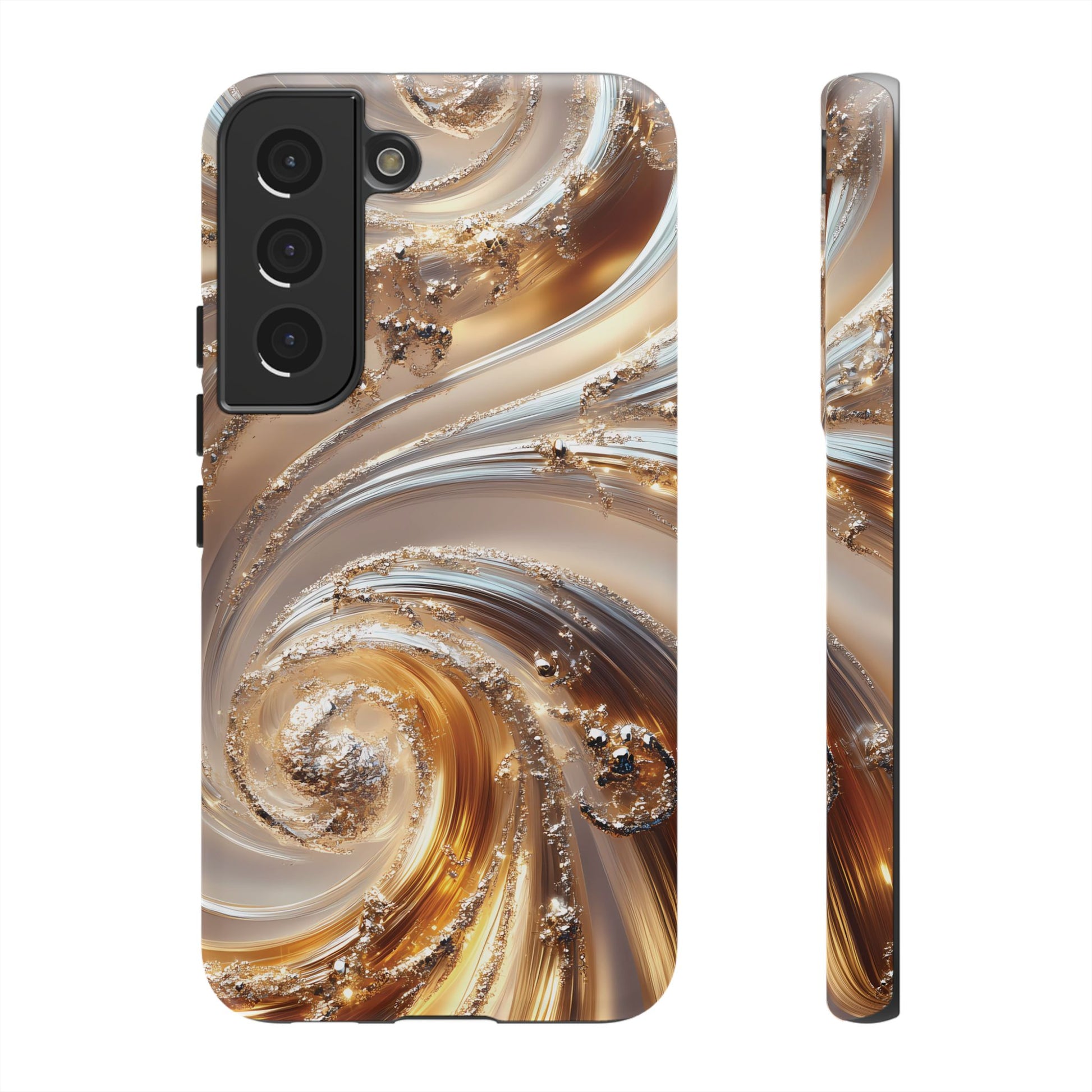 Inspired by modern luxury and high-end aesthetics, this phone case features photorealistic swirls of gold and platinum, set against a softly illuminated backdrop. A must-have for lovers of elegant, refined style.