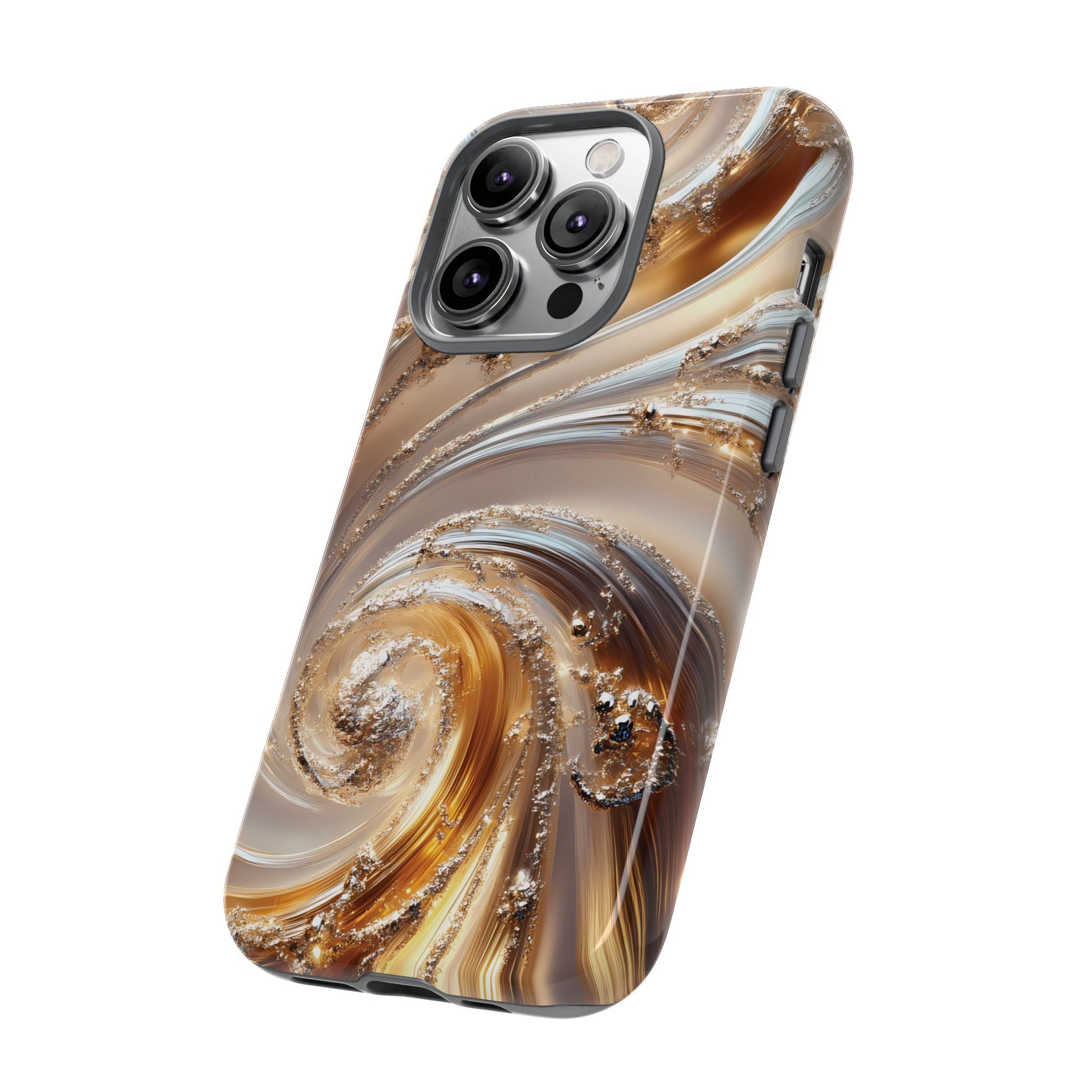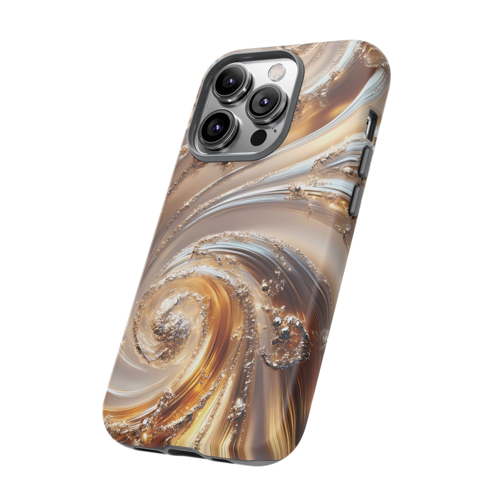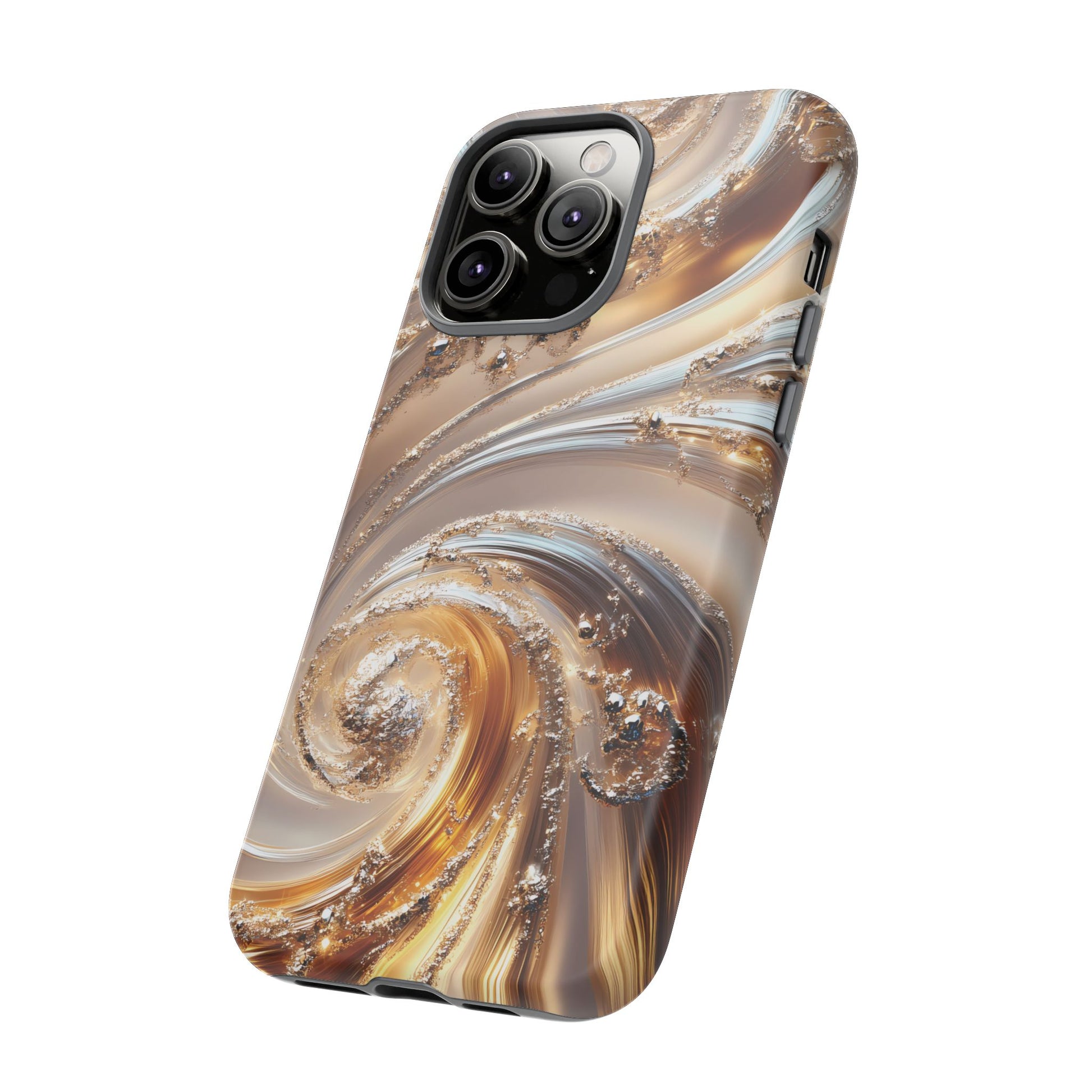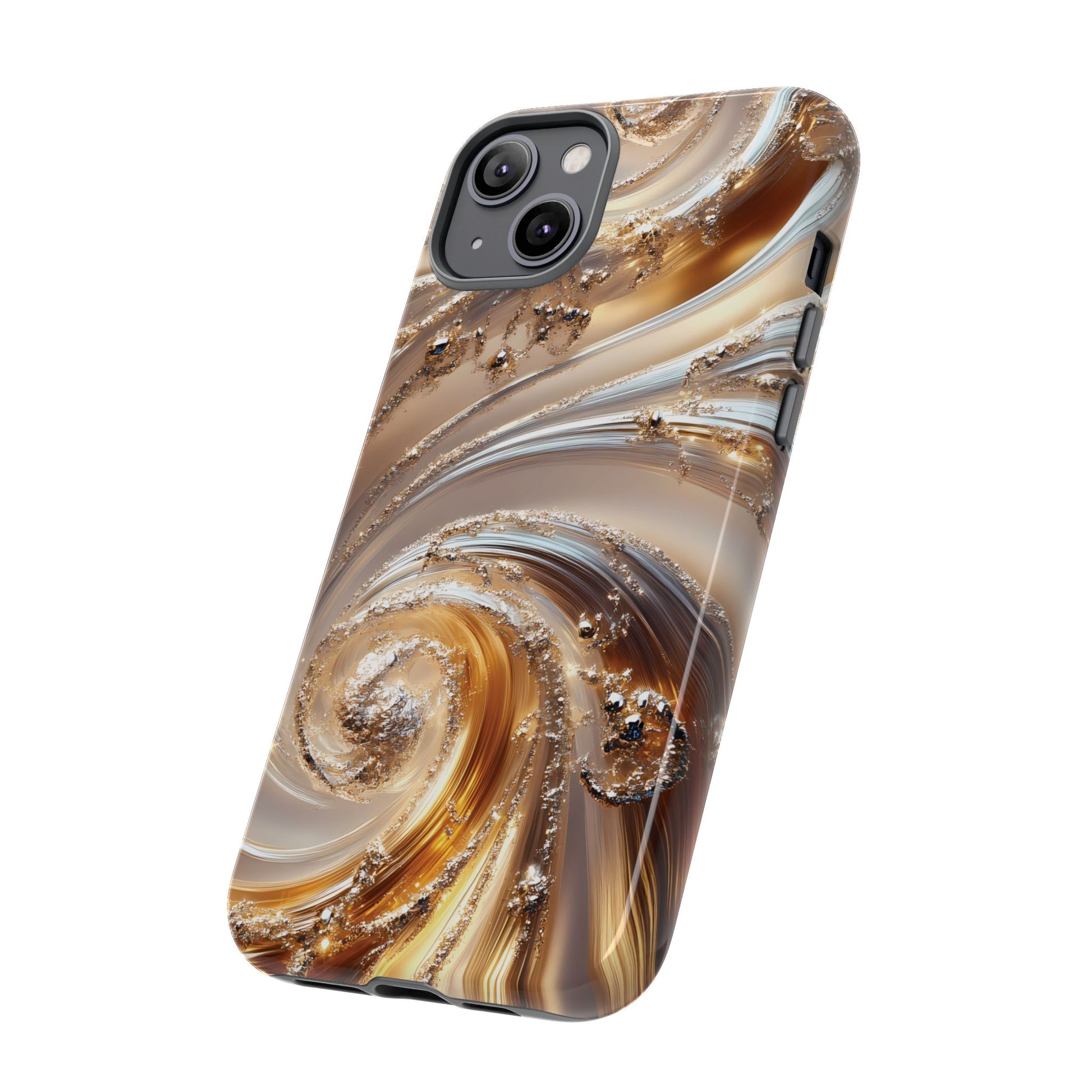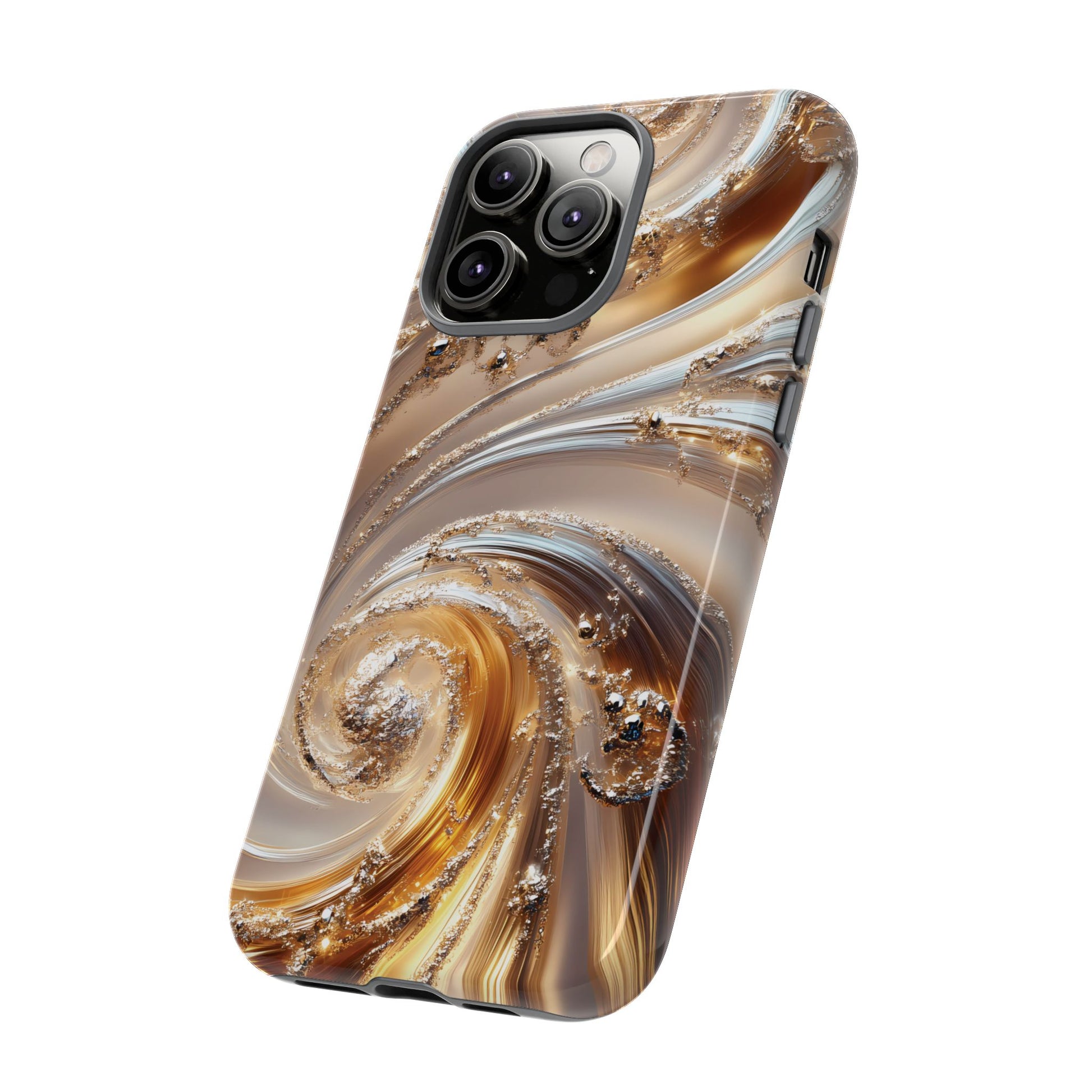 Inspired by modern luxury and high-end aesthetics, this phone case features photorealistic swirls of gold and platinum, set against a softly illuminated backdrop. A must-have for lovers of elegant, refined style.