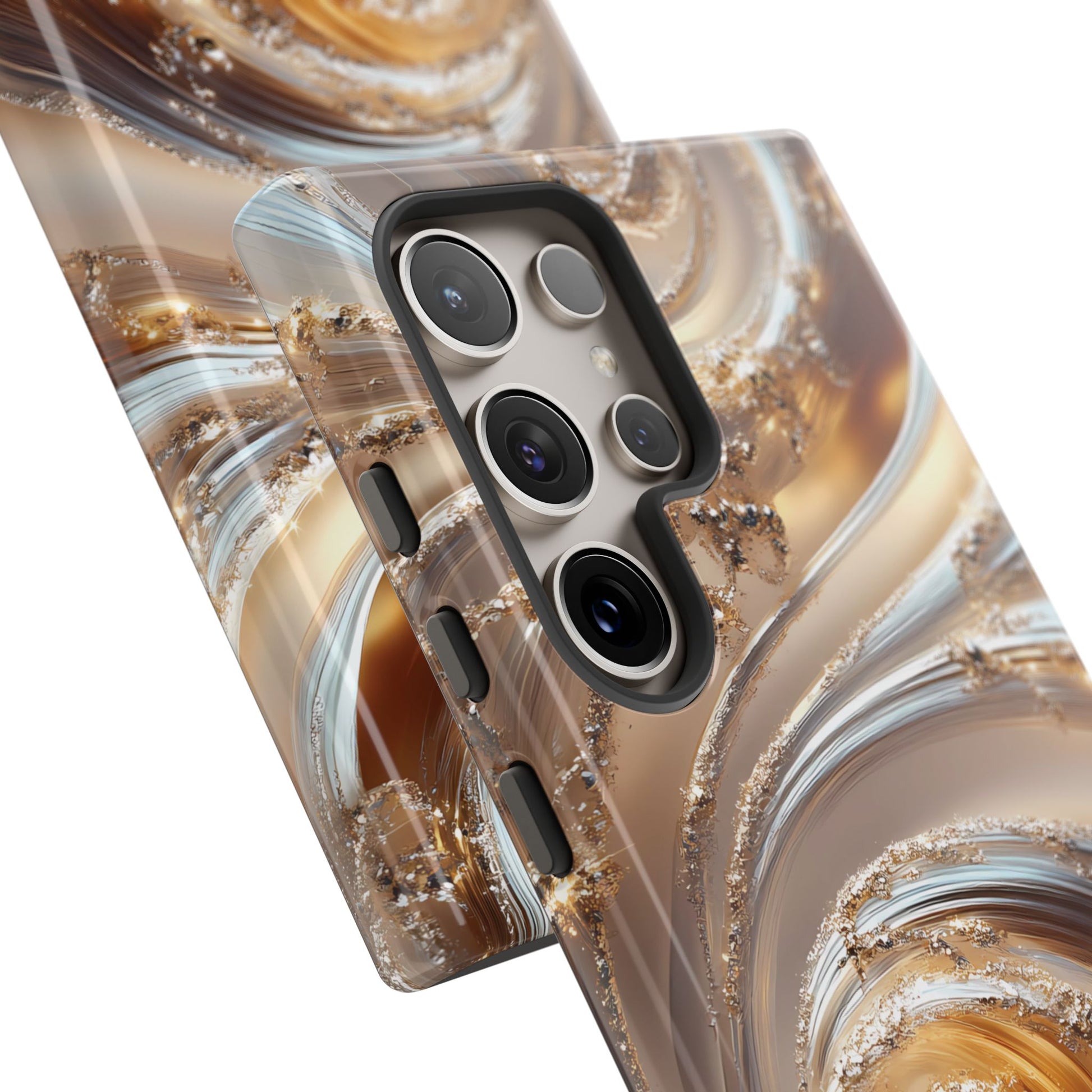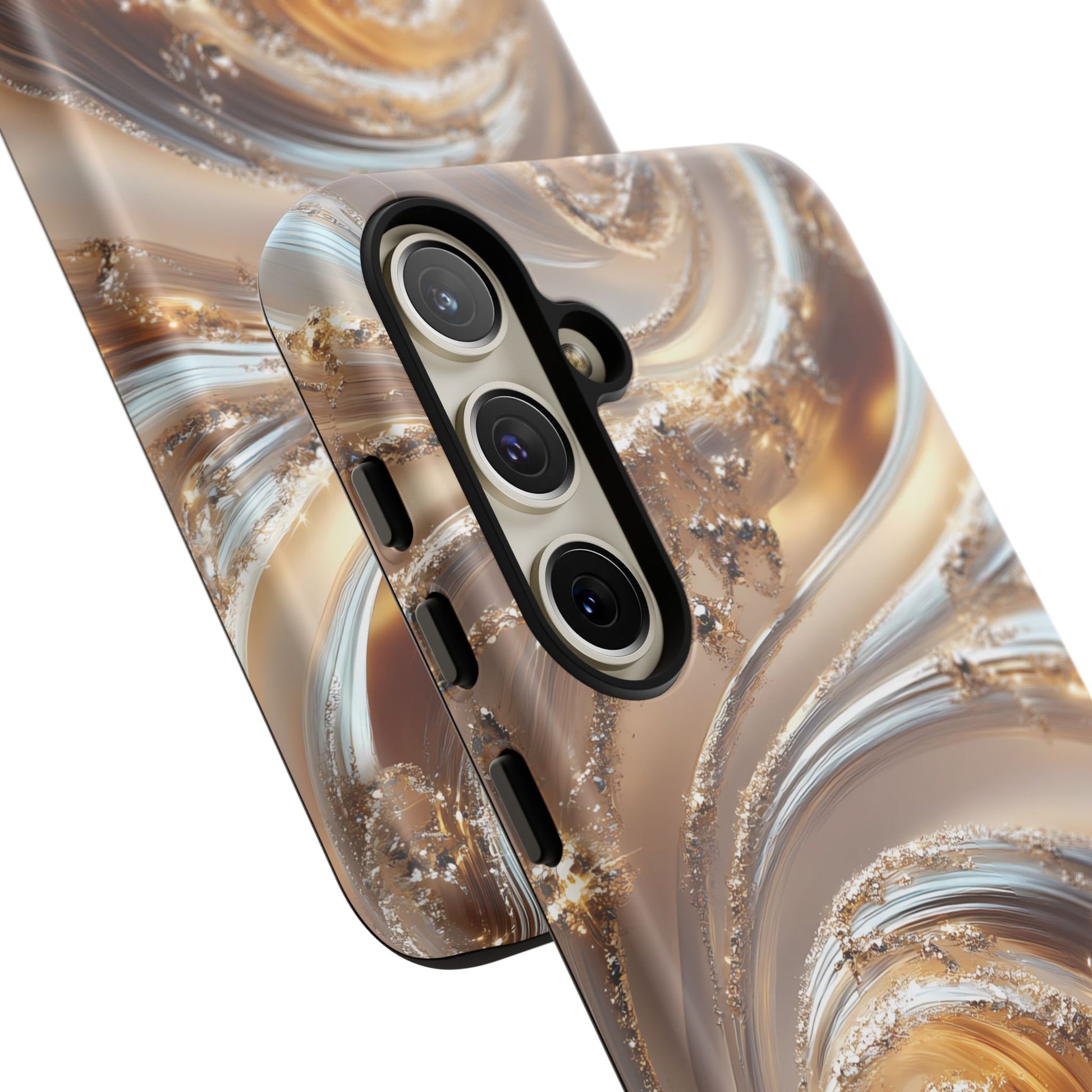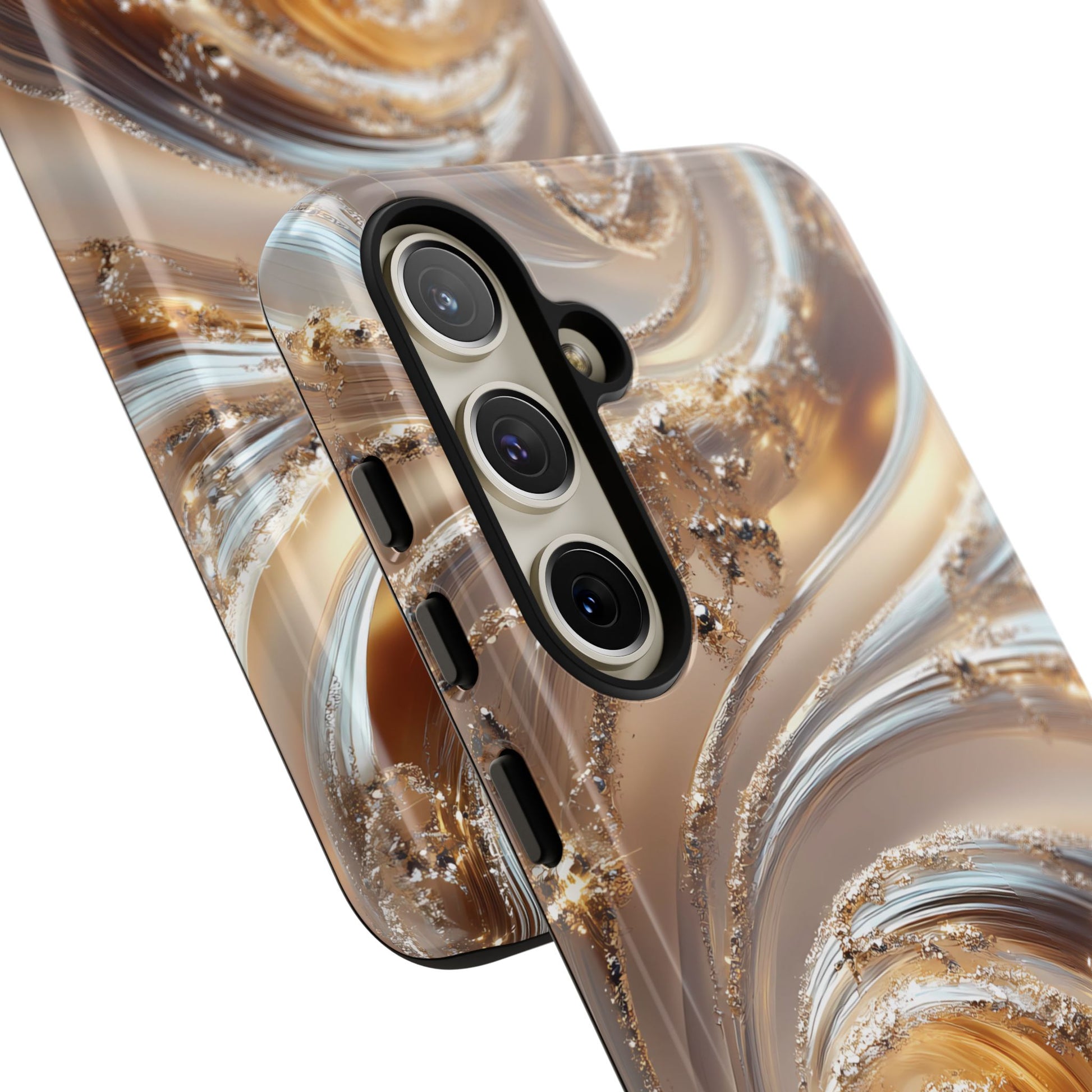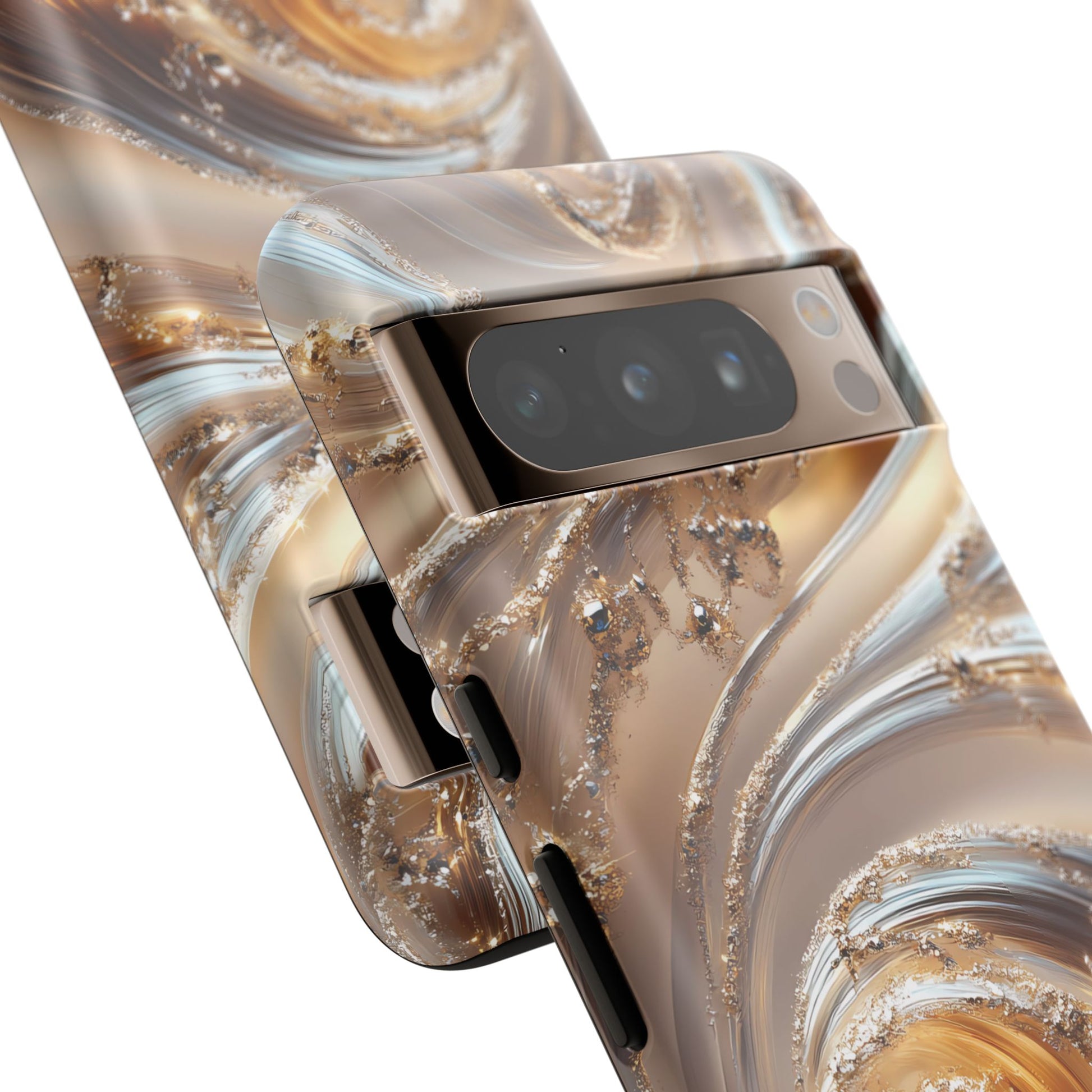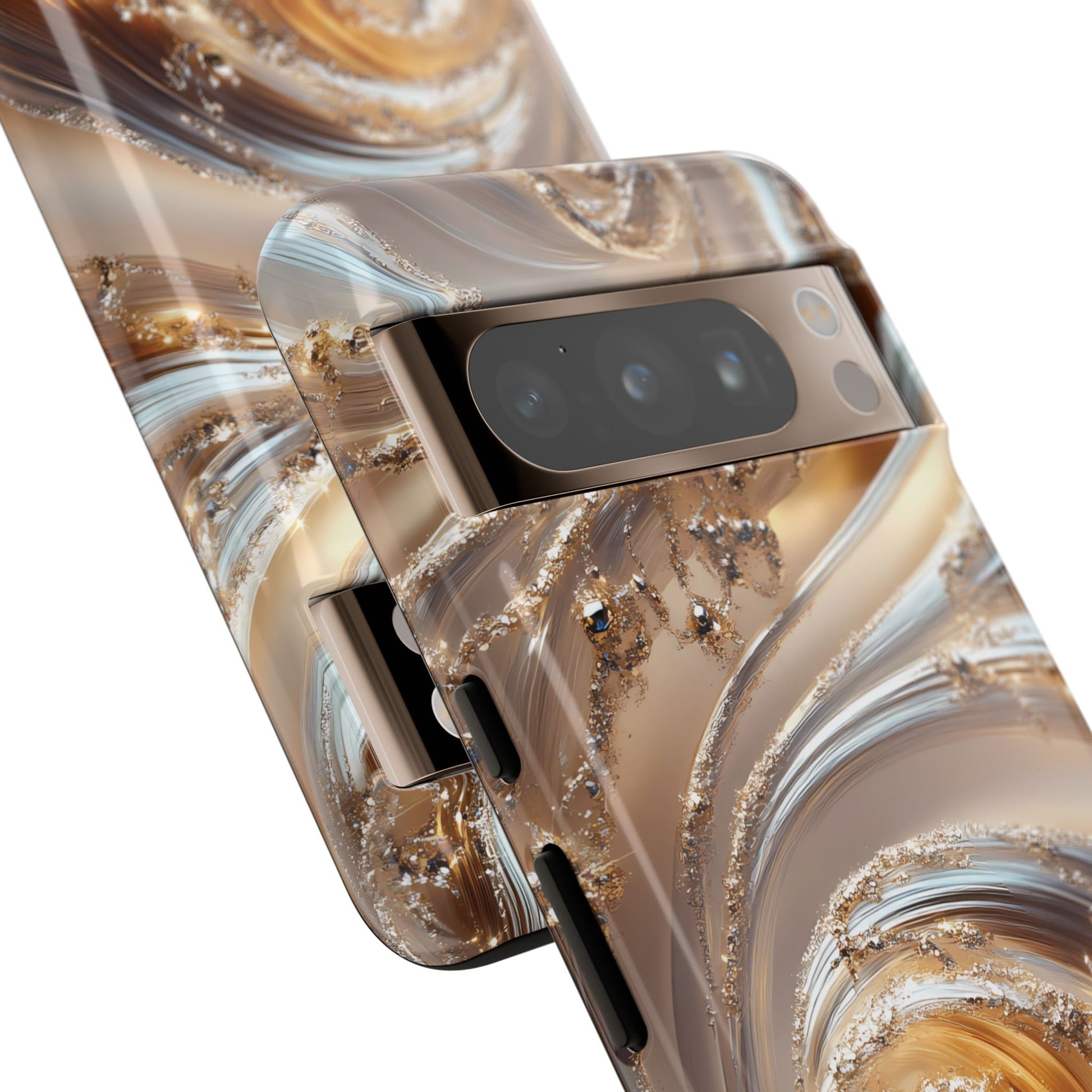 Inspired by modern luxury and high-end aesthetics, this phone case features photorealistic swirls of gold and platinum, set against a softly illuminated backdrop. A must-have for lovers of elegant, refined style.