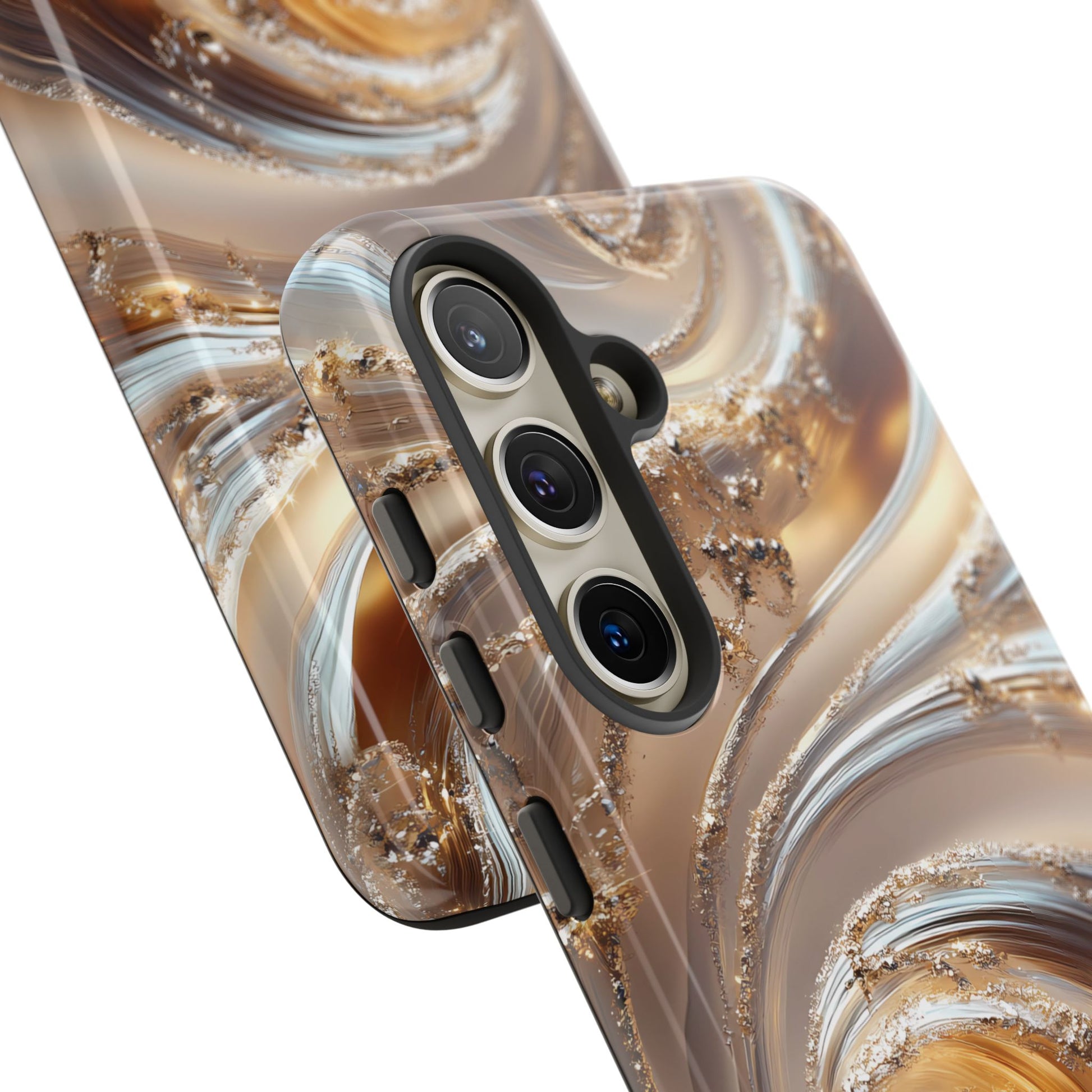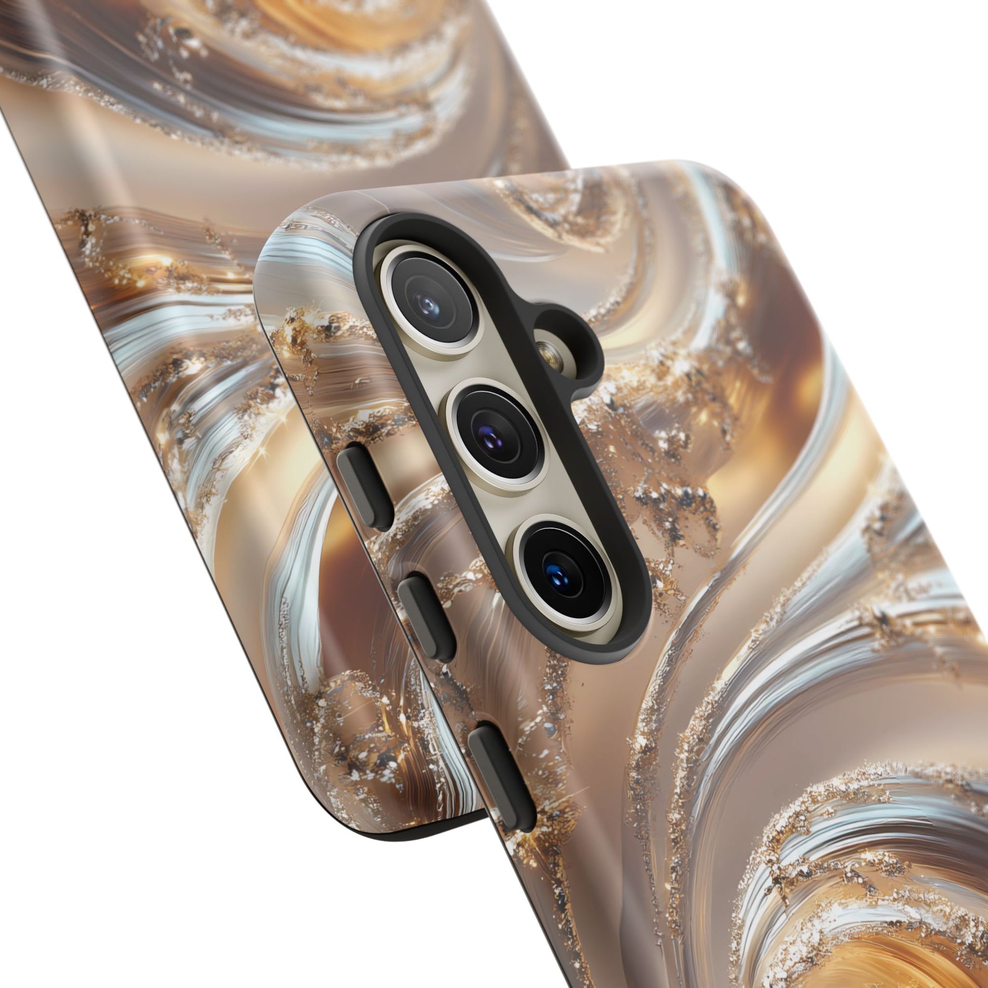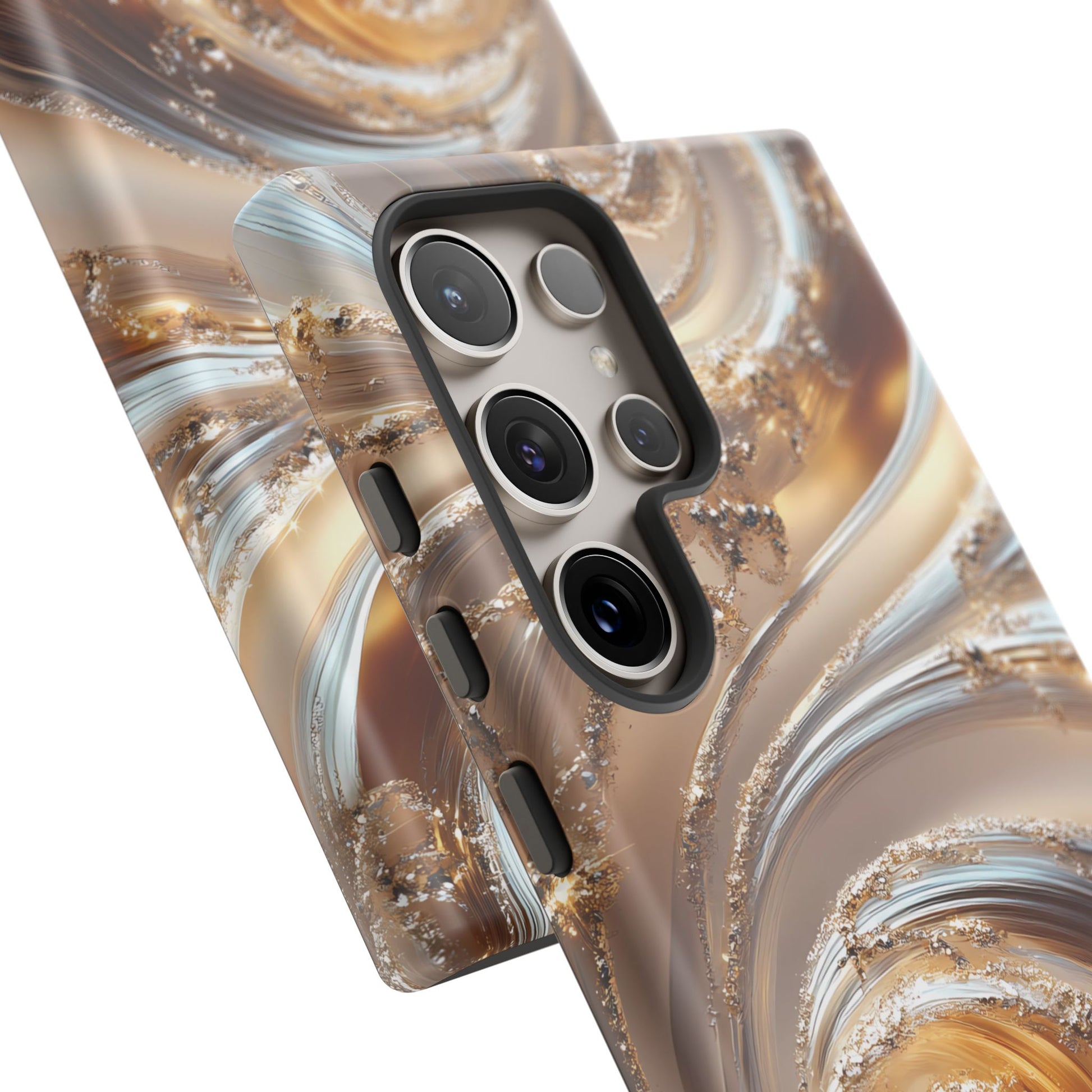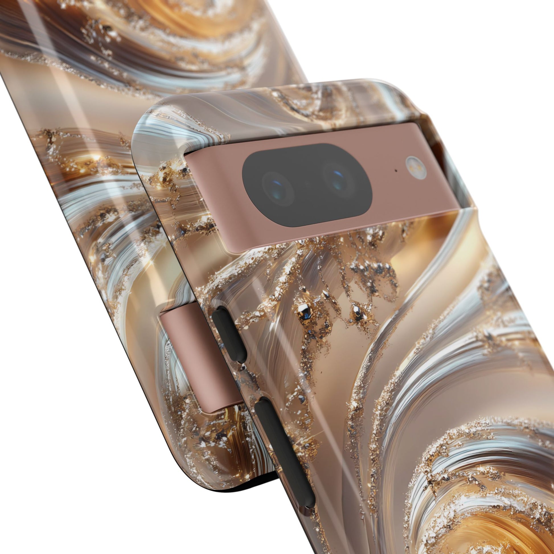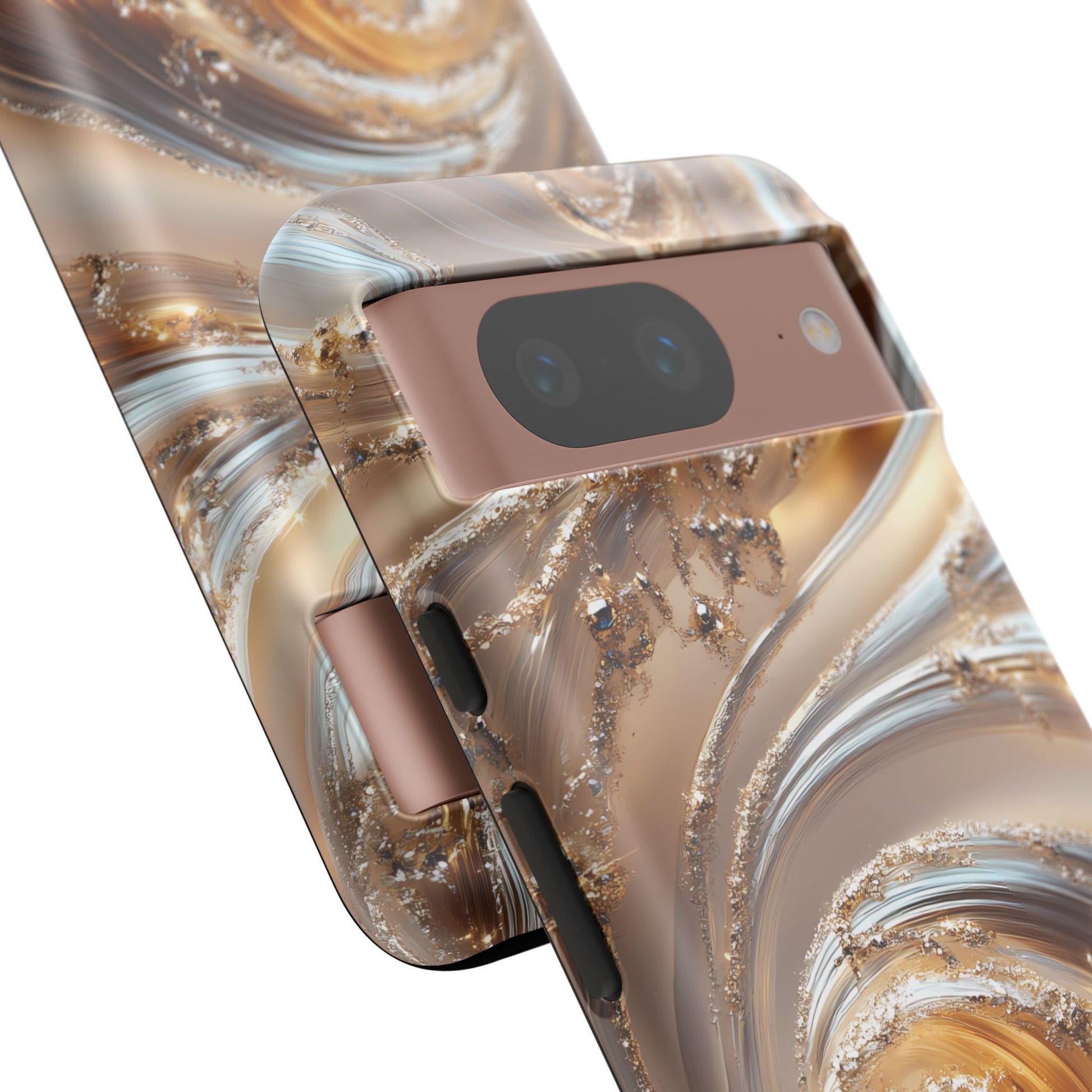 Inspired by modern luxury and high-end aesthetics, this phone case features photorealistic swirls of gold and platinum, set against a softly illuminated backdrop. A must-have for lovers of elegant, refined style.