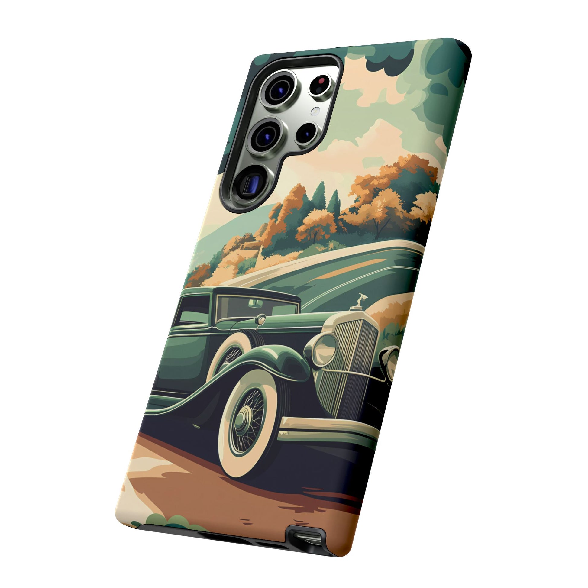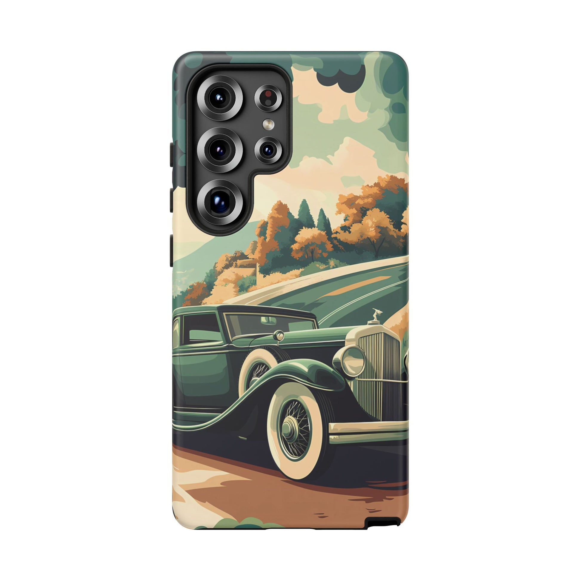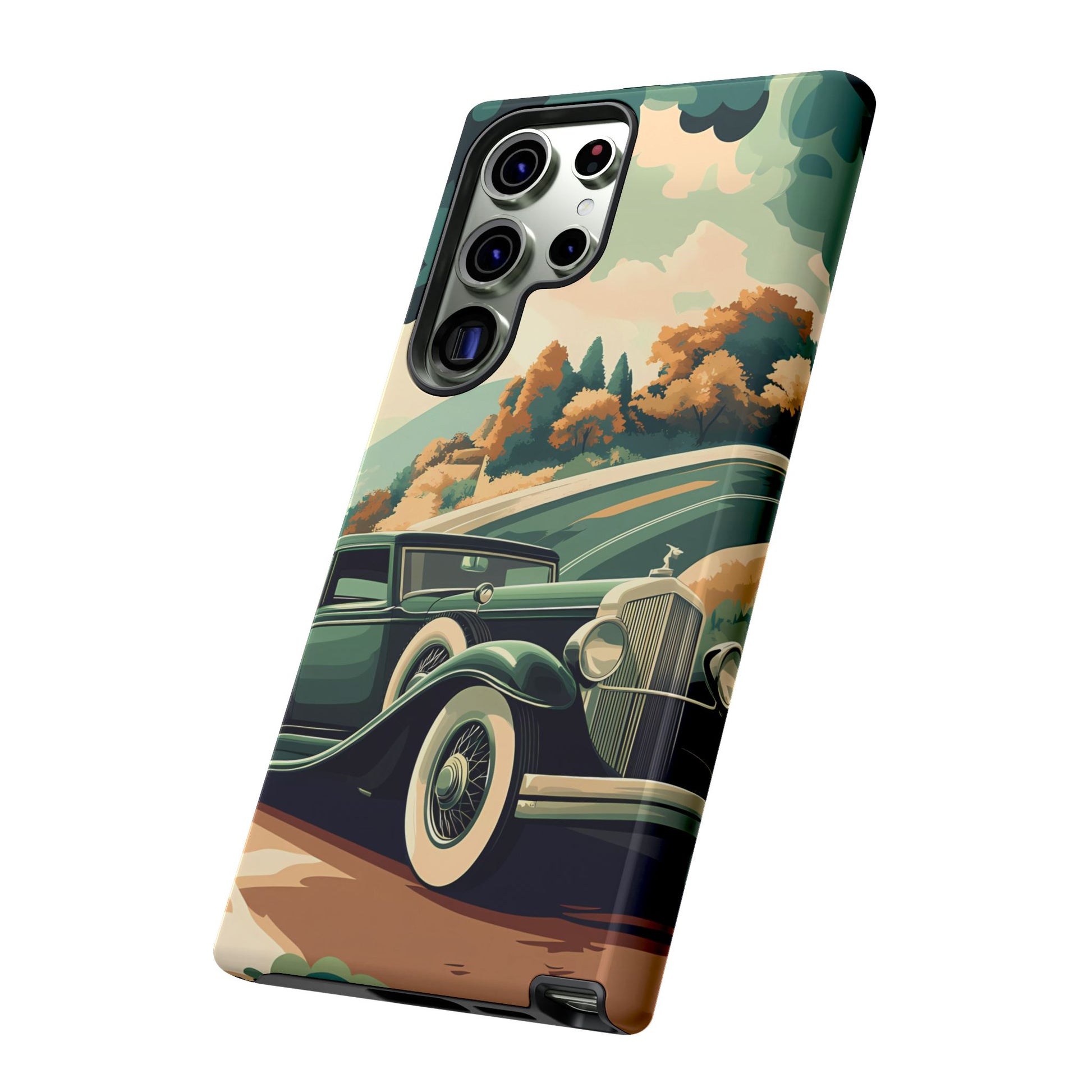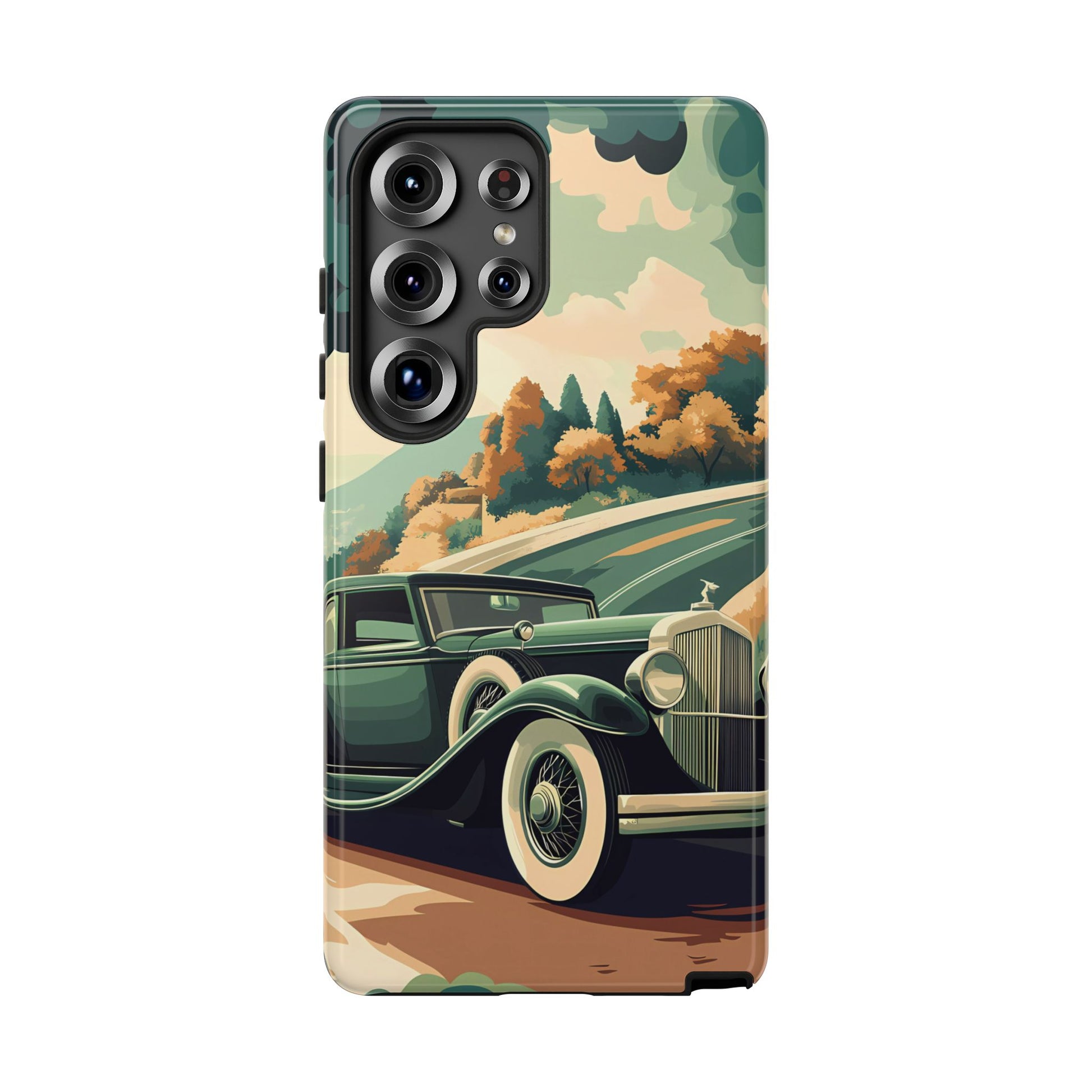 Evoke the glamour of early automobile advertisements with this vintage-inspired design, featuring opulent 1920s and 1930s classic cars, polished chrome details, and white-wall tires, all set against a stylish Art Deco backdrop.
