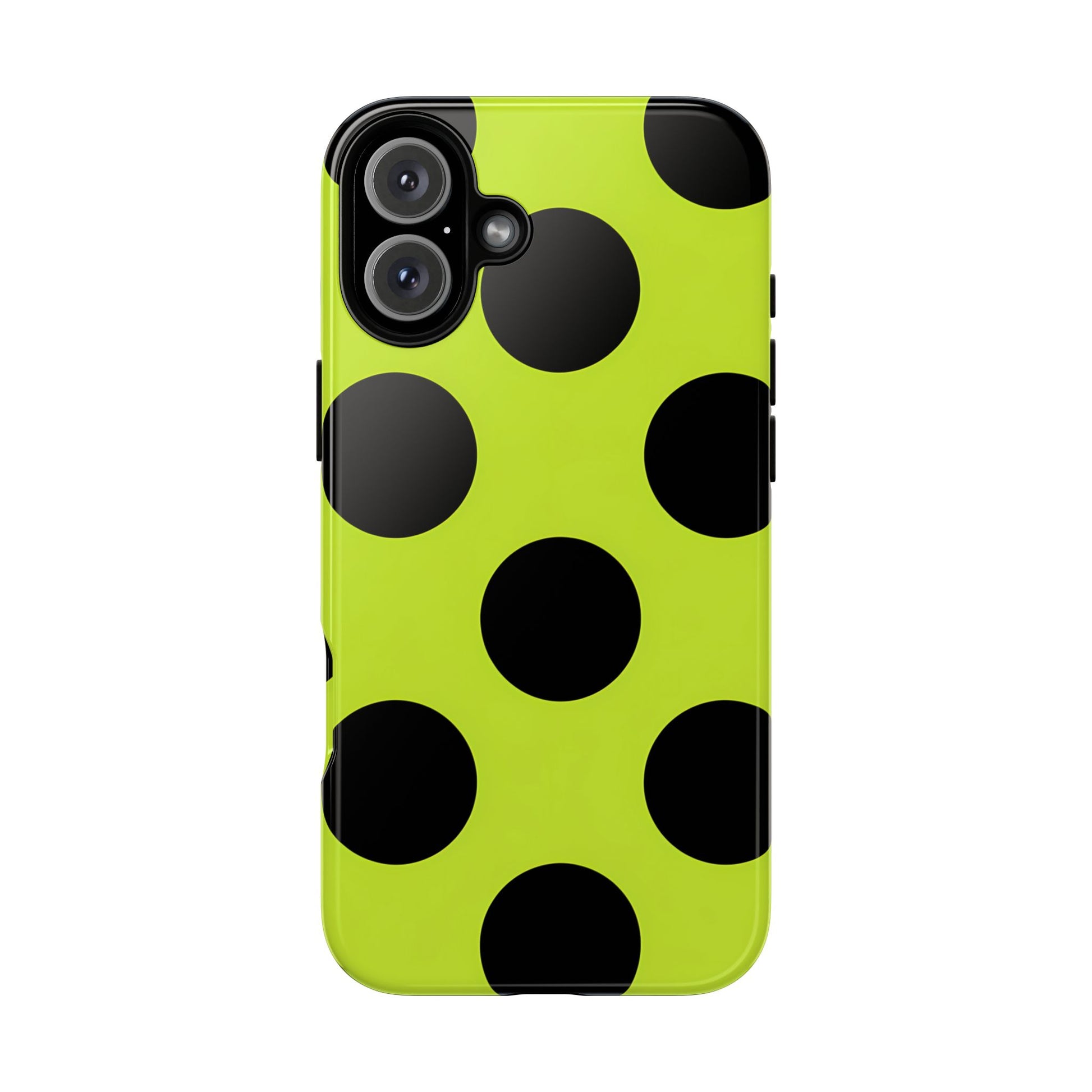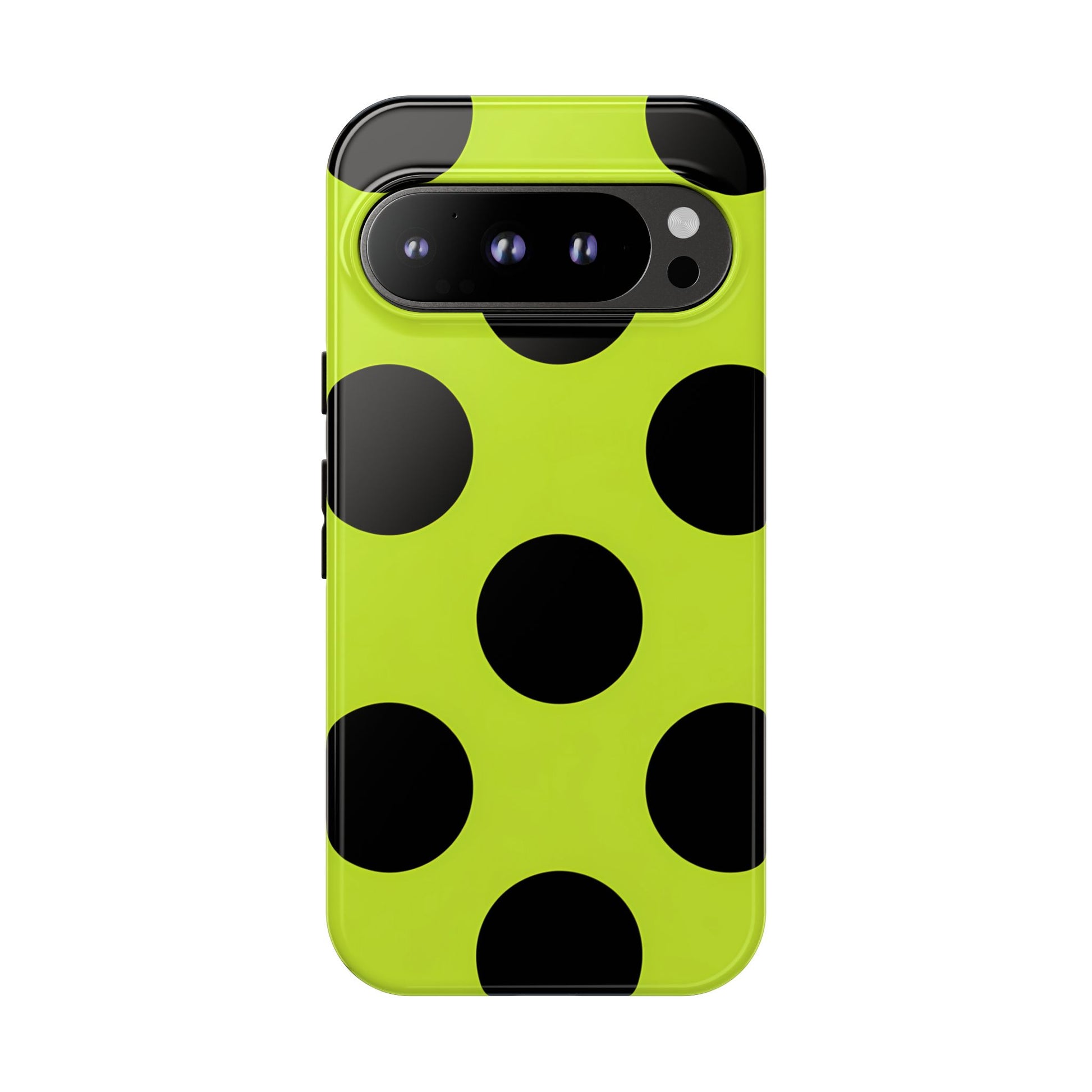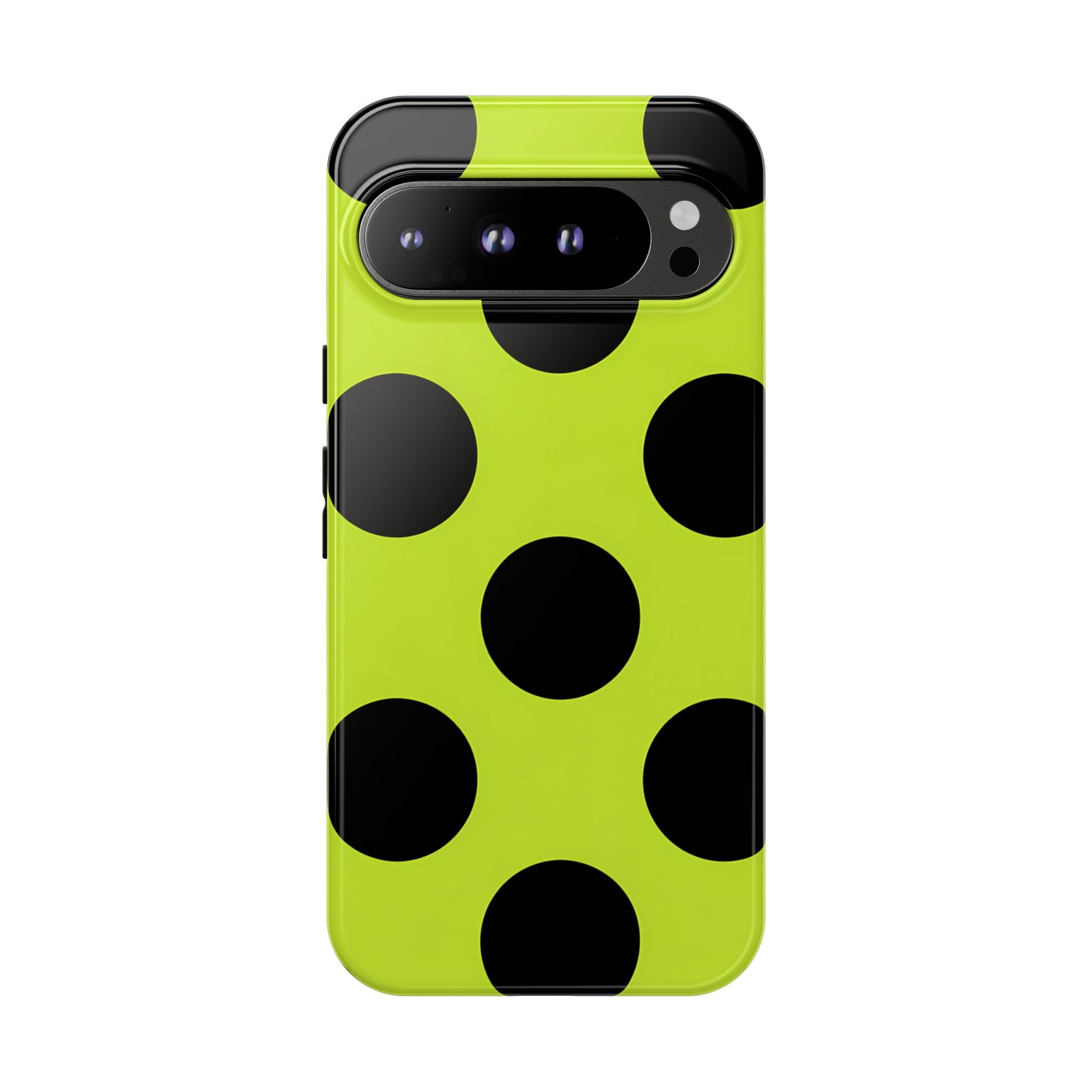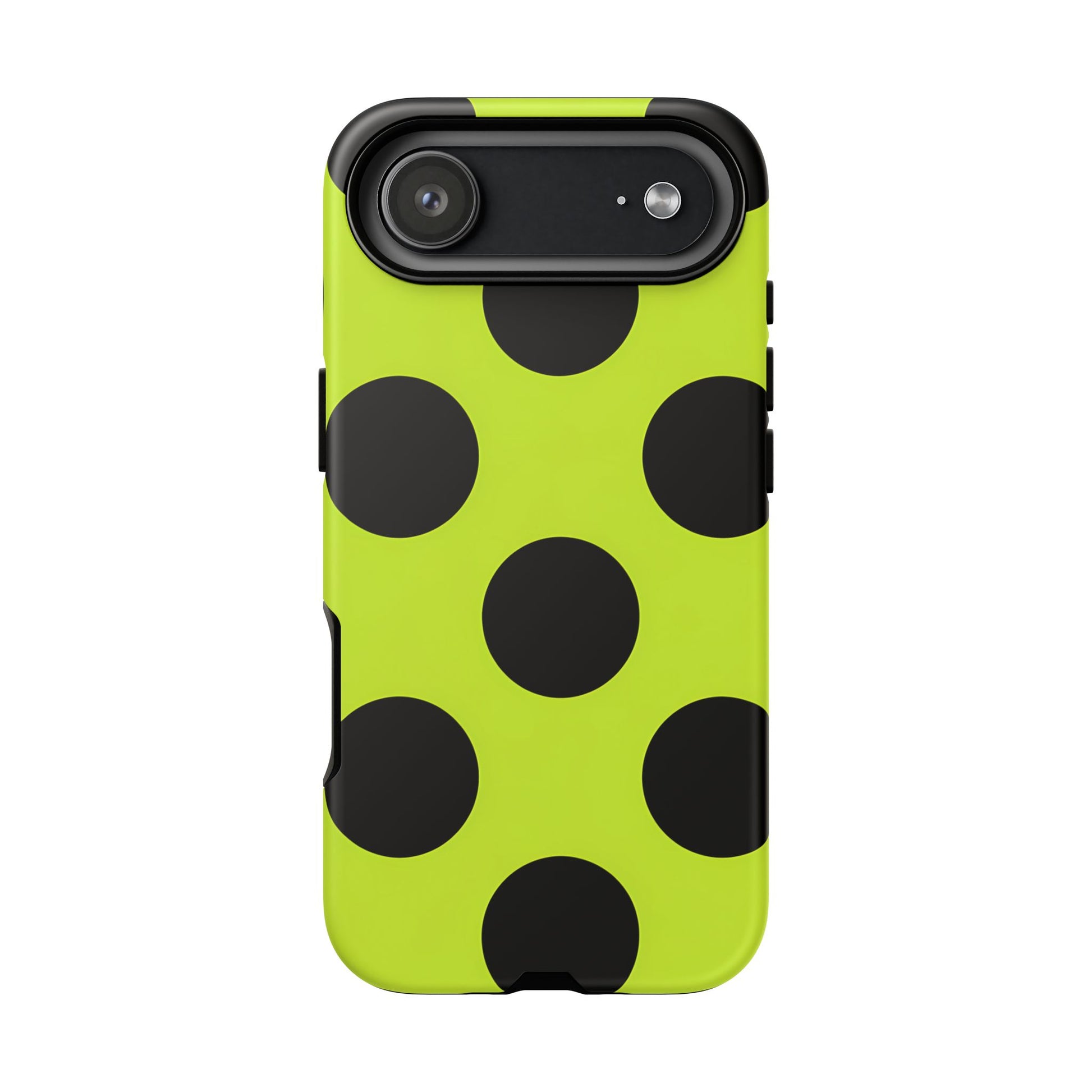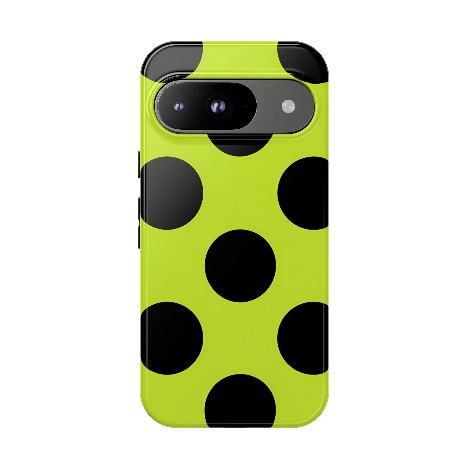 High-contrast black circles float evenly on a vivid lime base, offering a stylish, graphic, and fashion-forward pattern.