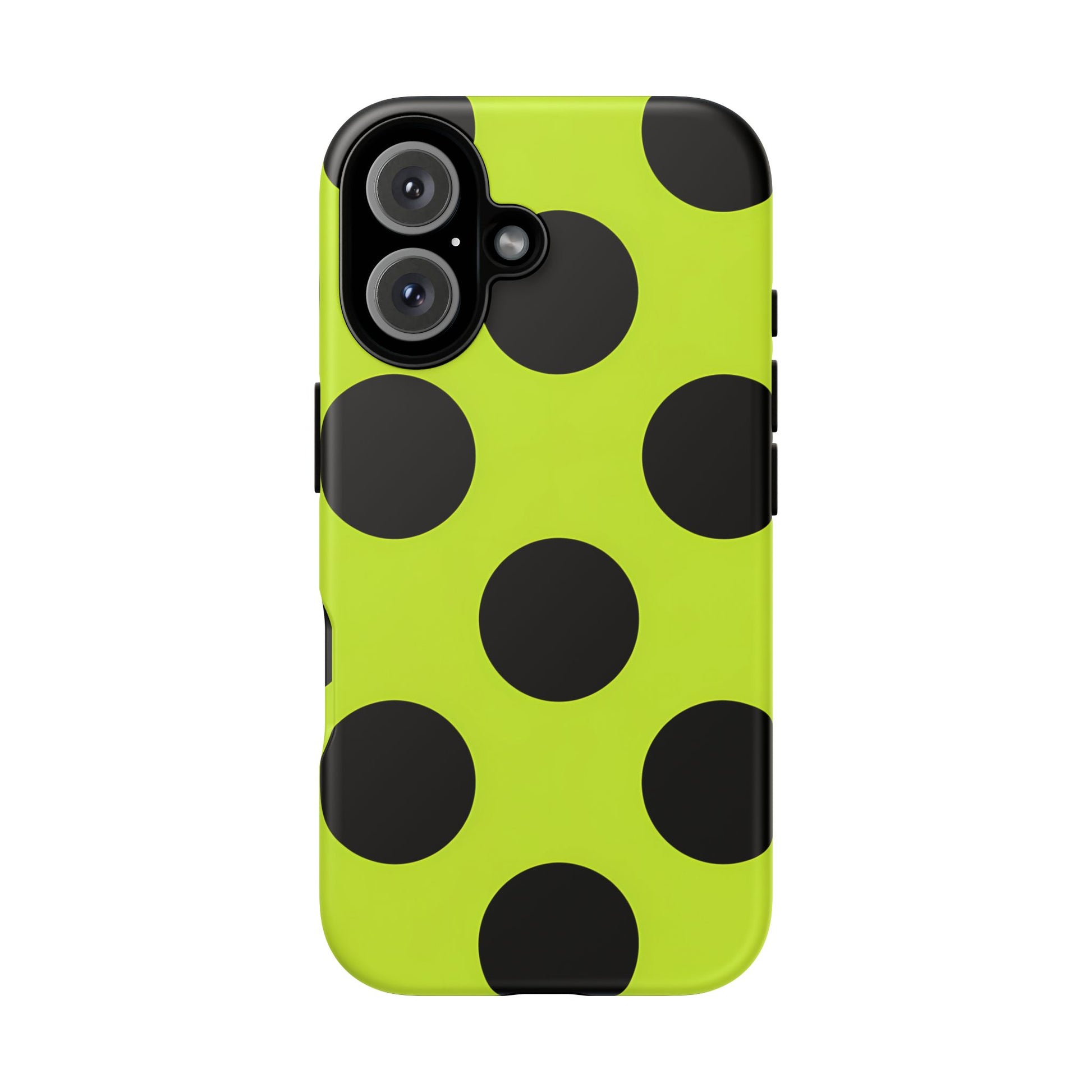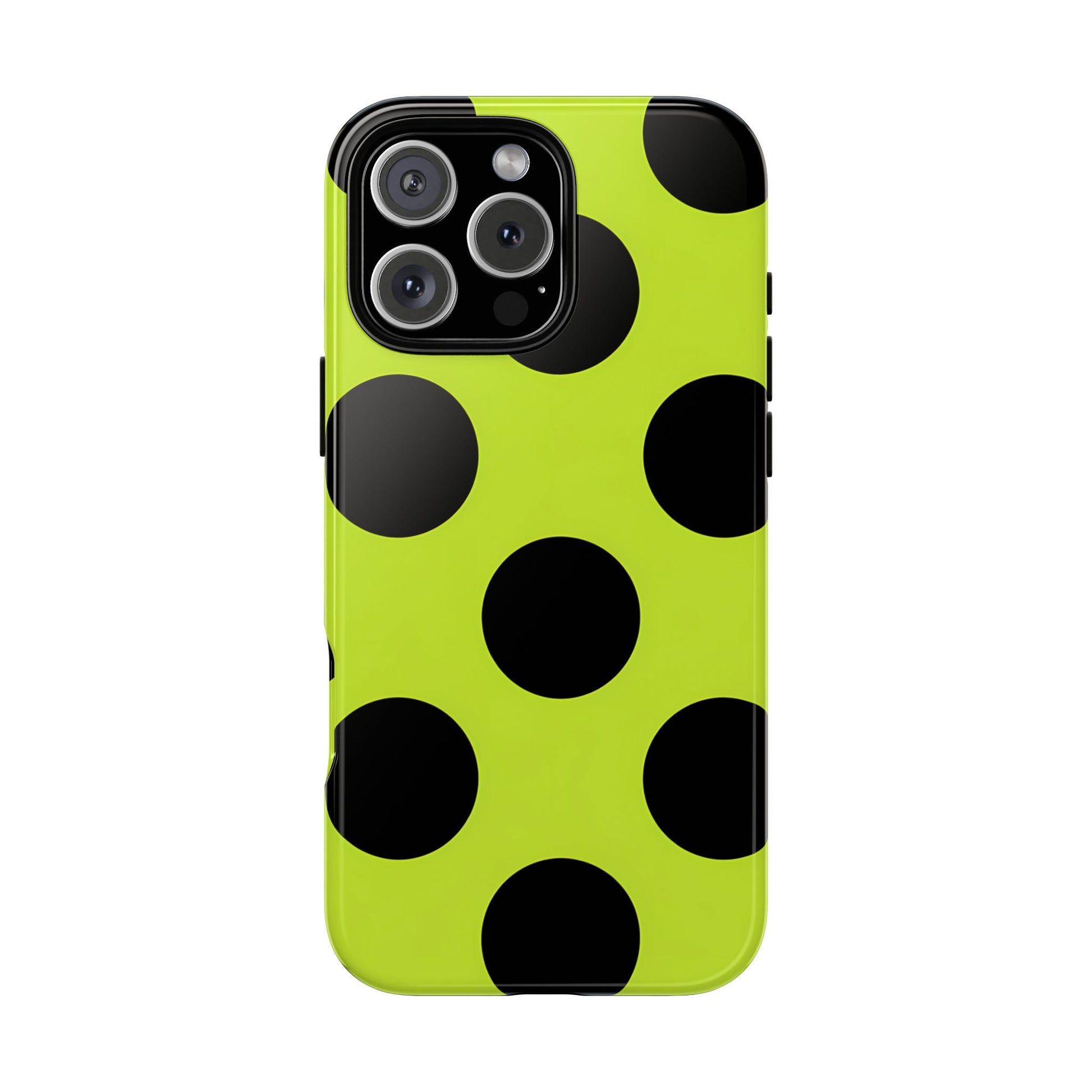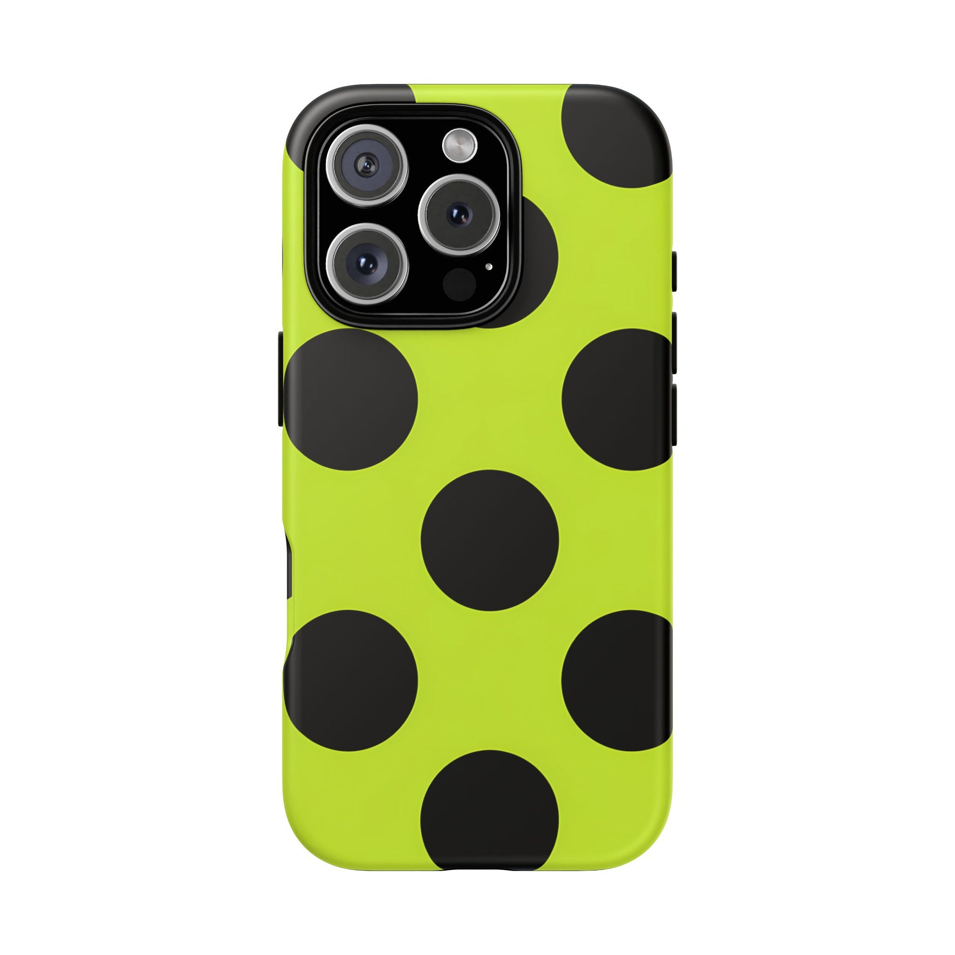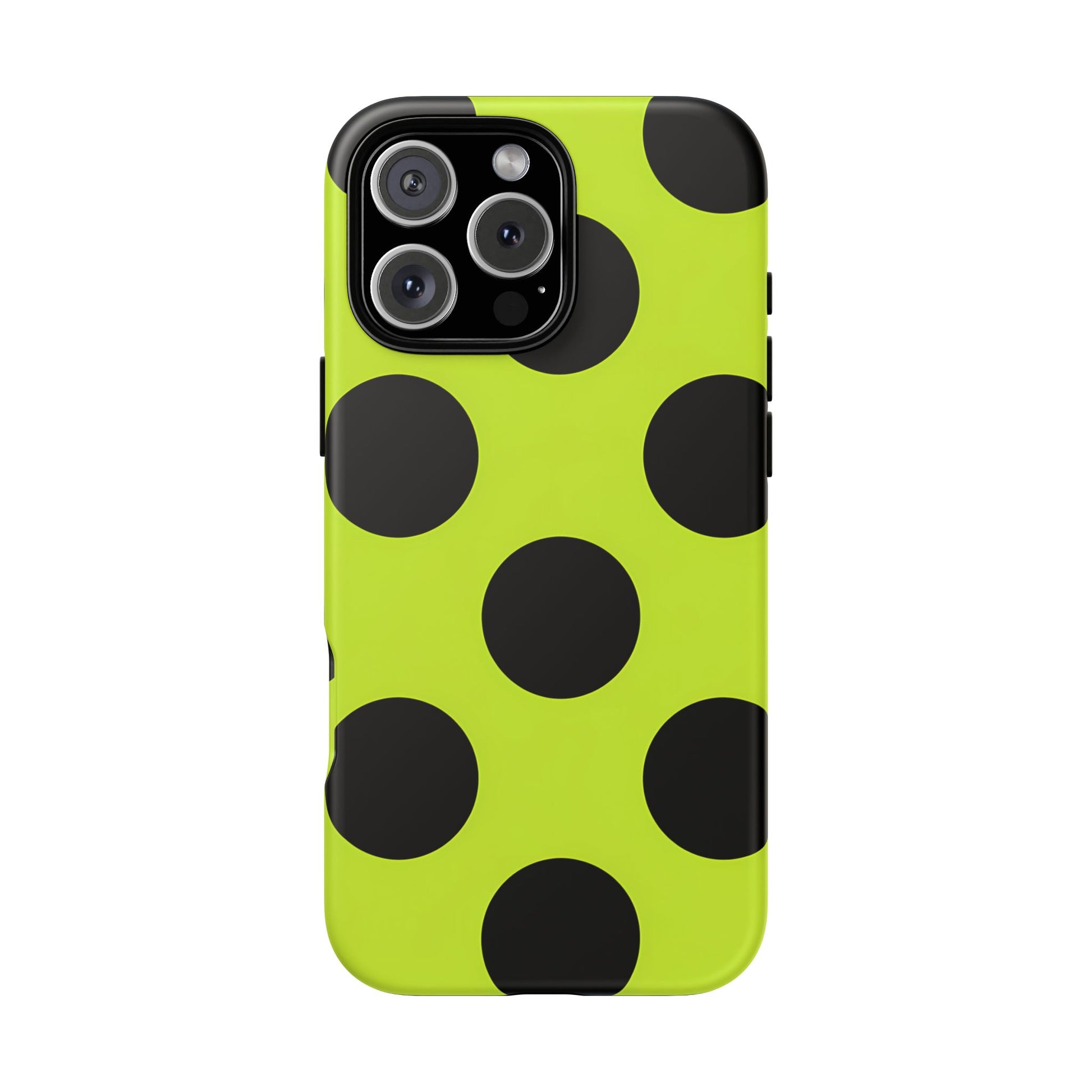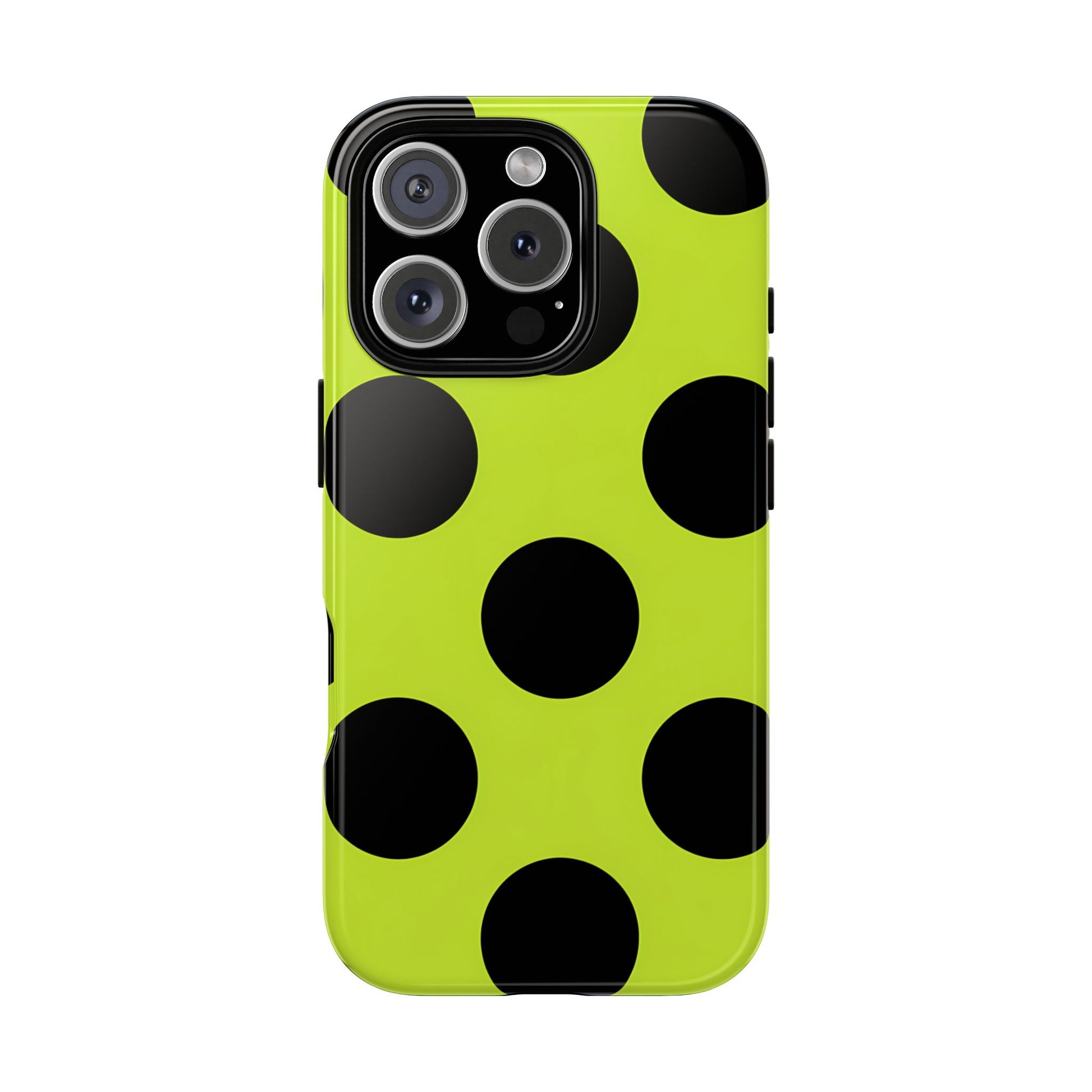 High-contrast black circles float evenly on a vivid lime base, offering a stylish, graphic, and fashion-forward pattern.