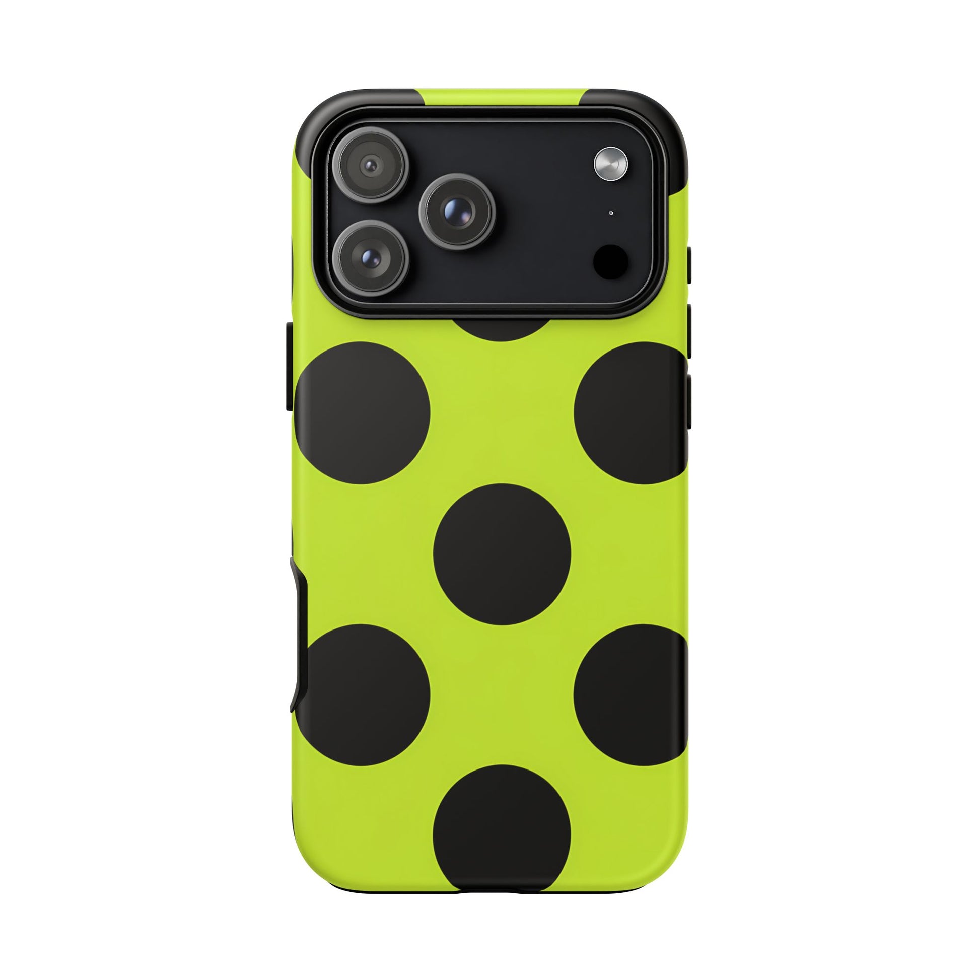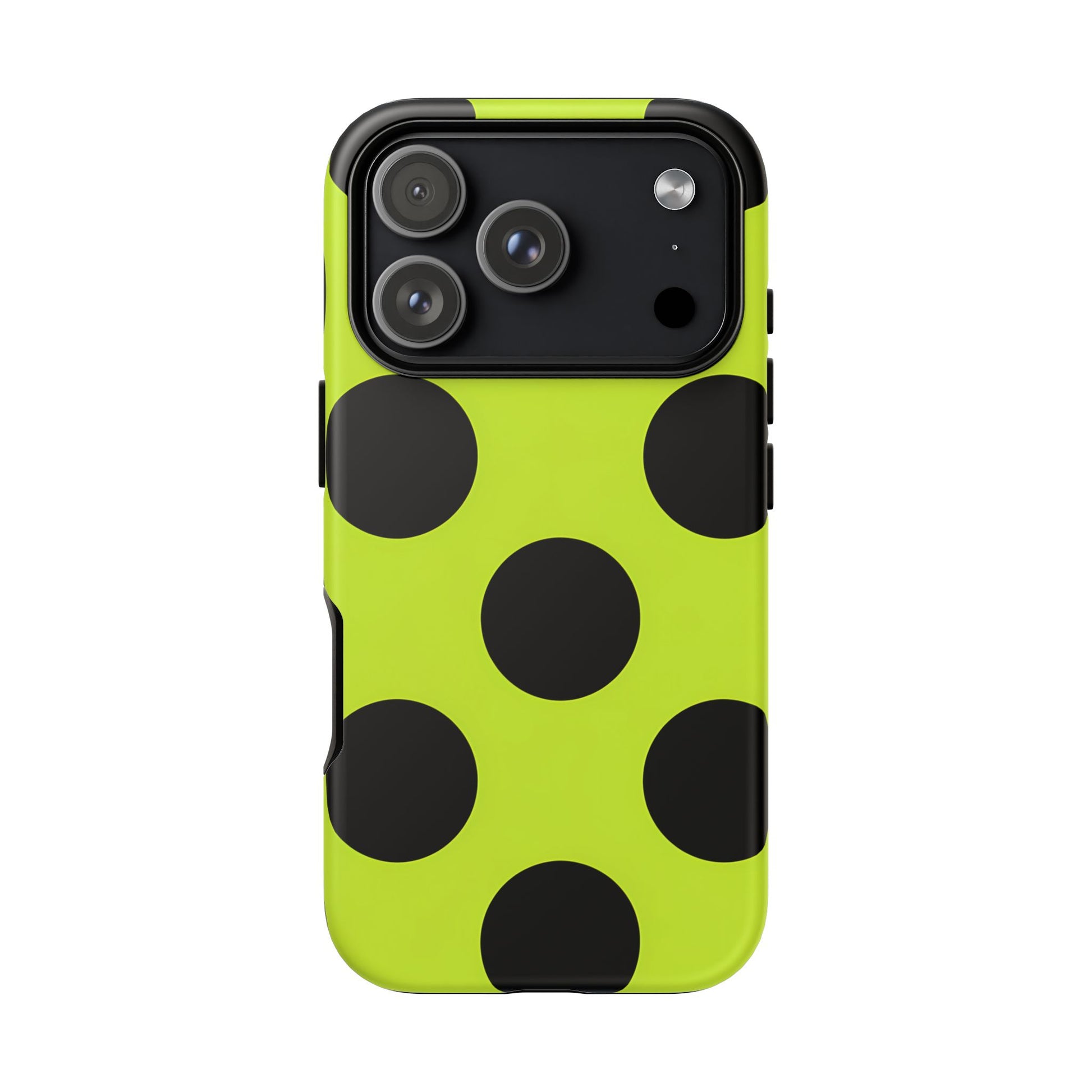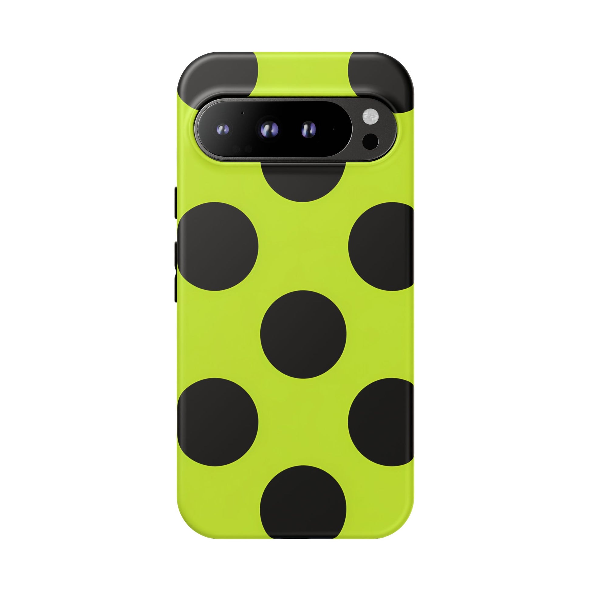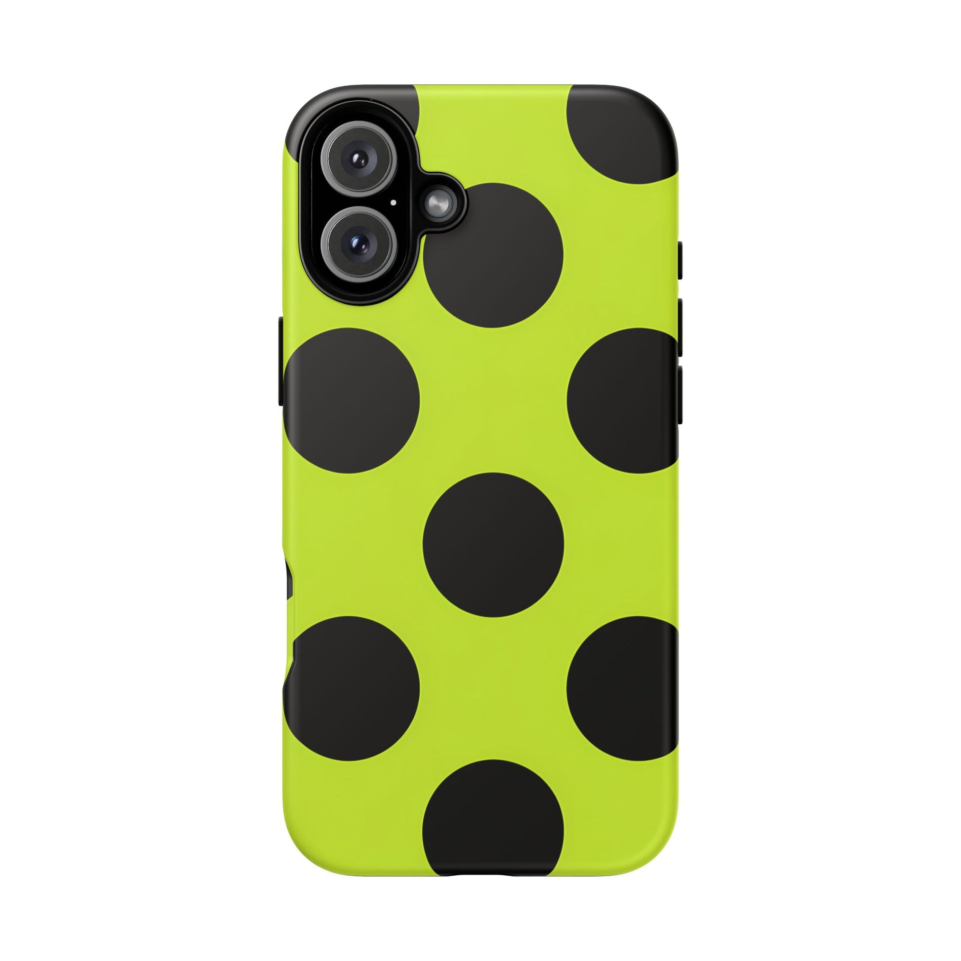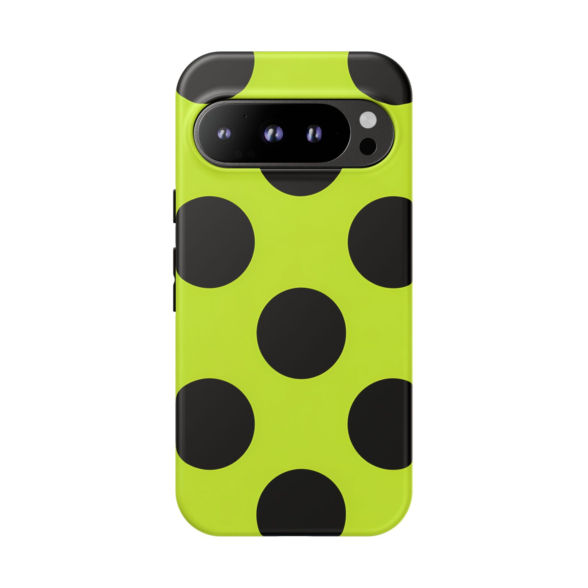 High-contrast black circles float evenly on a vivid lime base, offering a stylish, graphic, and fashion-forward pattern.