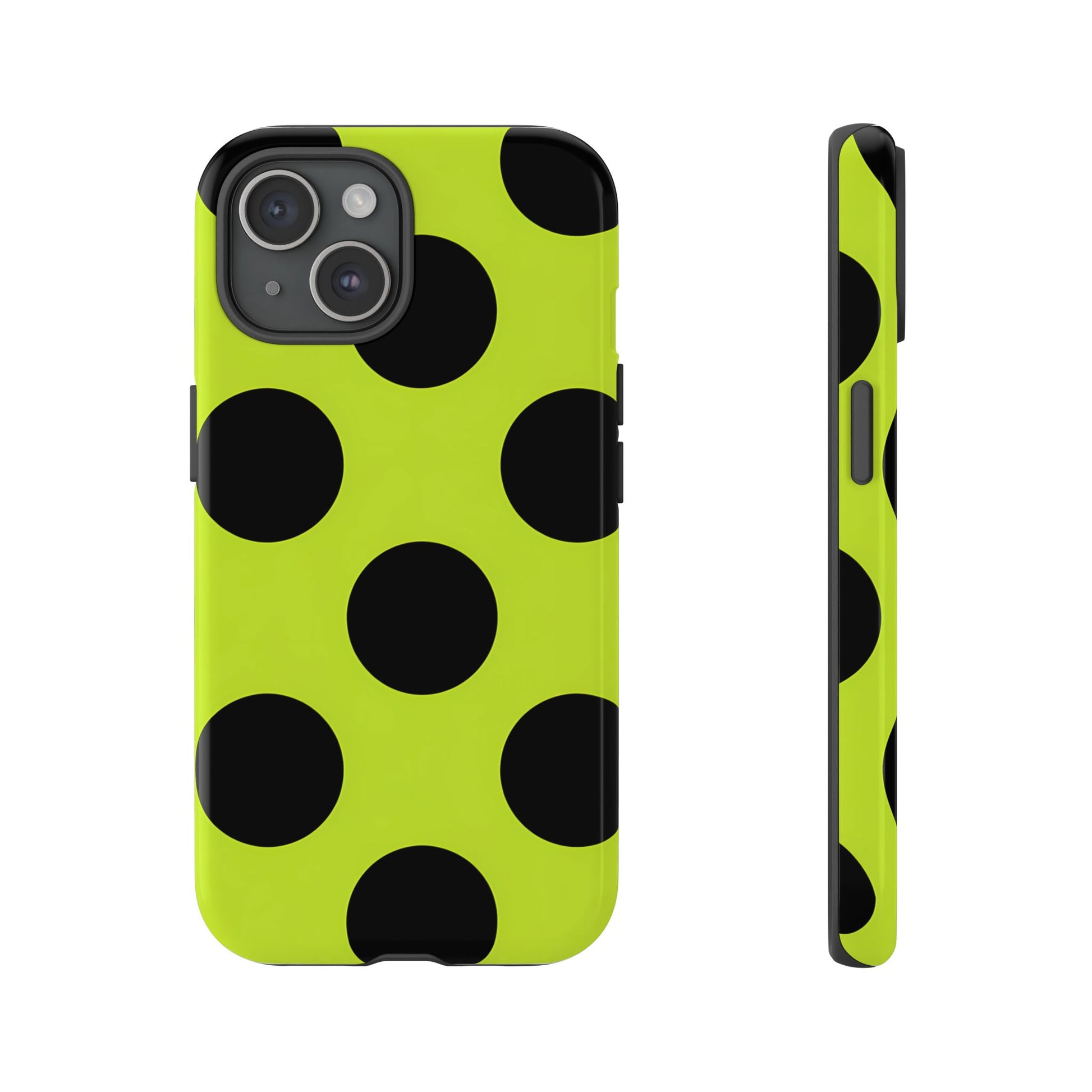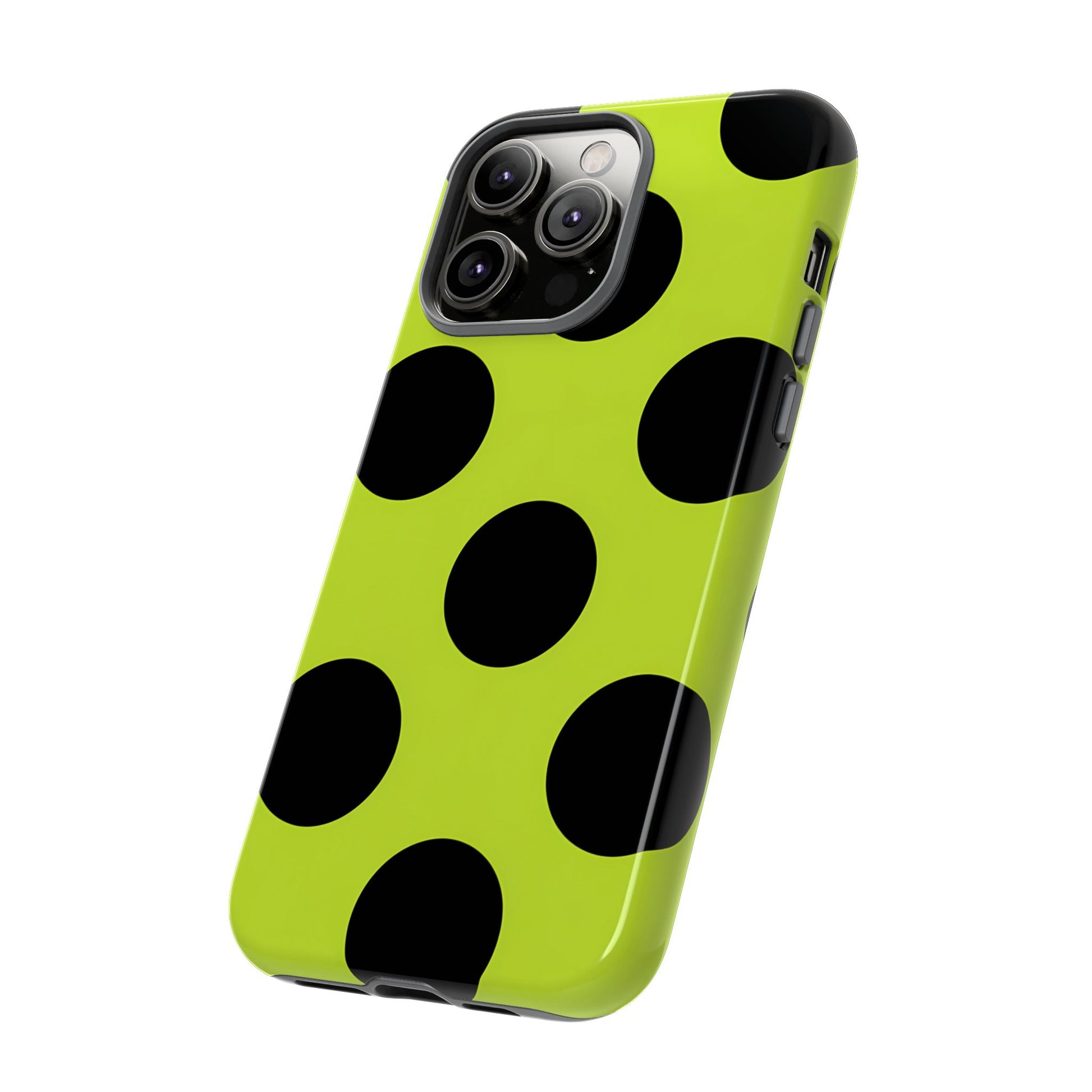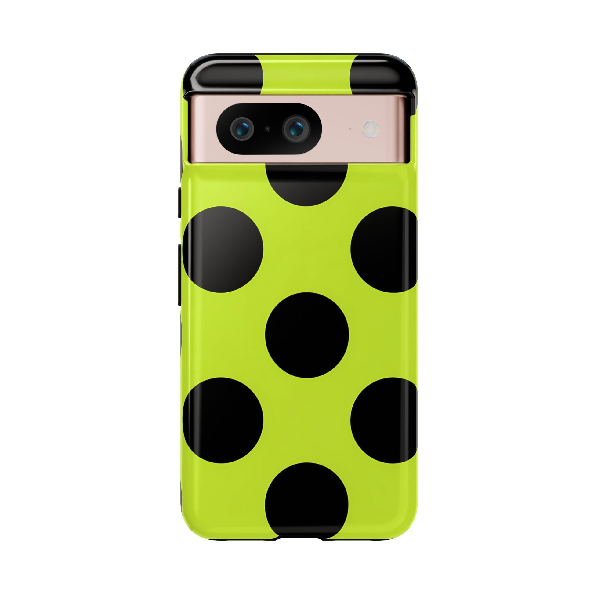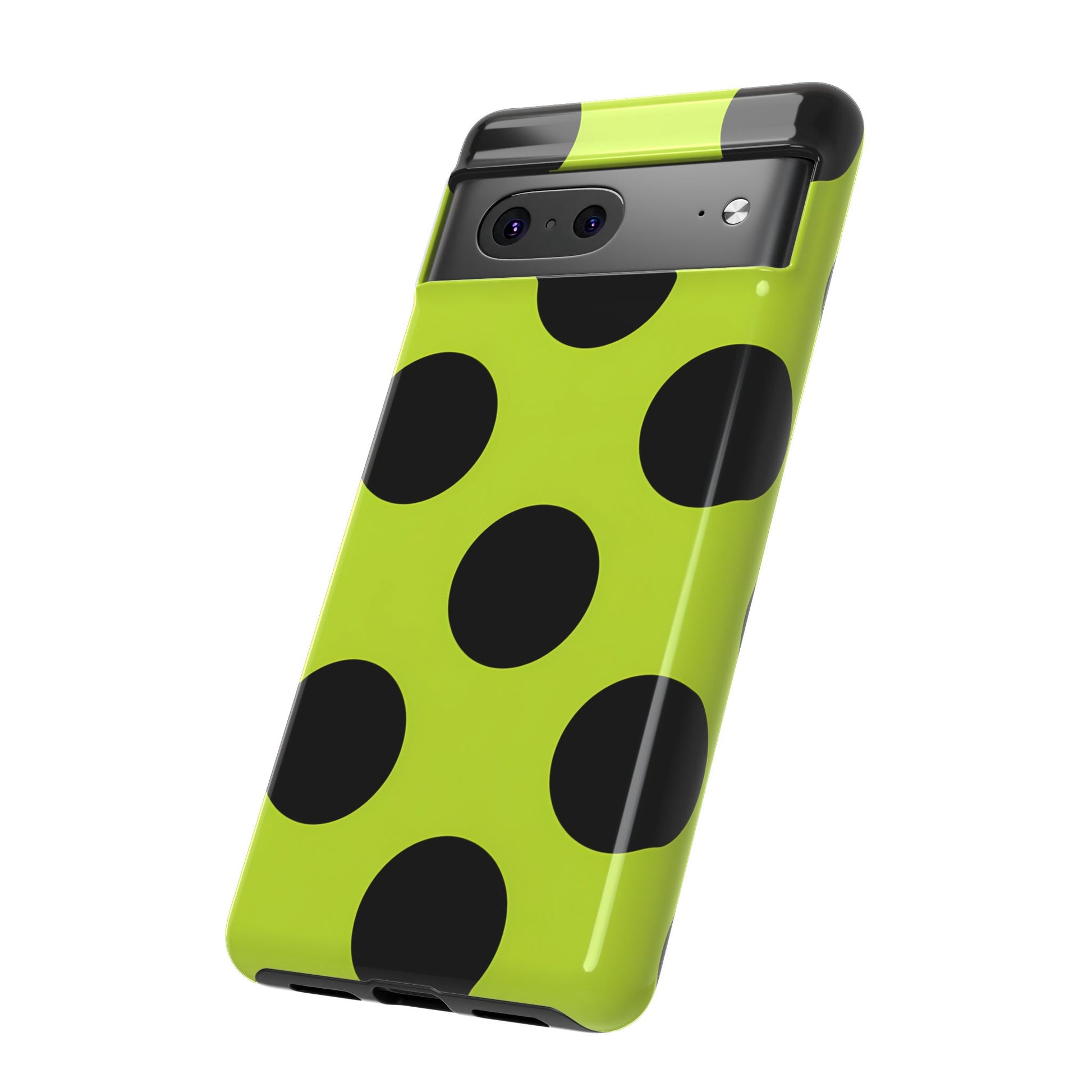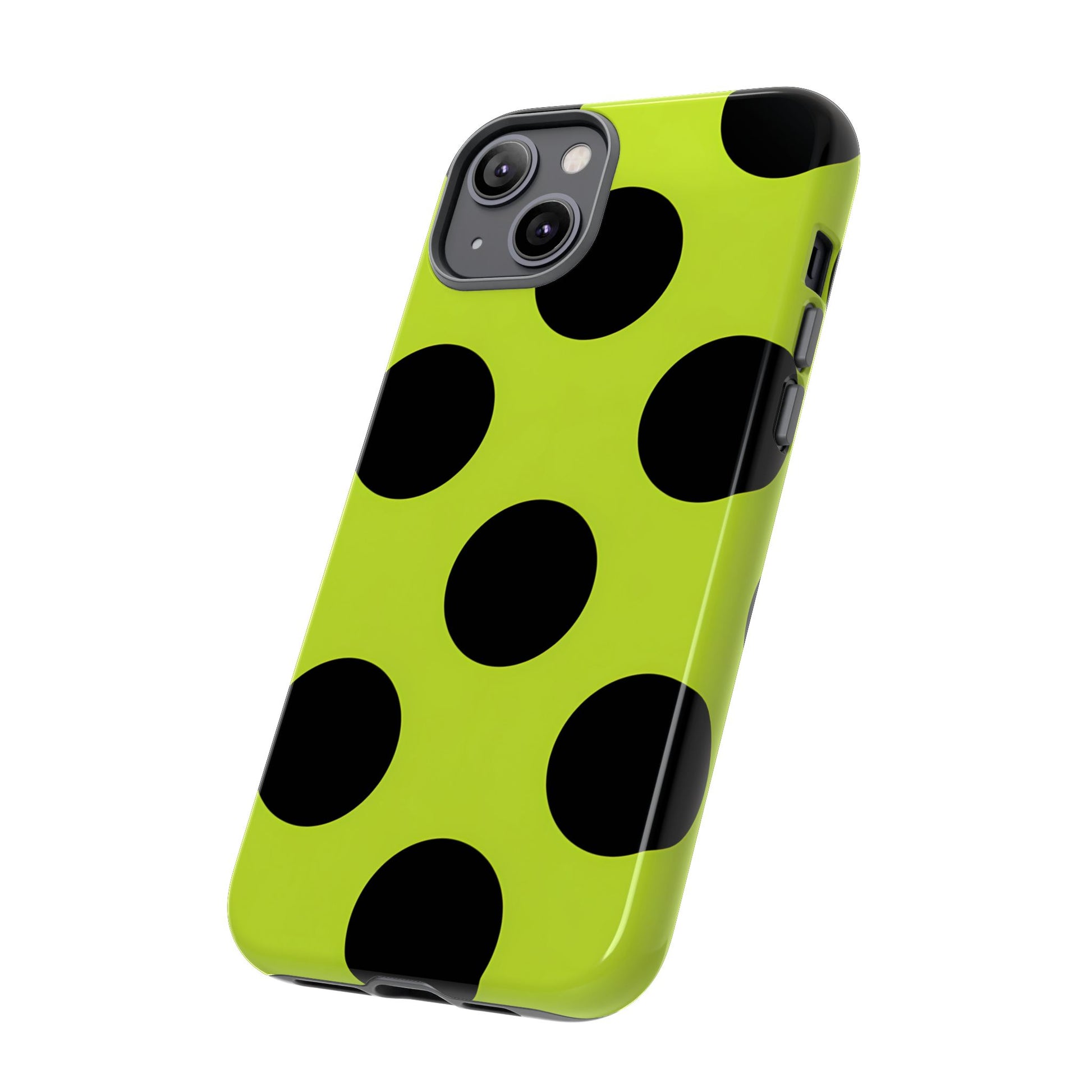 High-contrast black circles float evenly on a vivid lime base, offering a stylish, graphic, and fashion-forward pattern.