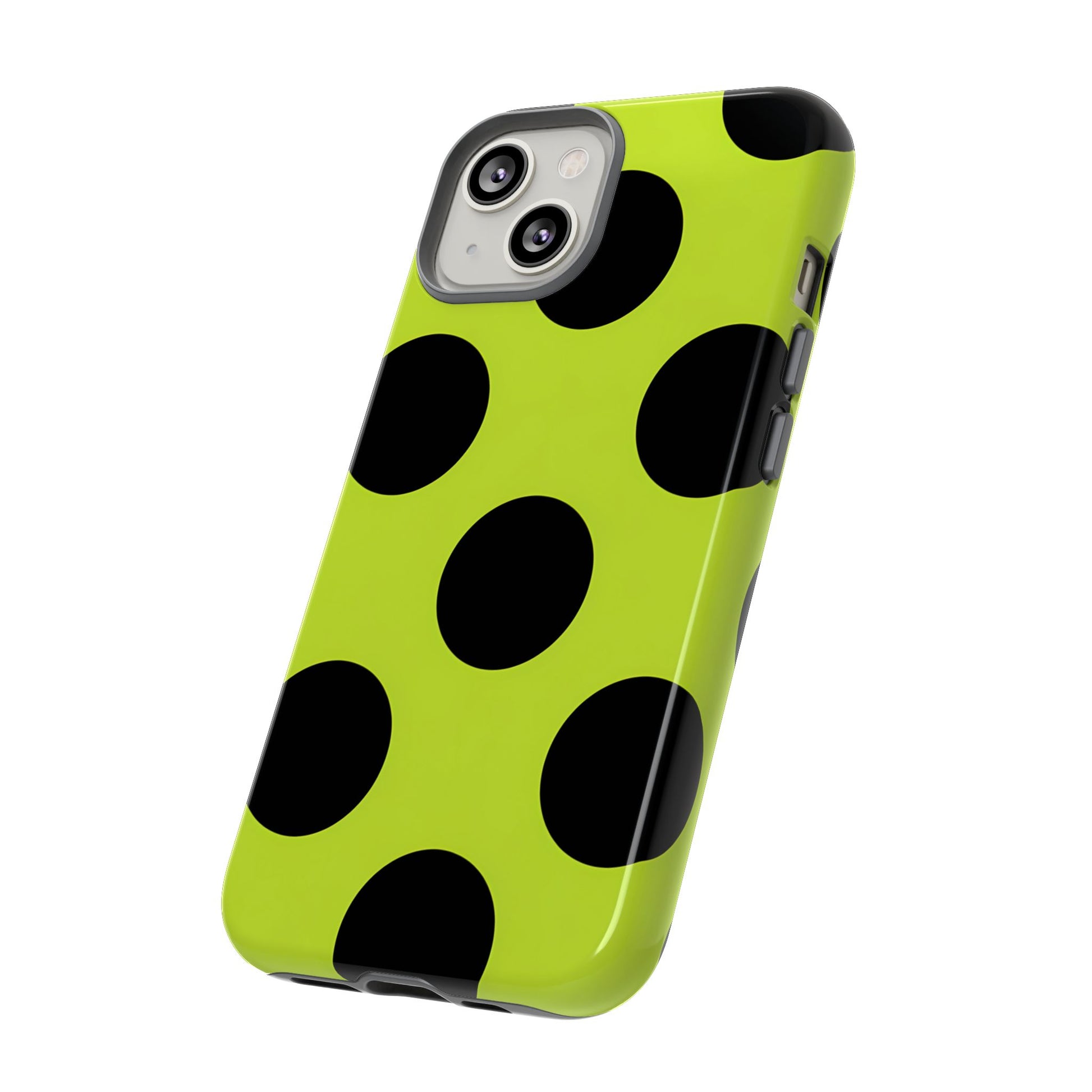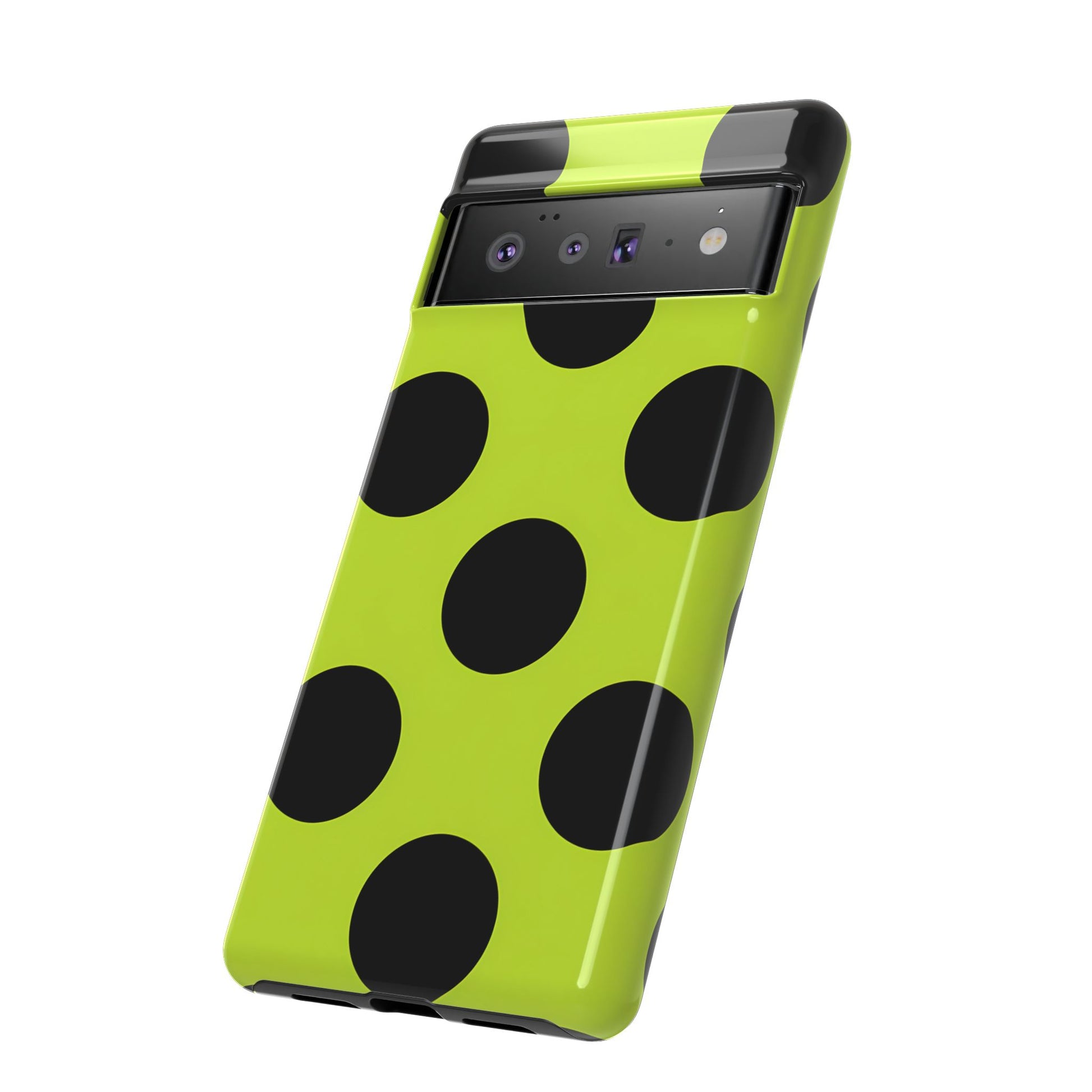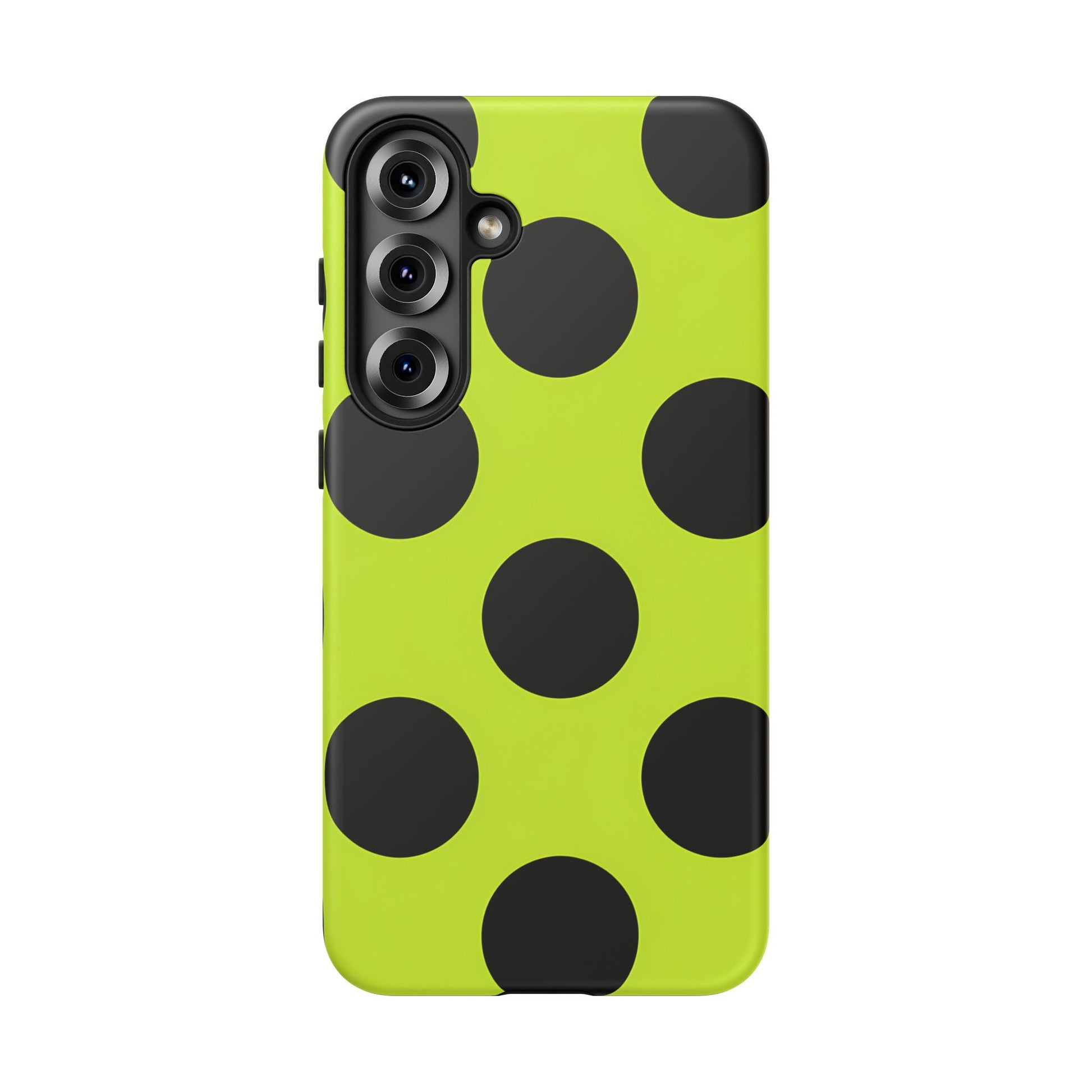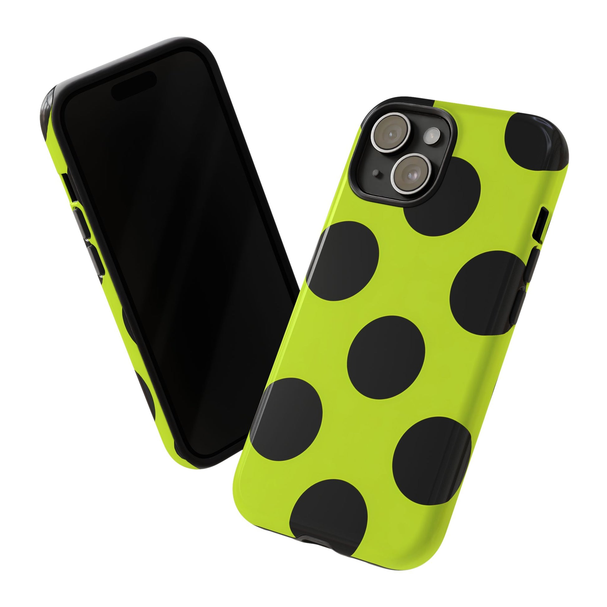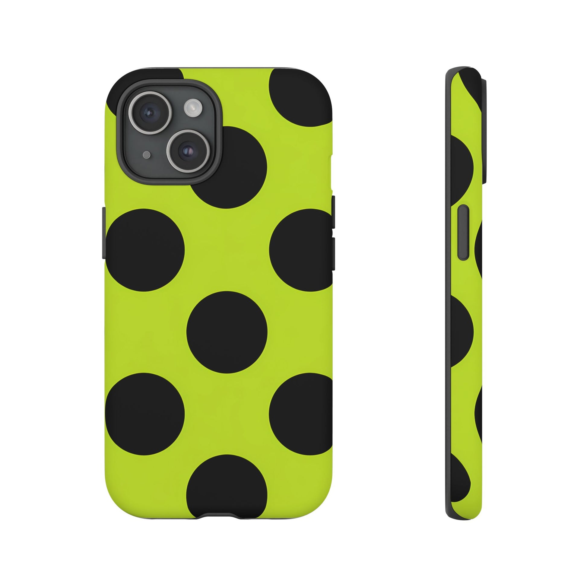 High-contrast black circles float evenly on a vivid lime base, offering a stylish, graphic, and fashion-forward pattern.