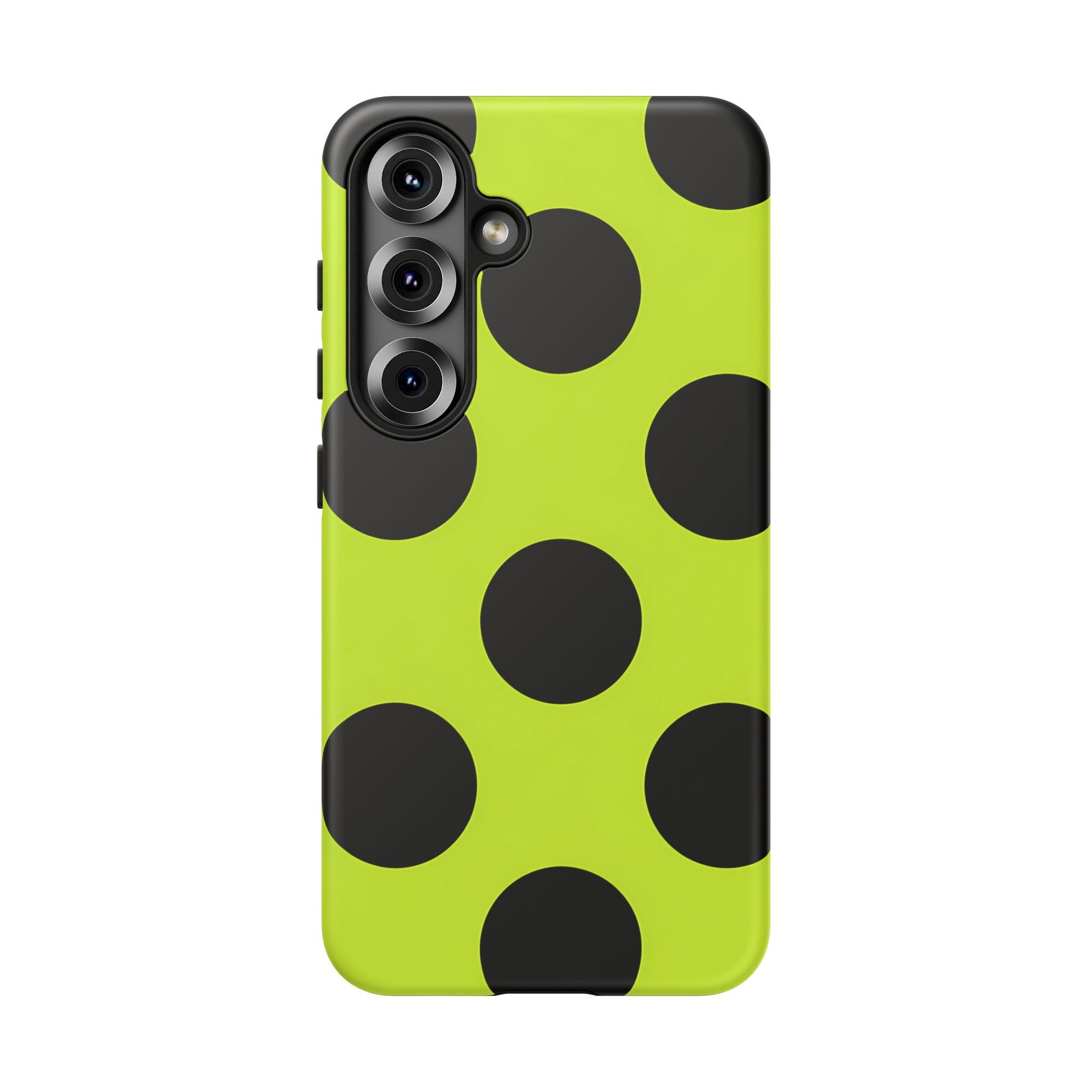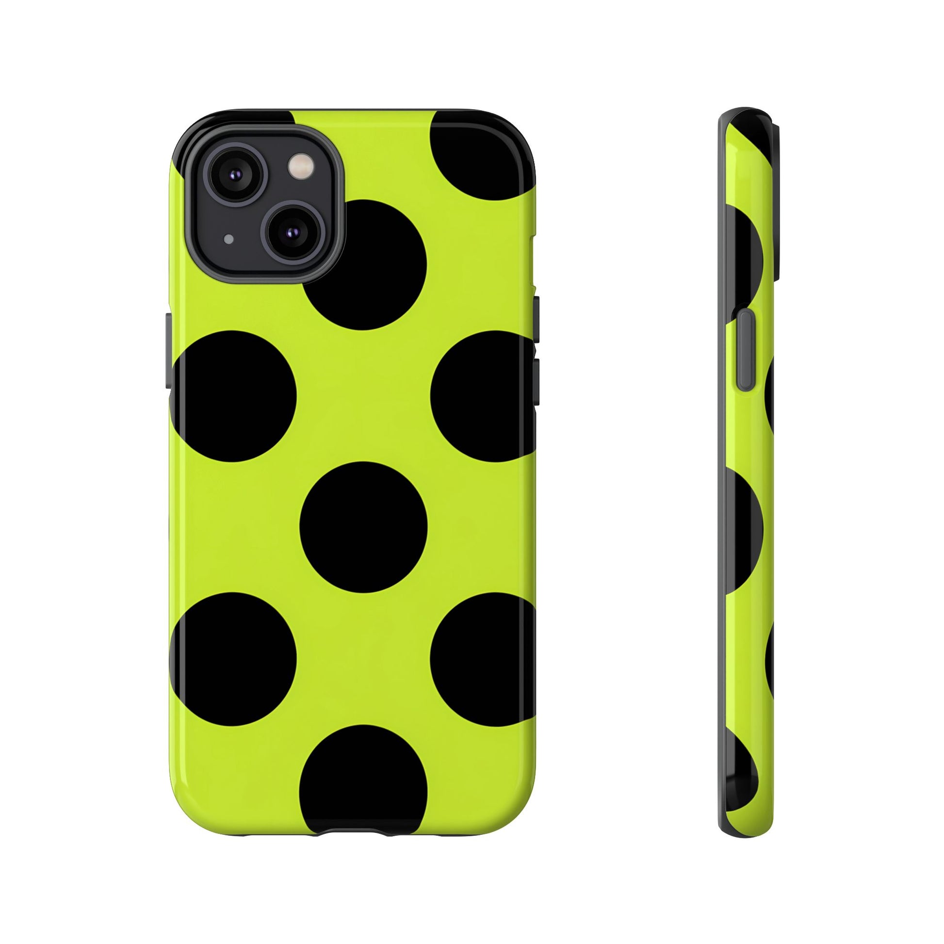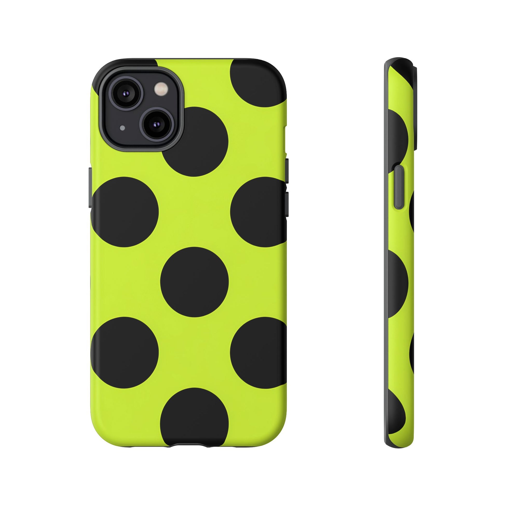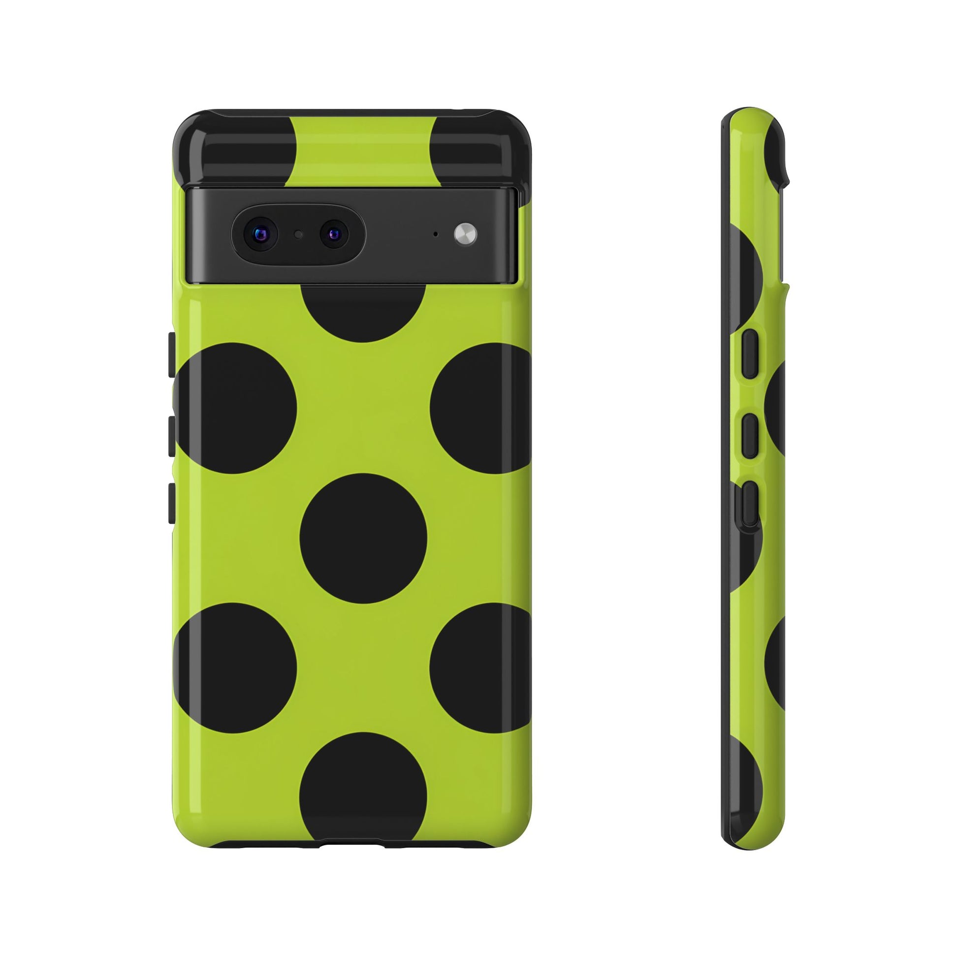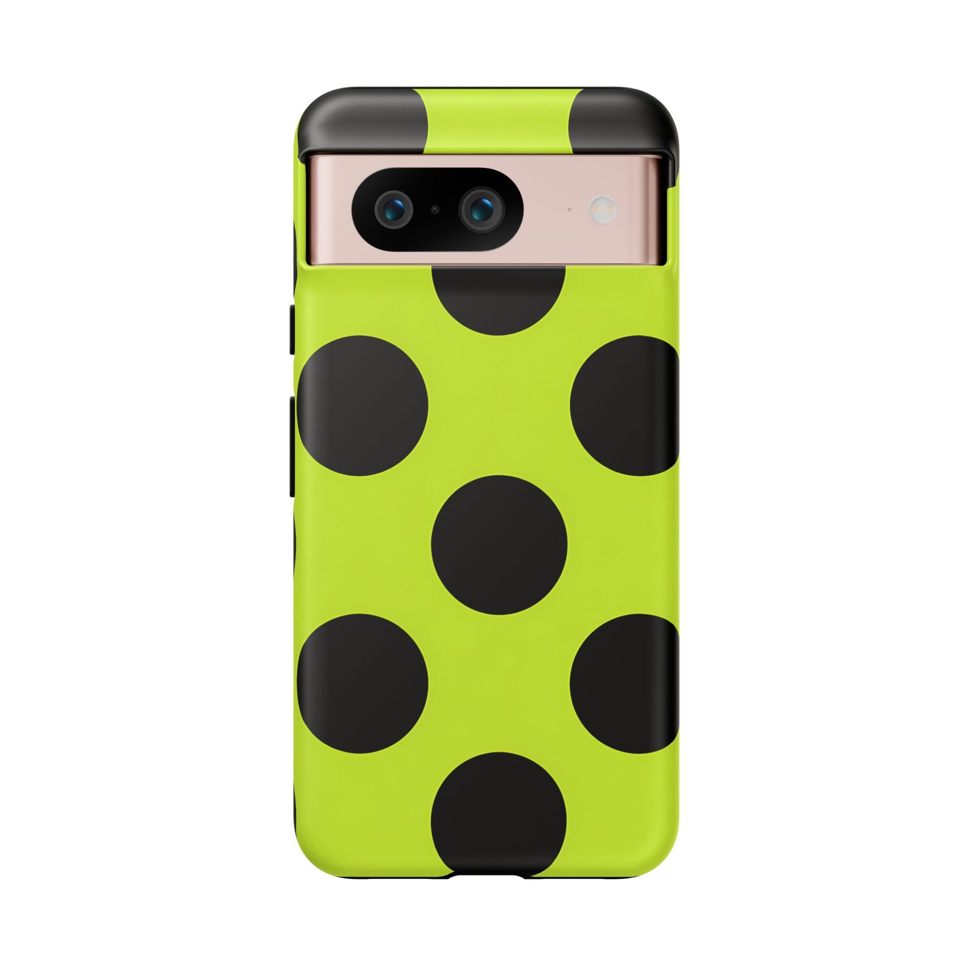 High-contrast black circles float evenly on a vivid lime base, offering a stylish, graphic, and fashion-forward pattern.