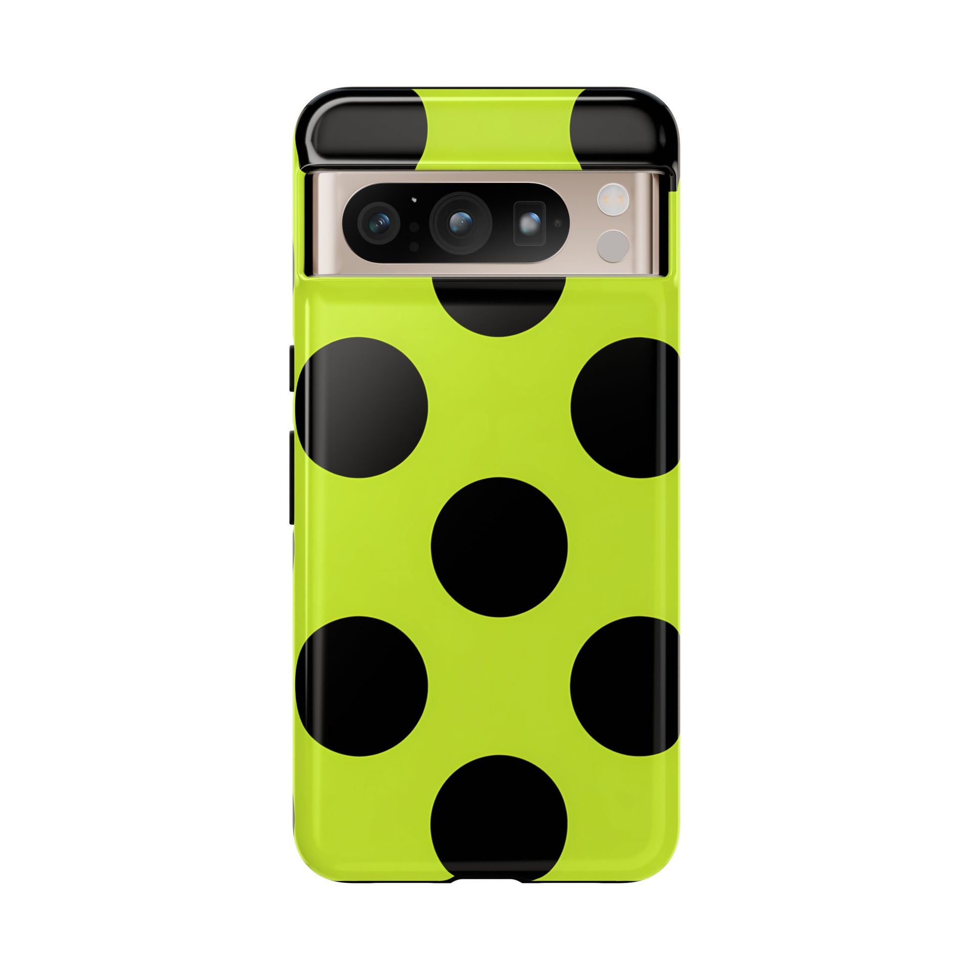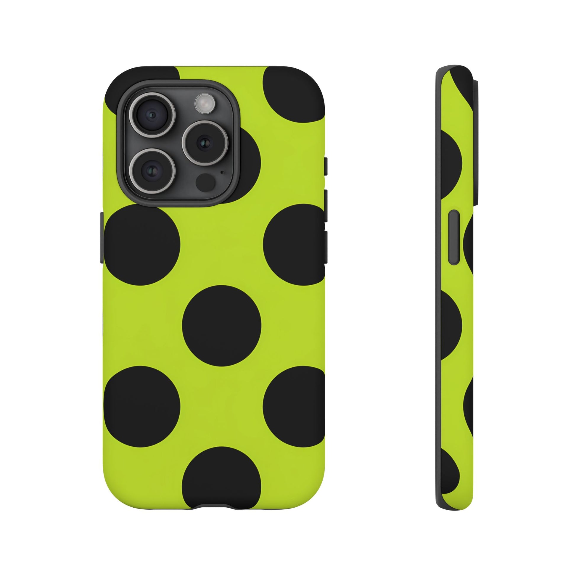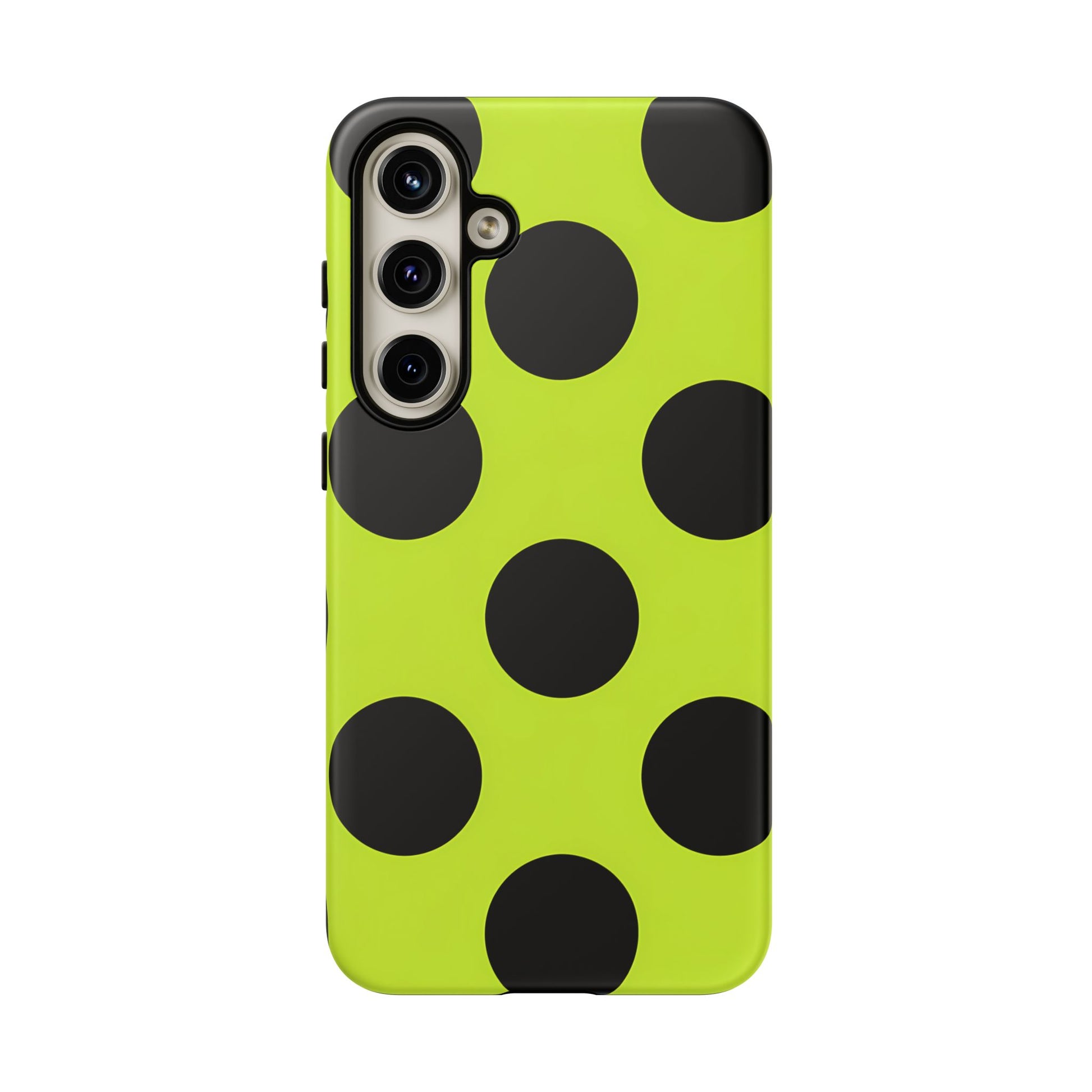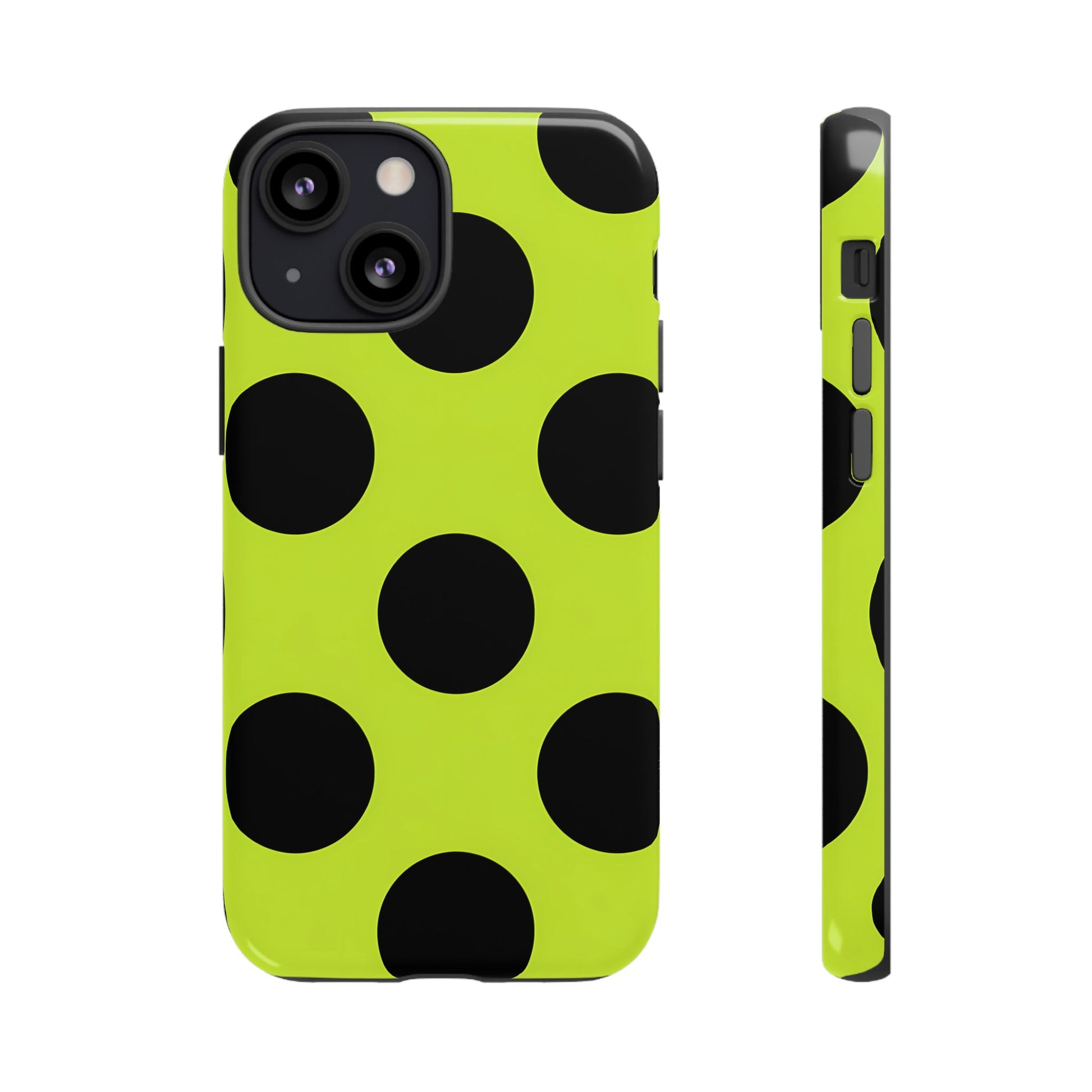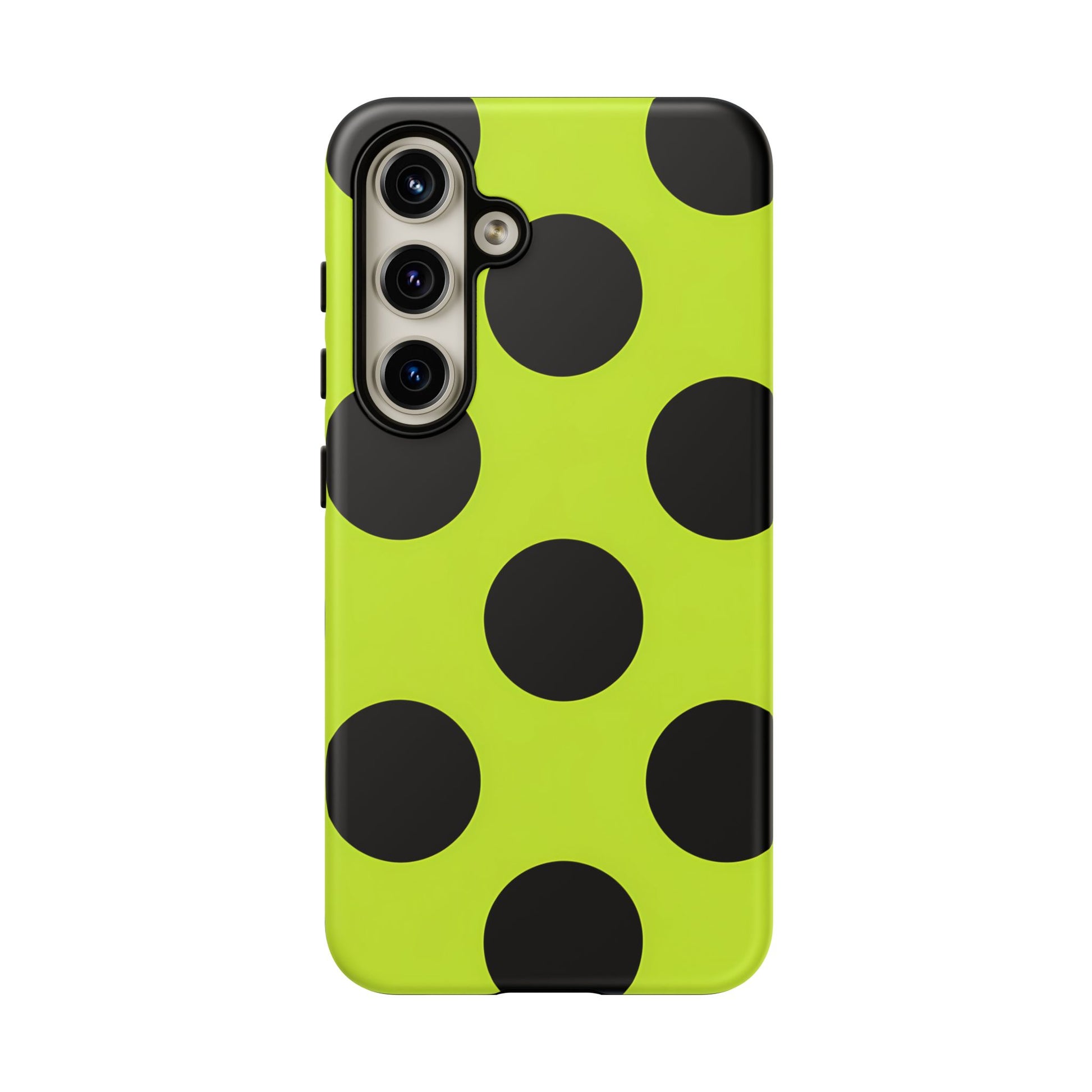 High-contrast black circles float evenly on a vivid lime base, offering a stylish, graphic, and fashion-forward pattern.