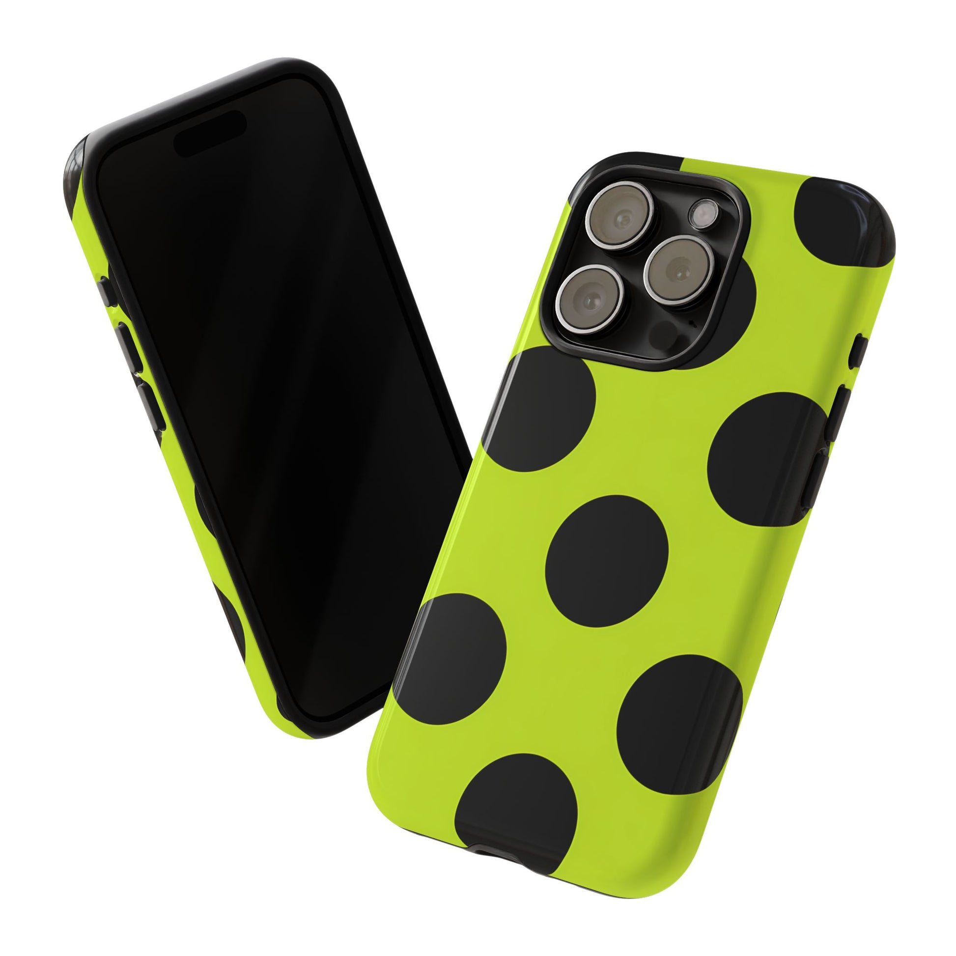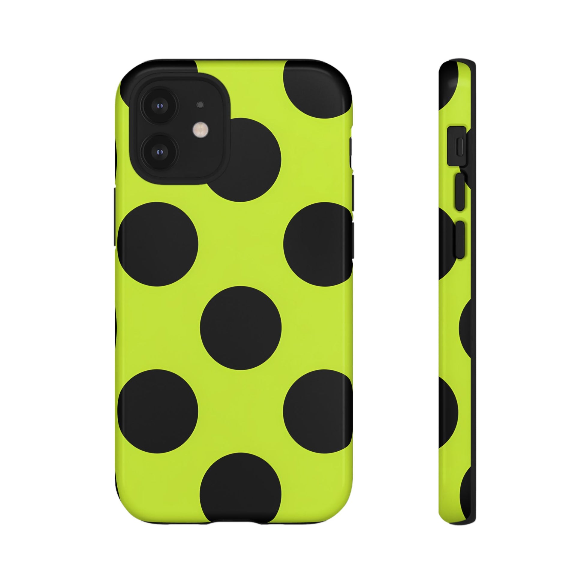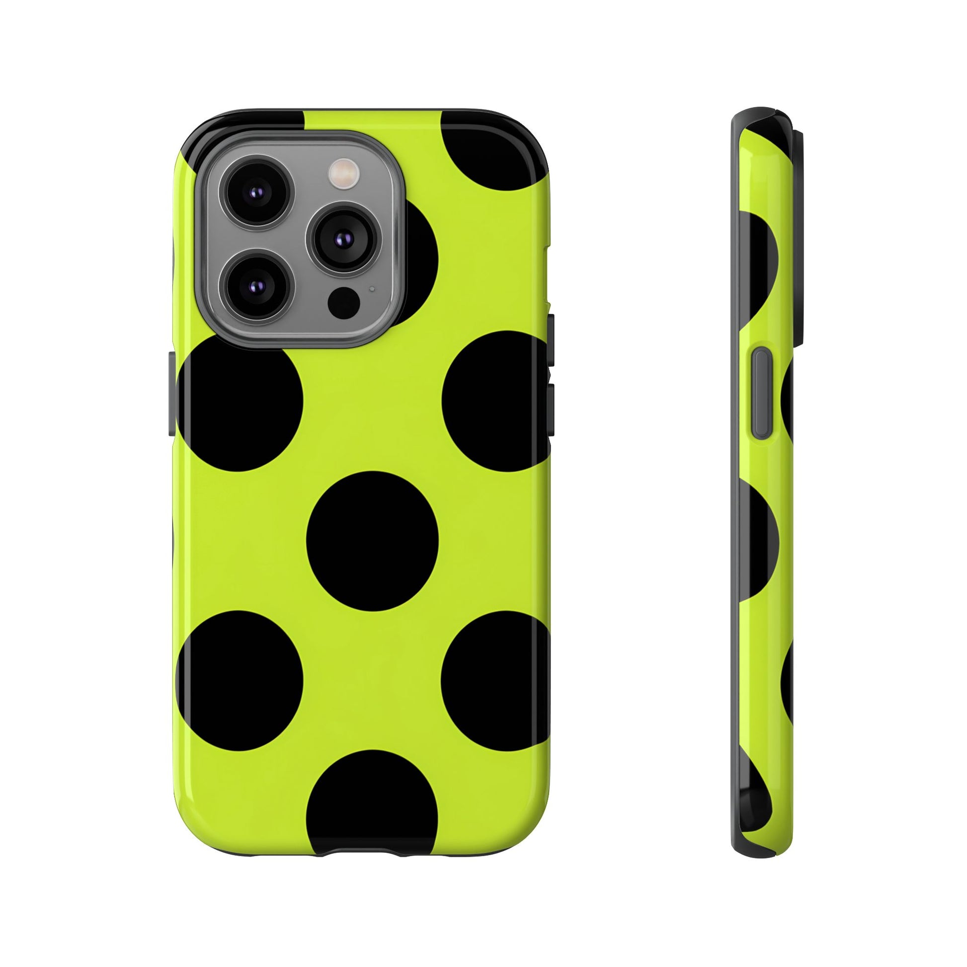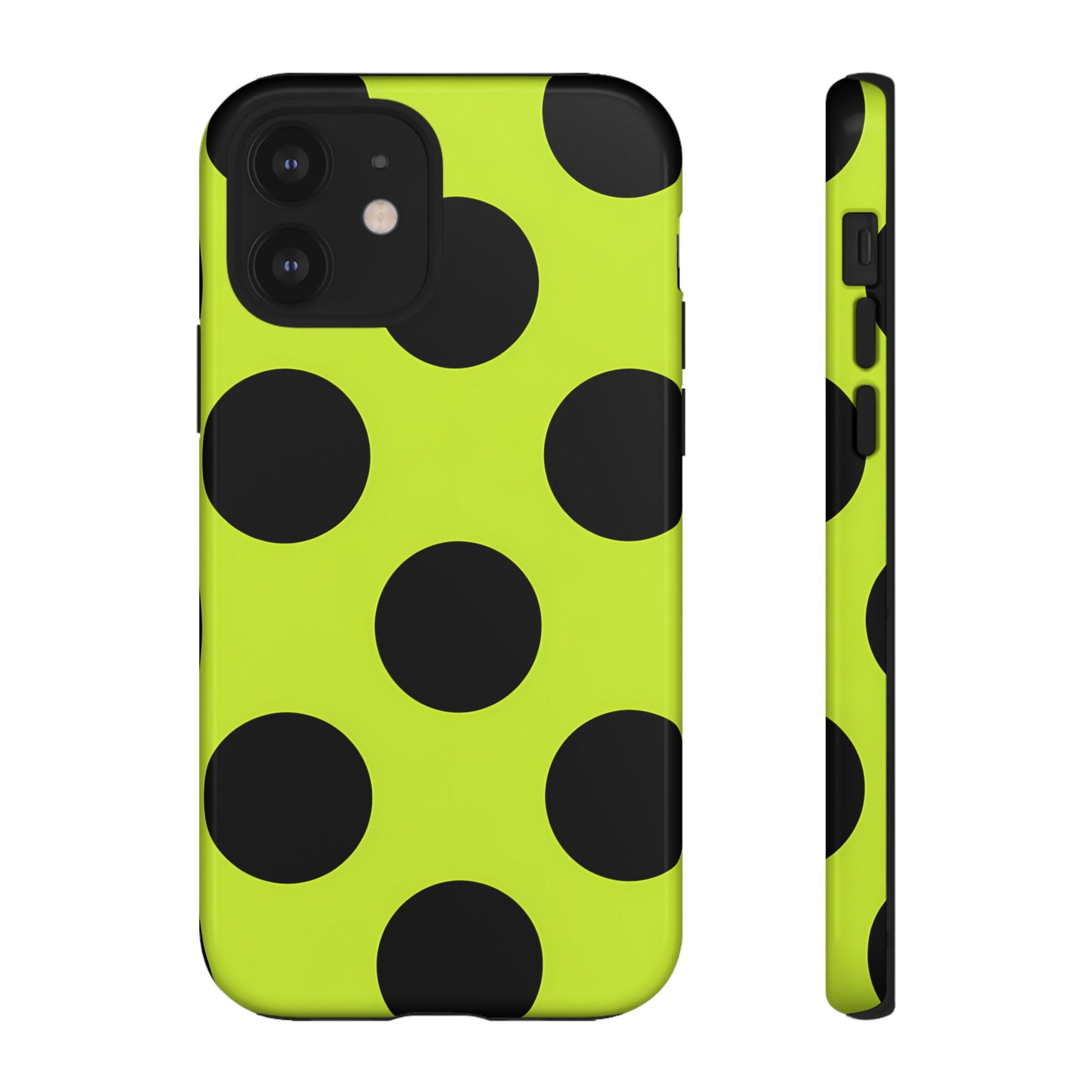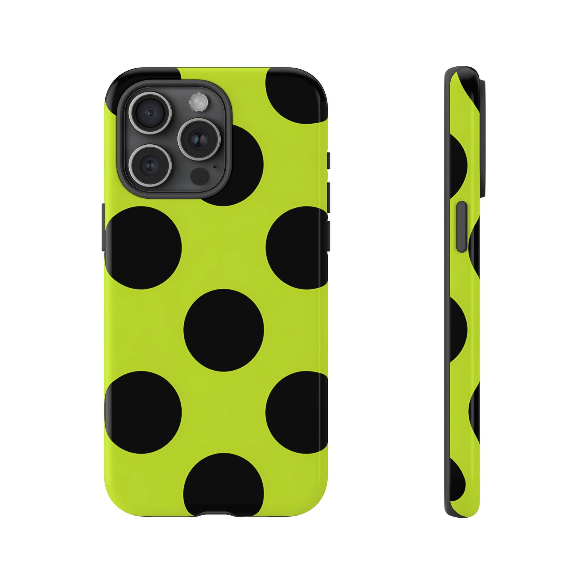 High-contrast black circles float evenly on a vivid lime base, offering a stylish, graphic, and fashion-forward pattern.