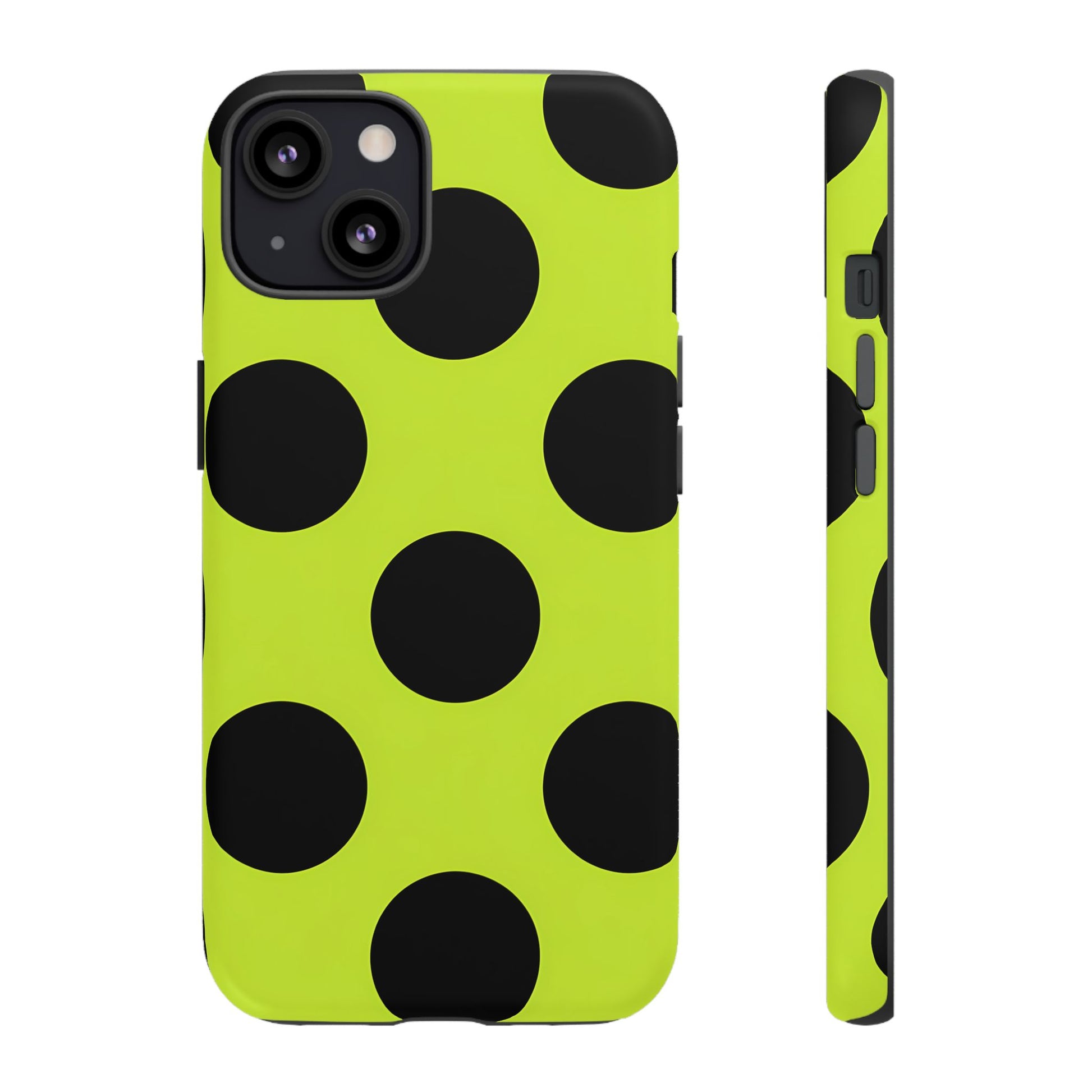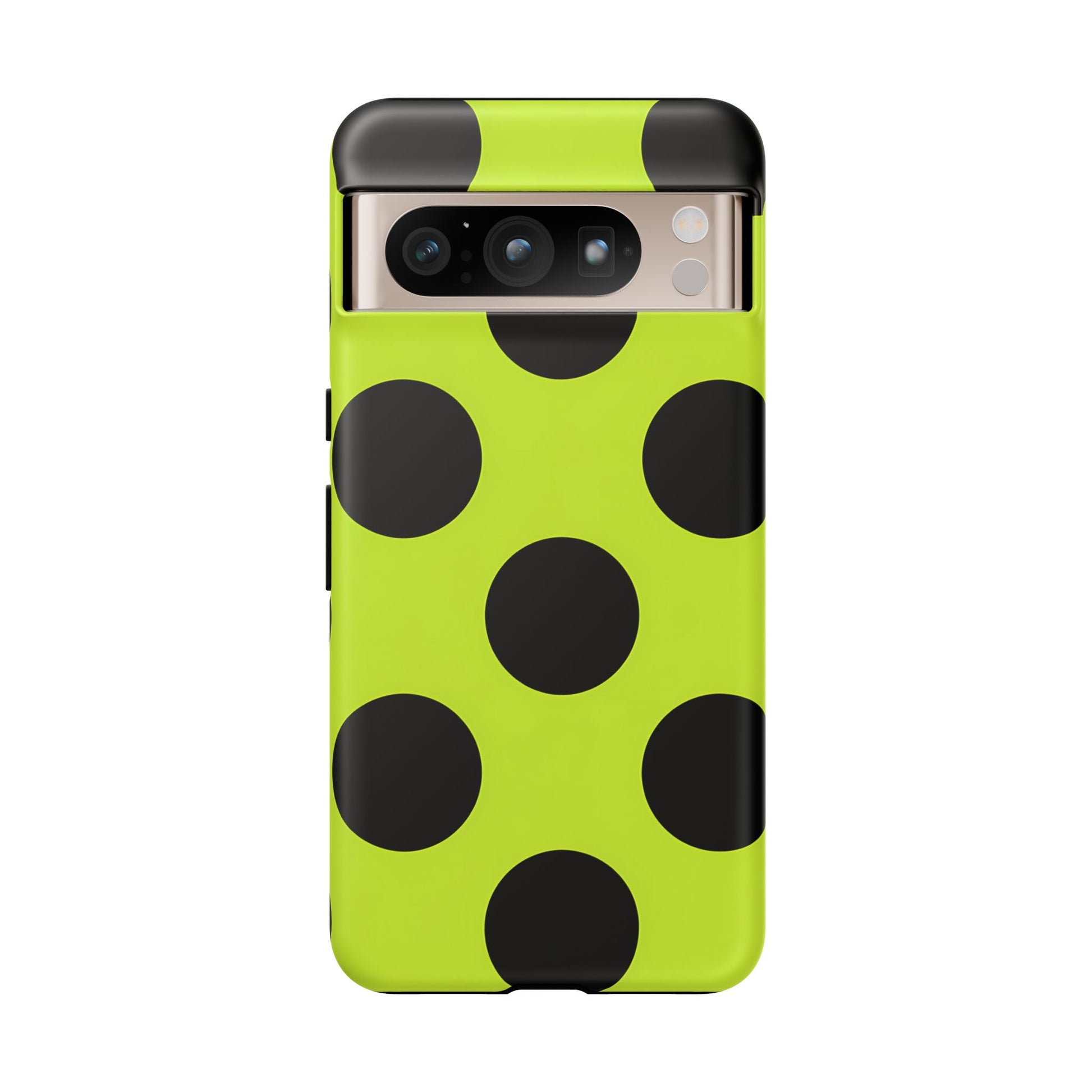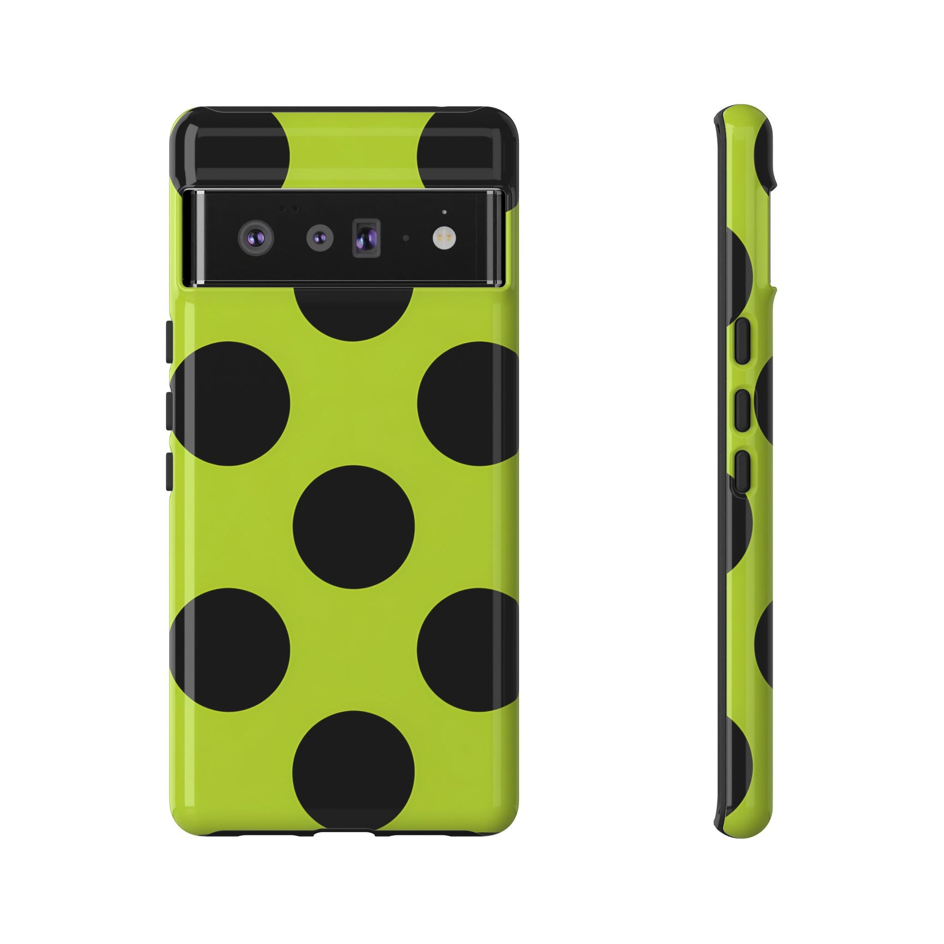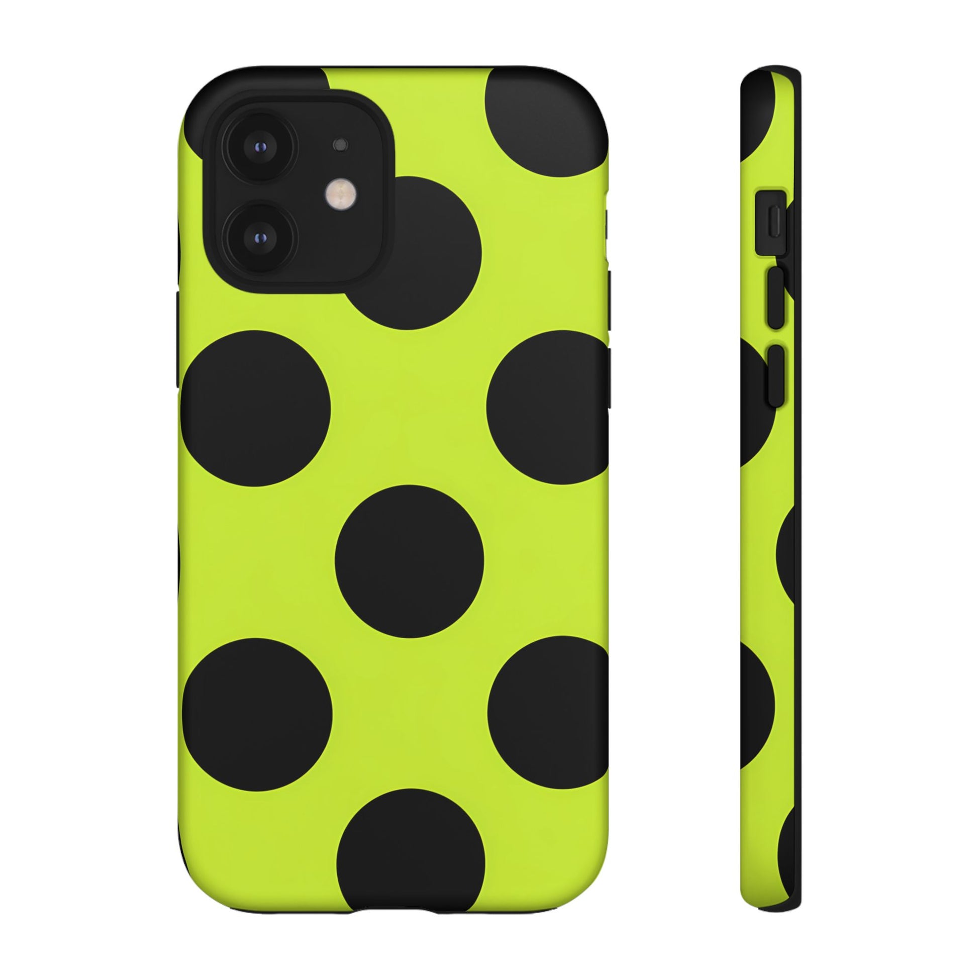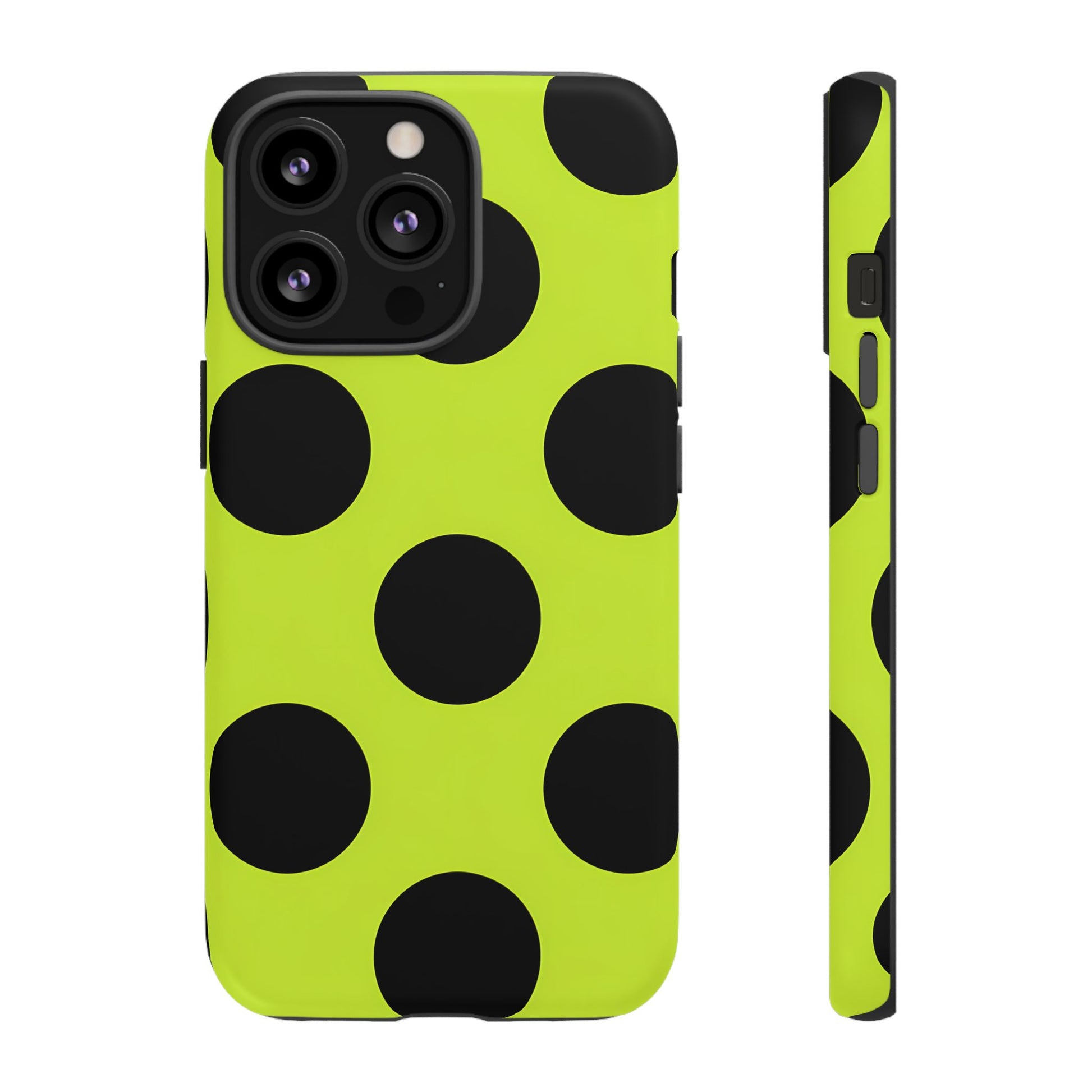 High-contrast black circles float evenly on a vivid lime base, offering a stylish, graphic, and fashion-forward pattern.