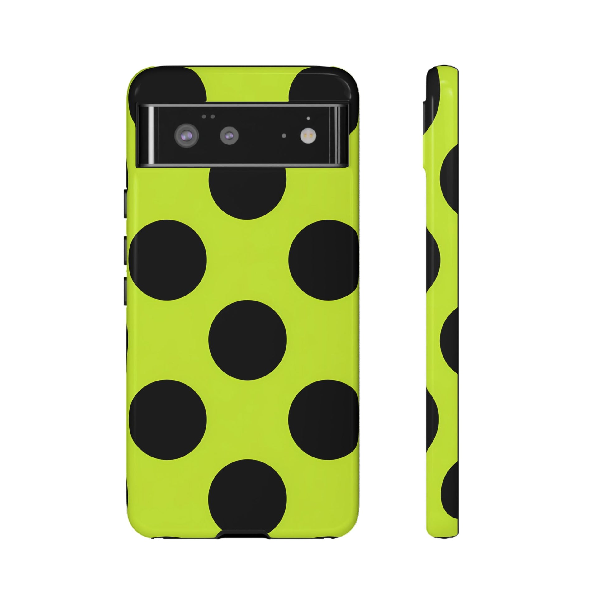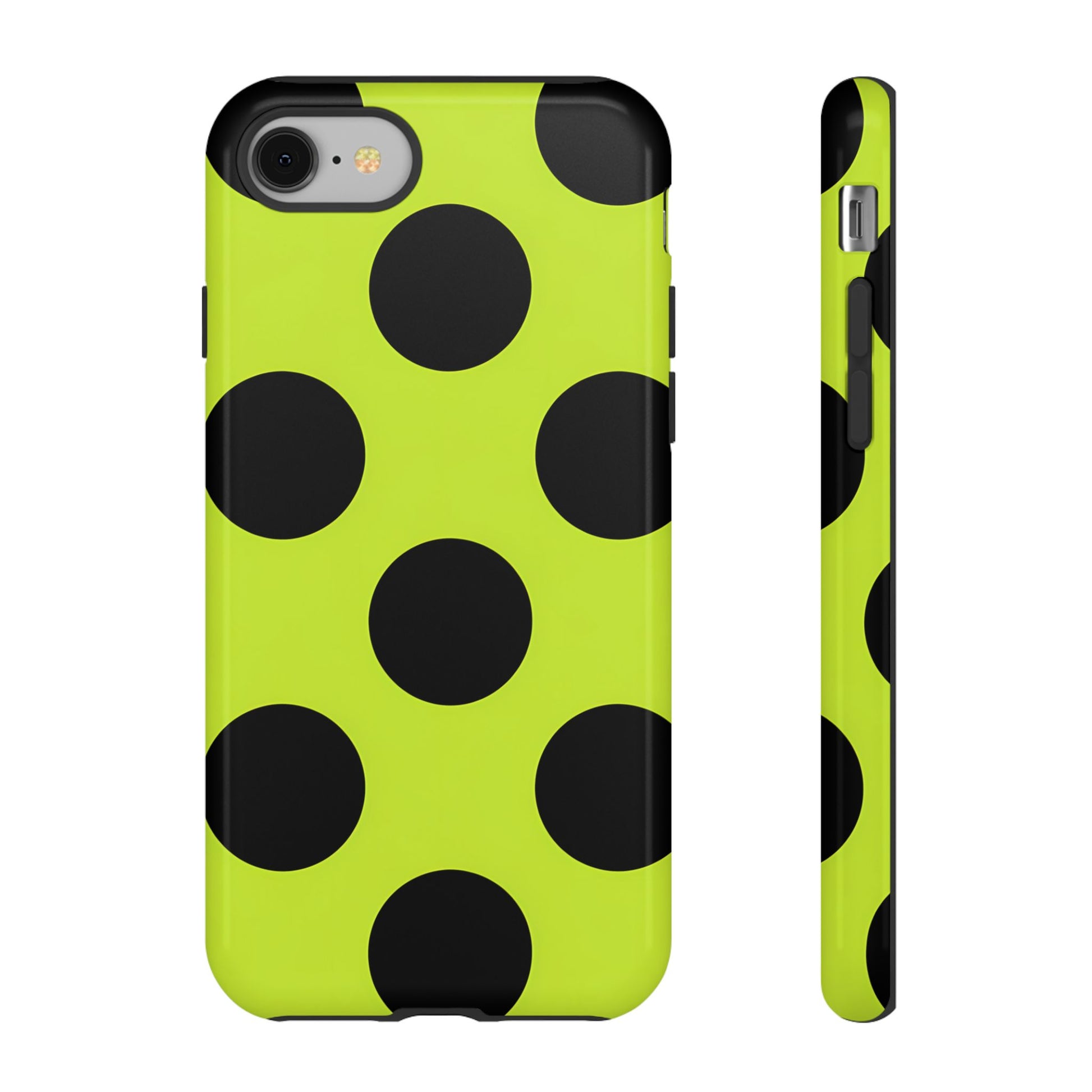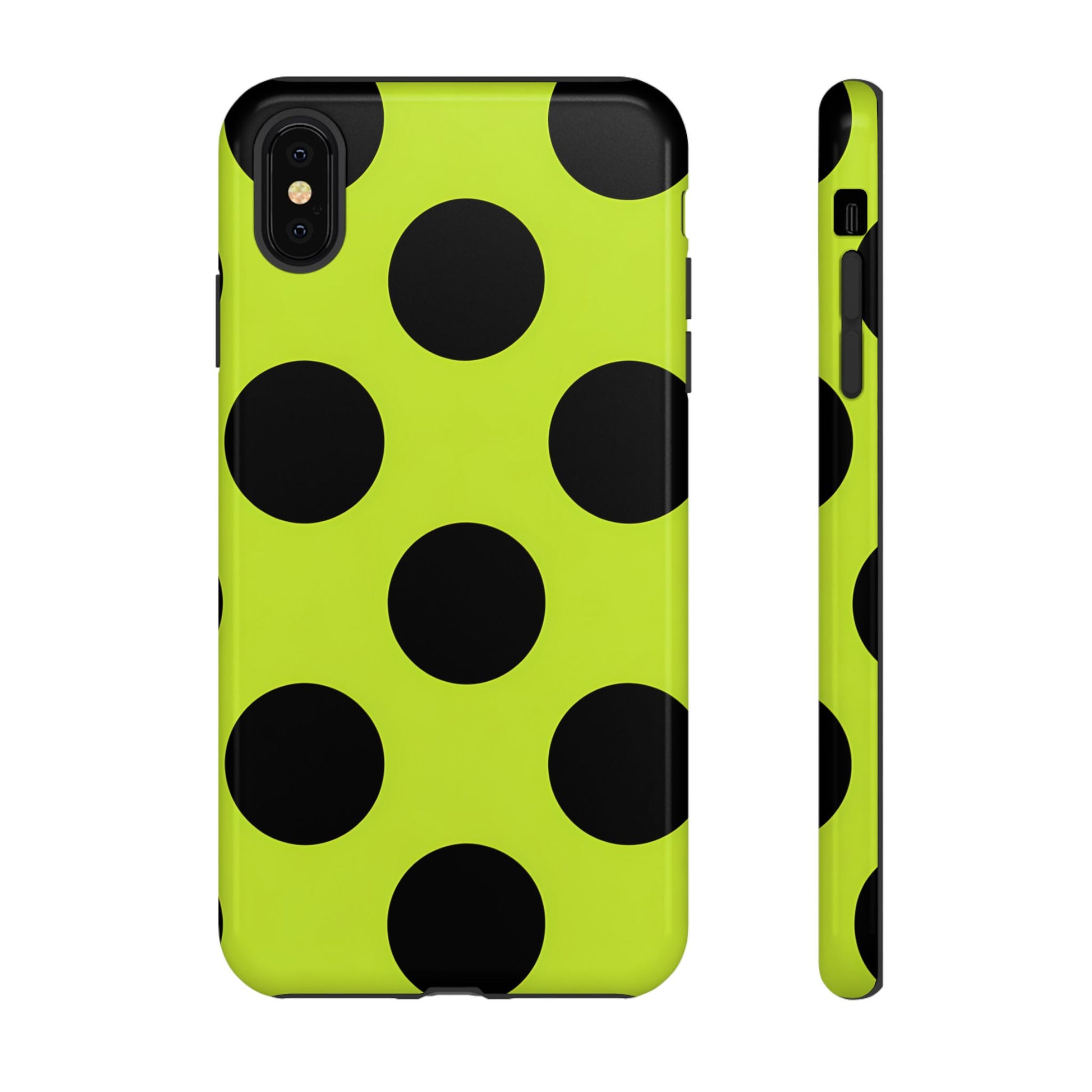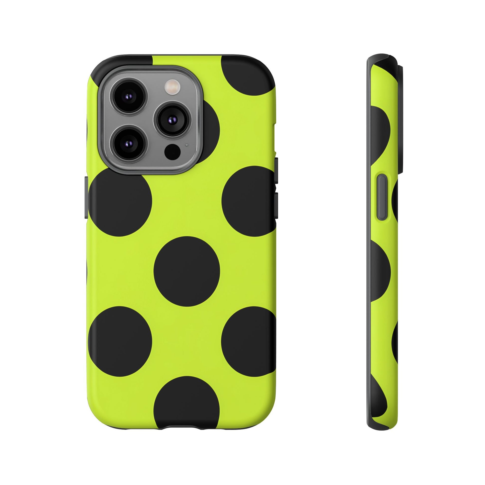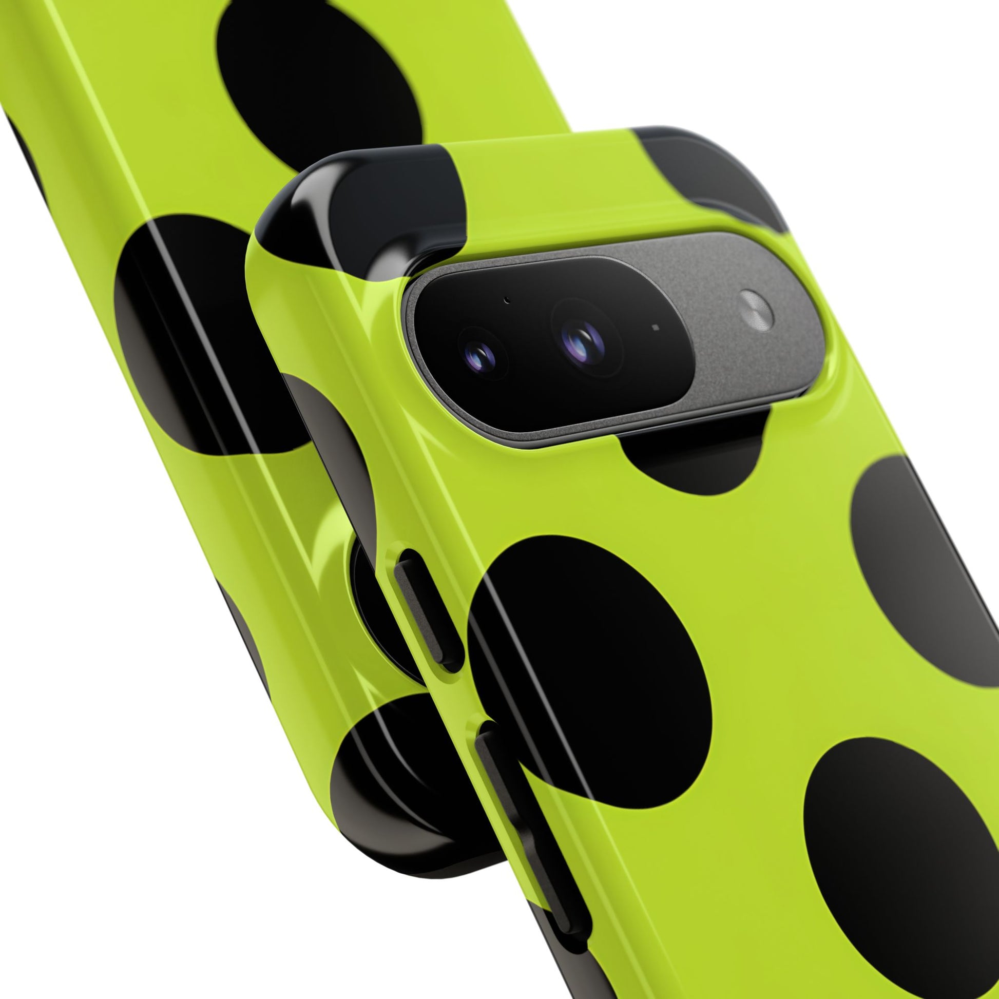 High-contrast black circles float evenly on a vivid lime base, offering a stylish, graphic, and fashion-forward pattern.