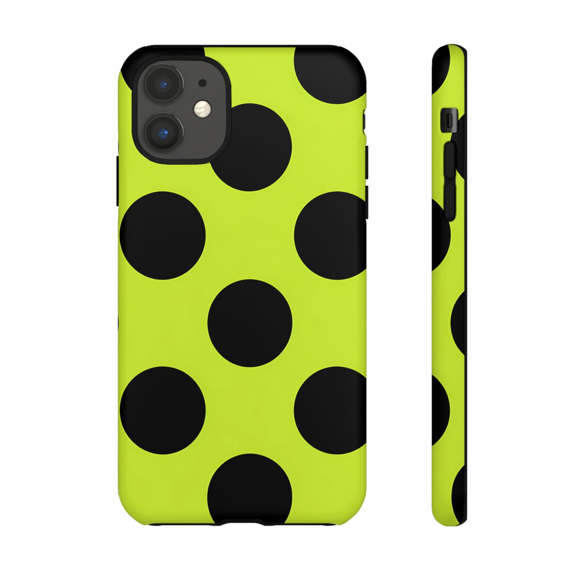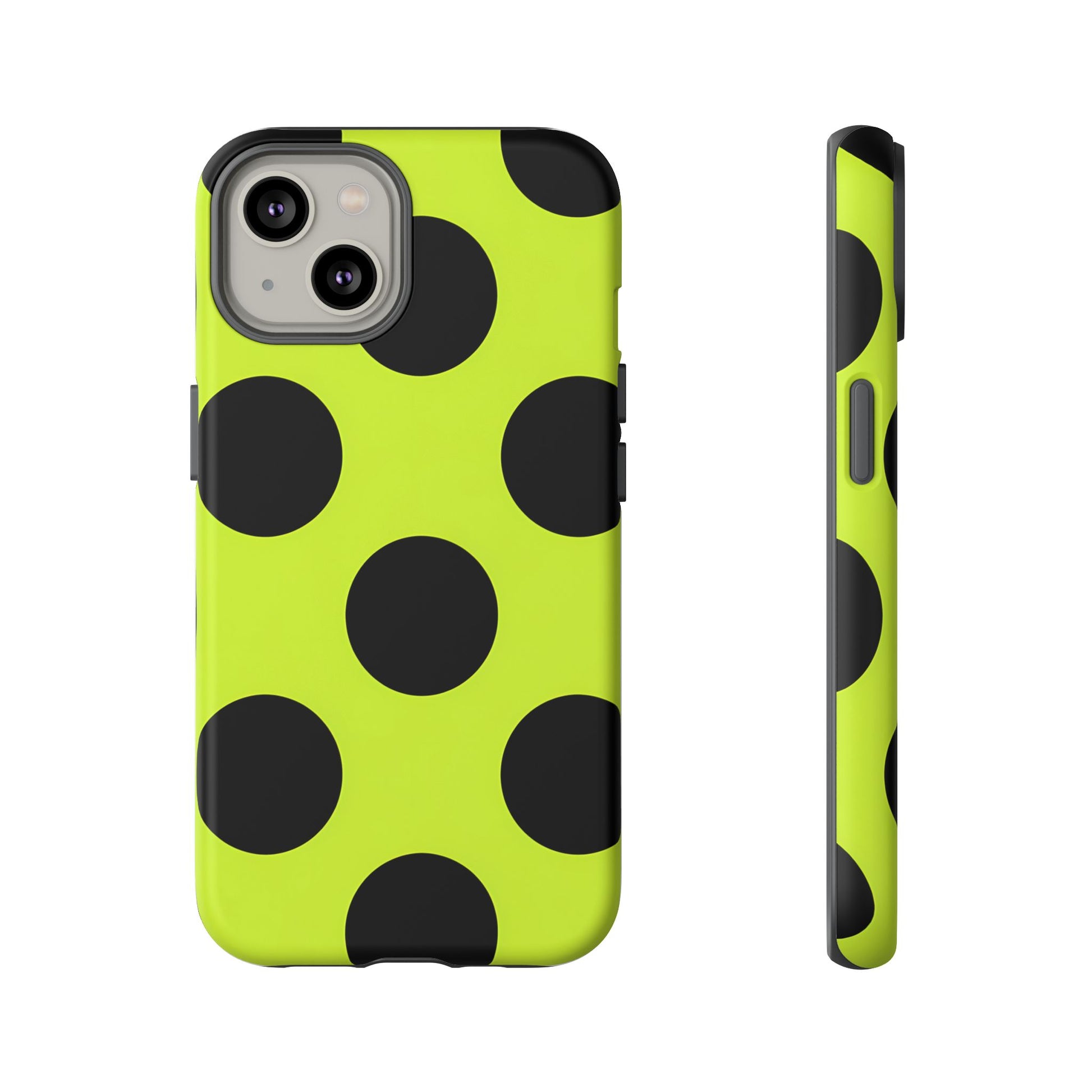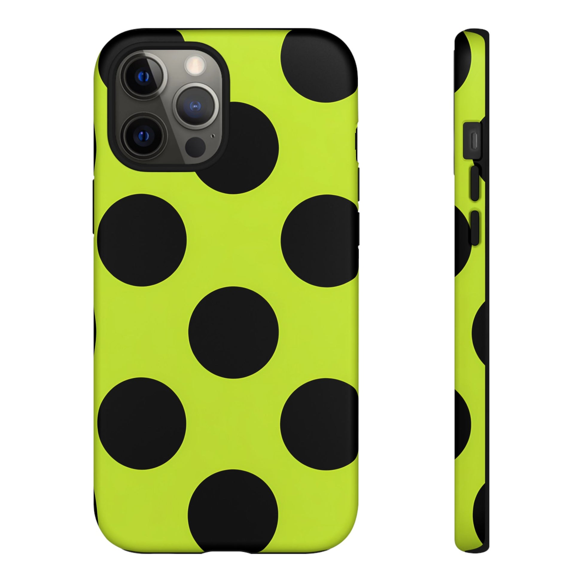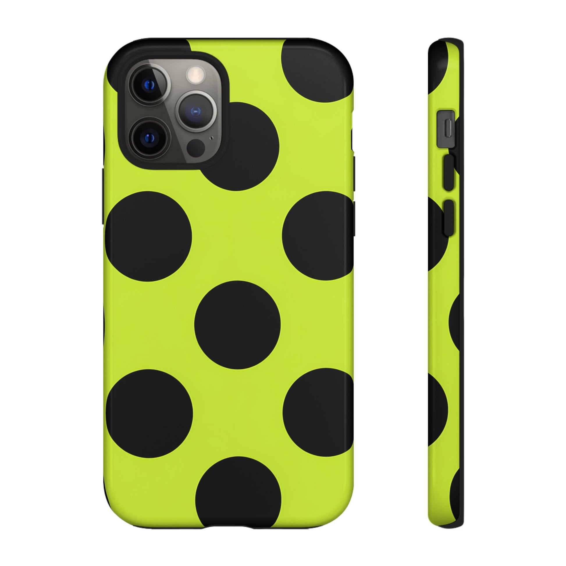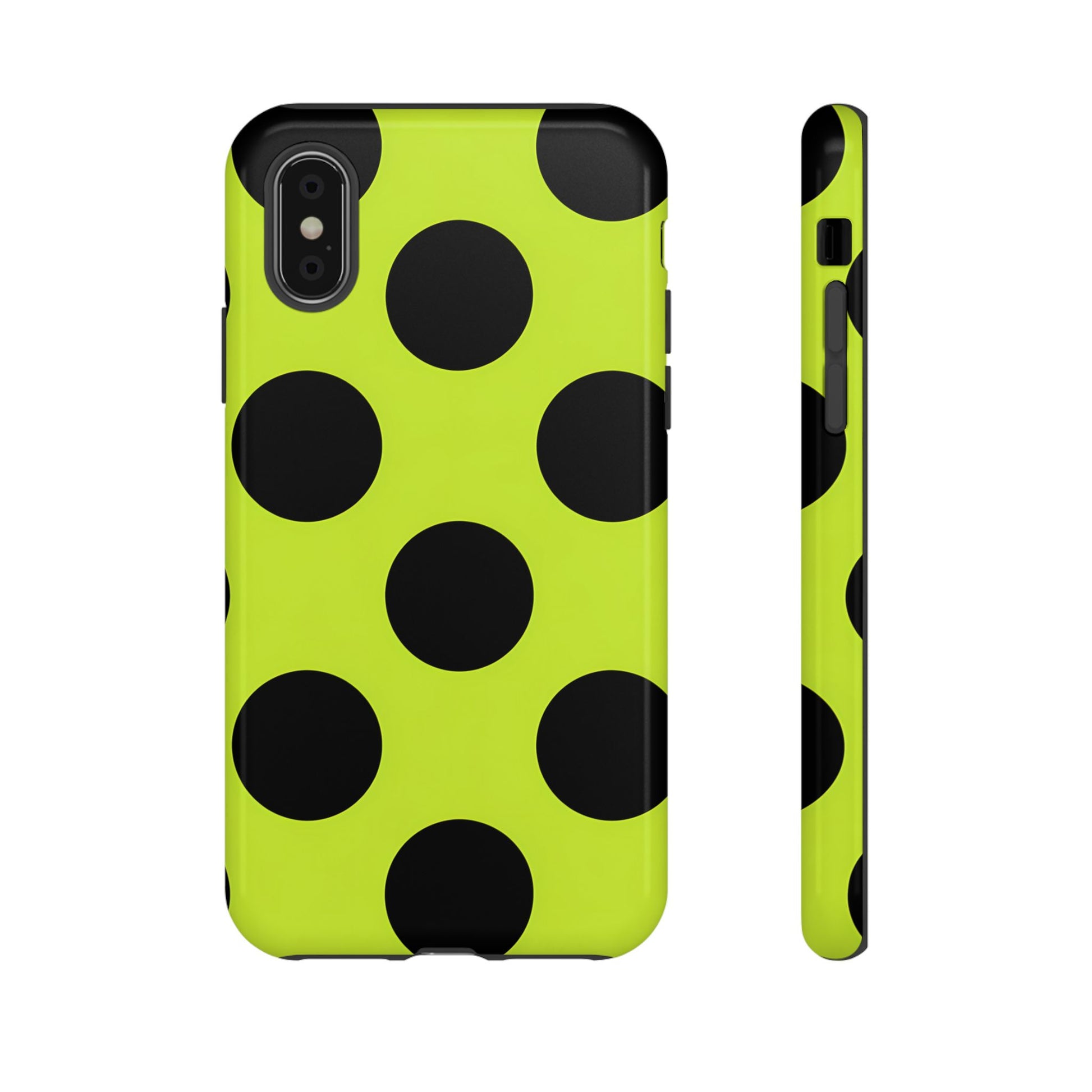 High-contrast black circles float evenly on a vivid lime base, offering a stylish, graphic, and fashion-forward pattern.