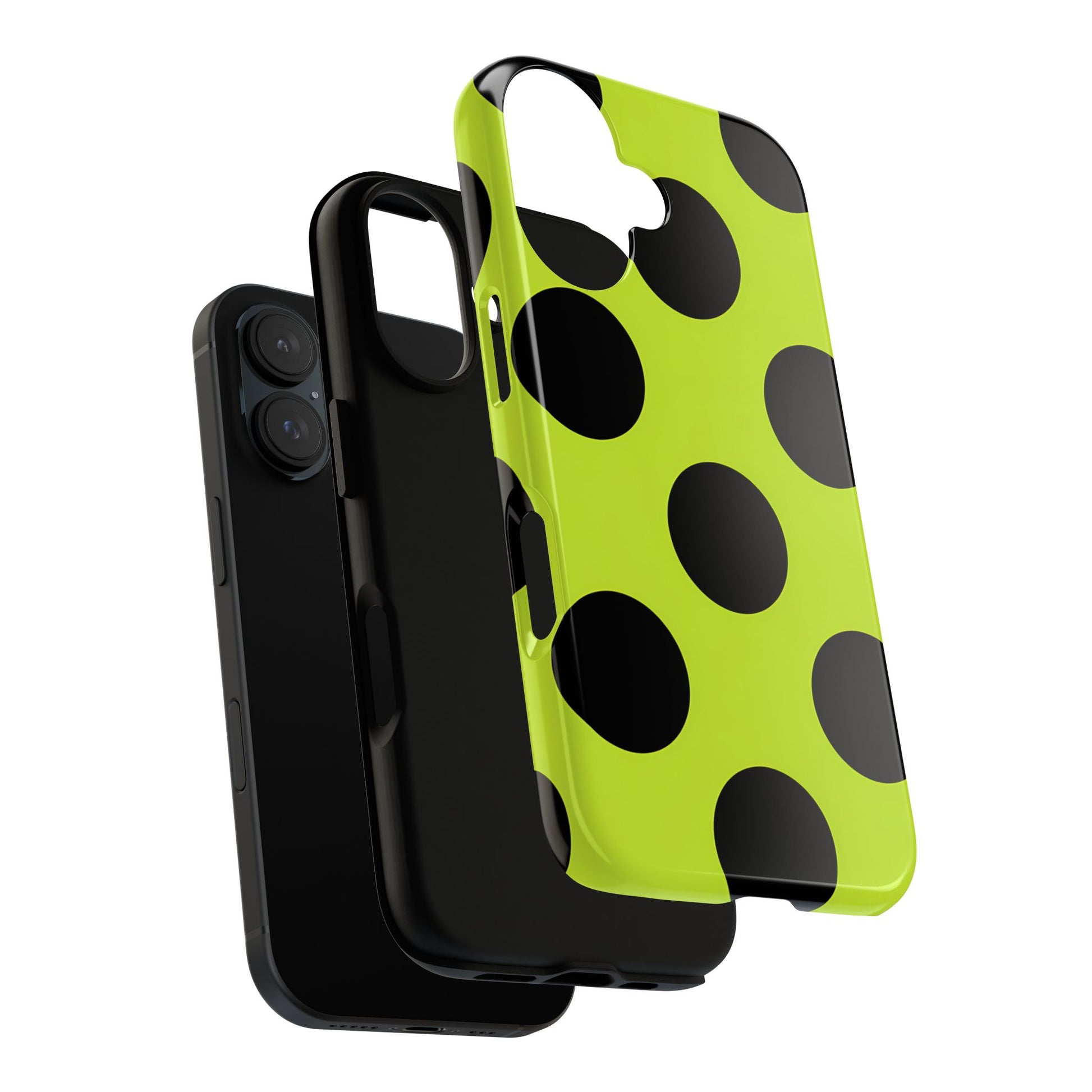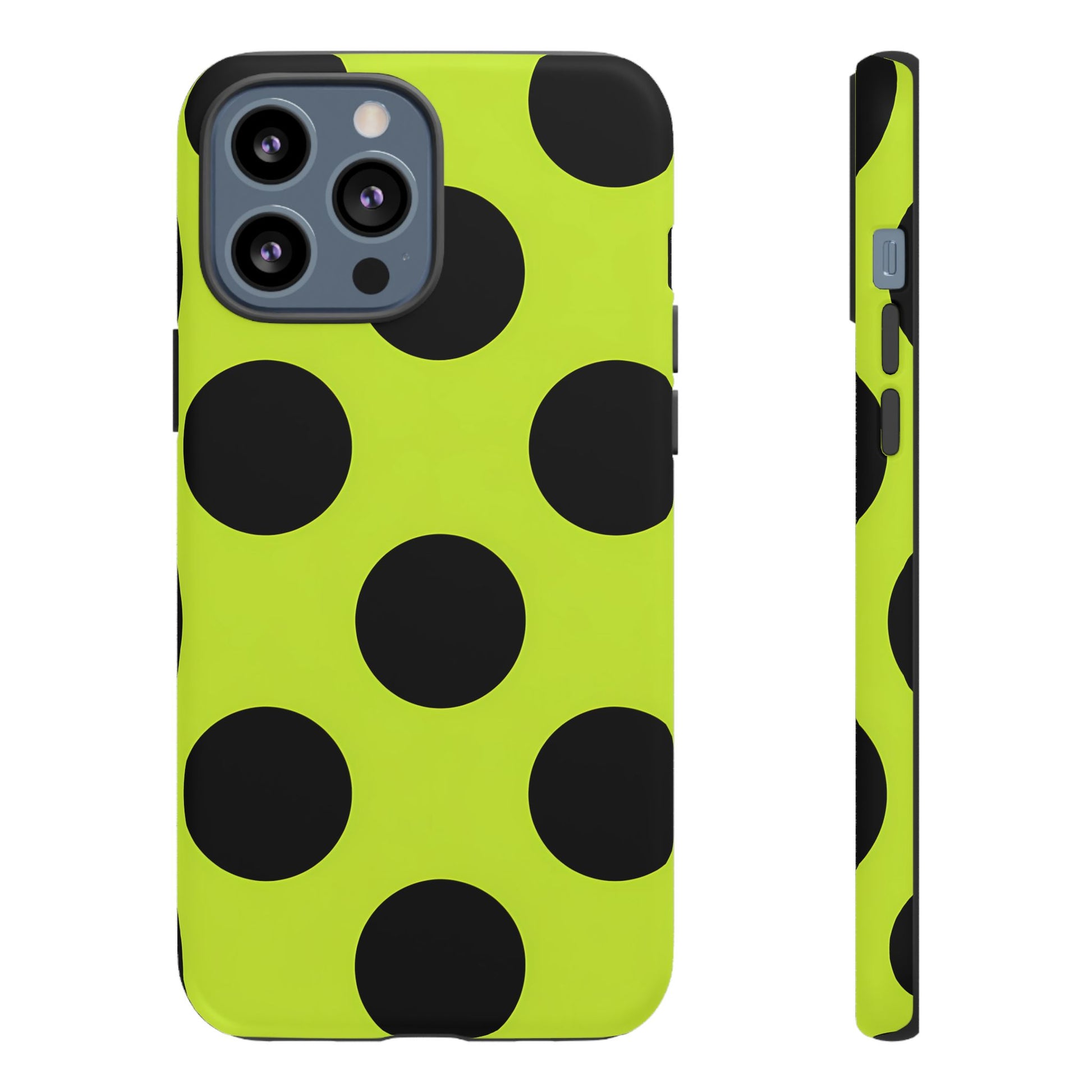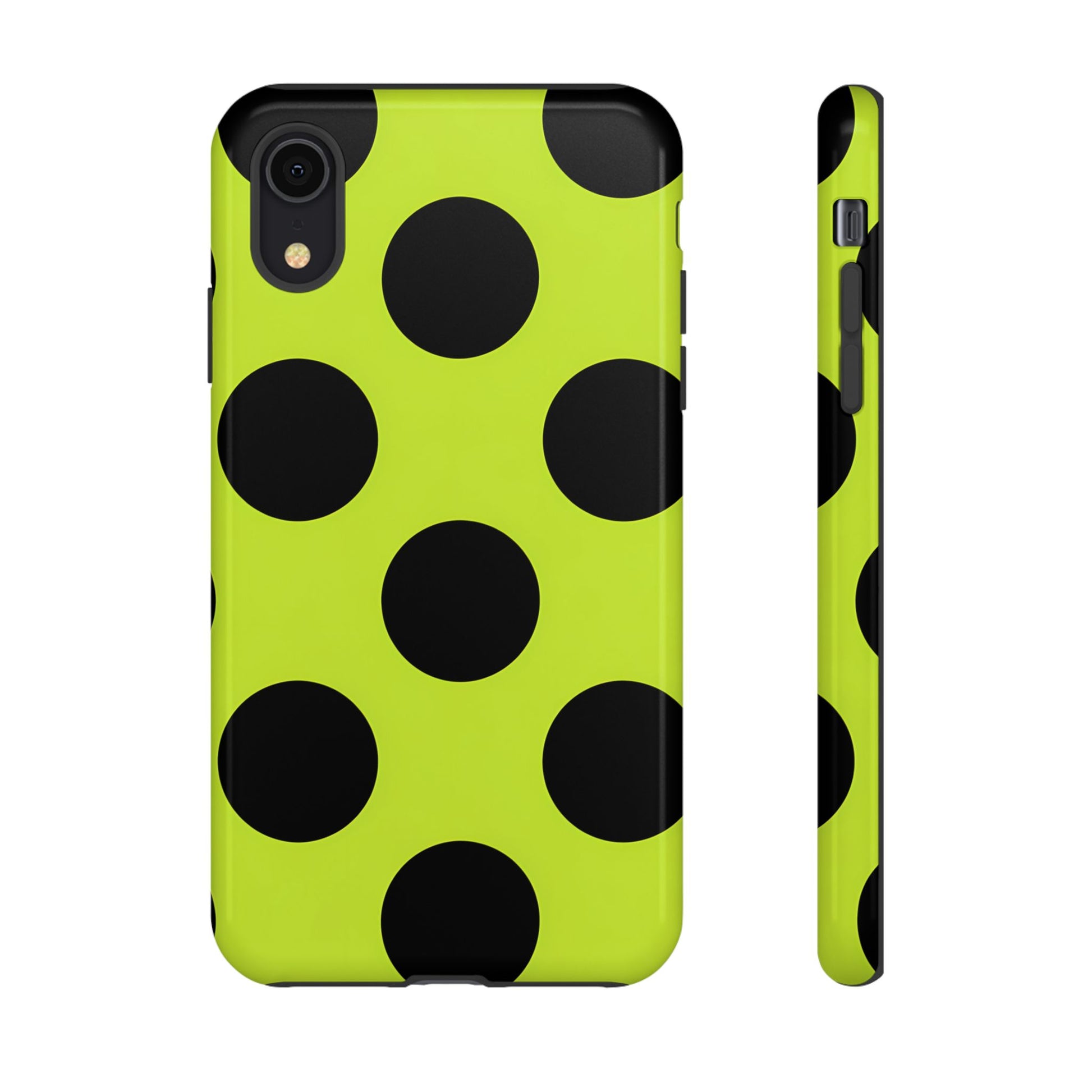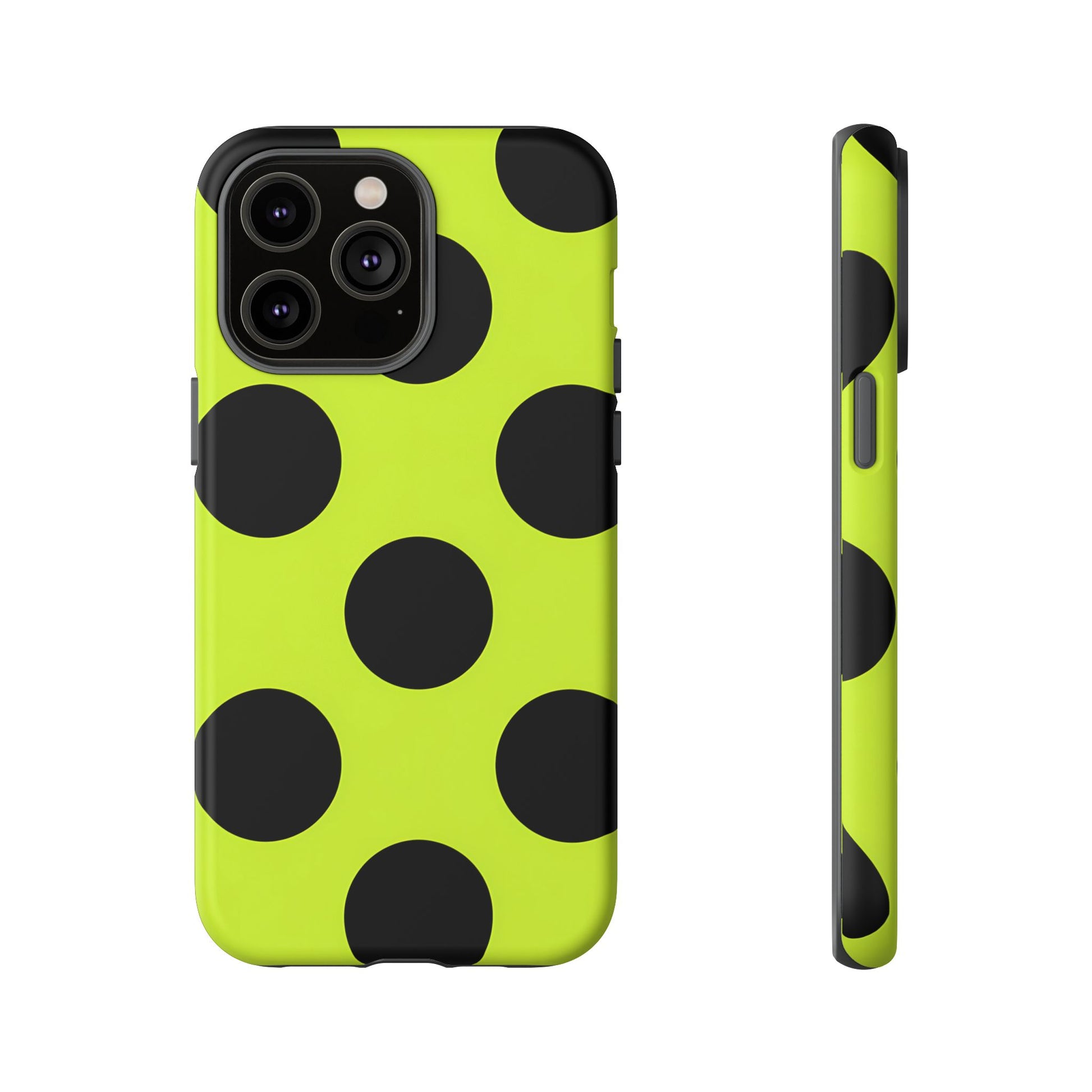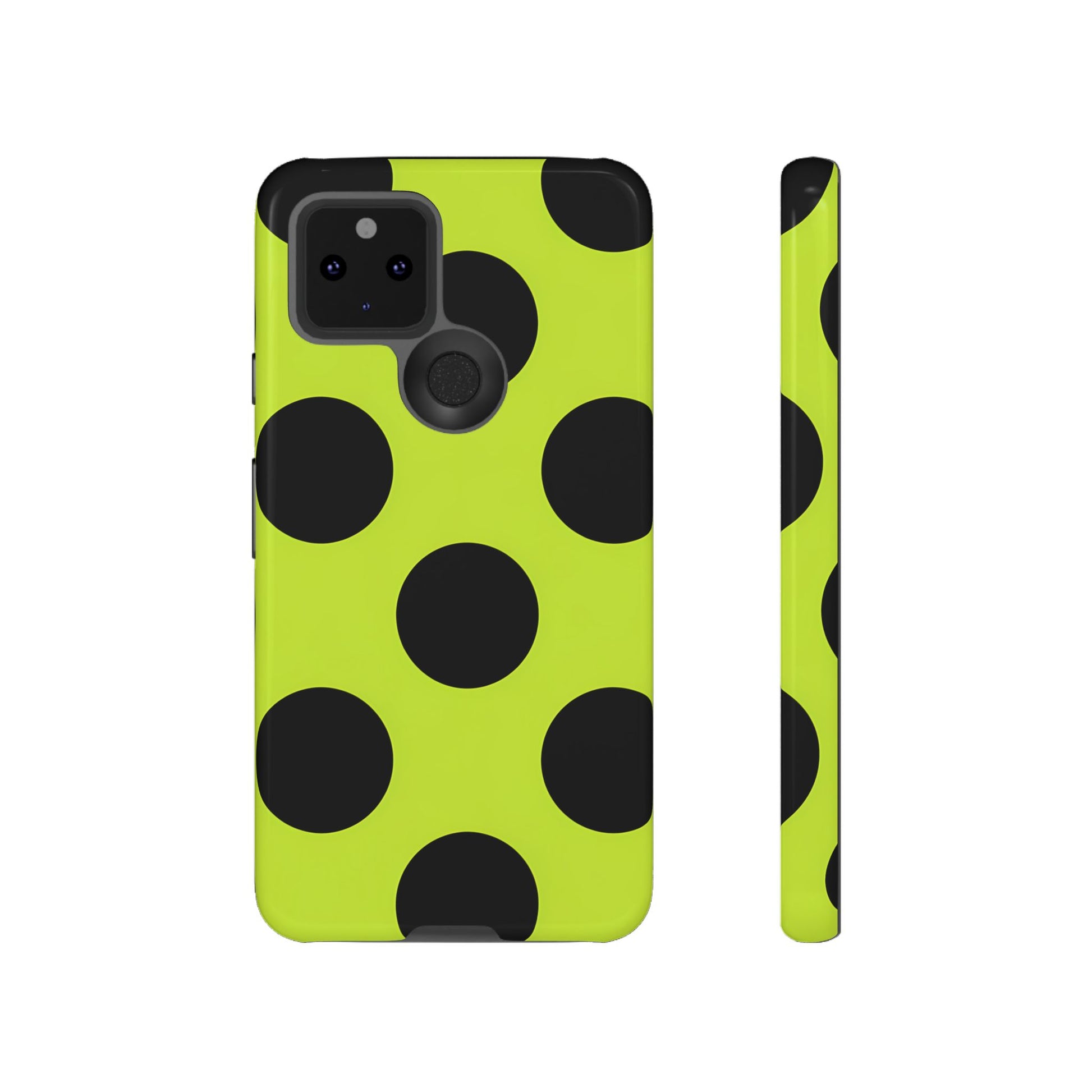 High-contrast black circles float evenly on a vivid lime base, offering a stylish, graphic, and fashion-forward pattern.