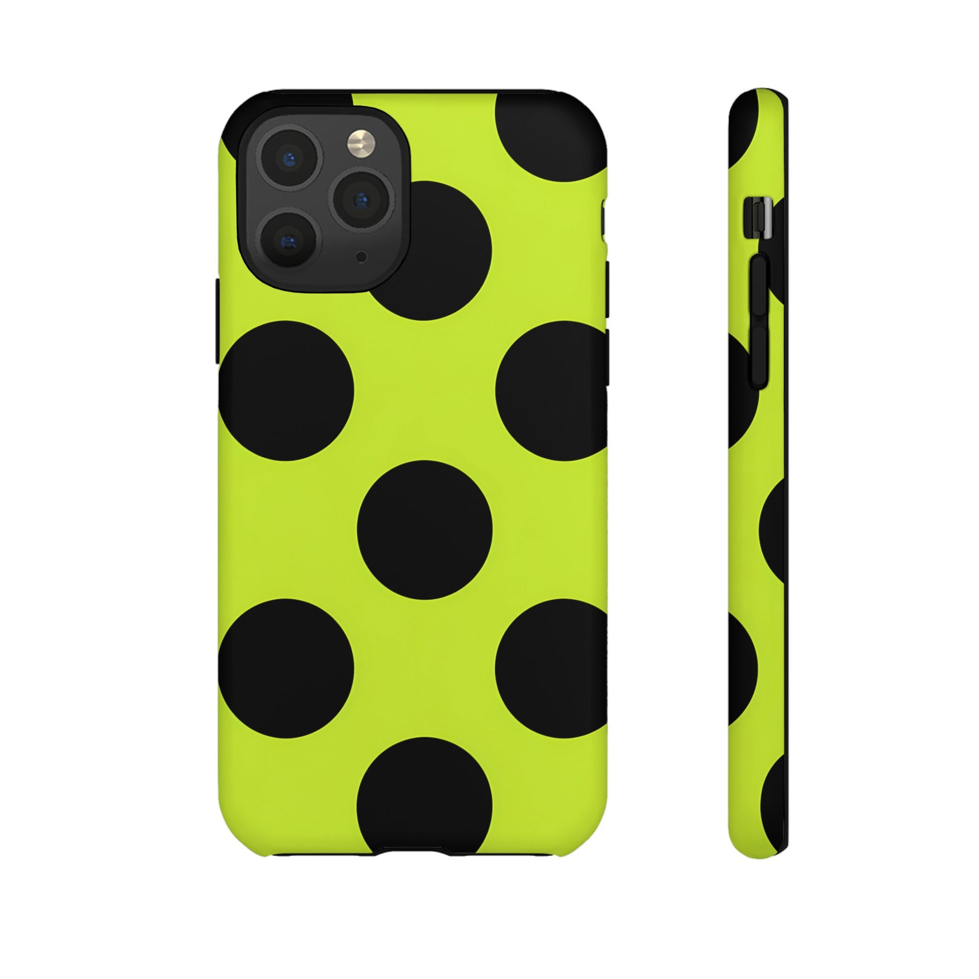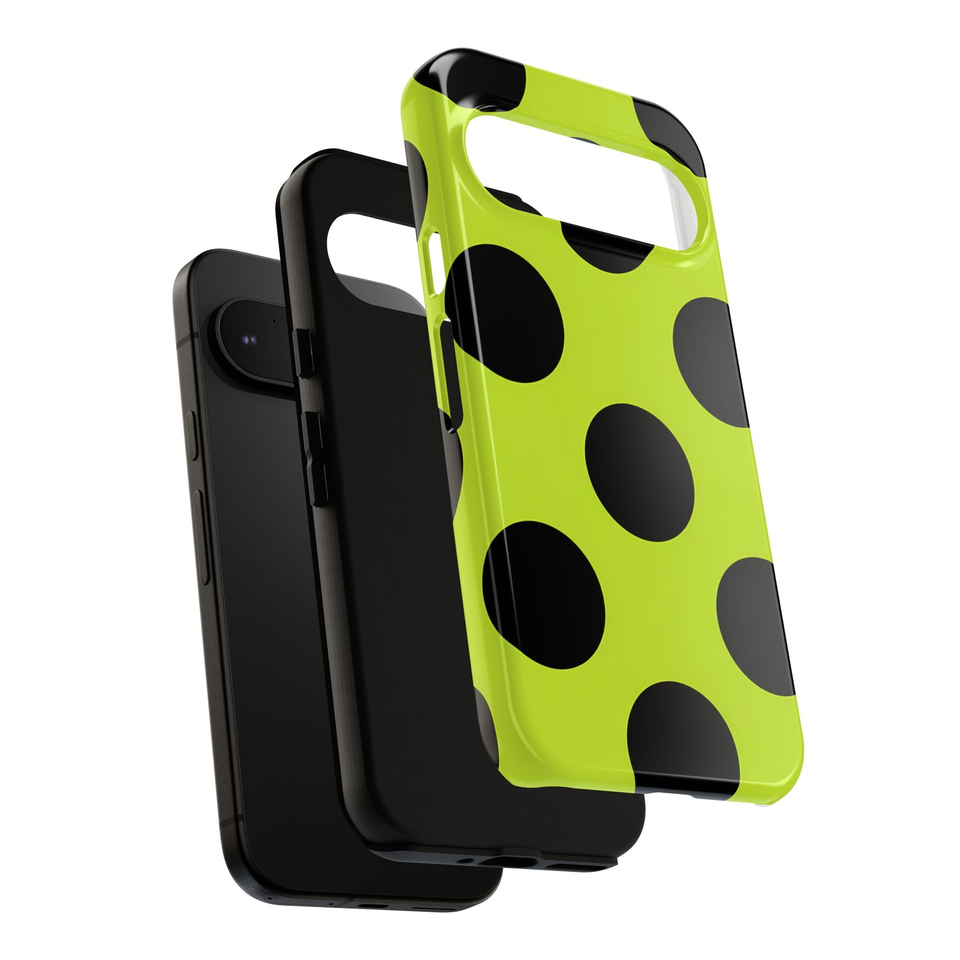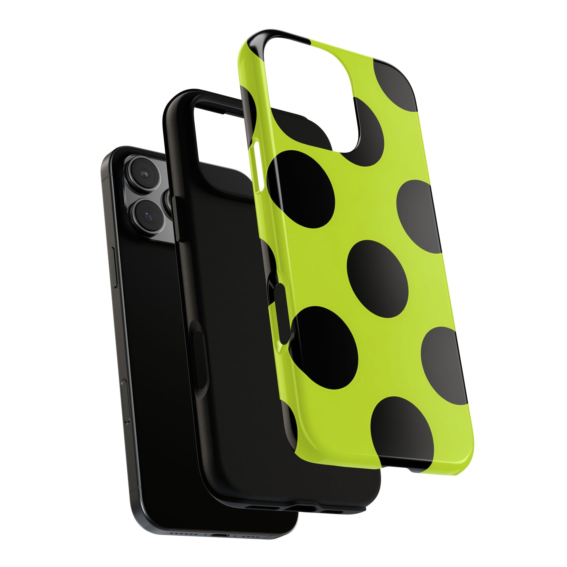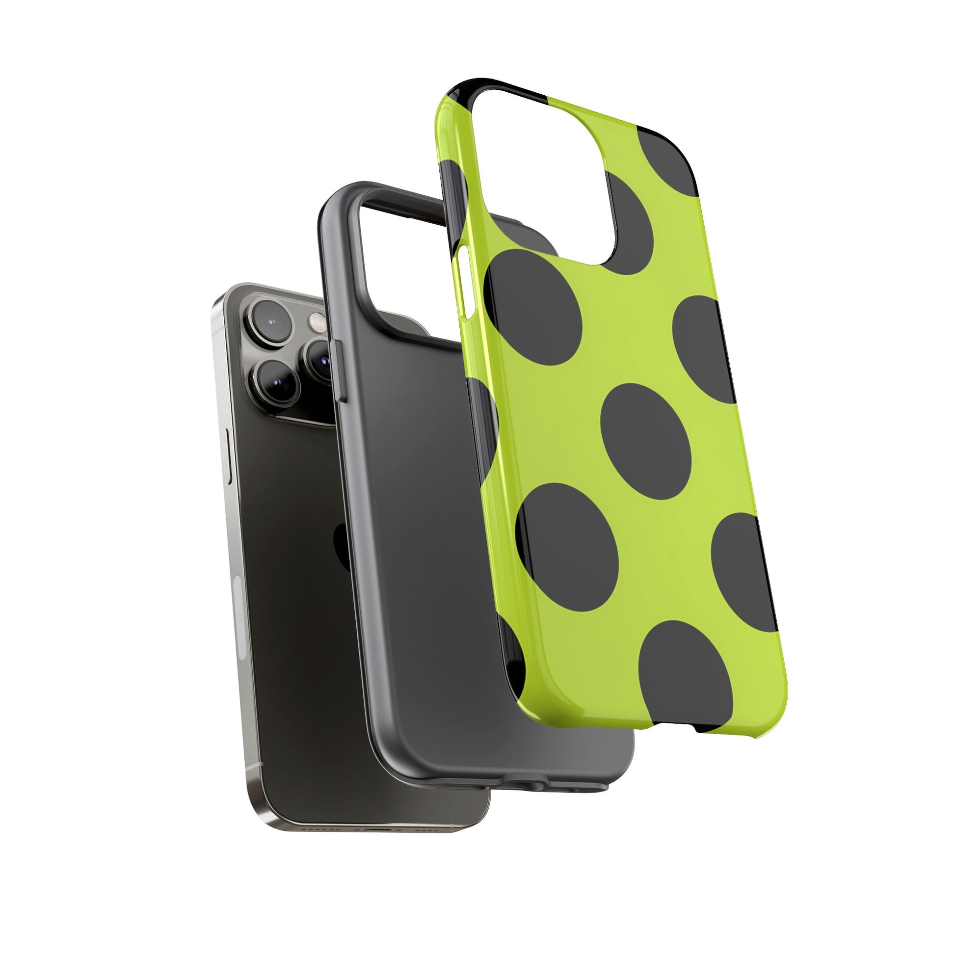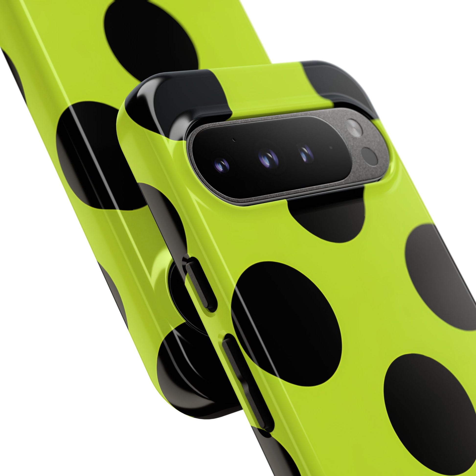 High-contrast black circles float evenly on a vivid lime base, offering a stylish, graphic, and fashion-forward pattern.