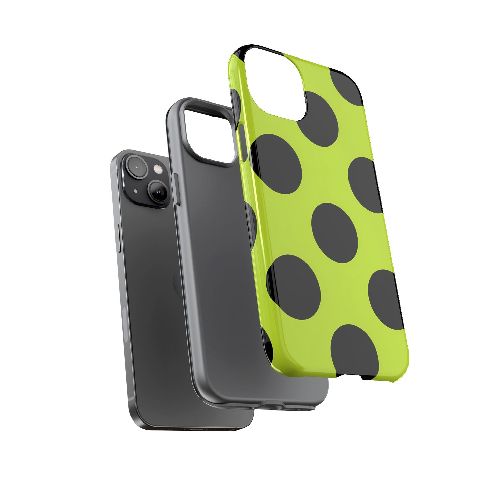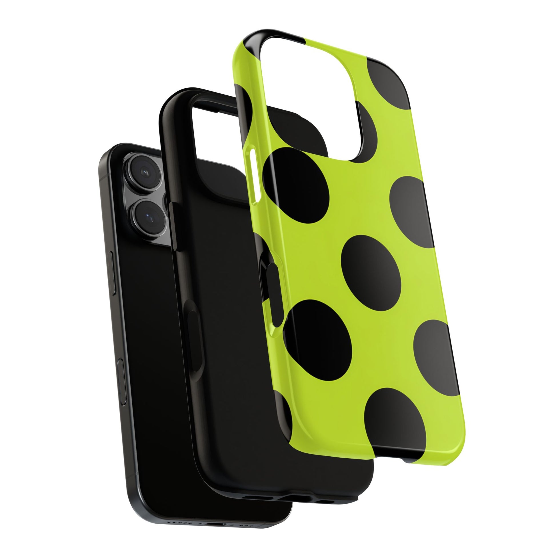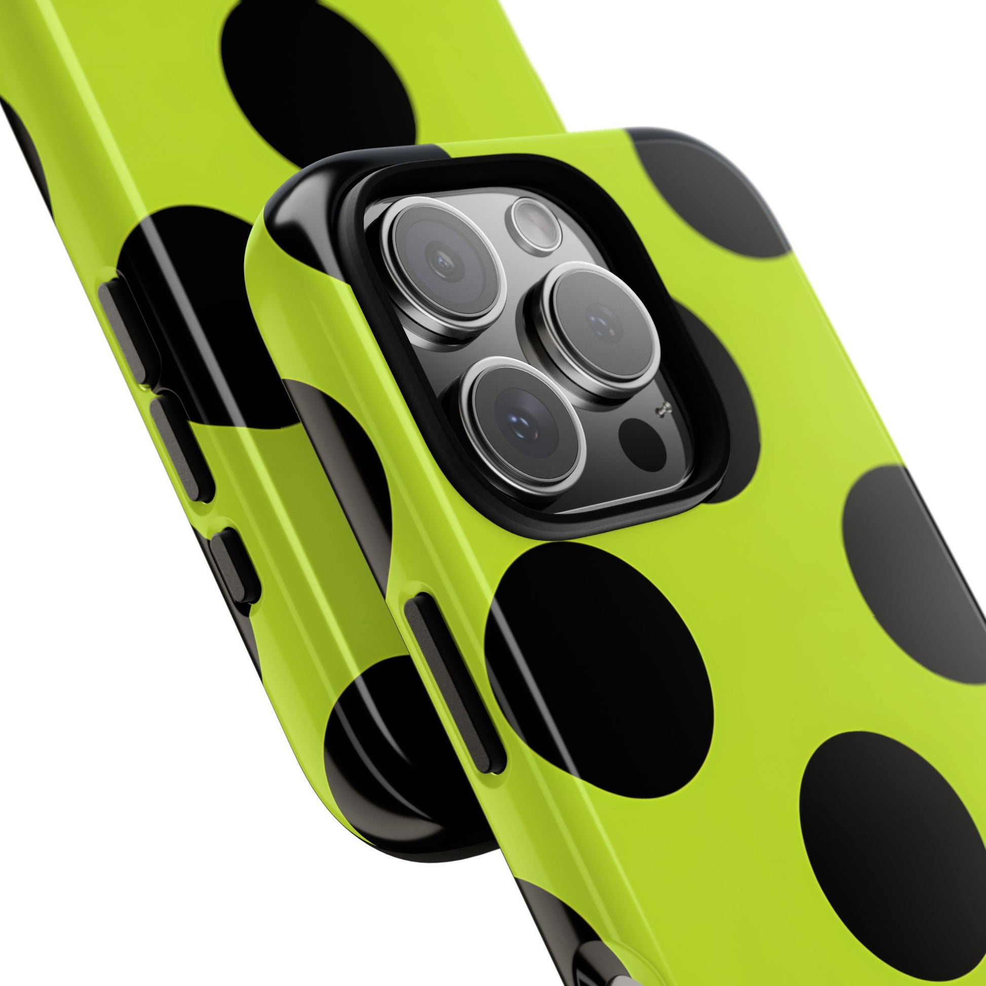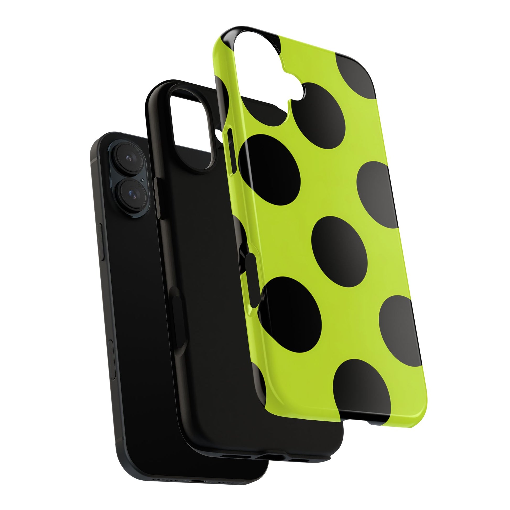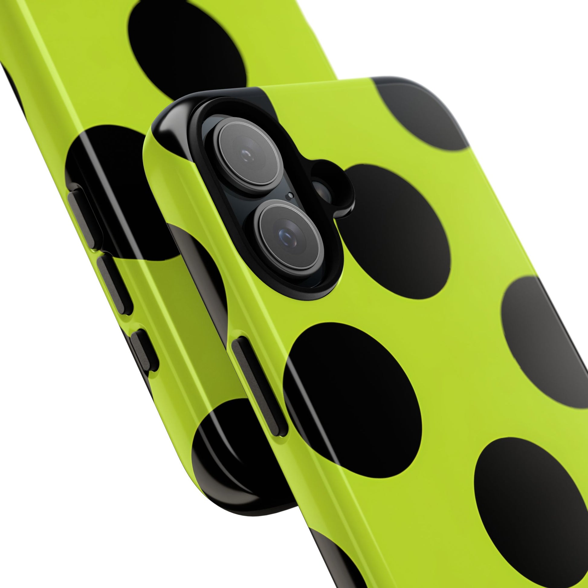 High-contrast black circles float evenly on a vivid lime base, offering a stylish, graphic, and fashion-forward pattern.