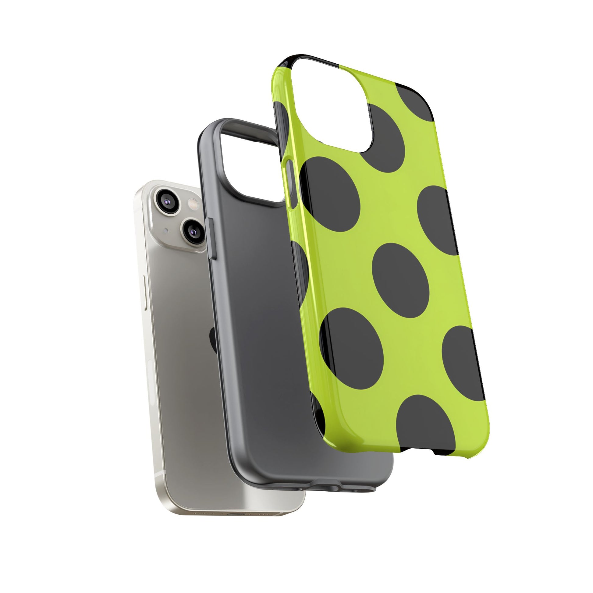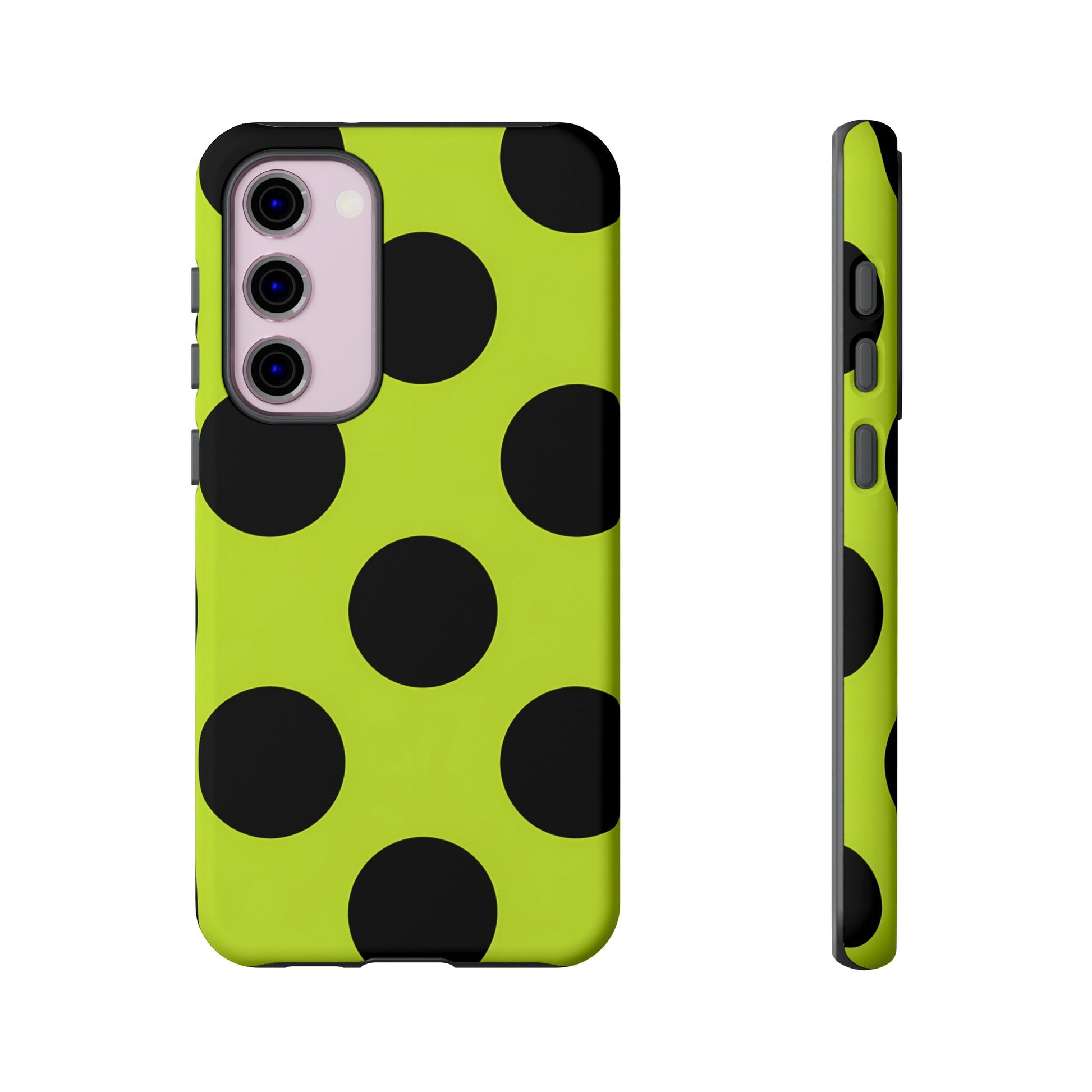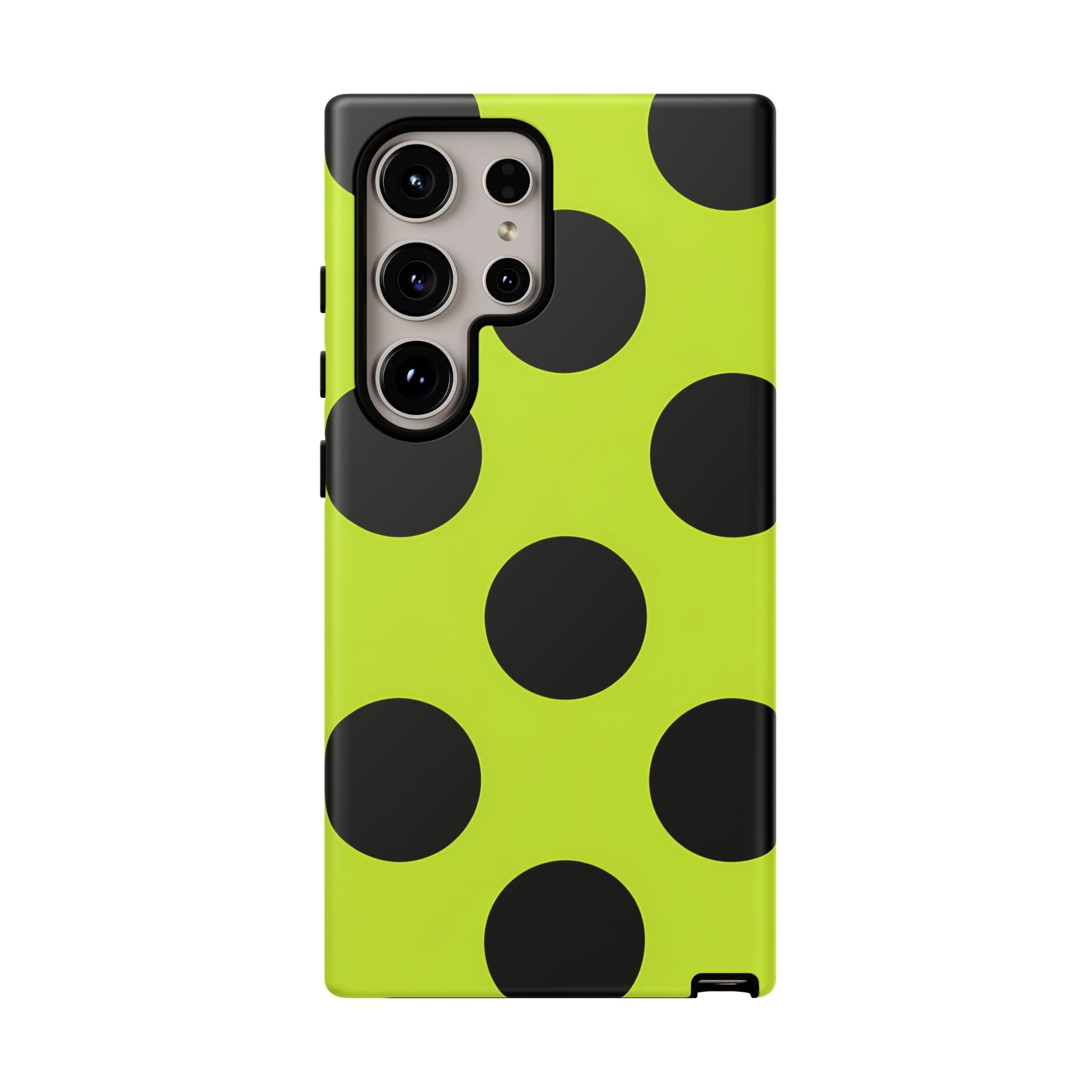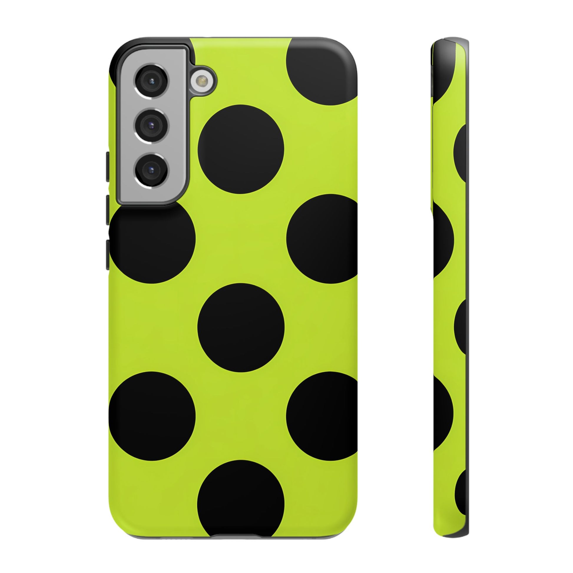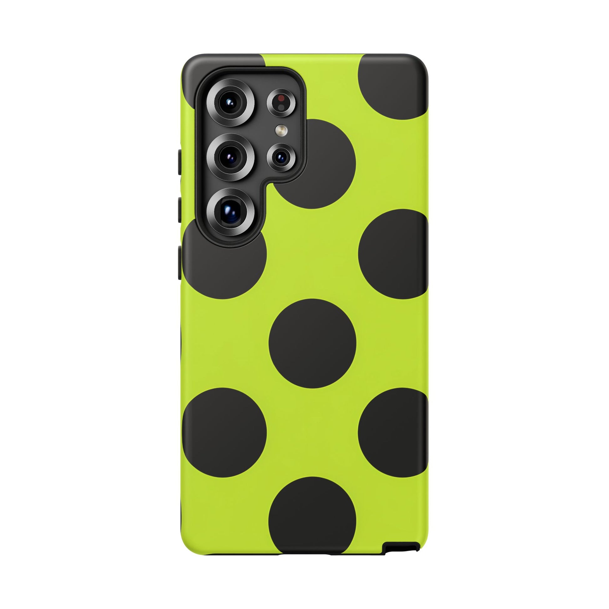High-contrast black circles float evenly on a vivid lime base, offering a stylish, graphic, and fashion-forward pattern.