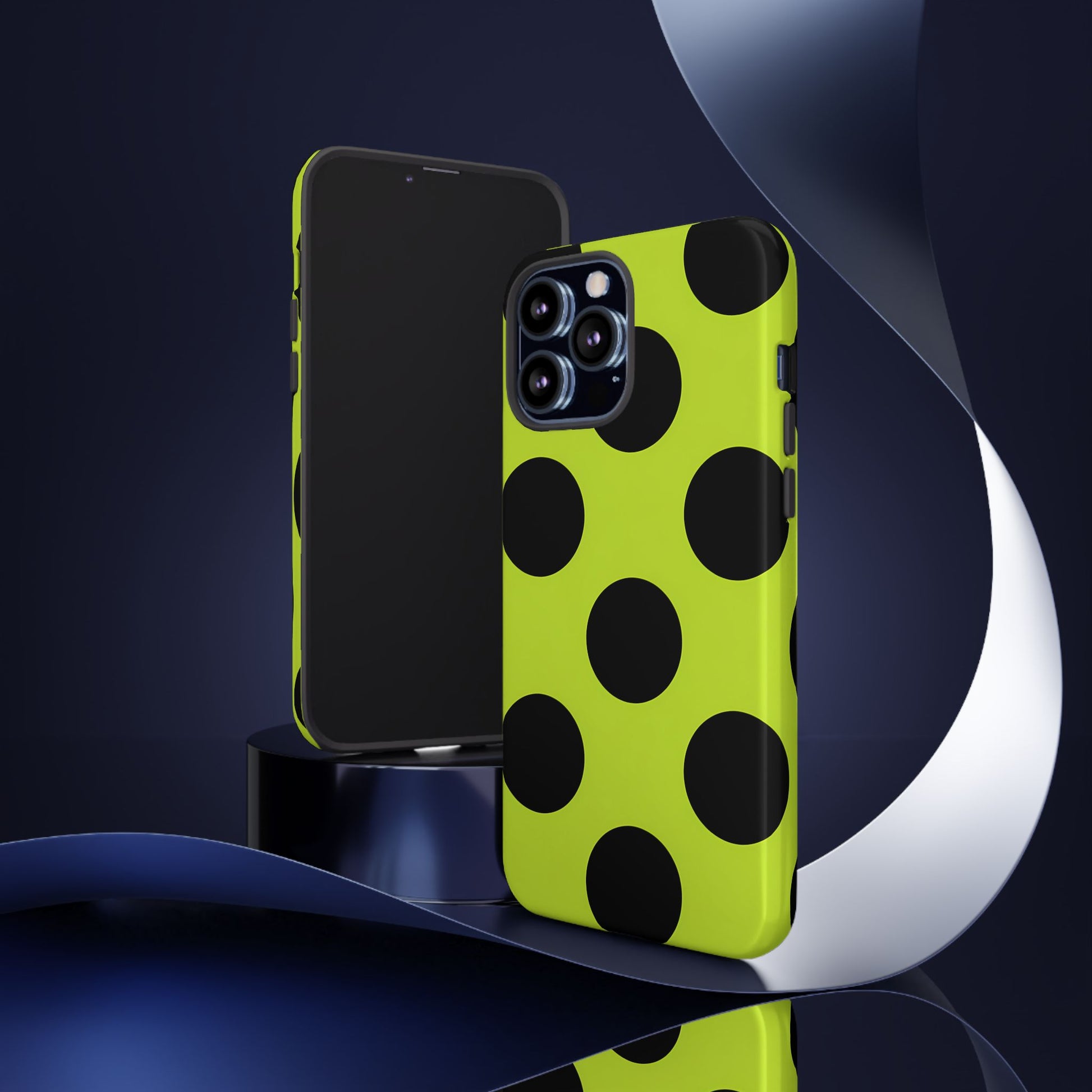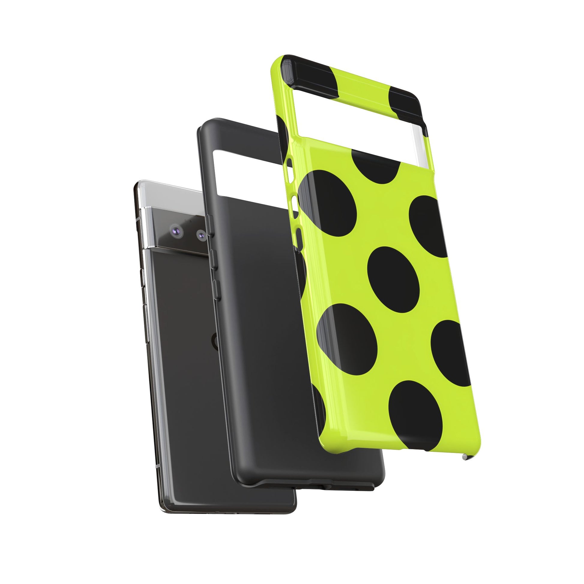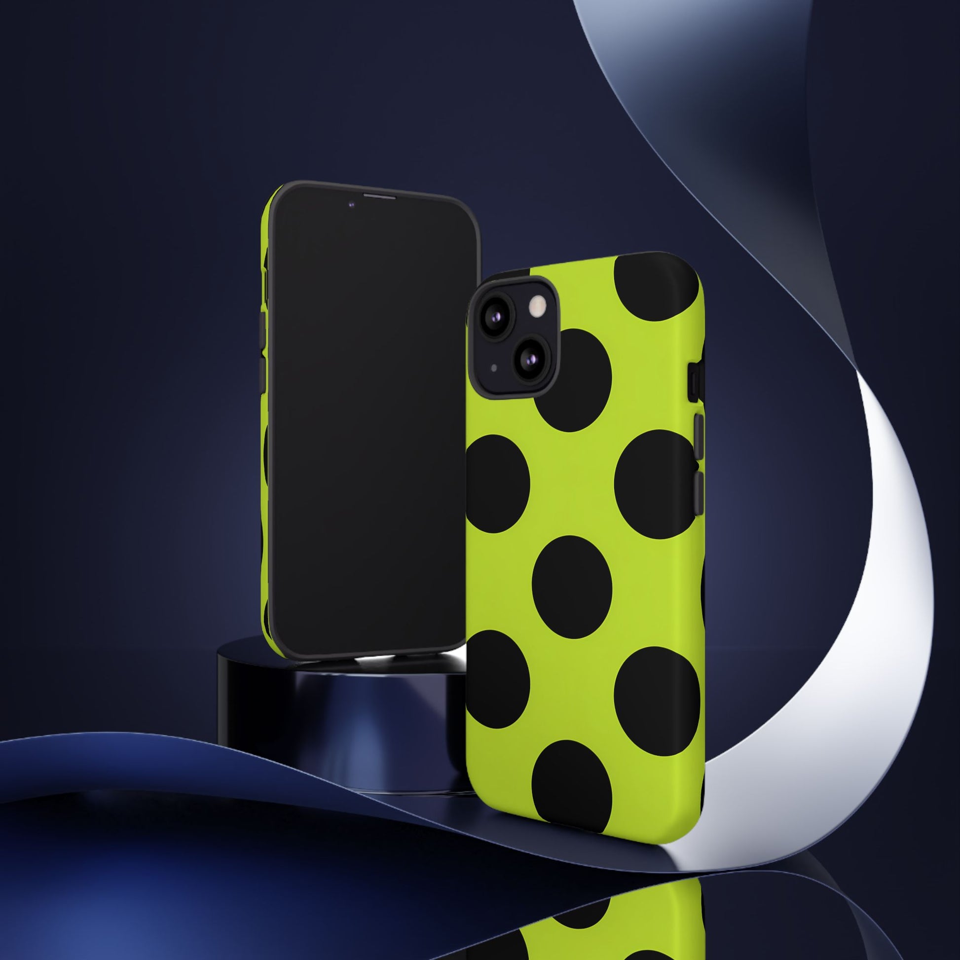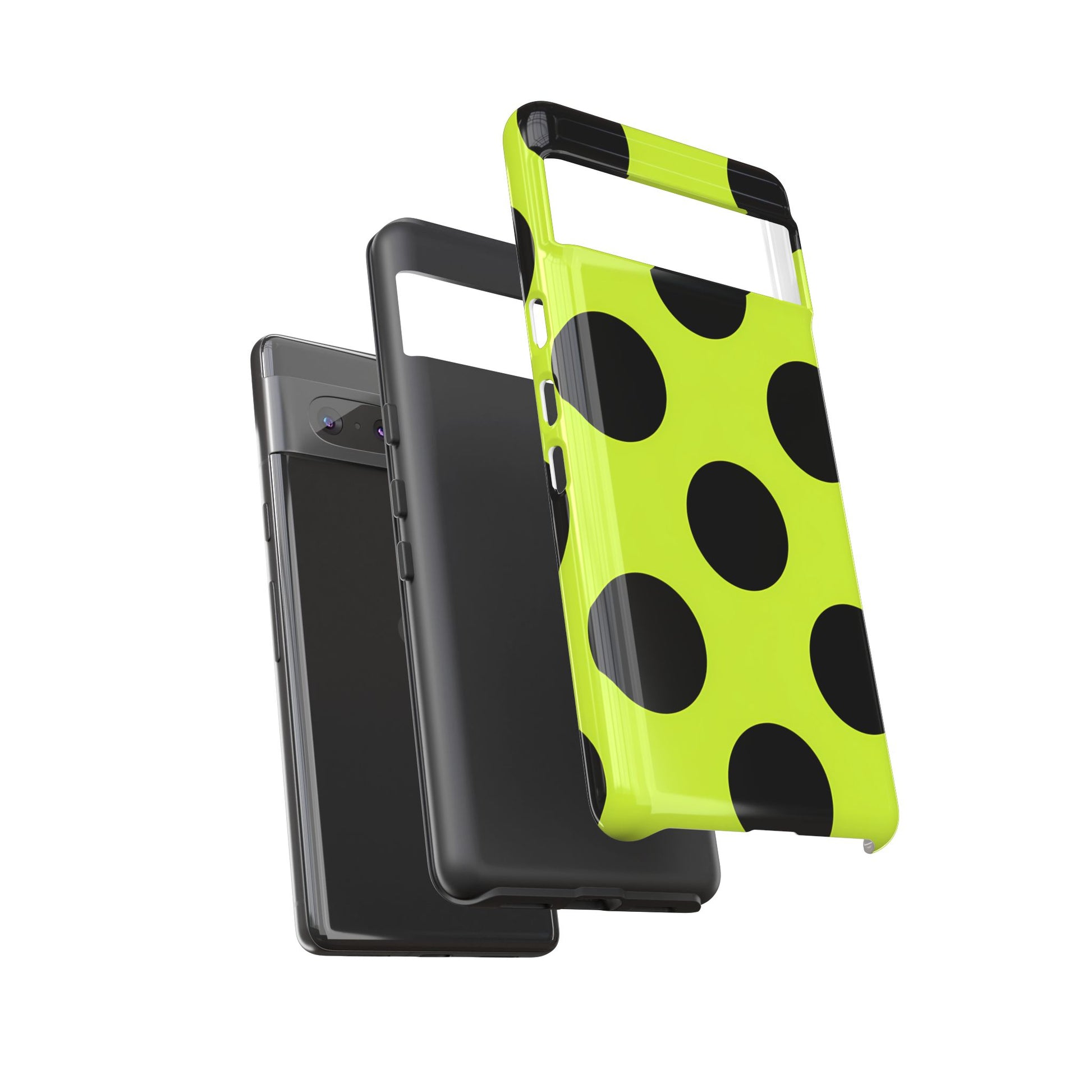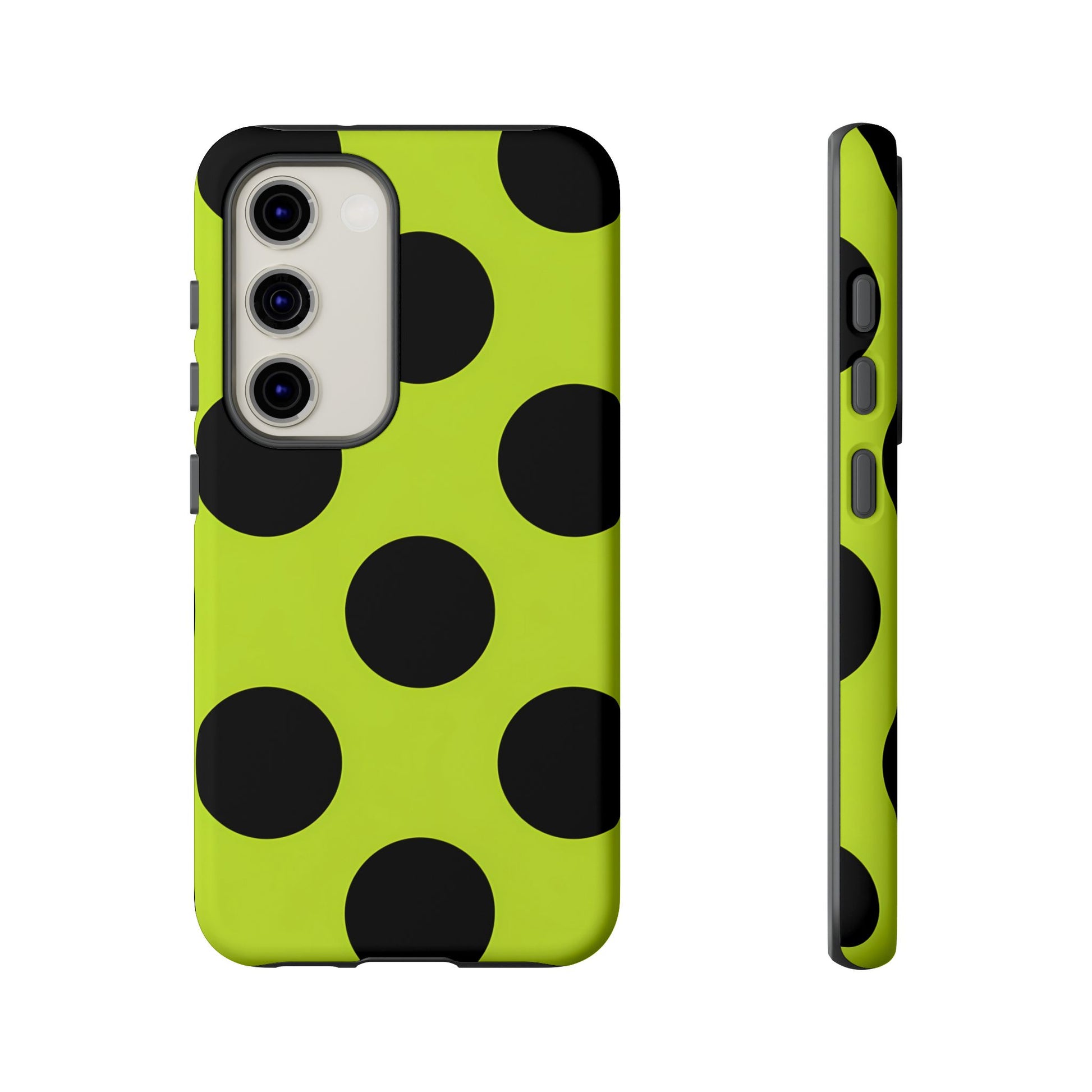 High-contrast black circles float evenly on a vivid lime base, offering a stylish, graphic, and fashion-forward pattern.