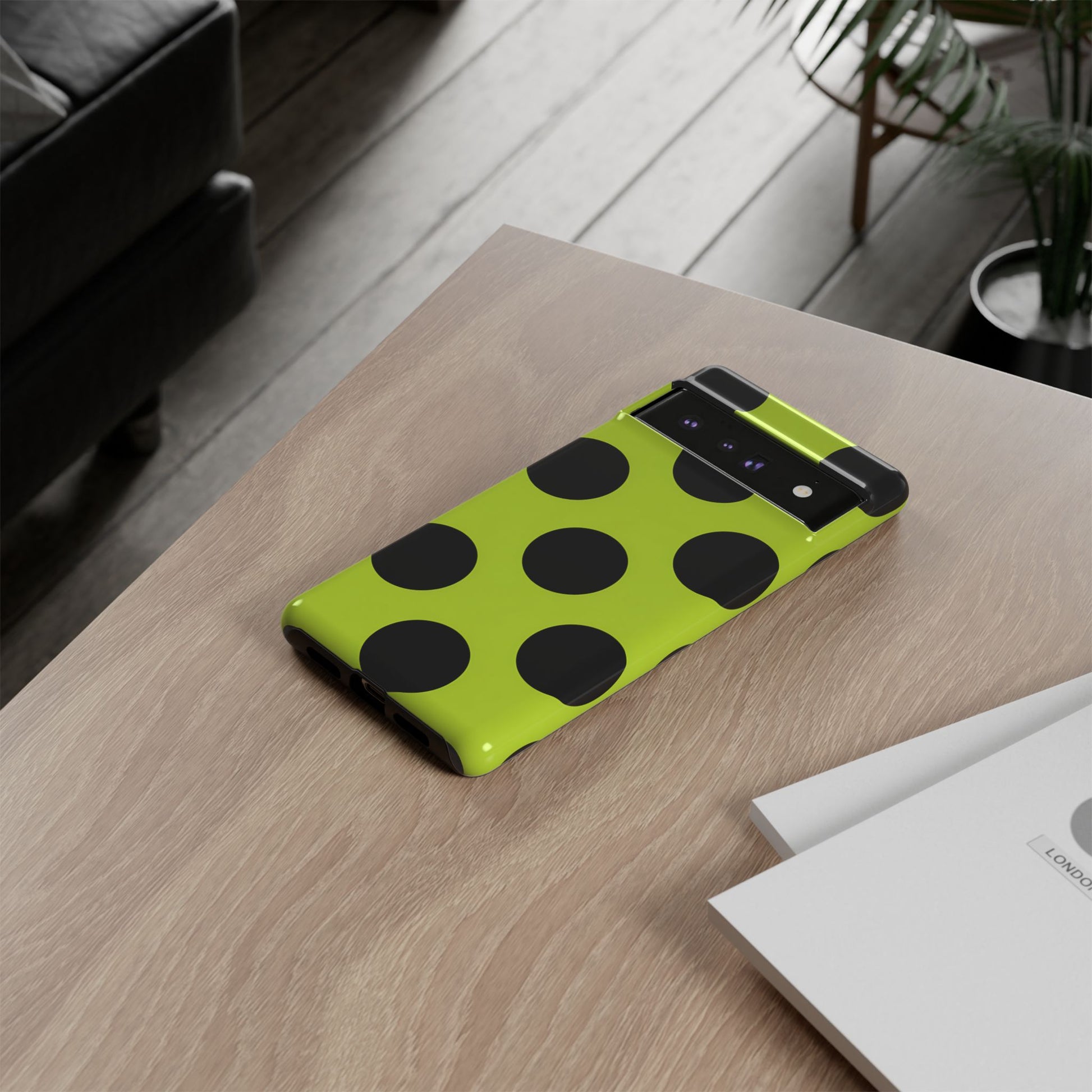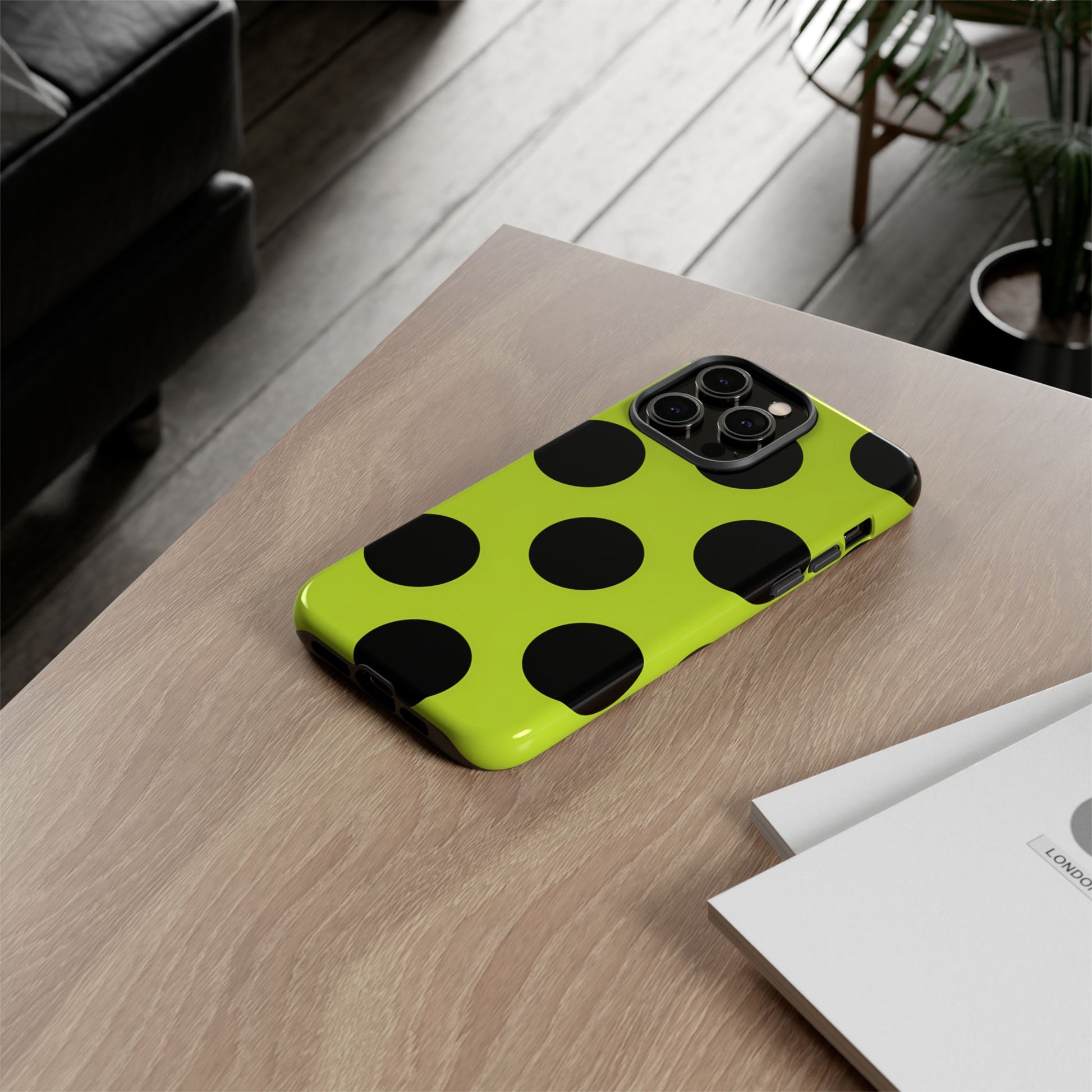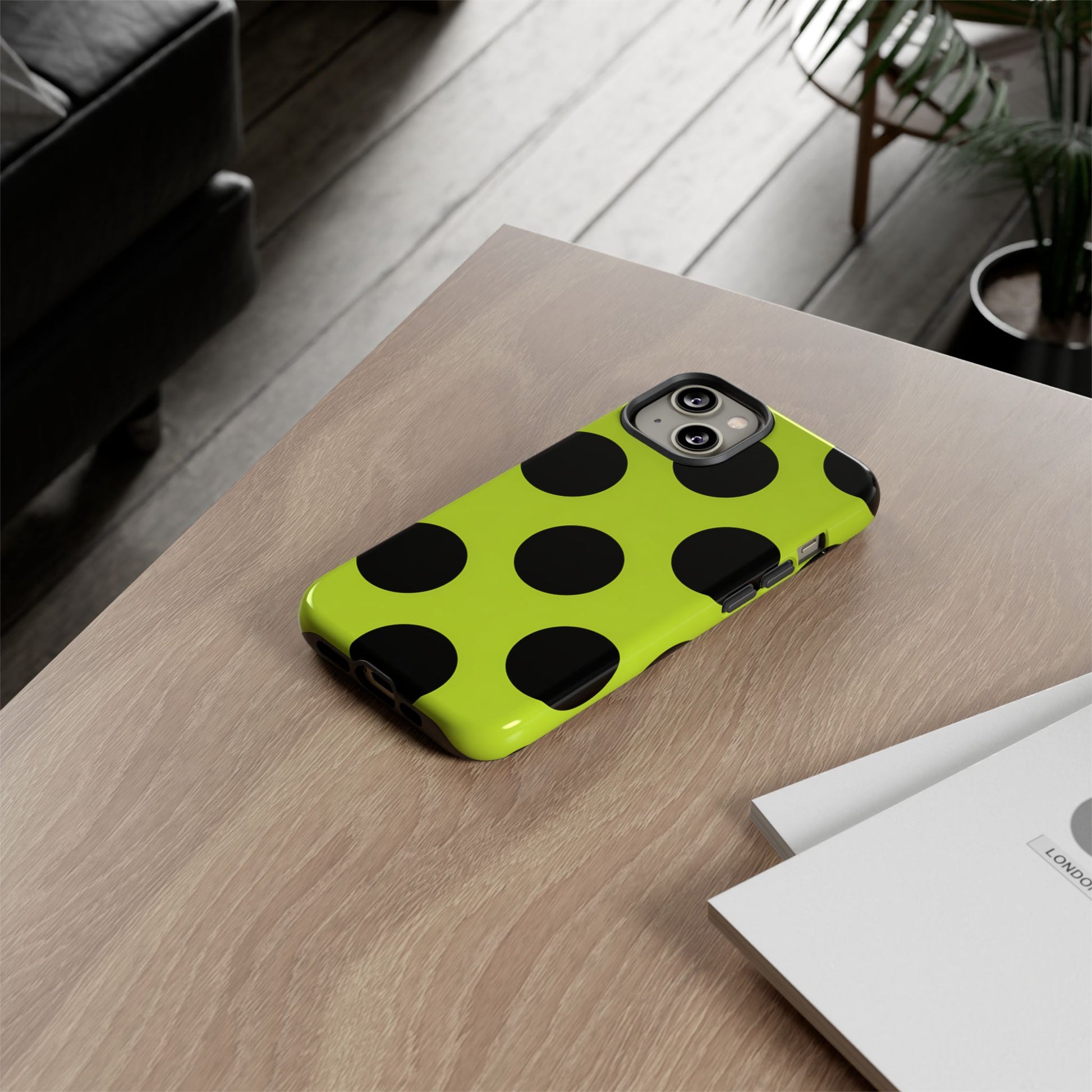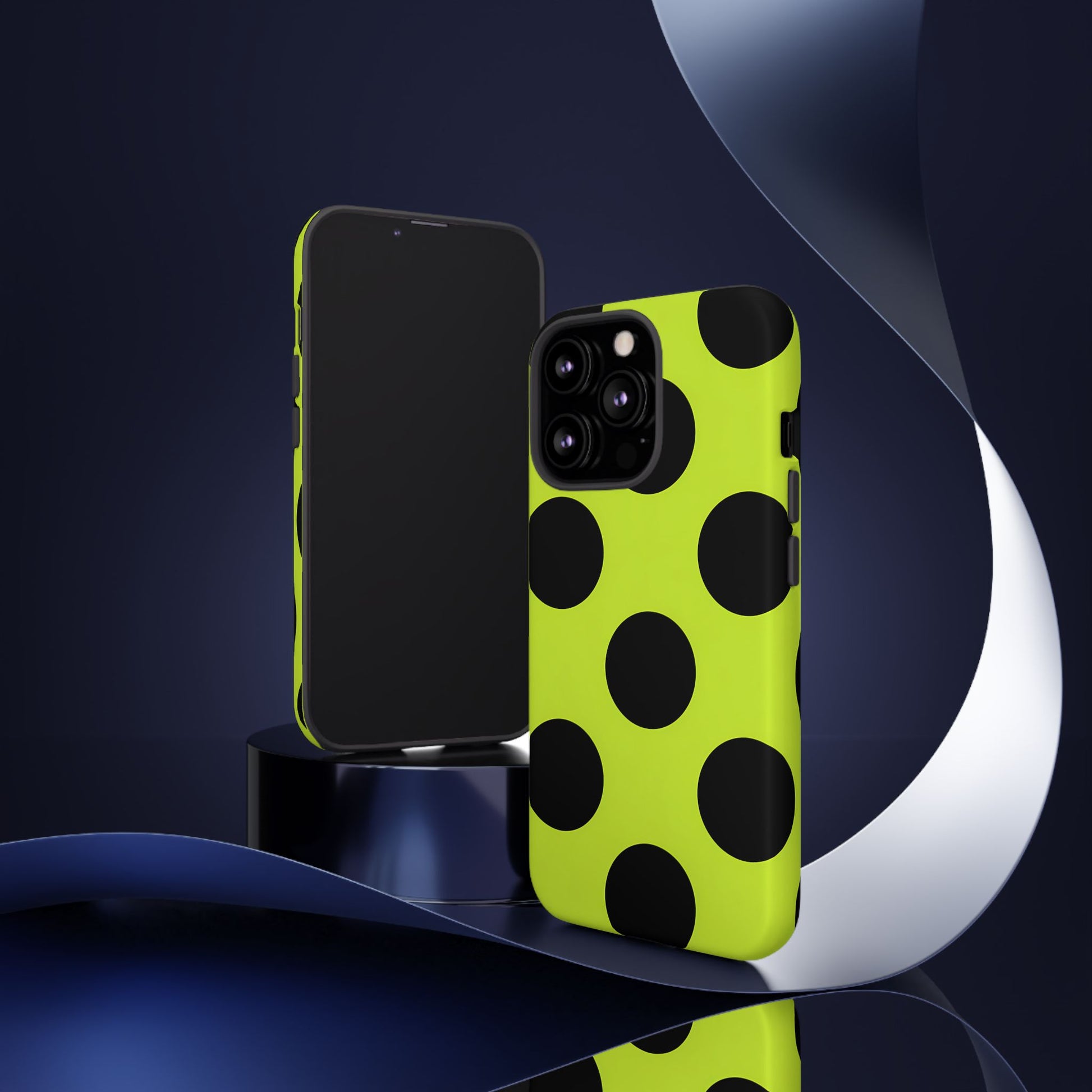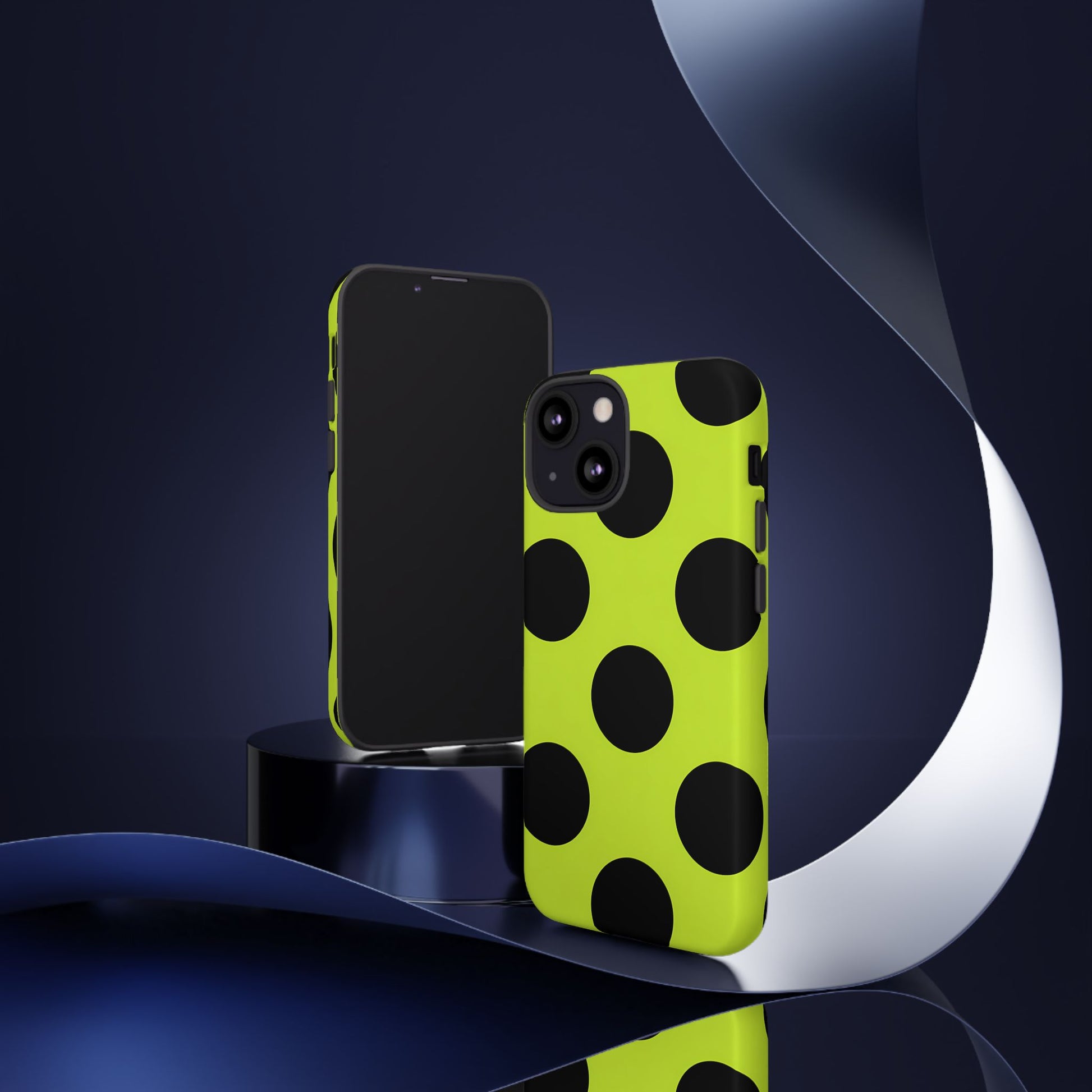 High-contrast black circles float evenly on a vivid lime base, offering a stylish, graphic, and fashion-forward pattern.