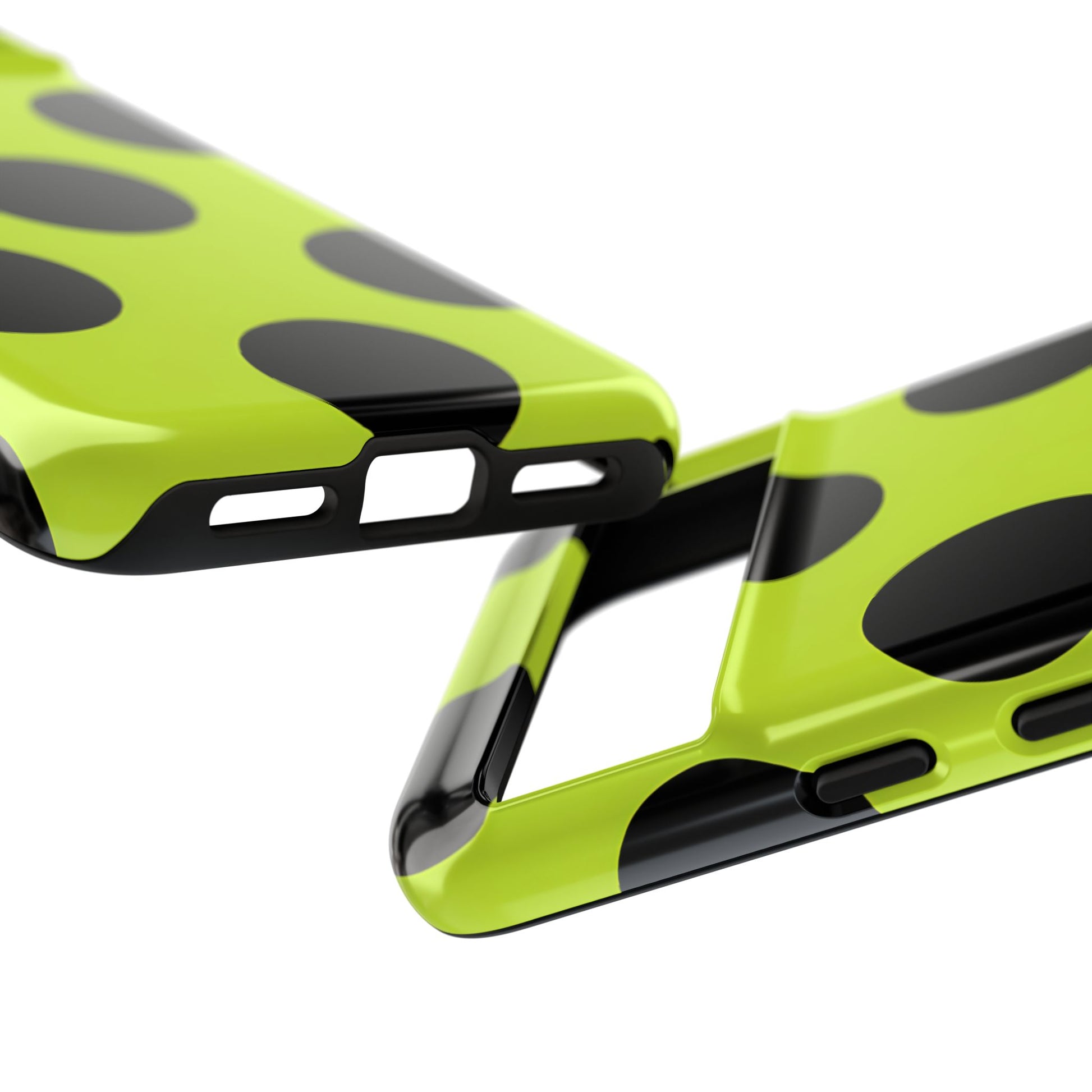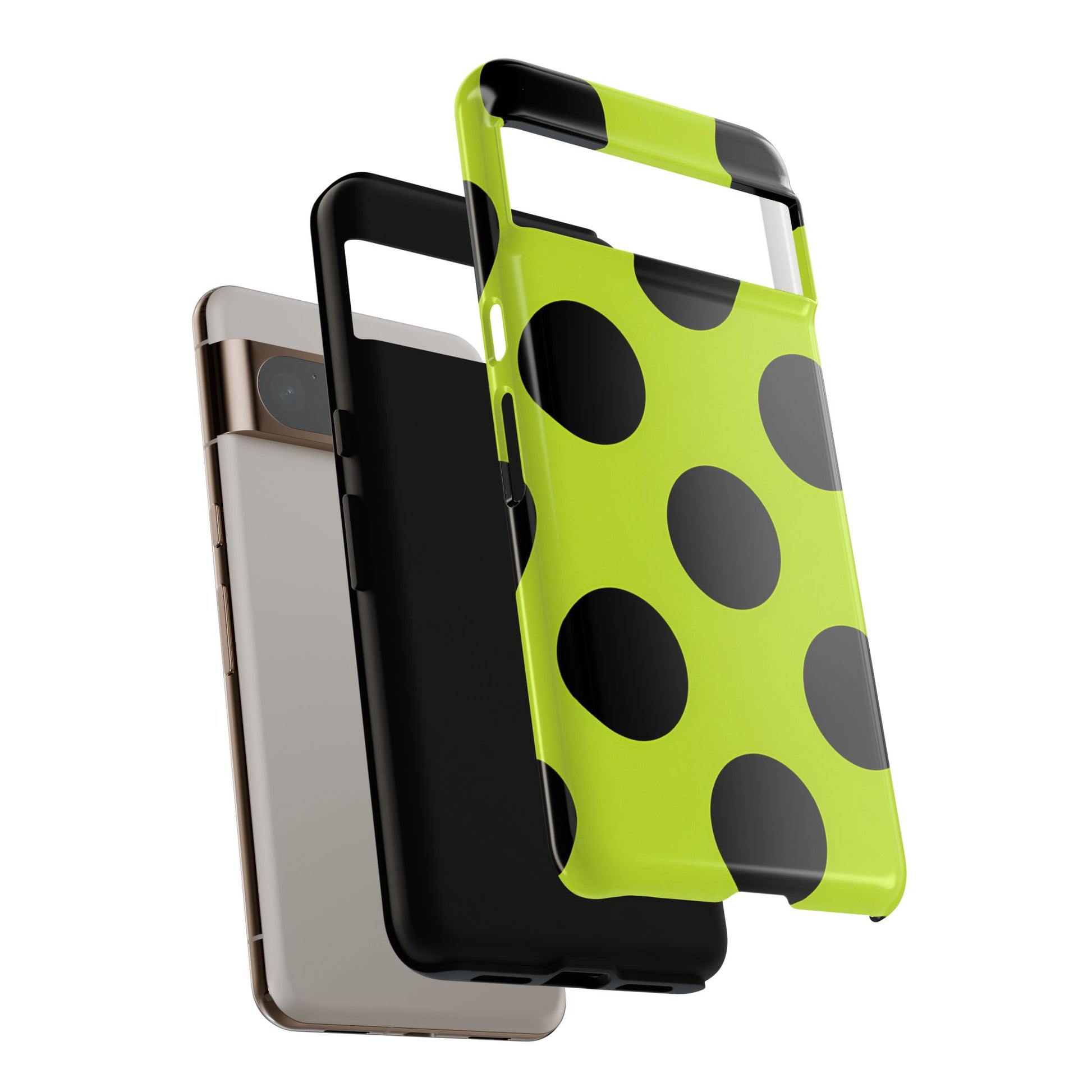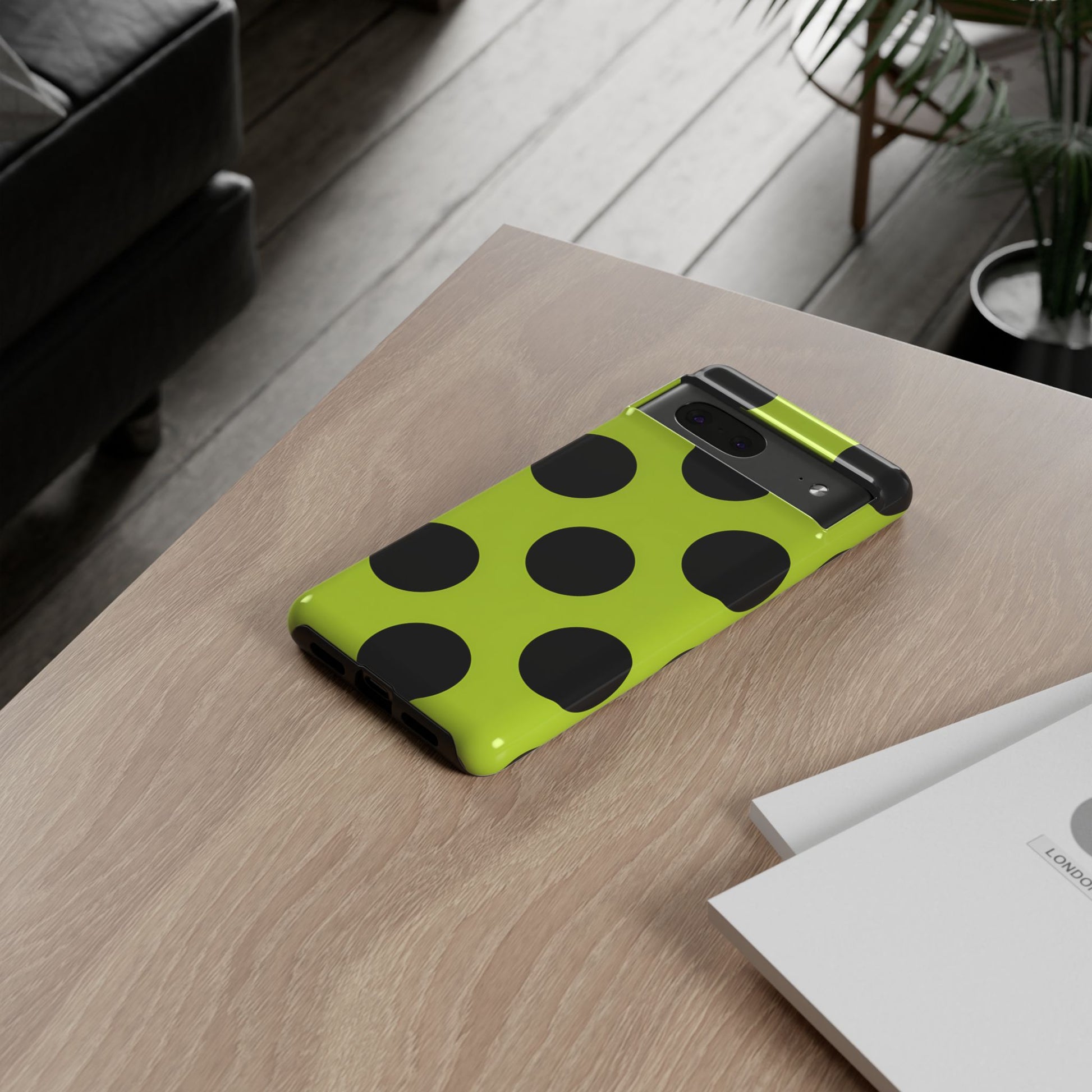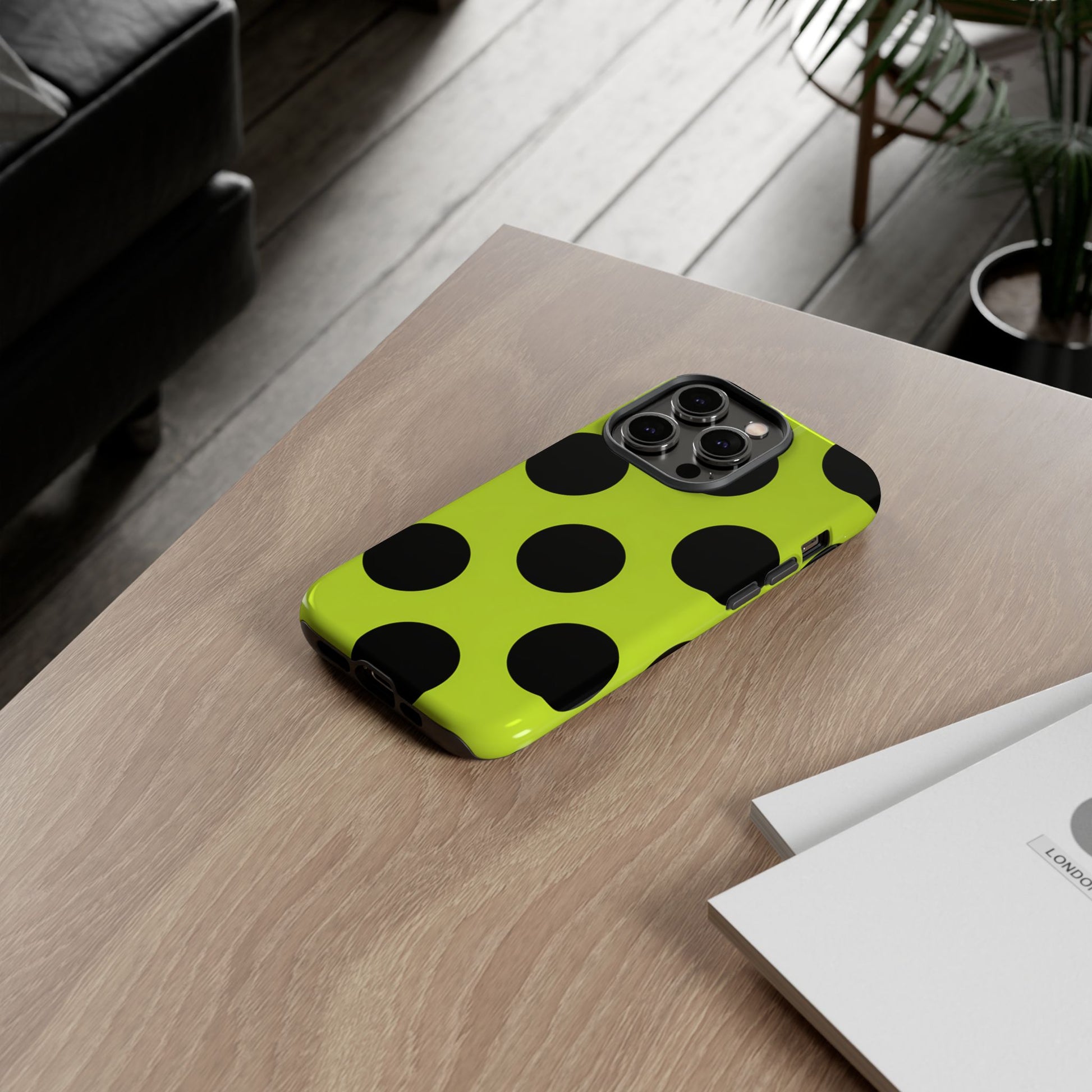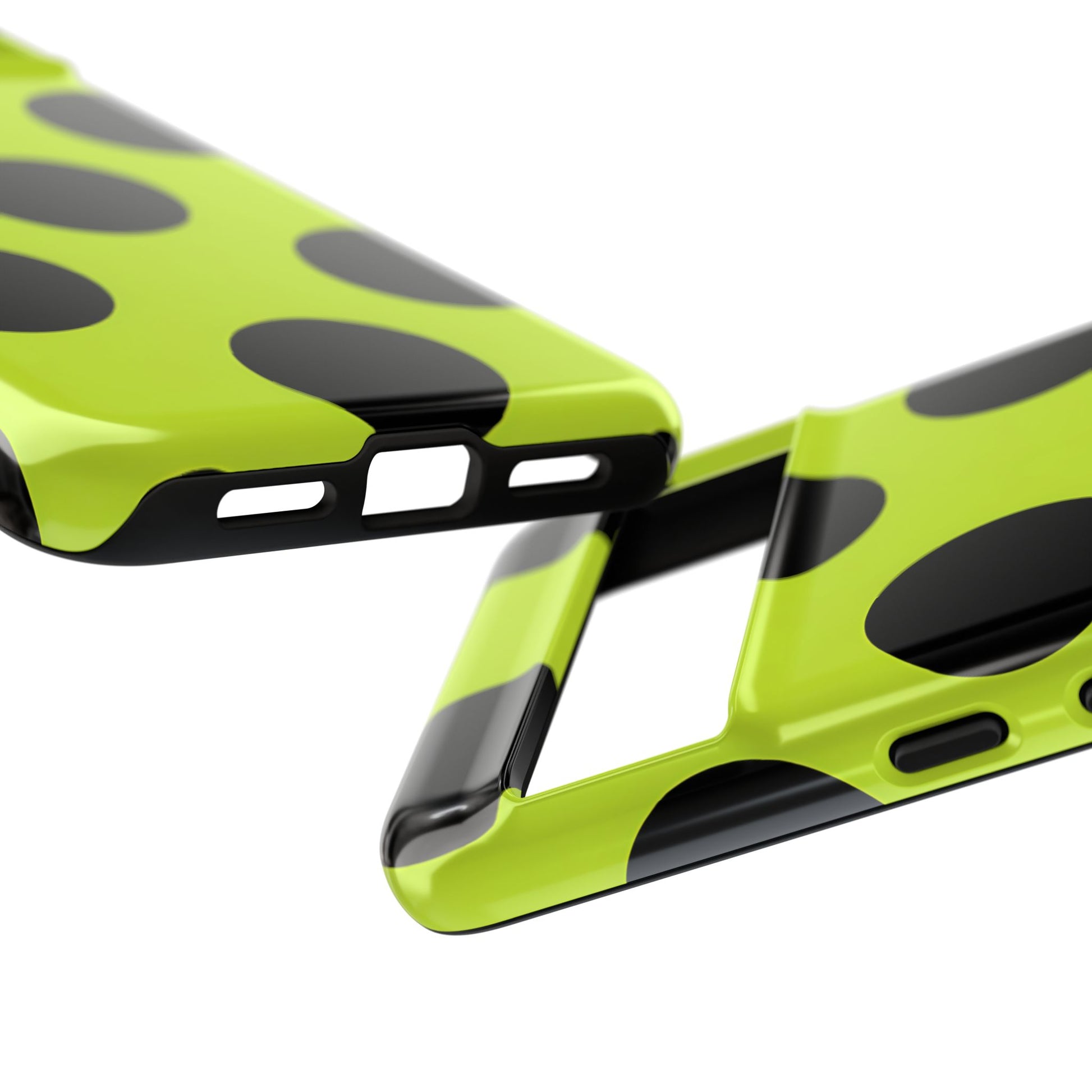 High-contrast black circles float evenly on a vivid lime base, offering a stylish, graphic, and fashion-forward pattern.