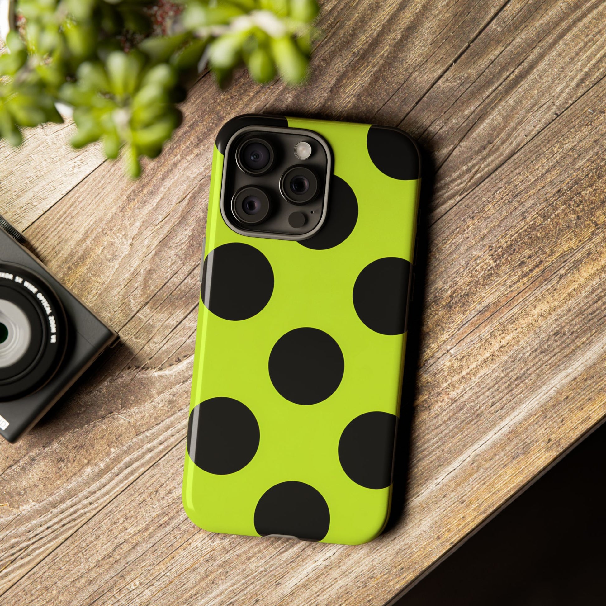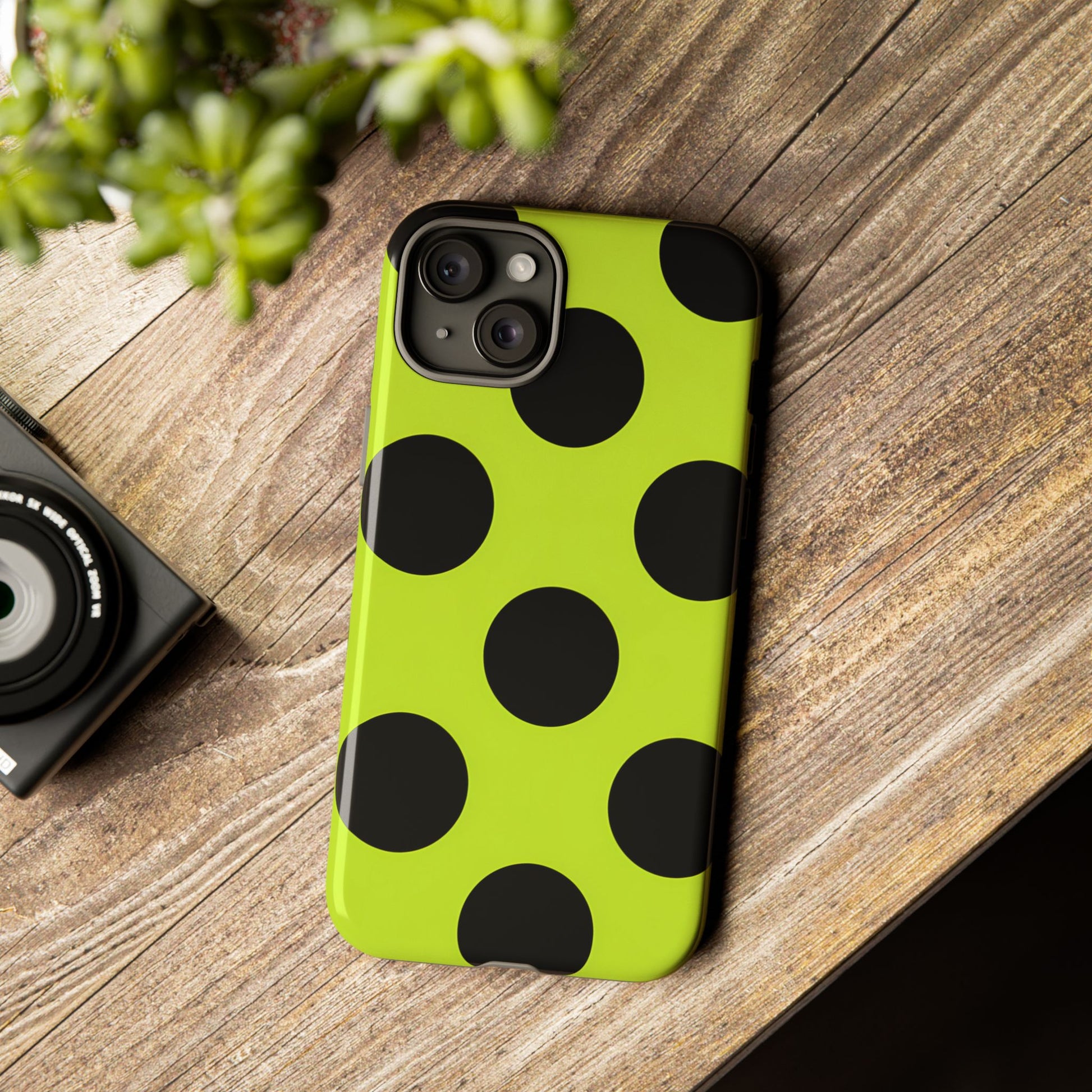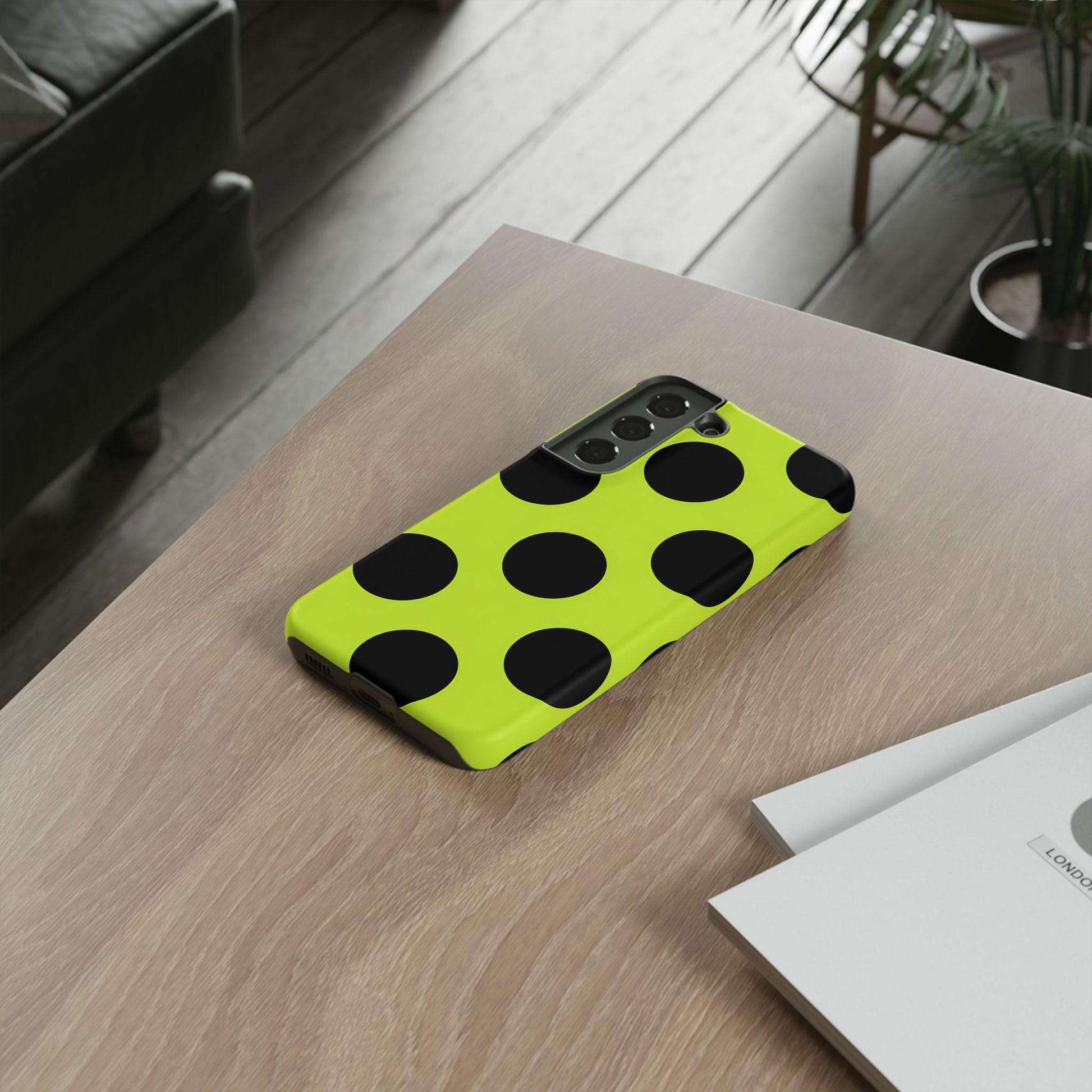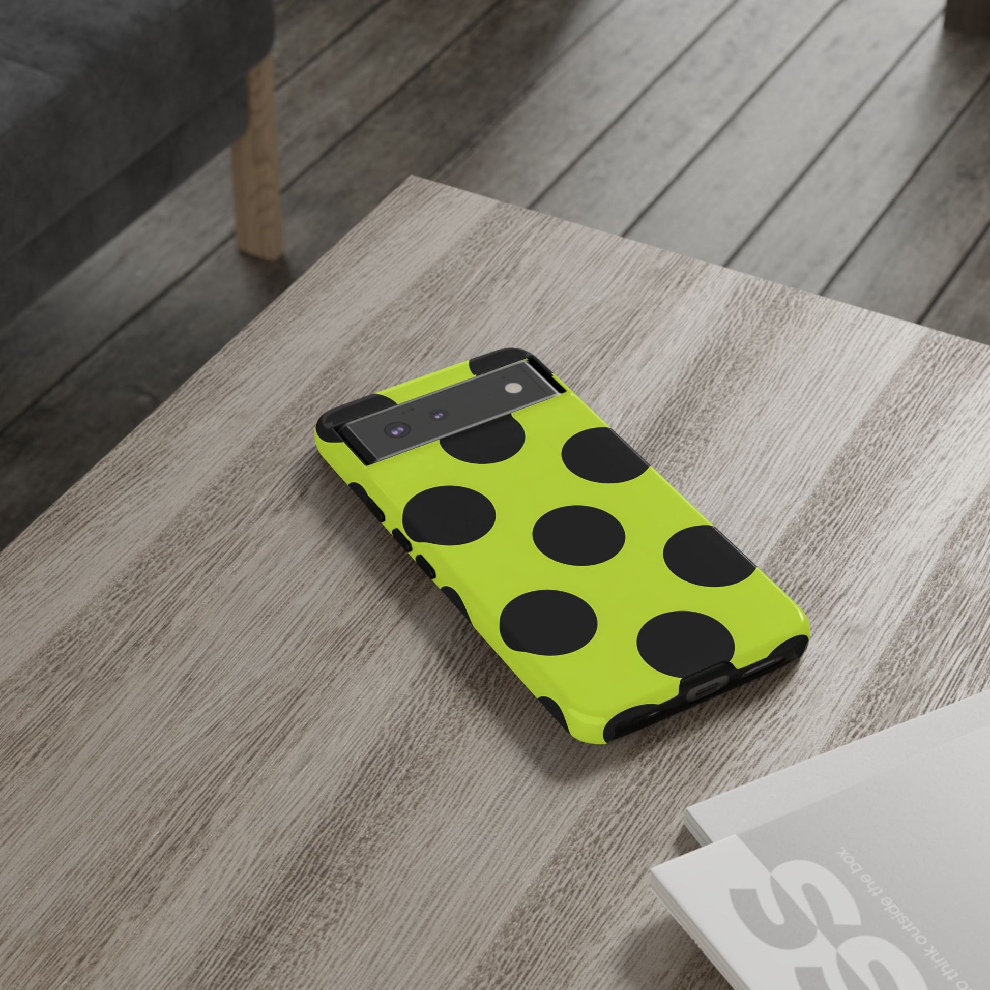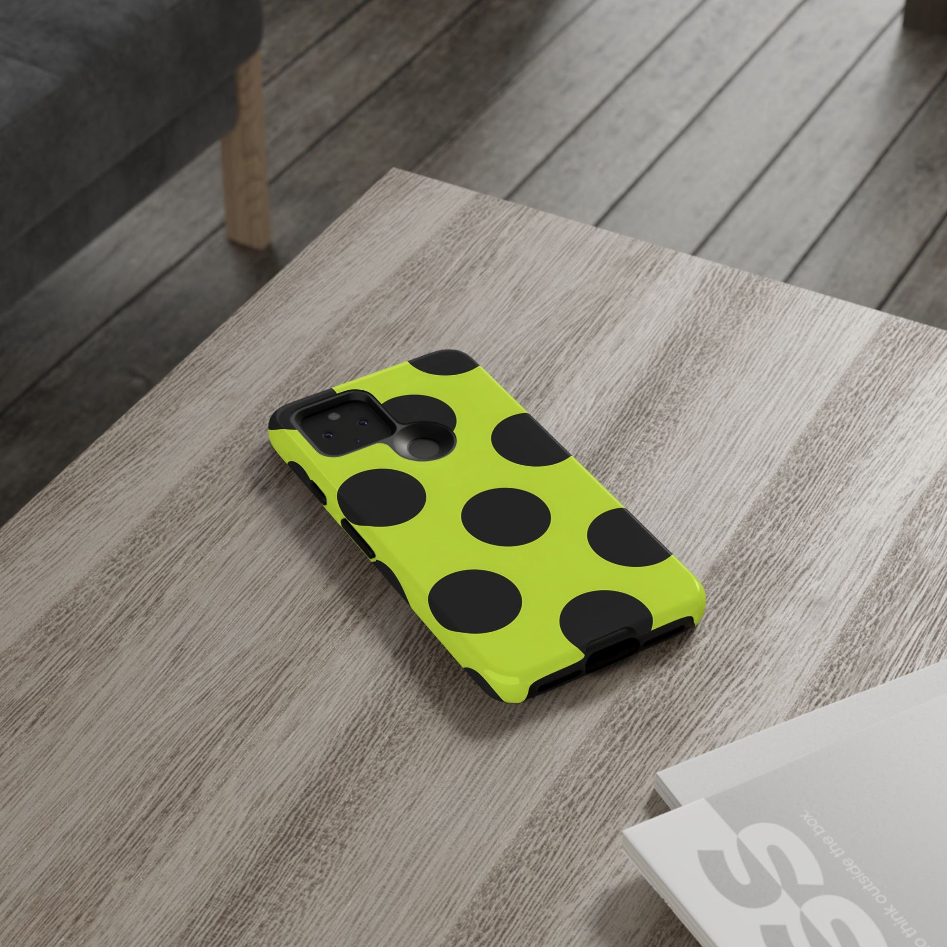 High-contrast black circles float evenly on a vivid lime base, offering a stylish, graphic, and fashion-forward pattern.