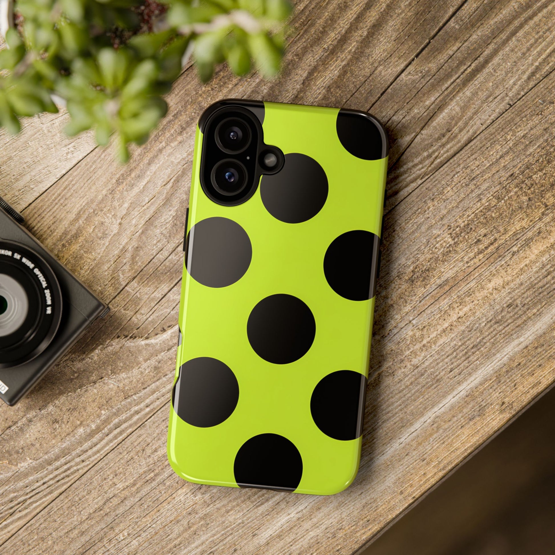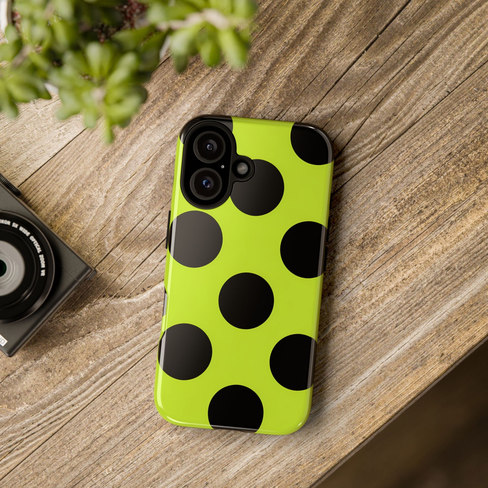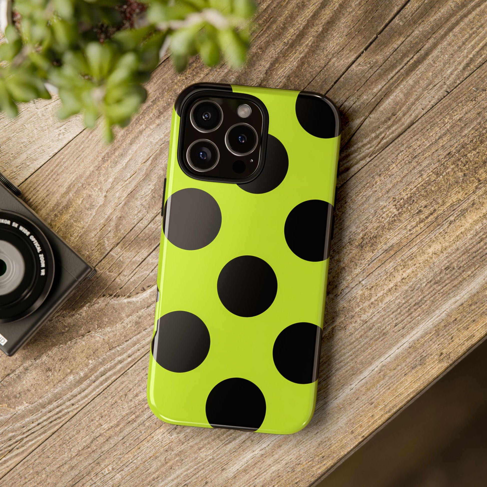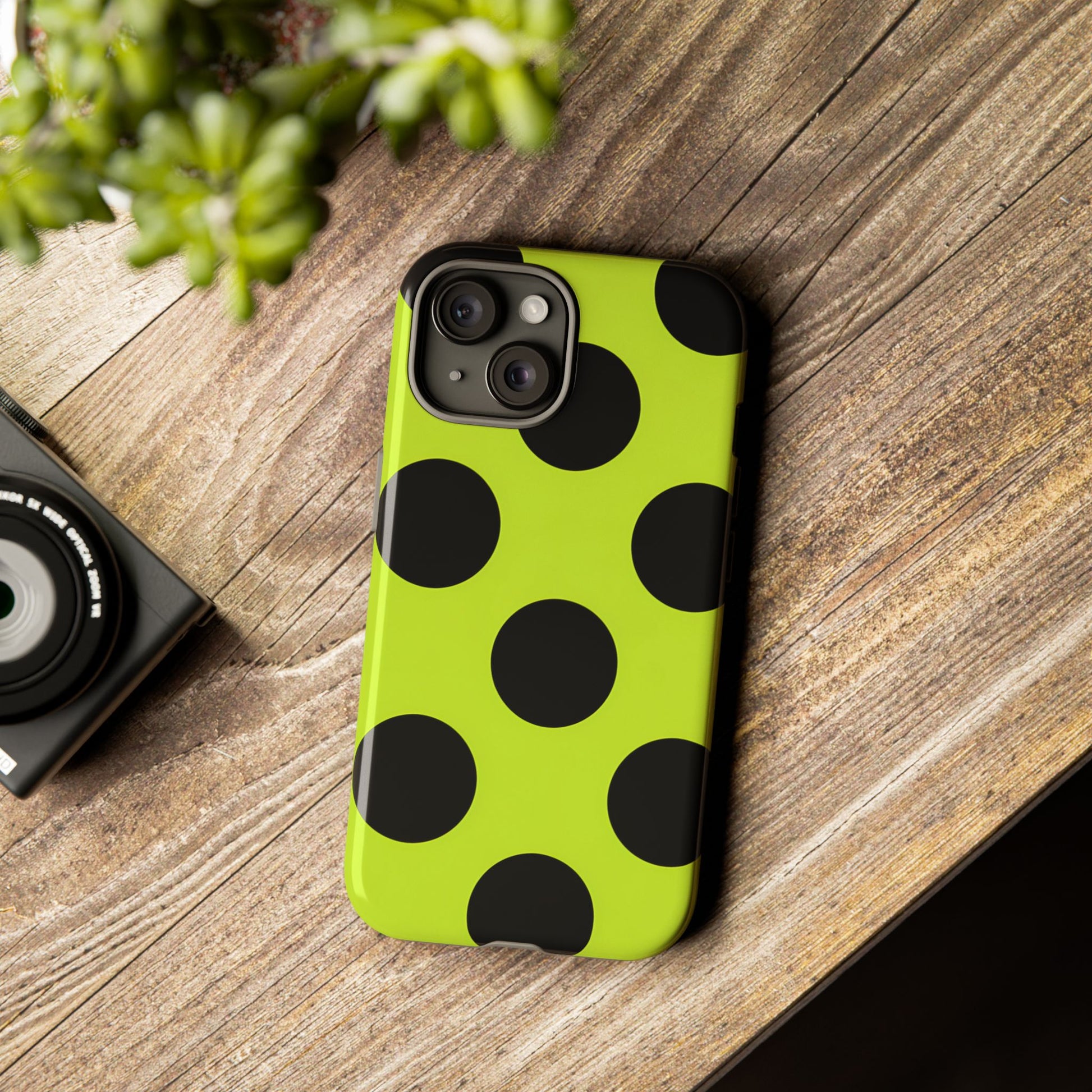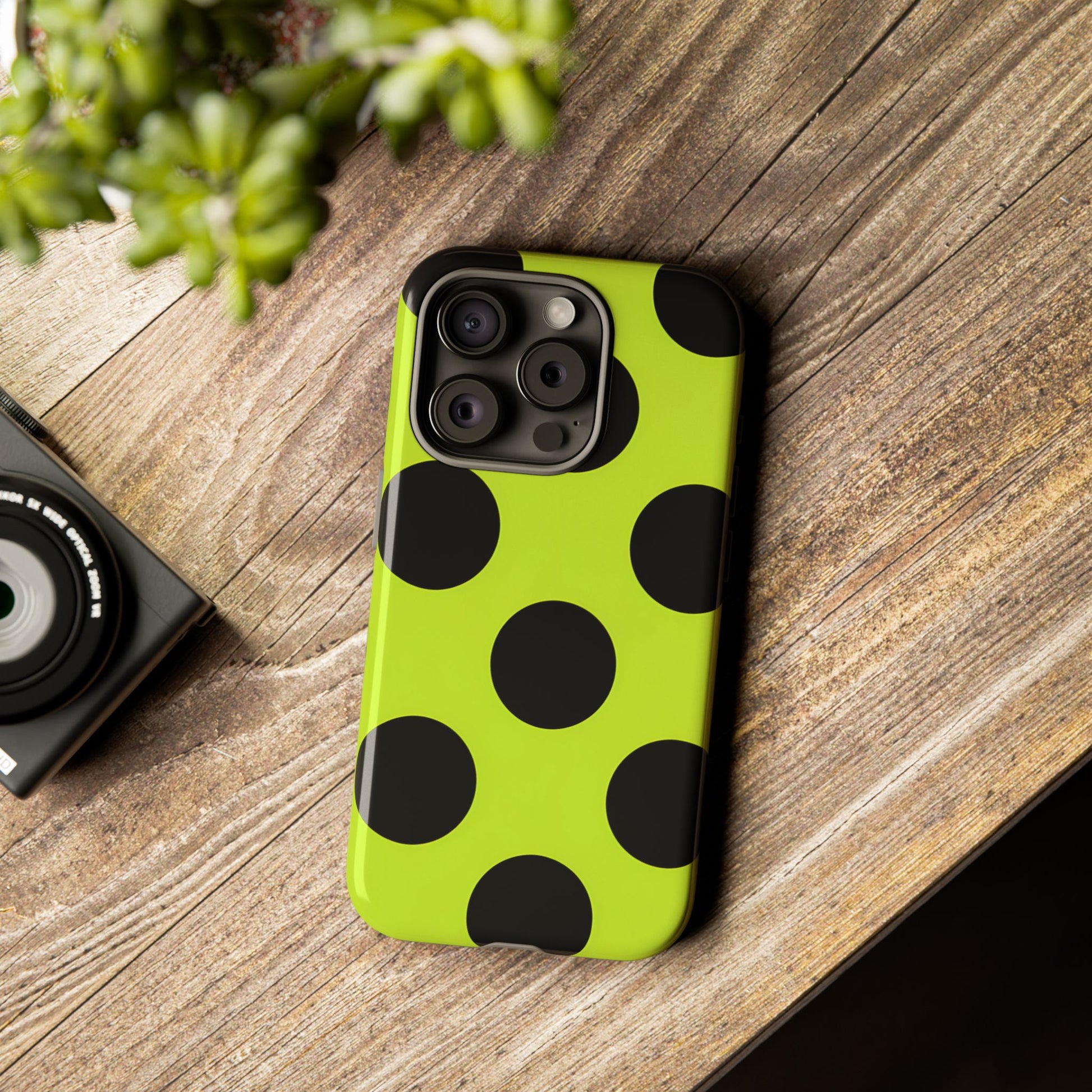High-contrast black circles float evenly on a vivid lime base, offering a stylish, graphic, and fashion-forward pattern.