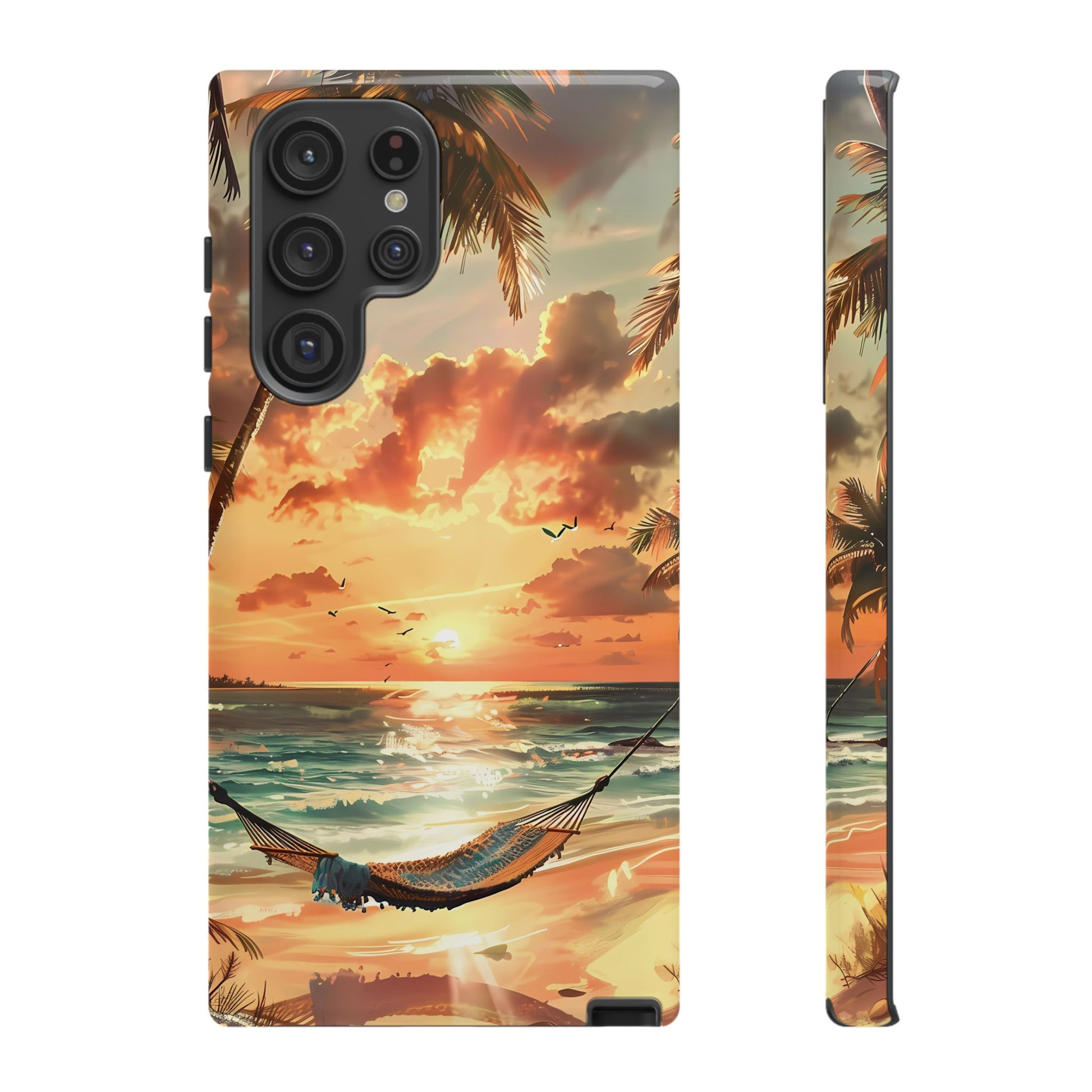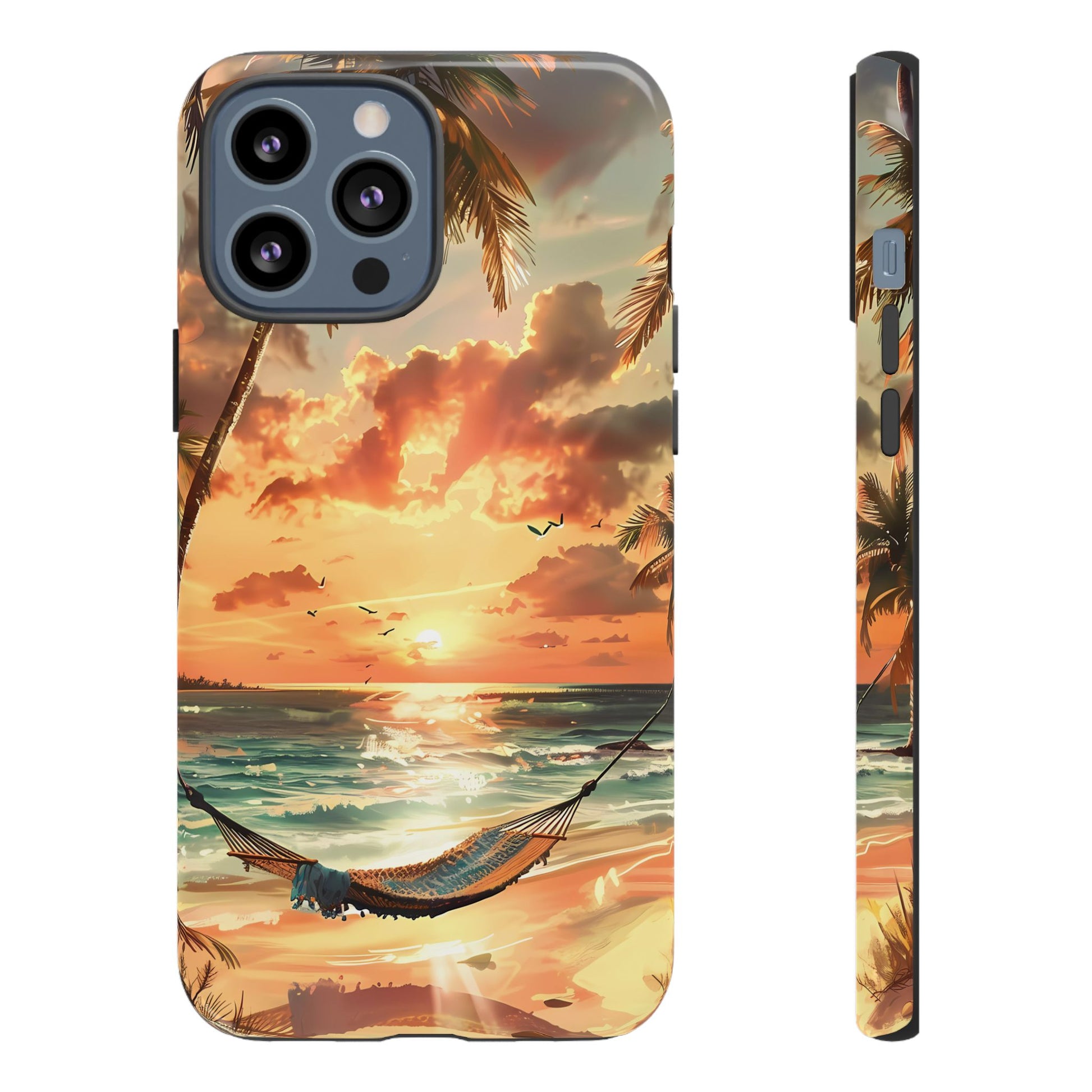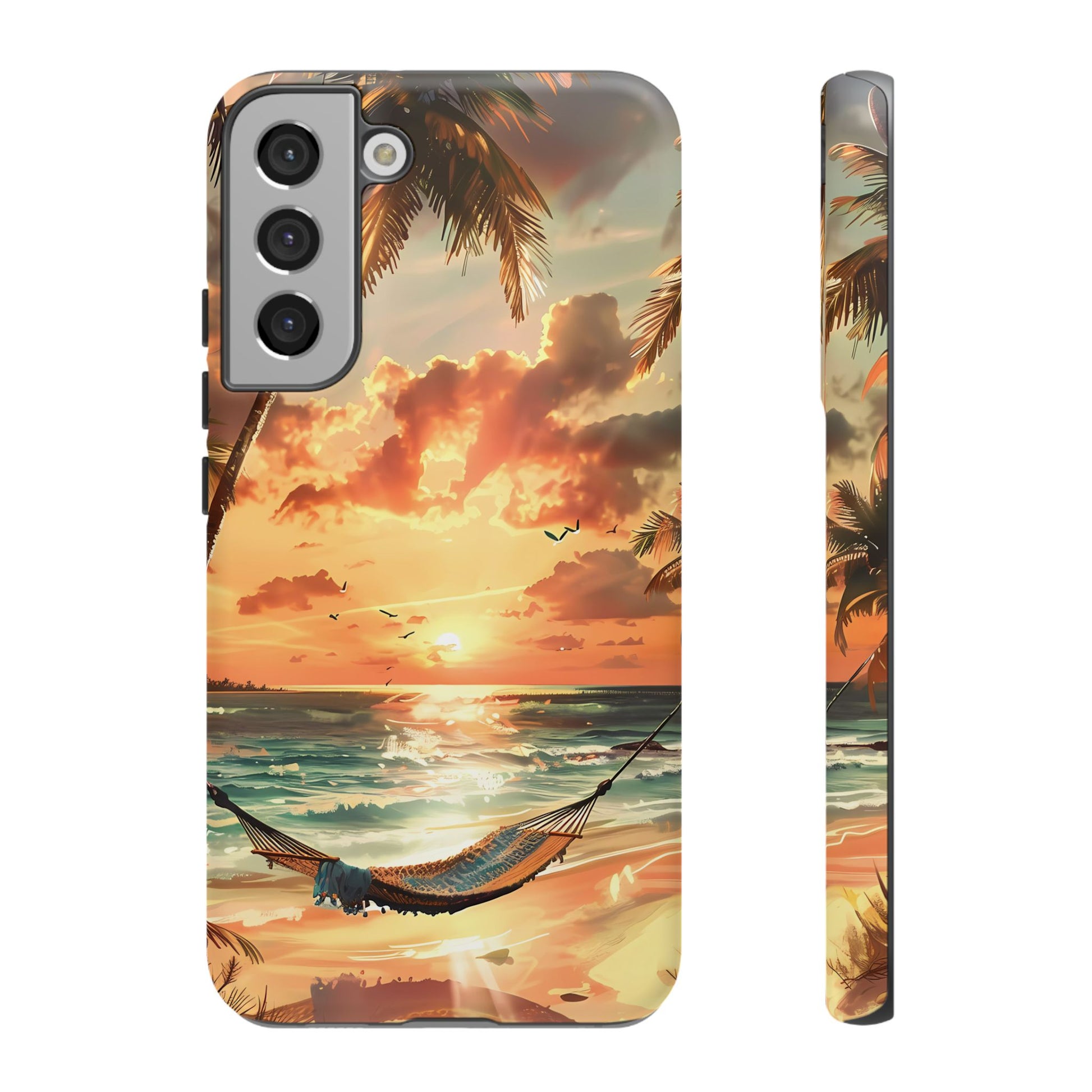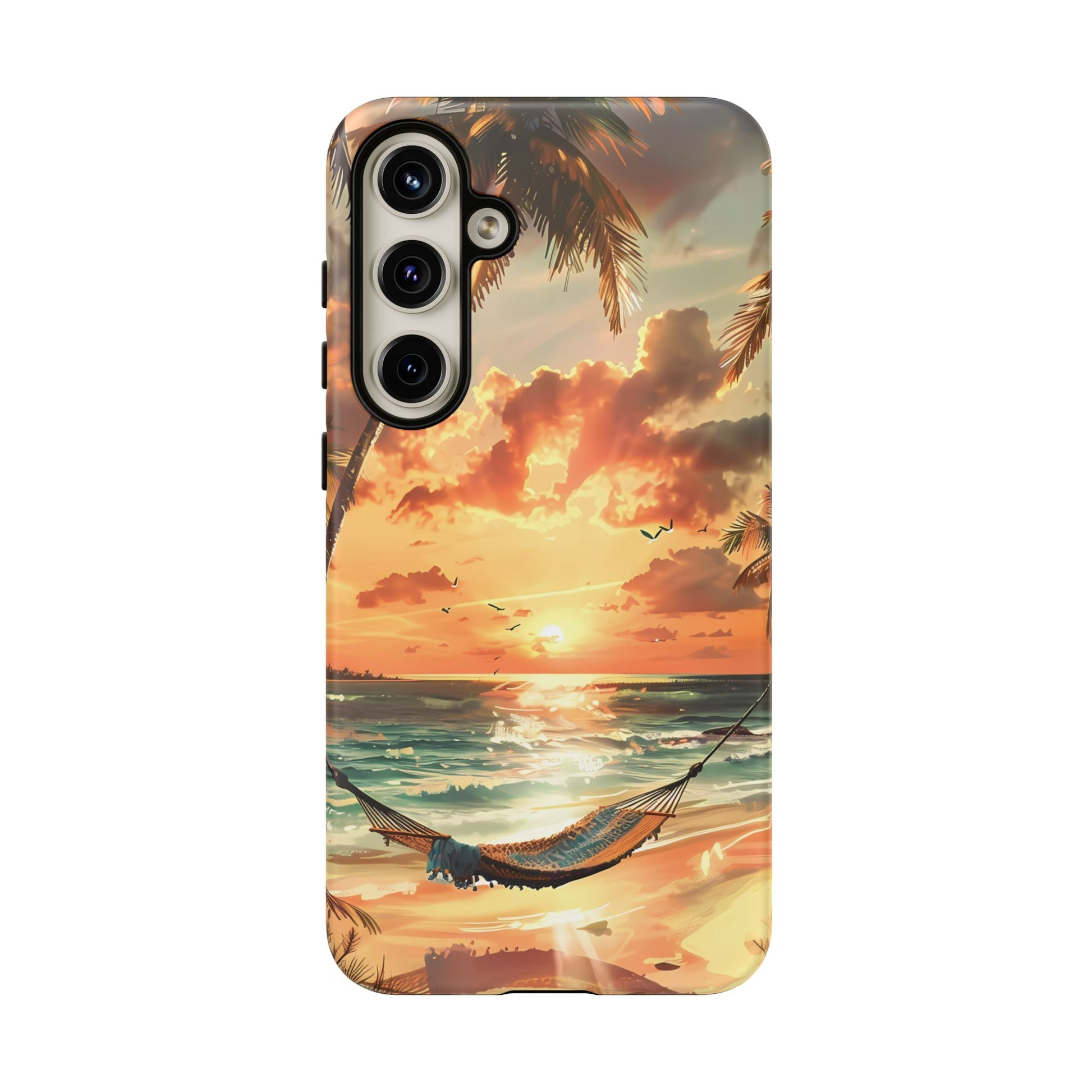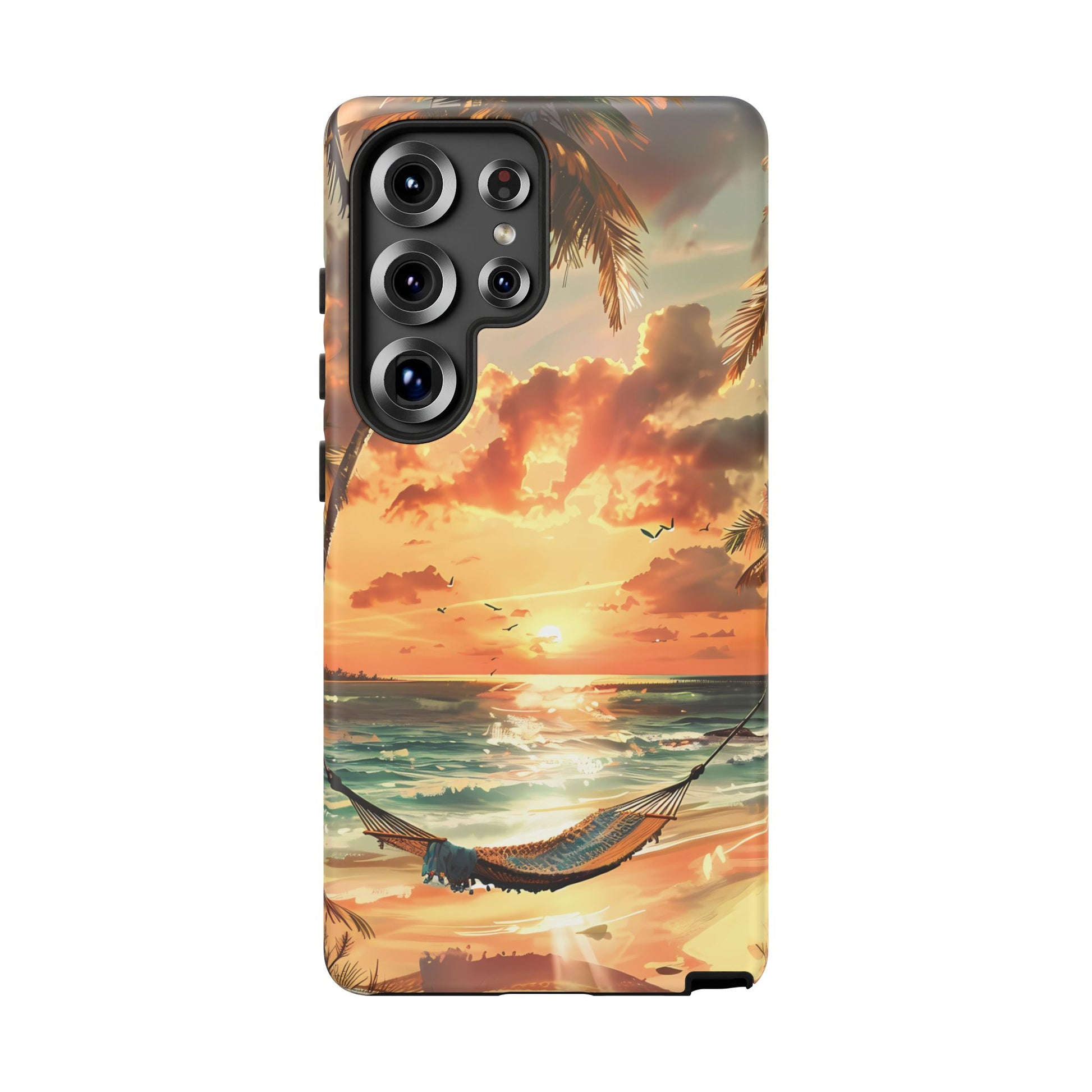Experience the ultimate in relaxation with this stunning cell phone cover, featuring a watercolor scene of a tropical beach at sunset. The serene setting, with palm trees and a hammock swaying in the breeze, creates a calming and peaceful atmosphere, perfect for those who love the beach life.