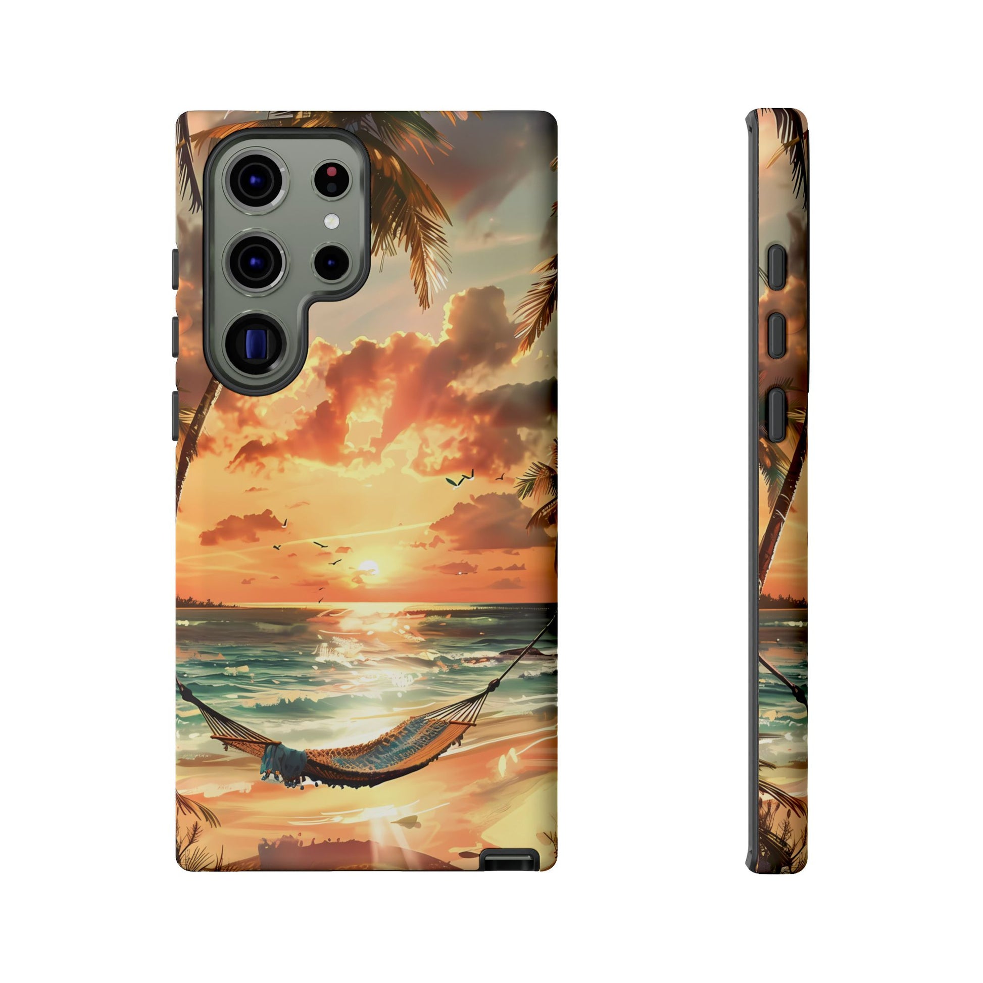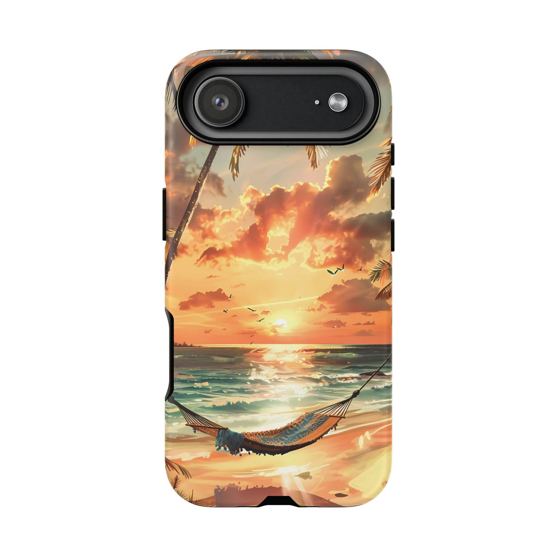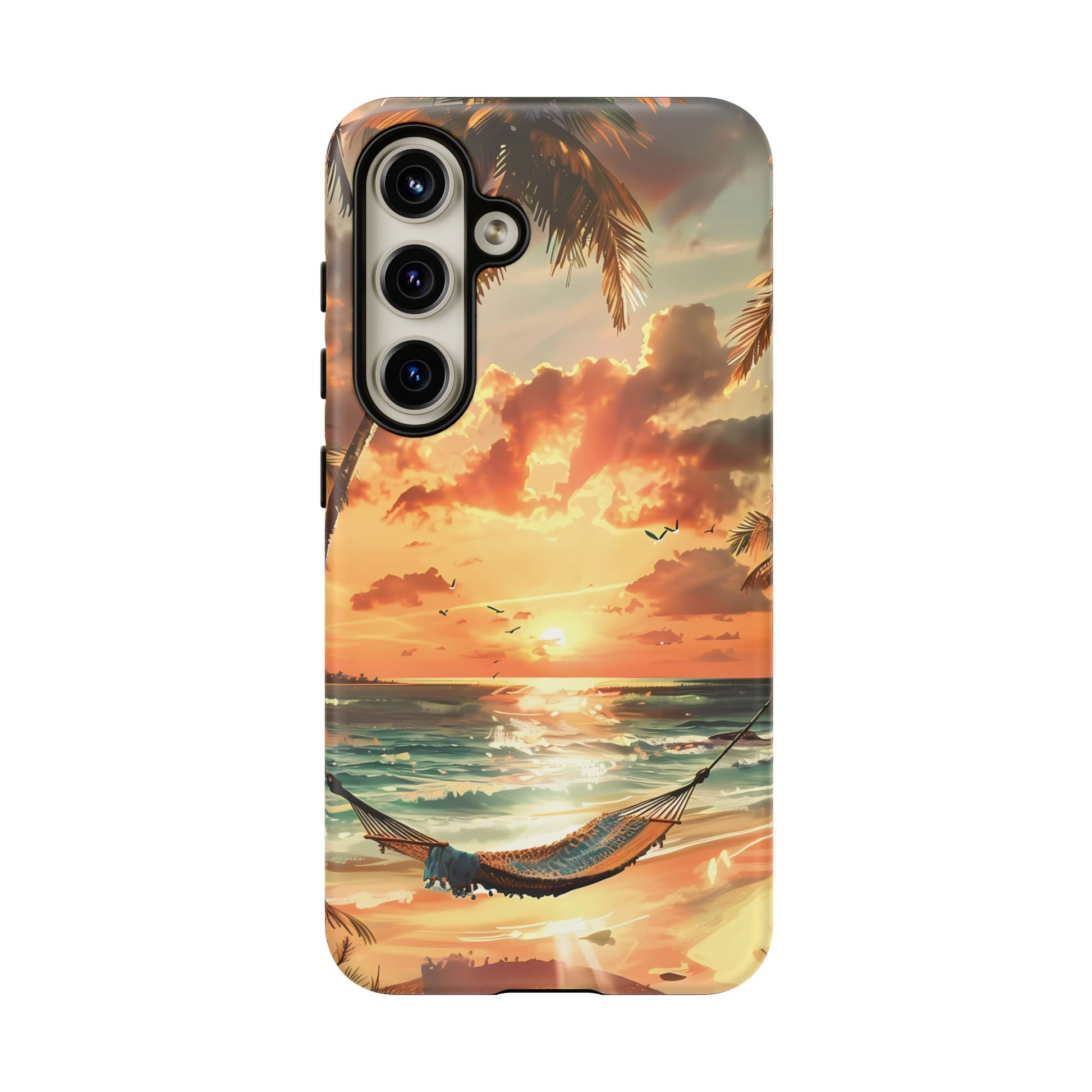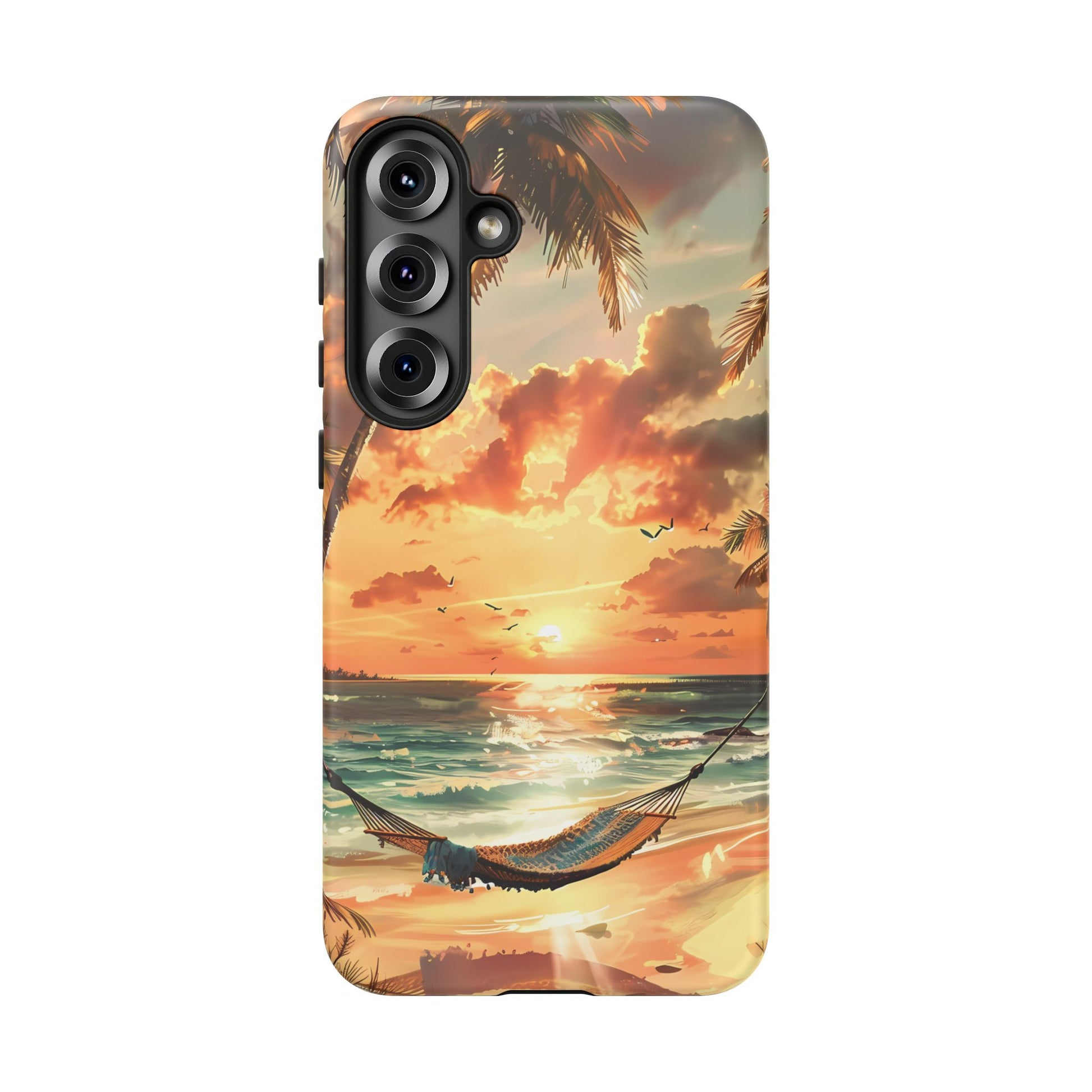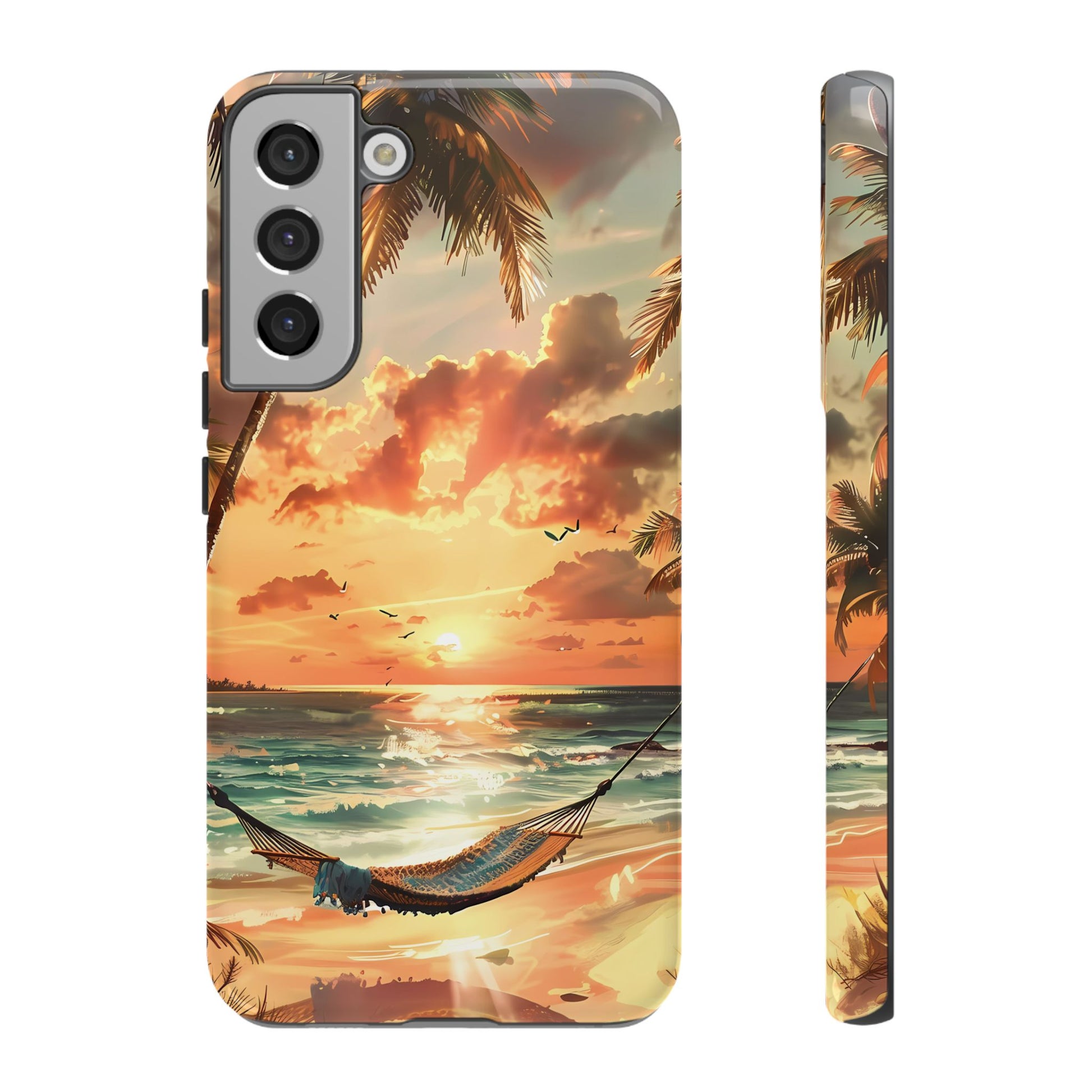 Experience the ultimate in relaxation with this stunning cell phone cover, featuring a watercolor scene of a tropical beach at sunset. The serene setting, with palm trees and a hammock swaying in the breeze, creates a calming and peaceful atmosphere, perfect for those who love the beach life.