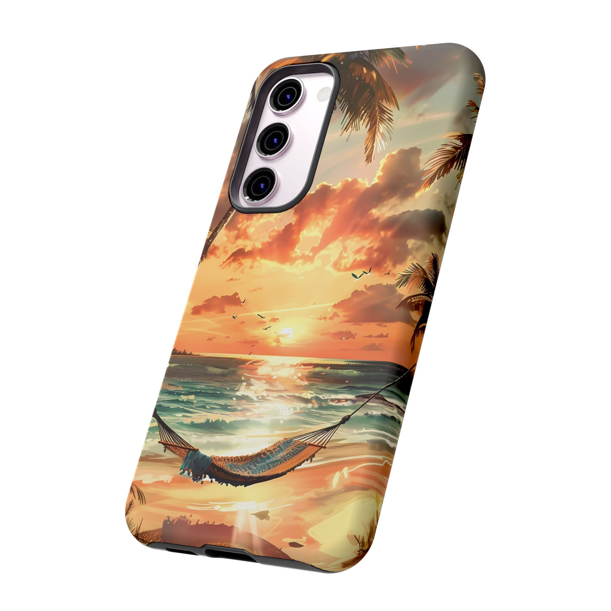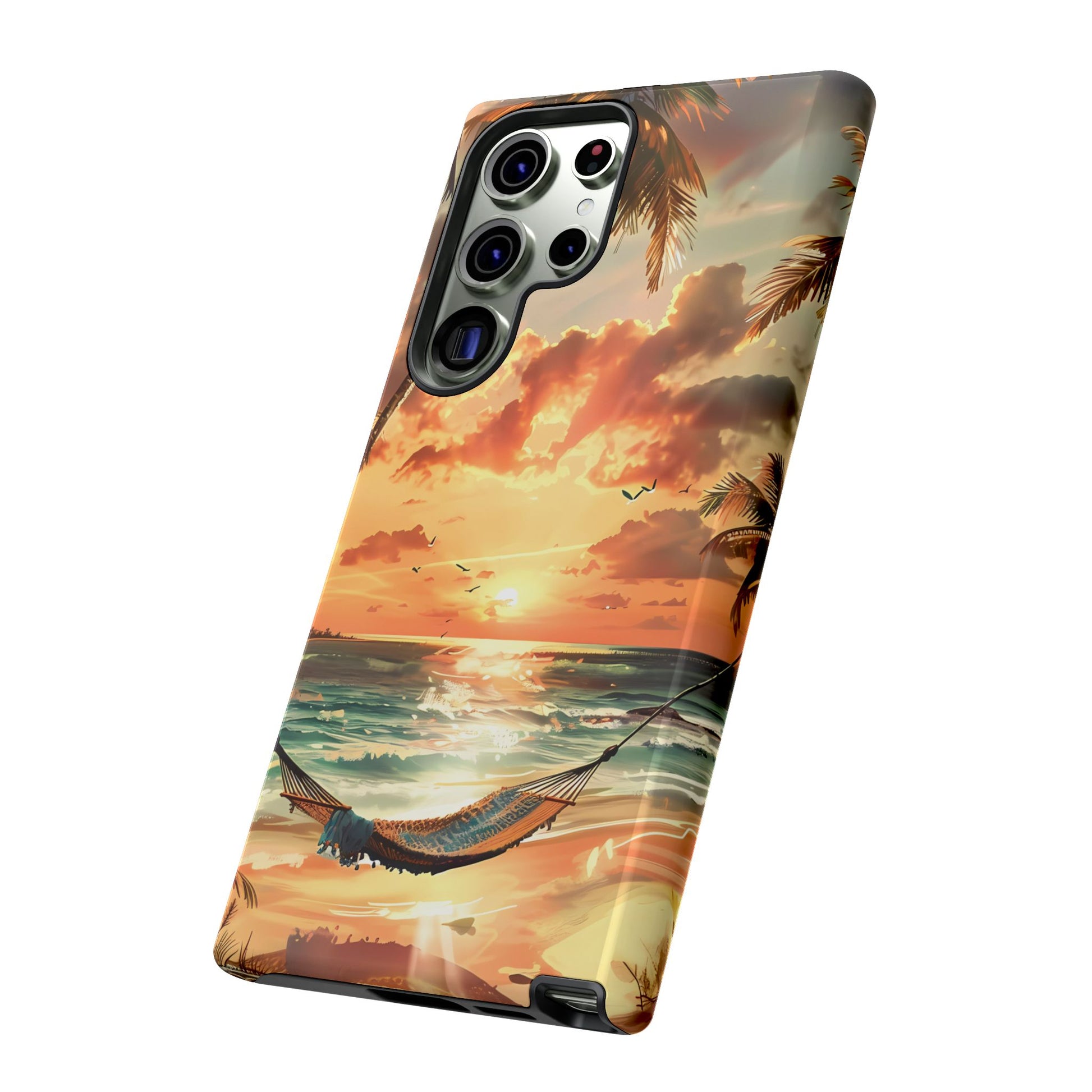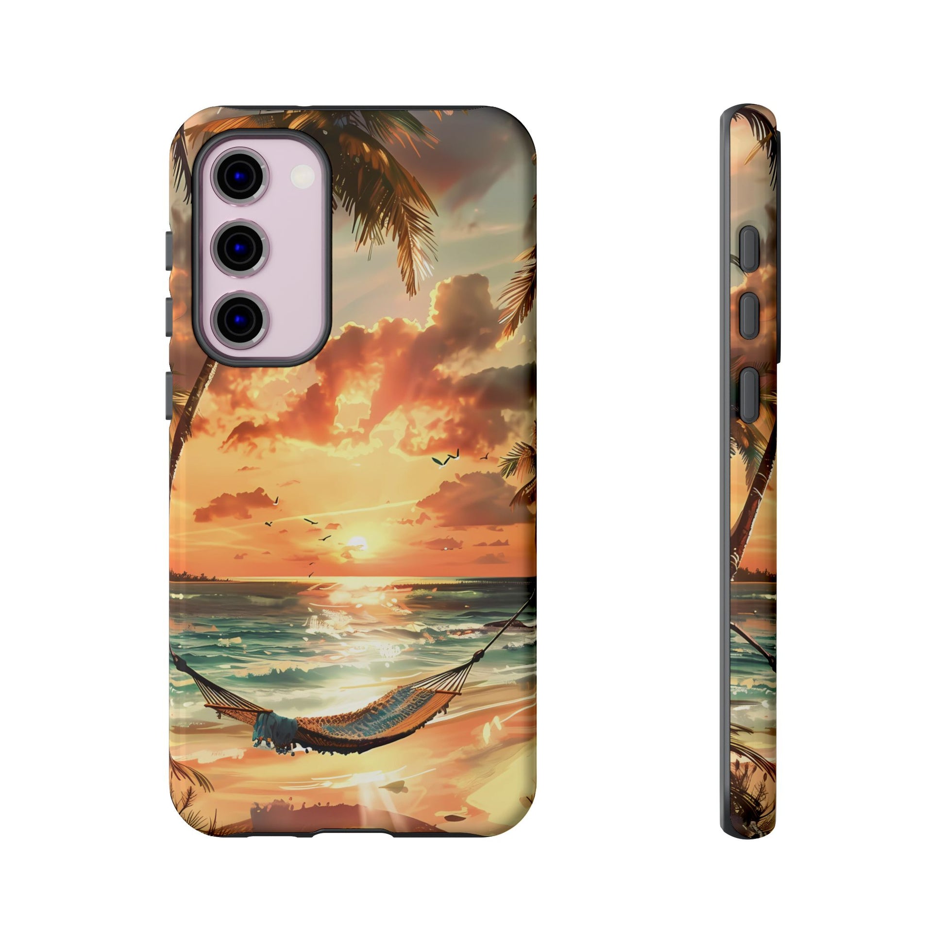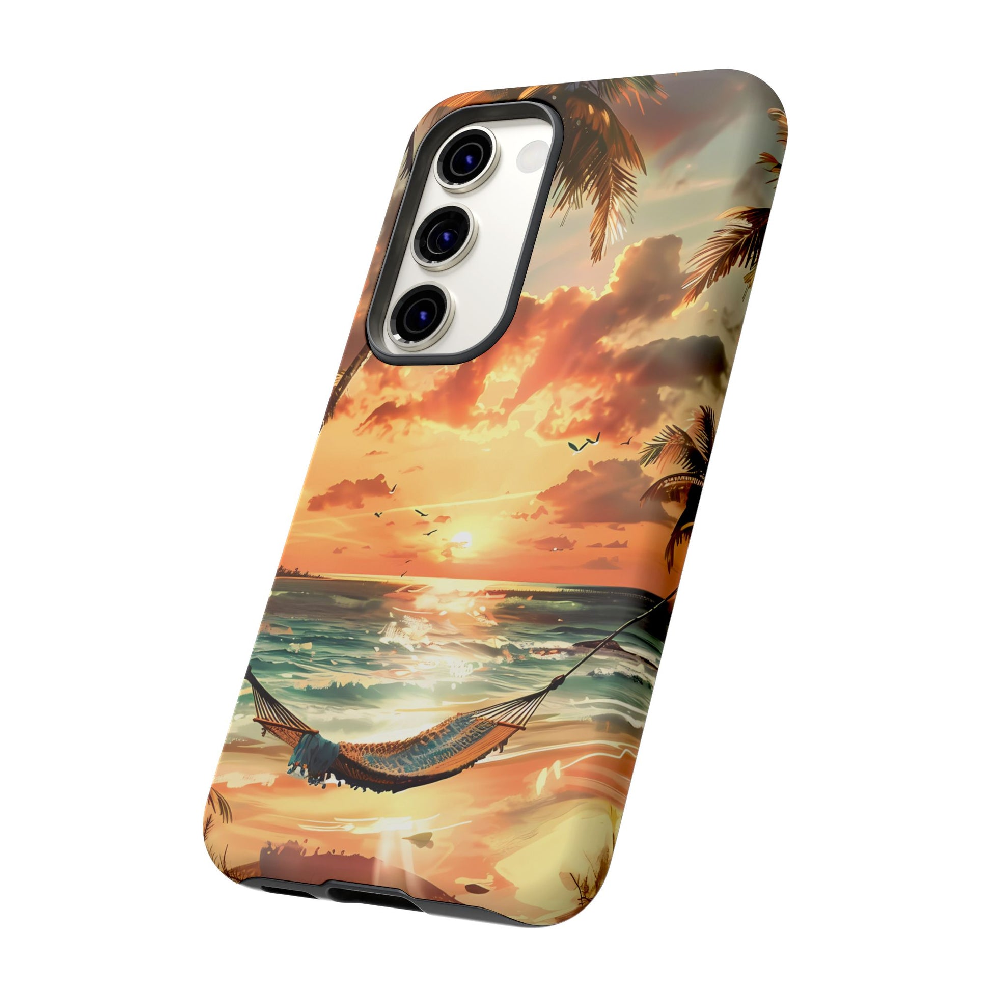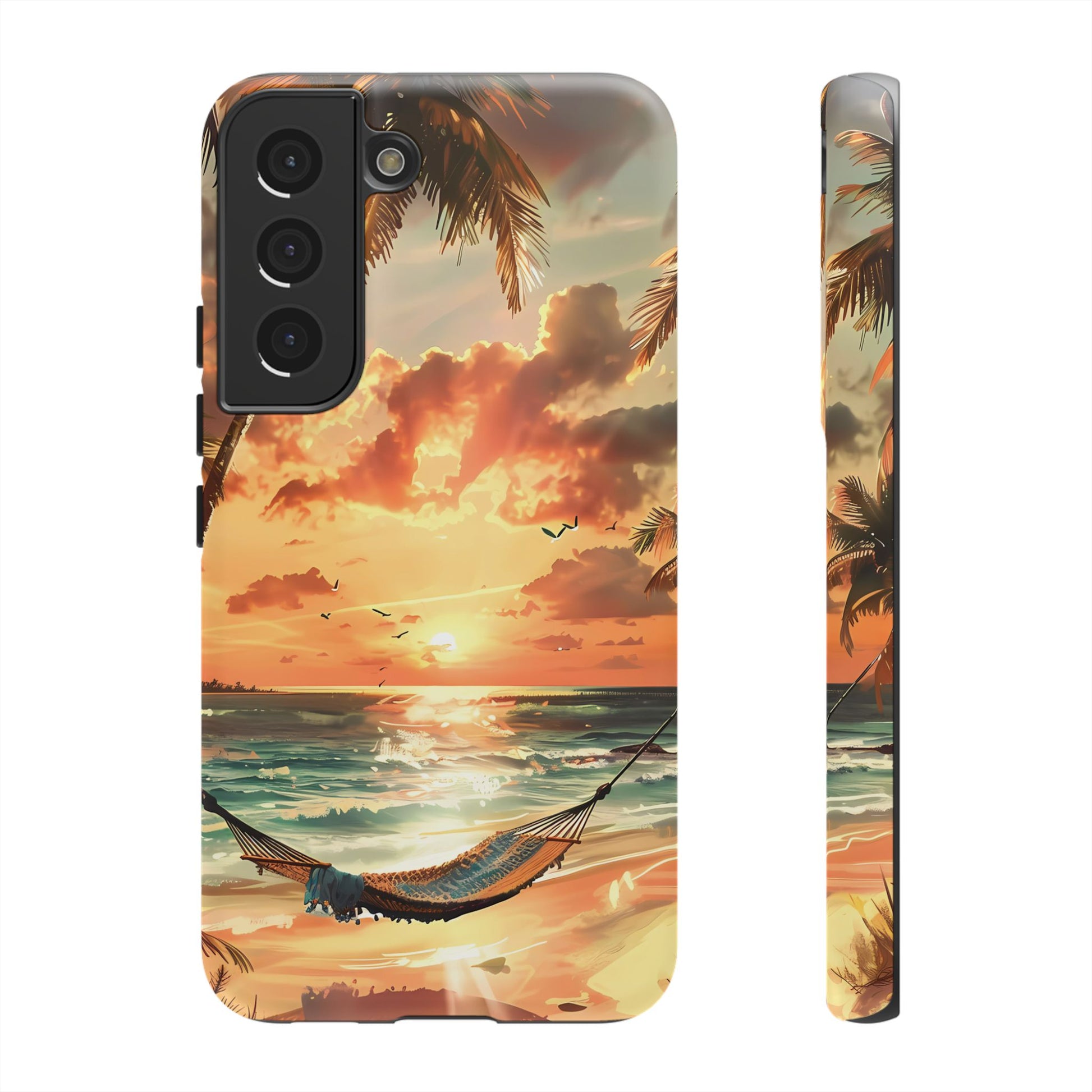 Experience the ultimate in relaxation with this stunning cell phone cover, featuring a watercolor scene of a tropical beach at sunset. The serene setting, with palm trees and a hammock swaying in the breeze, creates a calming and peaceful atmosphere, perfect for those who love the beach life.