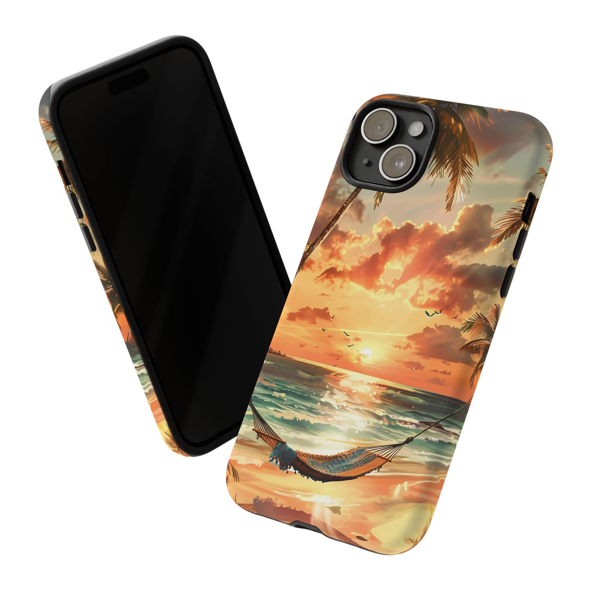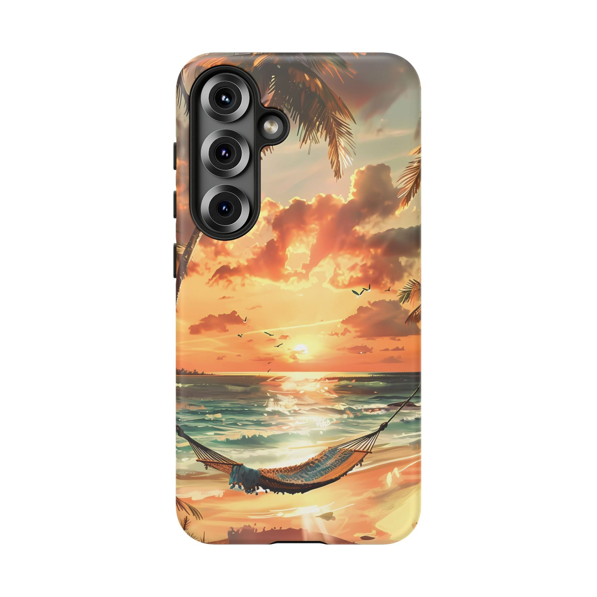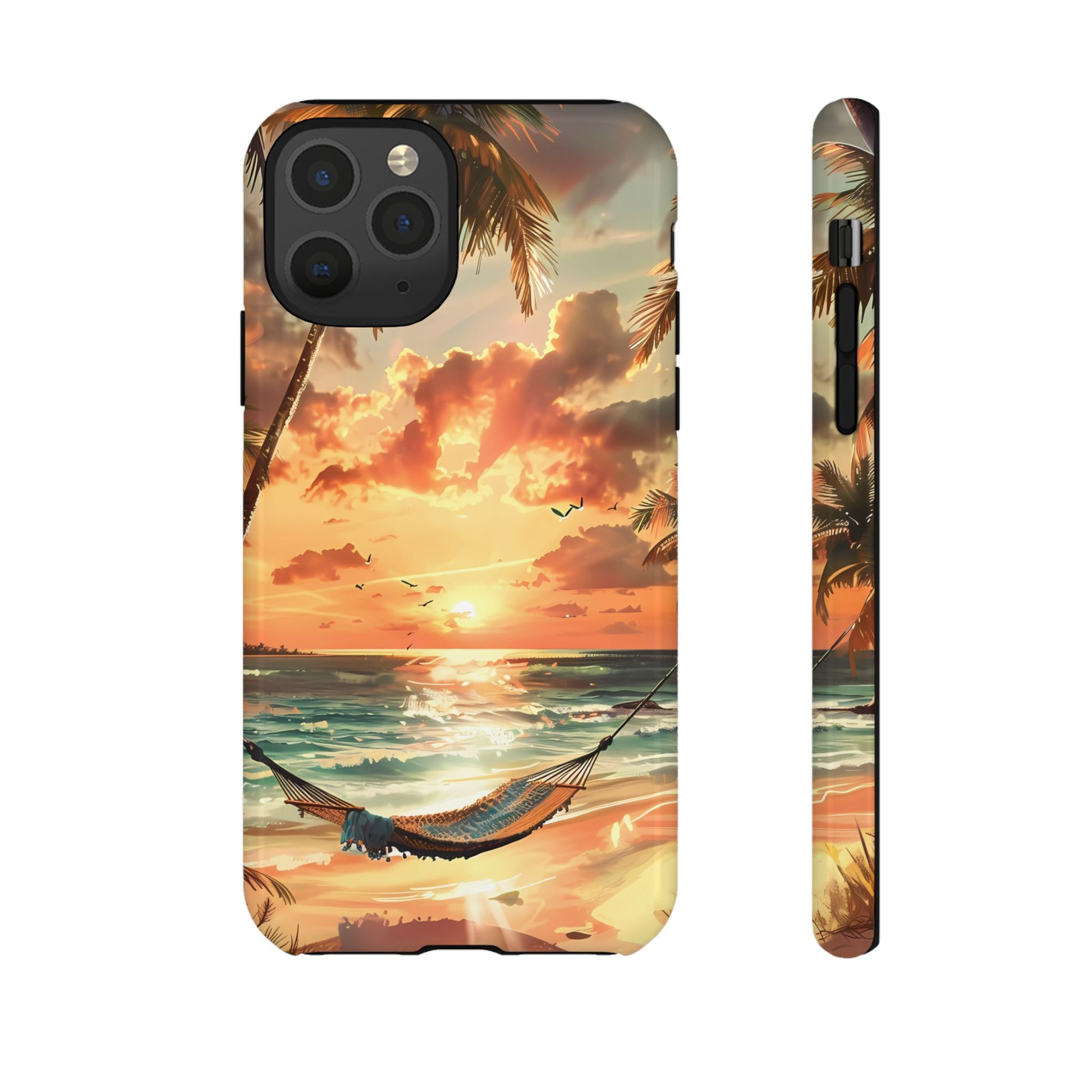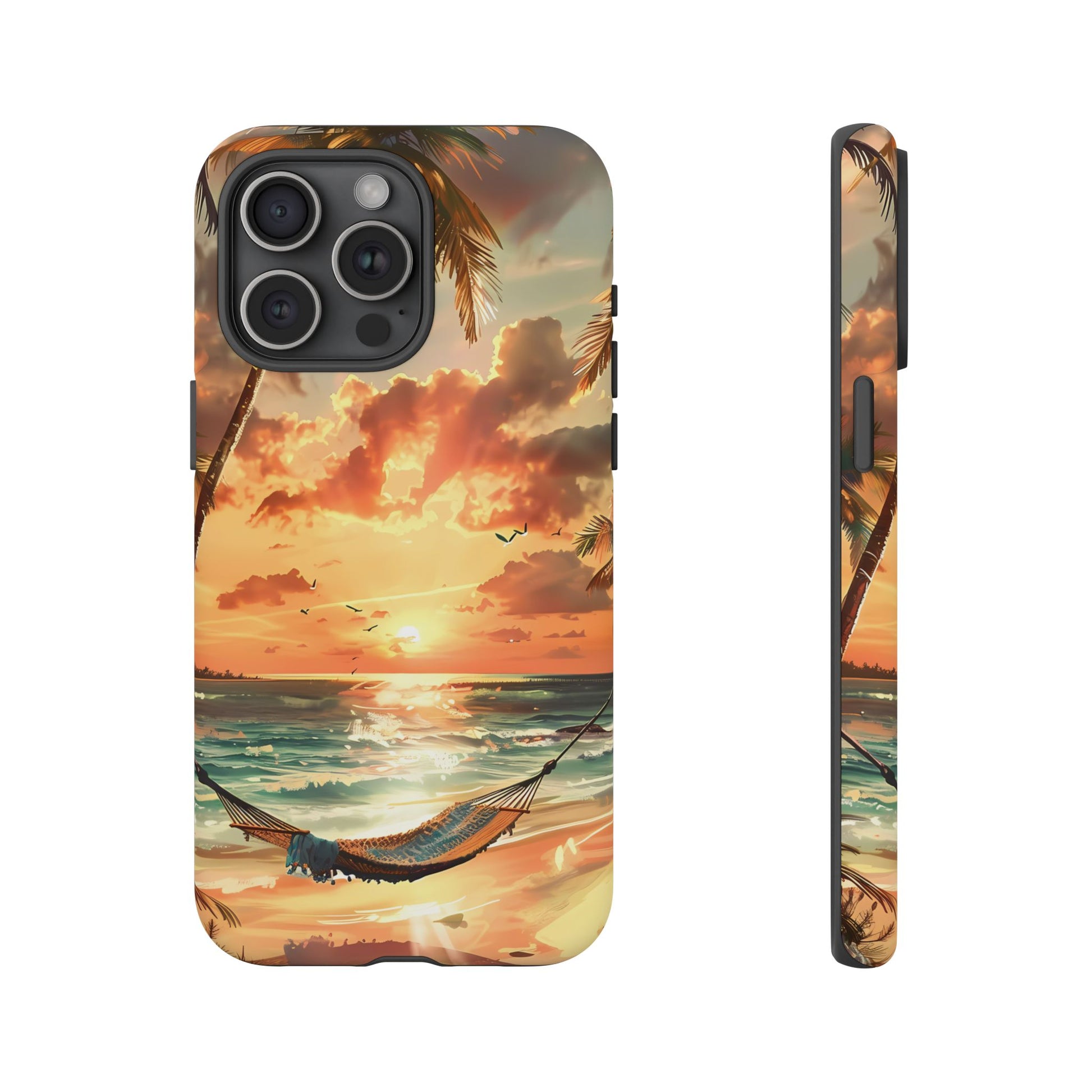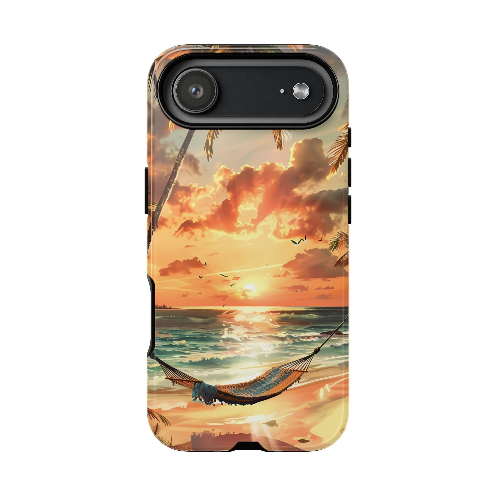 Experience the ultimate in relaxation with this stunning cell phone cover, featuring a watercolor scene of a tropical beach at sunset. The serene setting, with palm trees and a hammock swaying in the breeze, creates a calming and peaceful atmosphere, perfect for those who love the beach life.