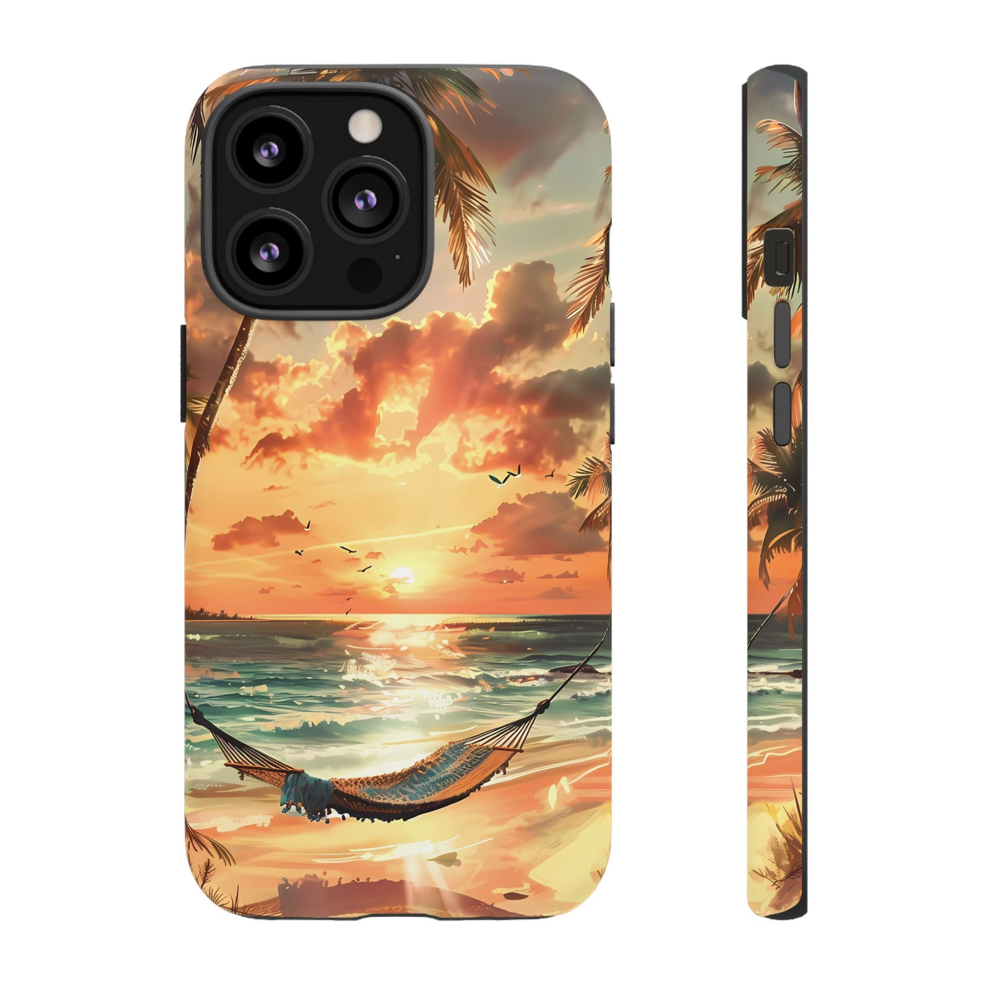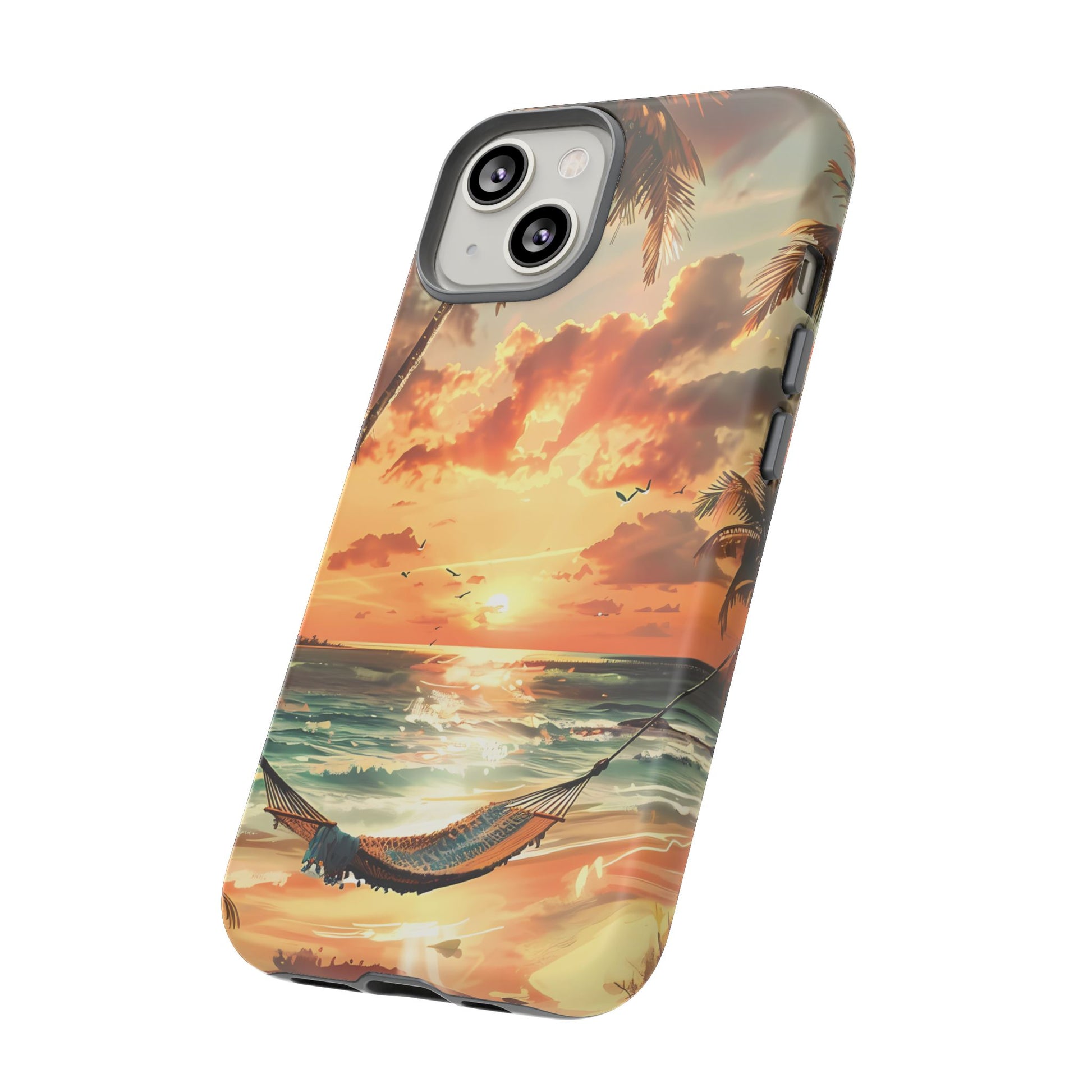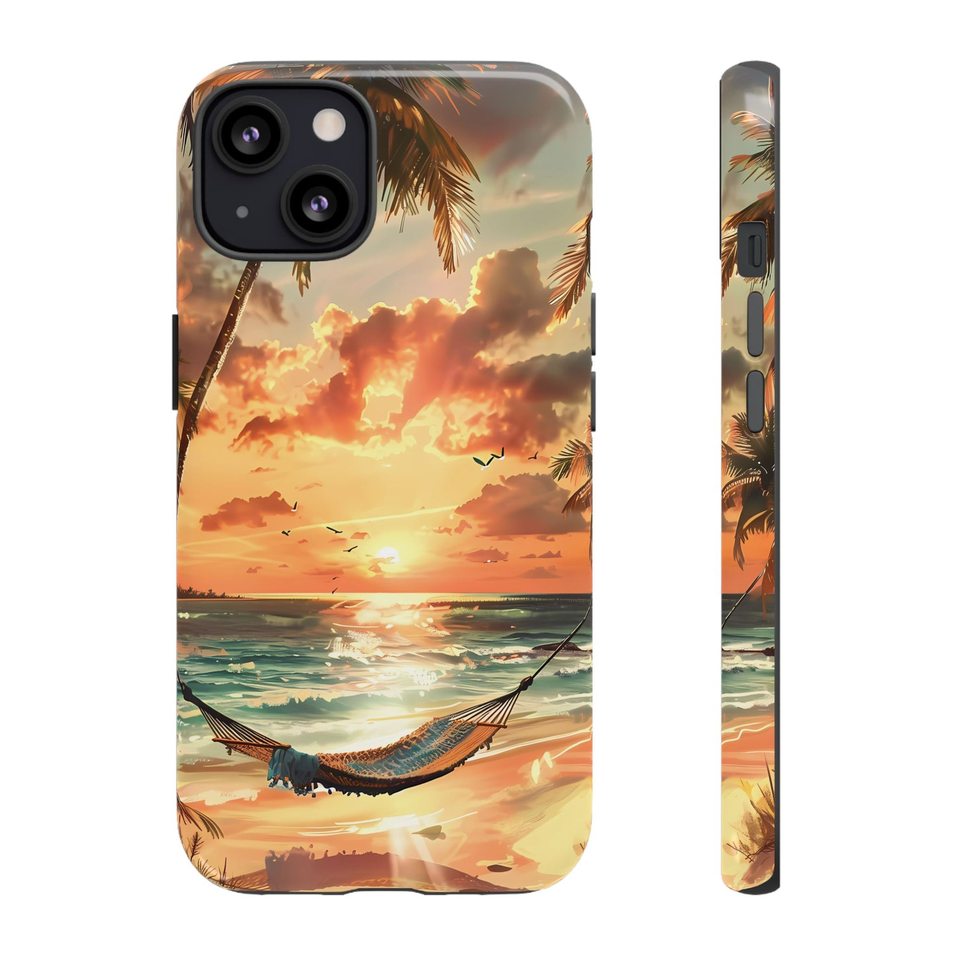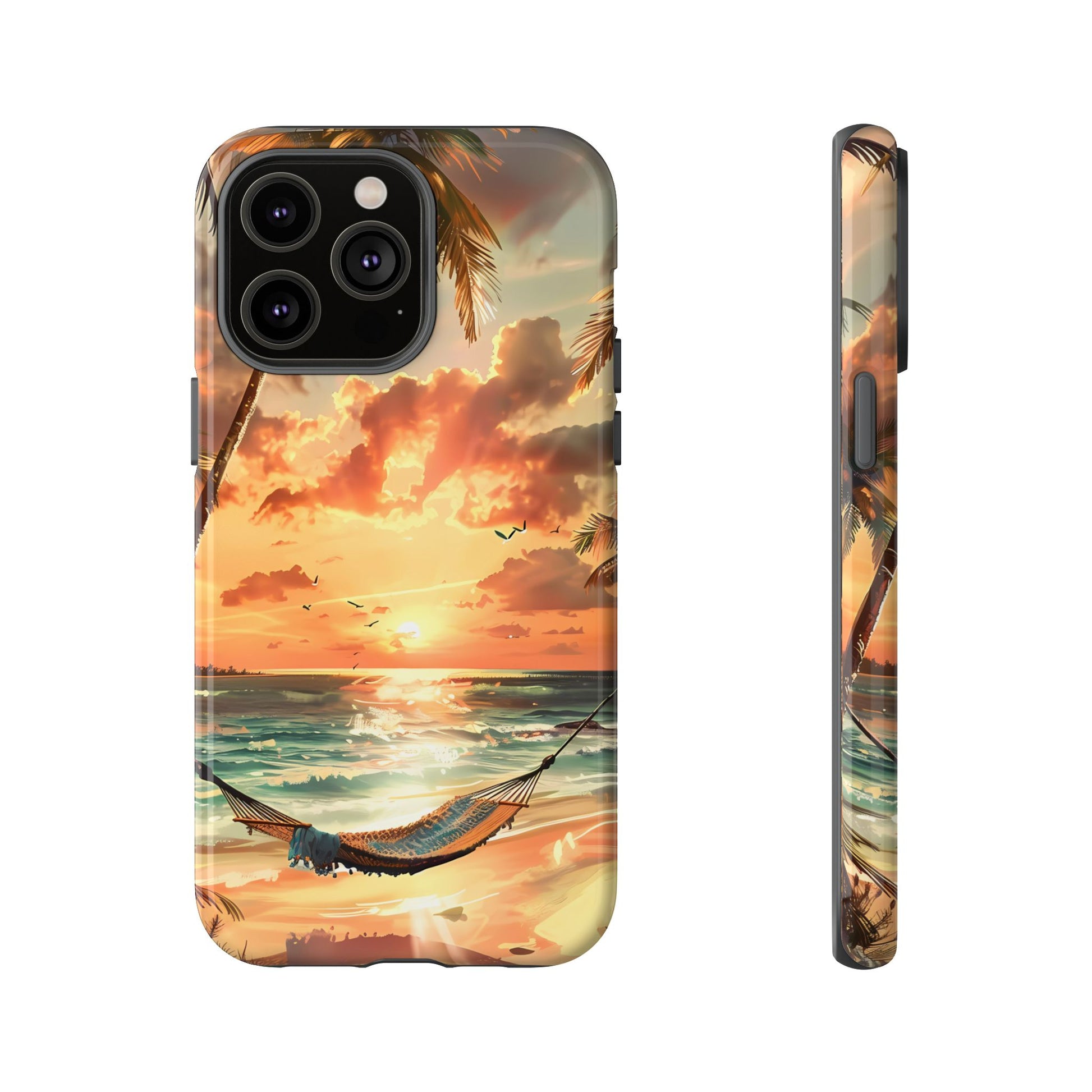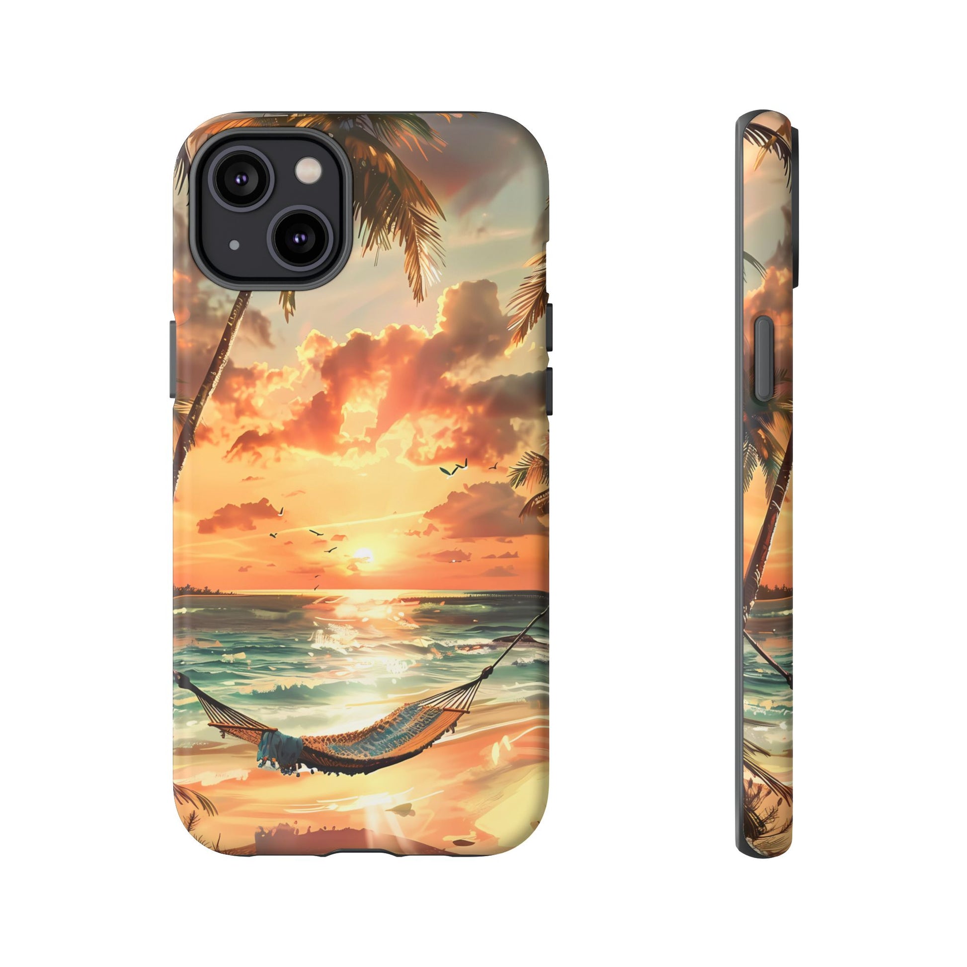 Experience the ultimate in relaxation with this stunning cell phone cover, featuring a watercolor scene of a tropical beach at sunset. The serene setting, with palm trees and a hammock swaying in the breeze, creates a calming and peaceful atmosphere, perfect for those who love the beach life.