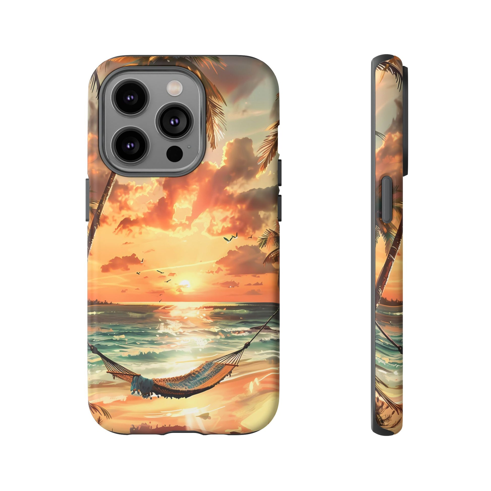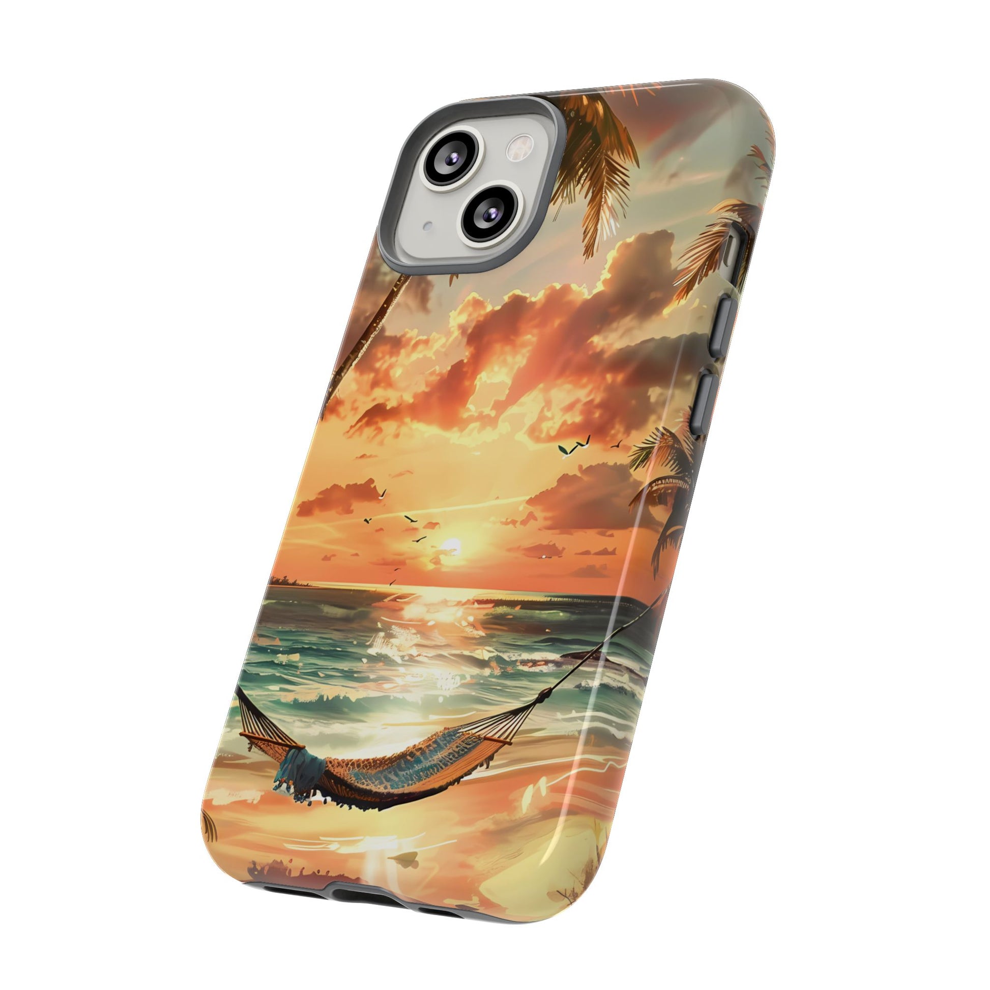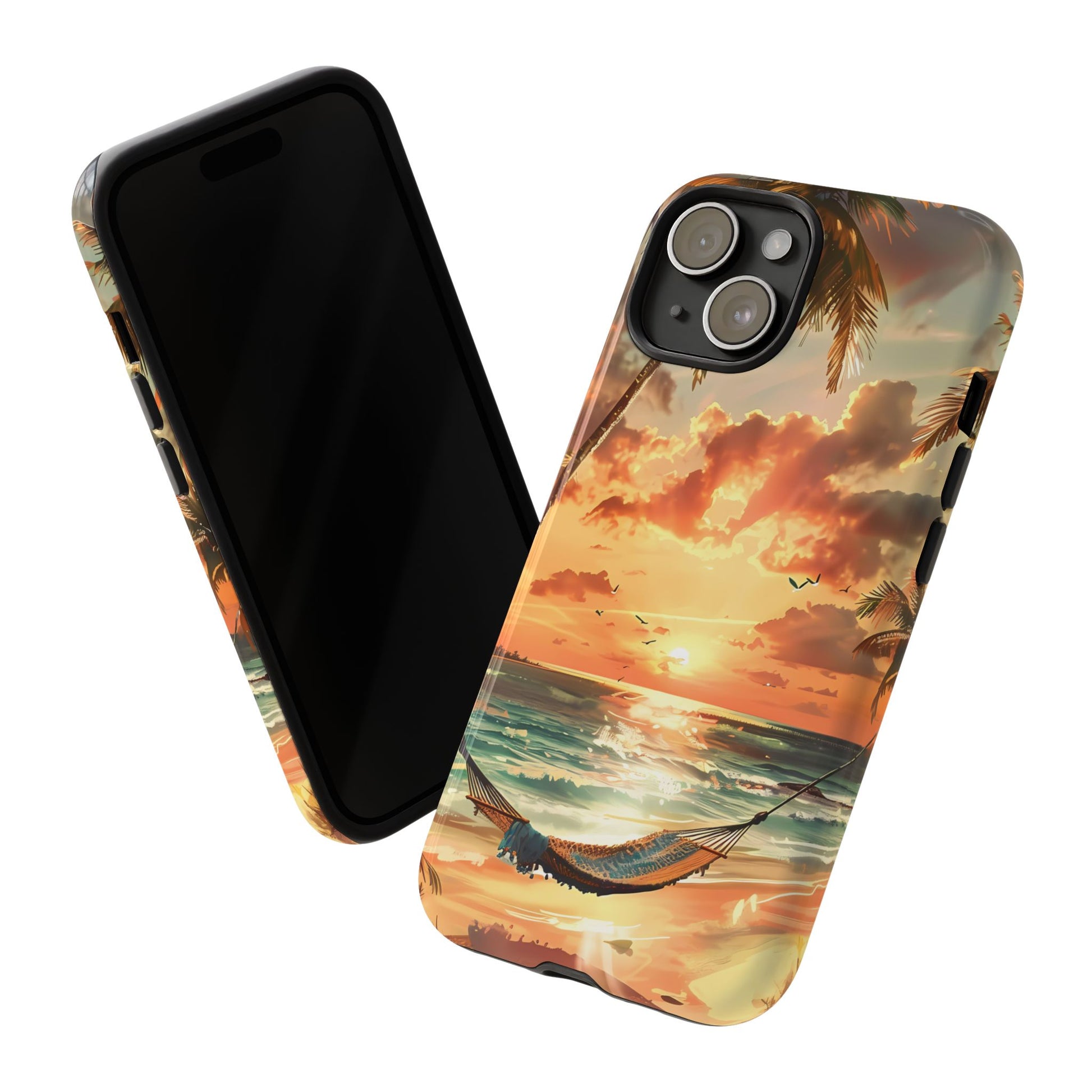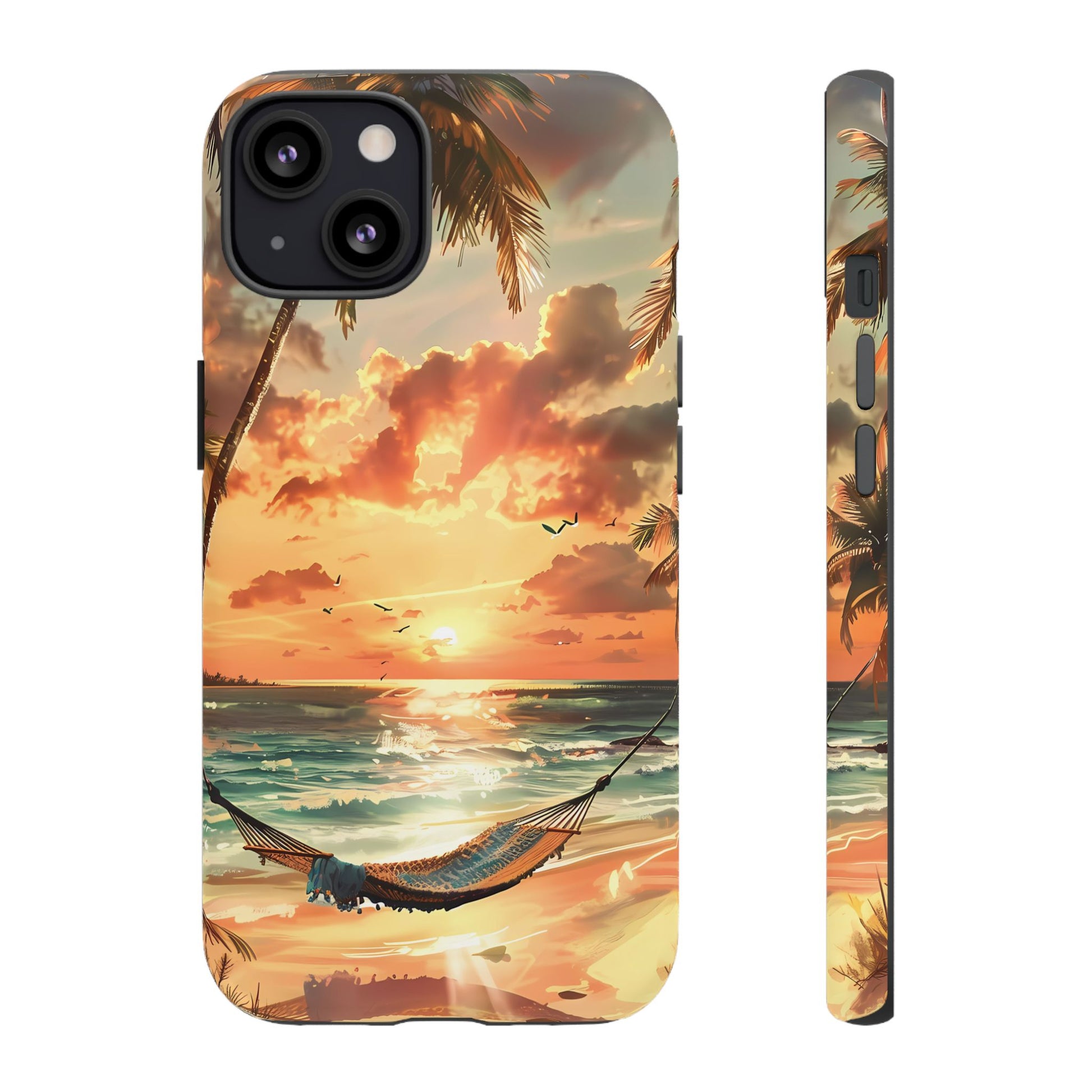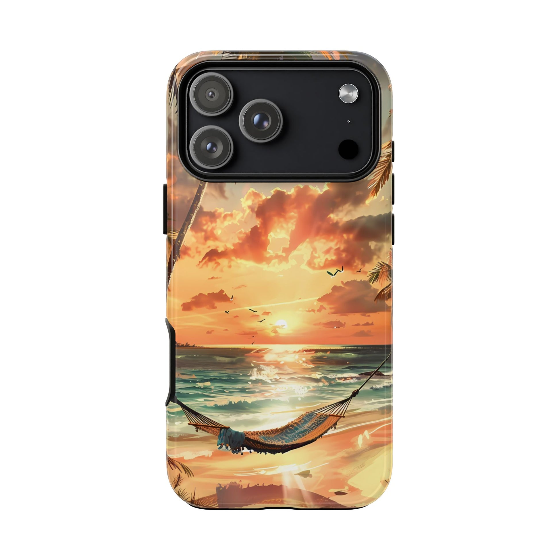 Experience the ultimate in relaxation with this stunning cell phone cover, featuring a watercolor scene of a tropical beach at sunset. The serene setting, with palm trees and a hammock swaying in the breeze, creates a calming and peaceful atmosphere, perfect for those who love the beach life.