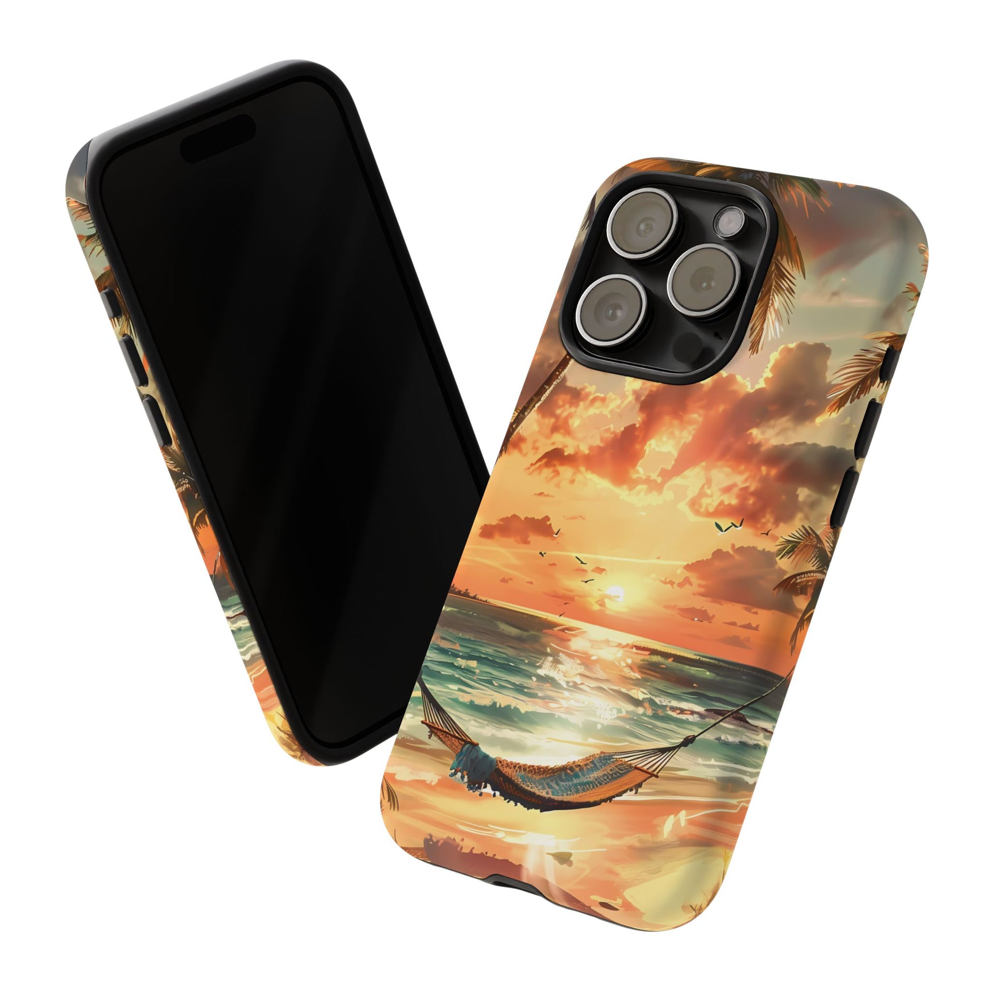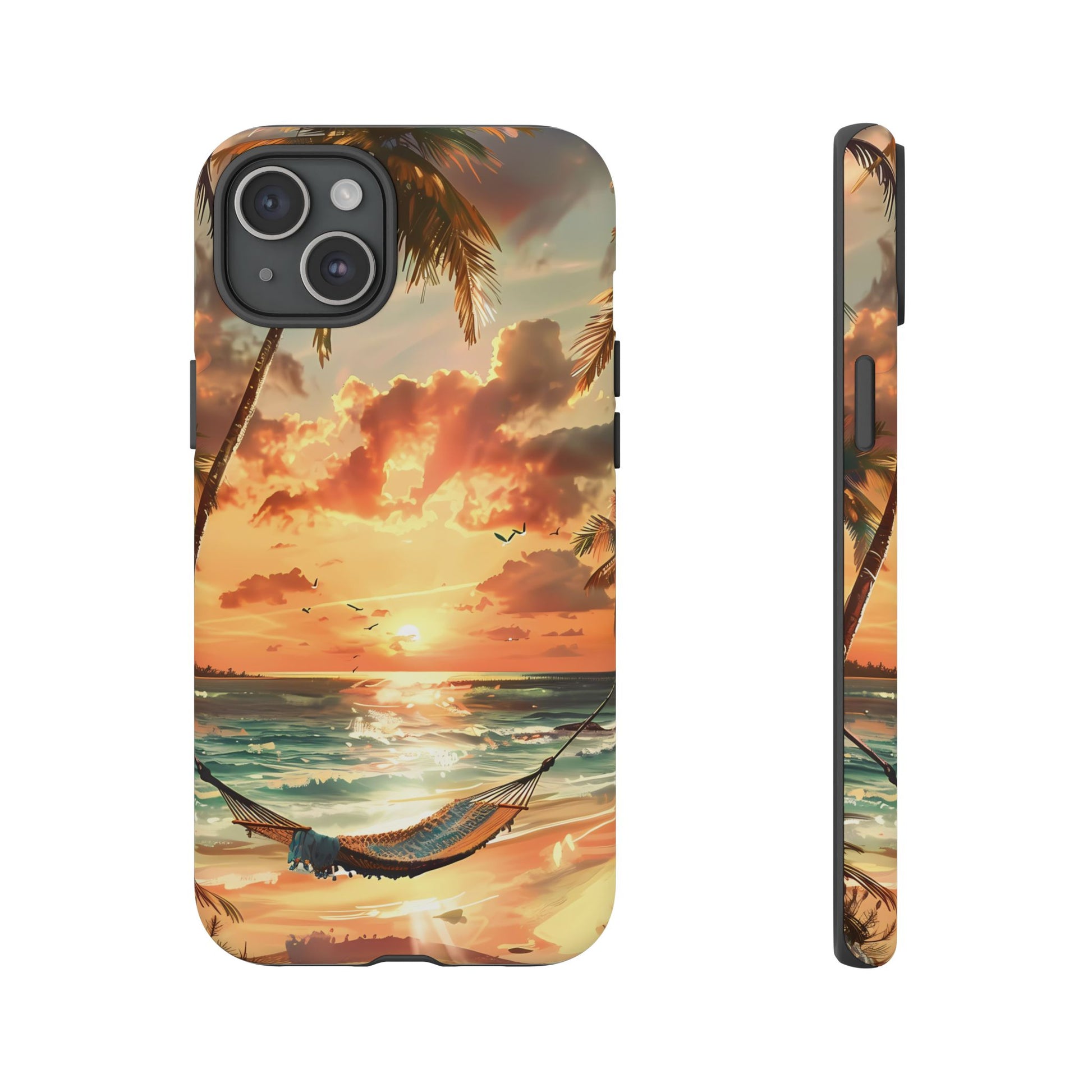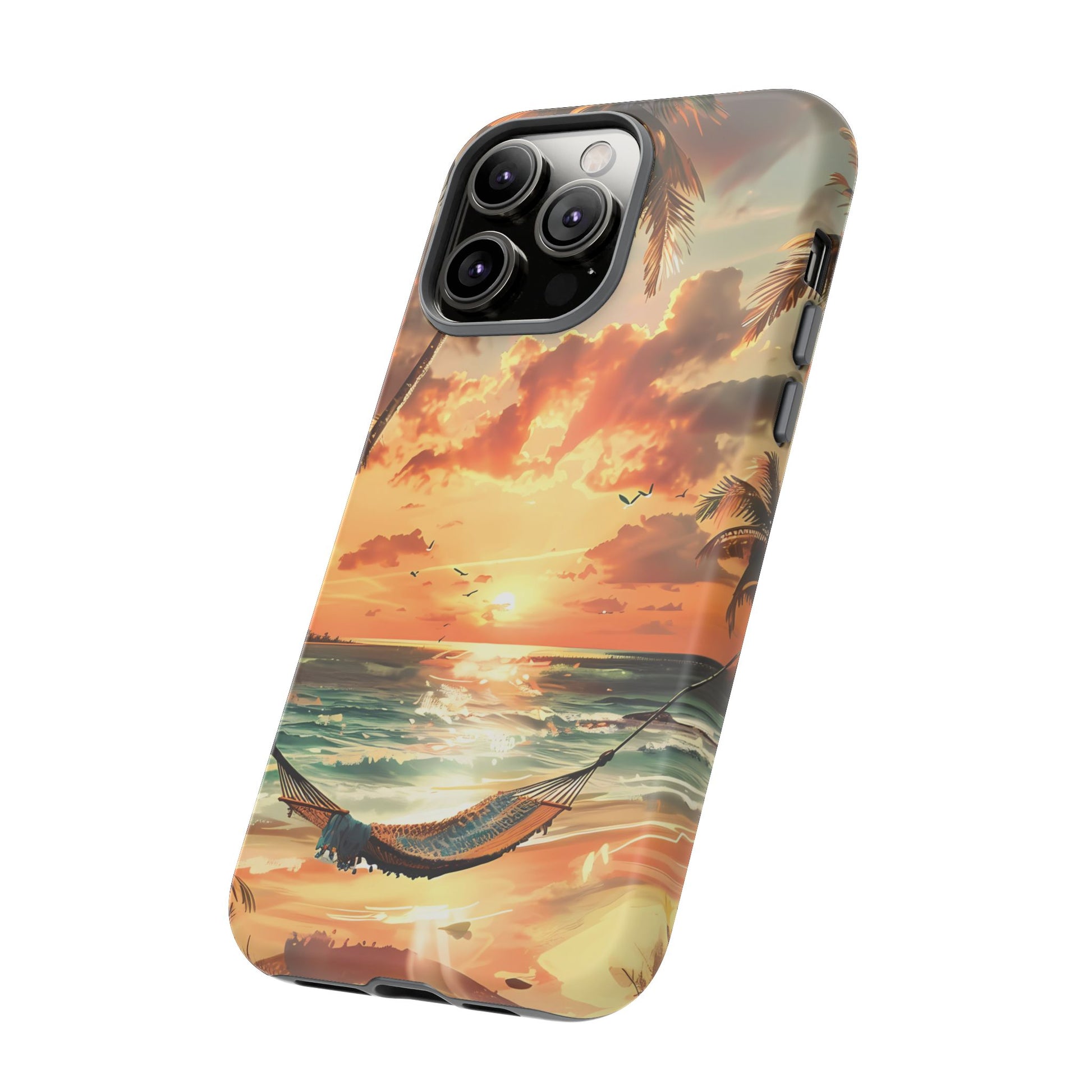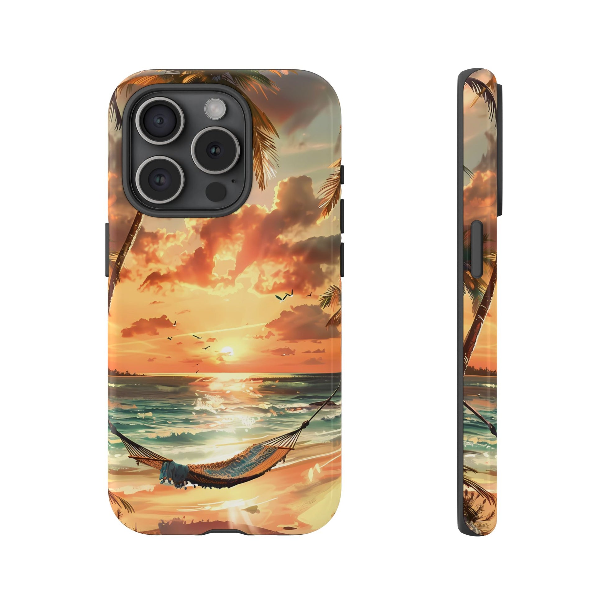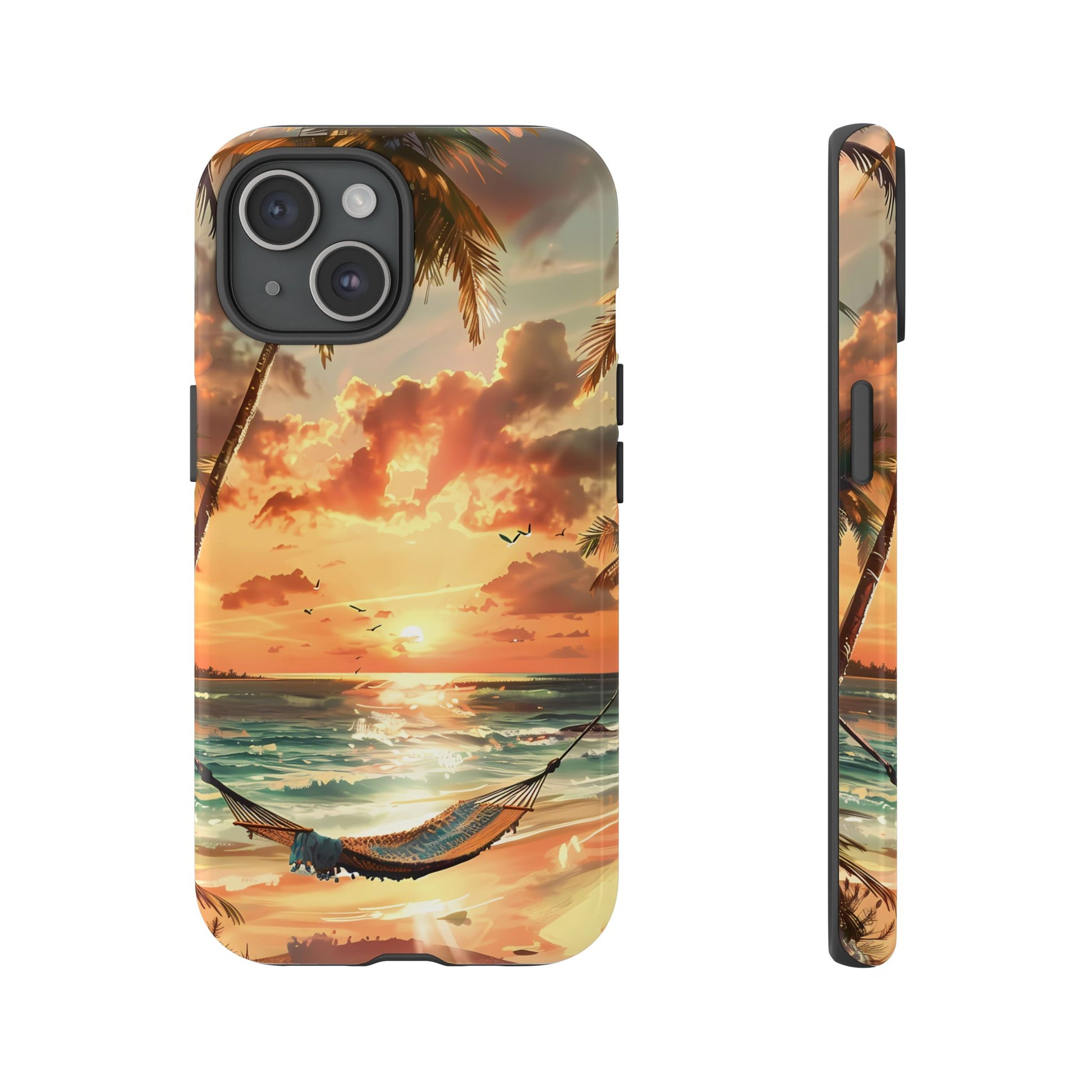 Experience the ultimate in relaxation with this stunning cell phone cover, featuring a watercolor scene of a tropical beach at sunset. The serene setting, with palm trees and a hammock swaying in the breeze, creates a calming and peaceful atmosphere, perfect for those who love the beach life.