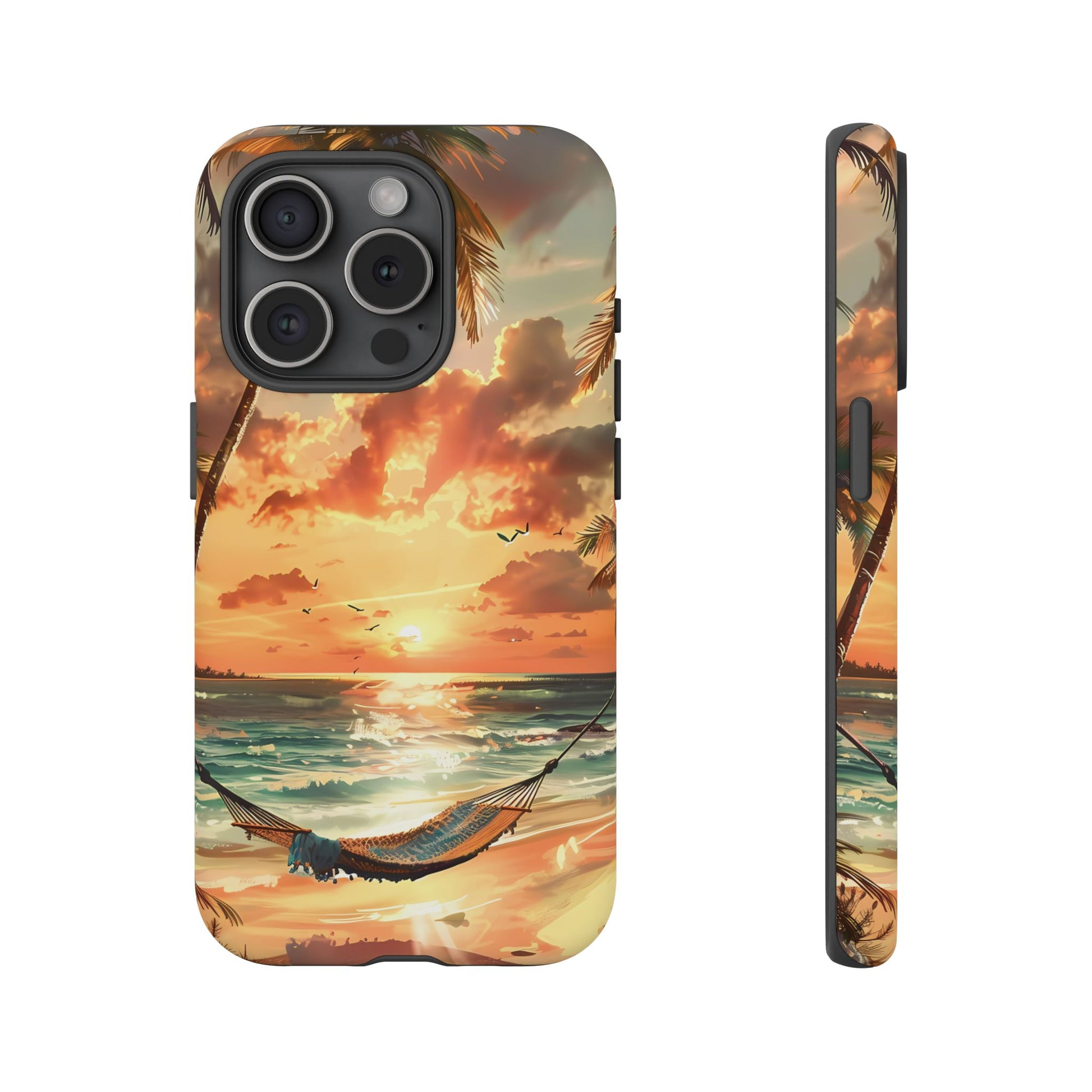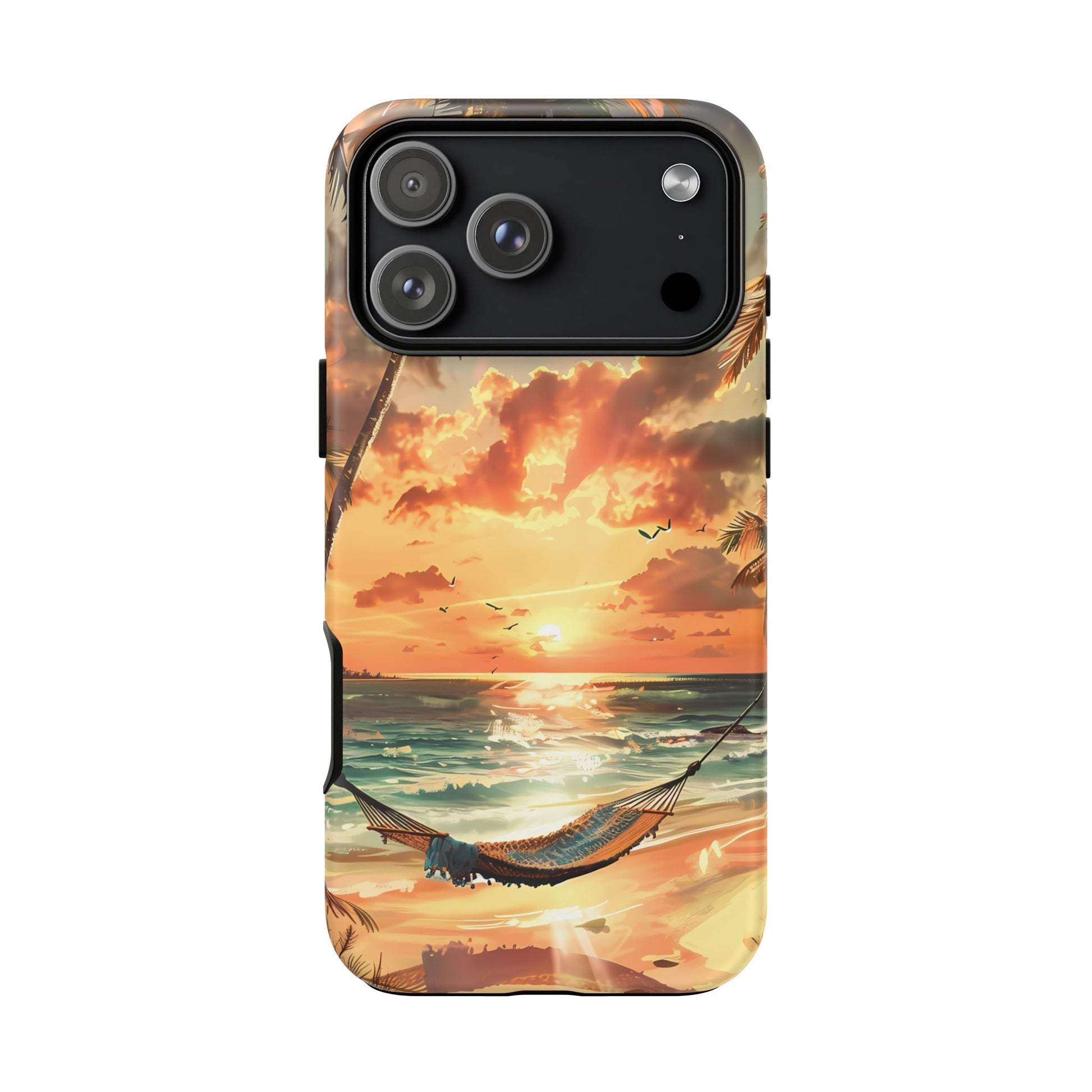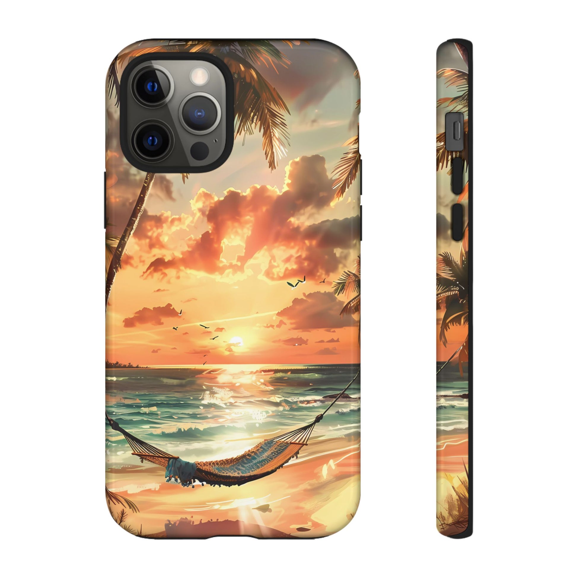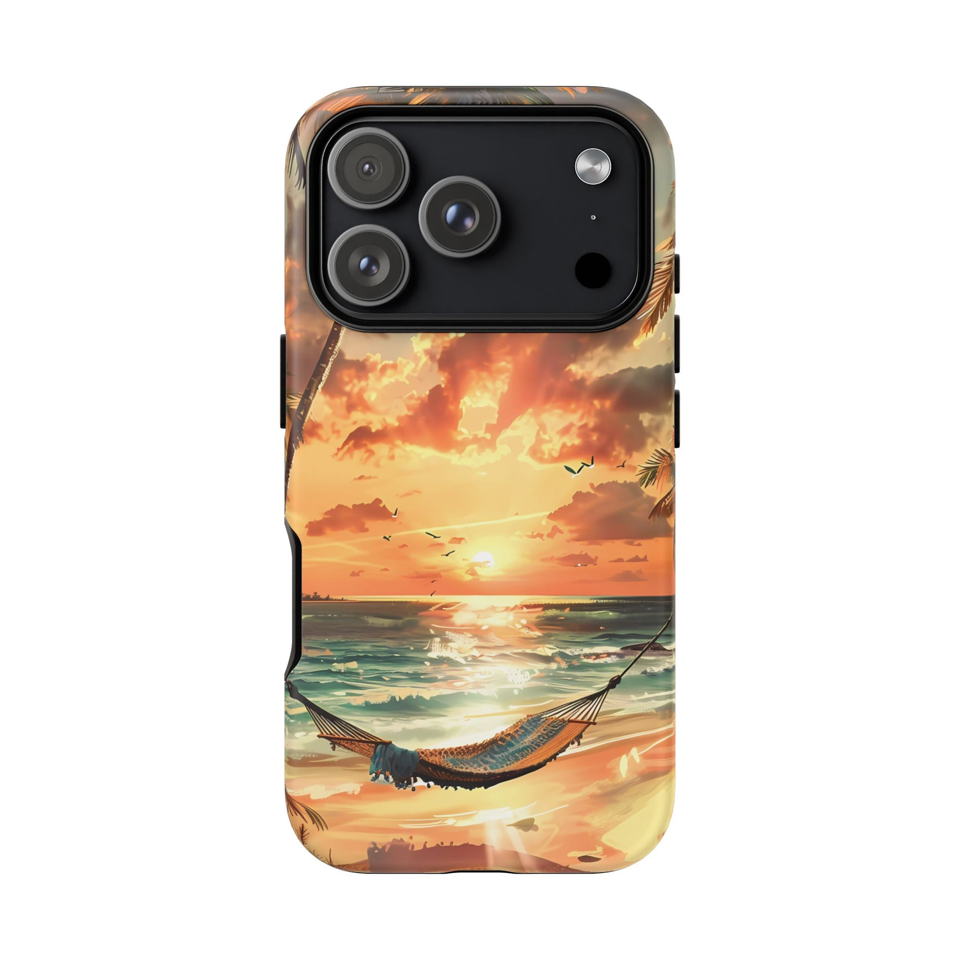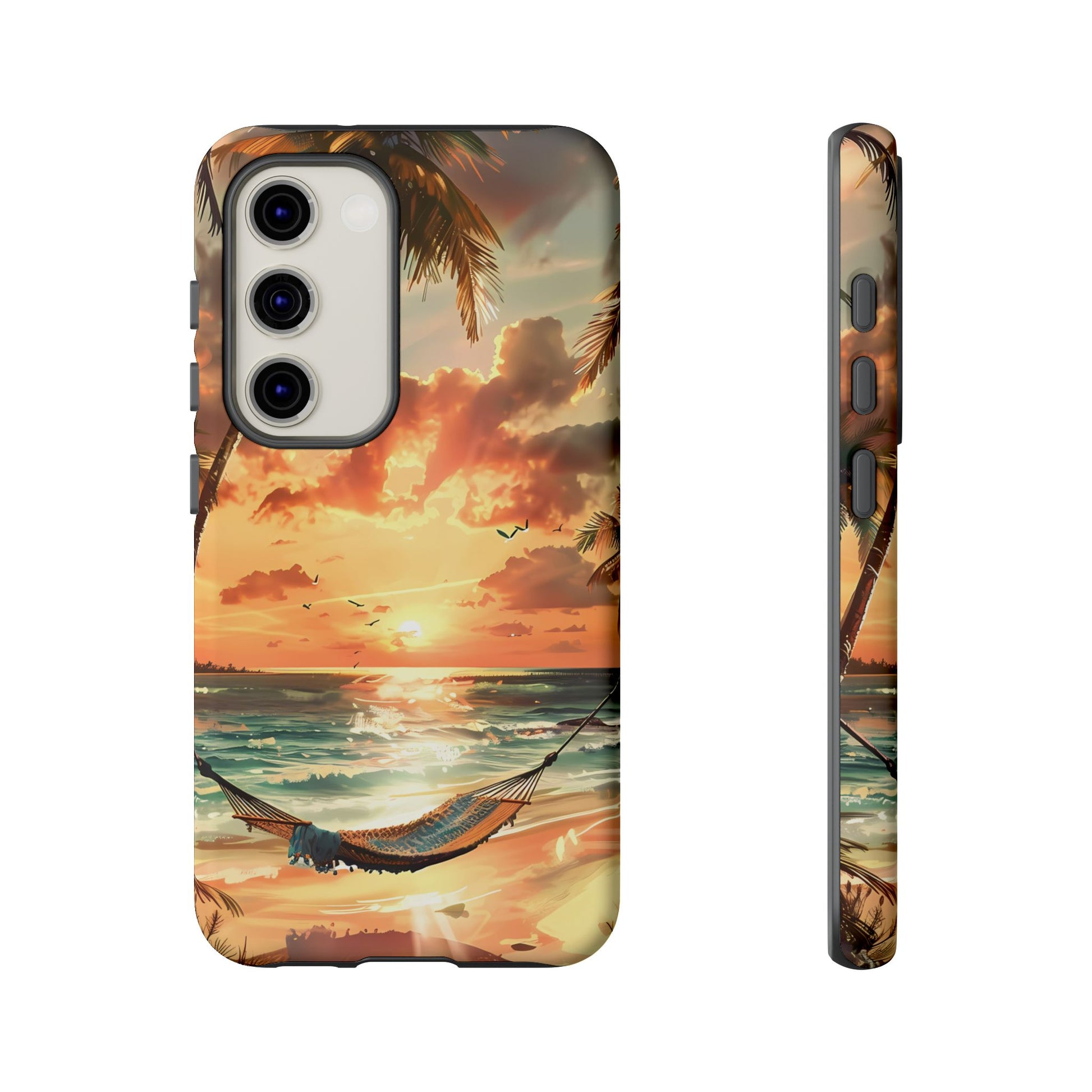 Experience the ultimate in relaxation with this stunning cell phone cover, featuring a watercolor scene of a tropical beach at sunset. The serene setting, with palm trees and a hammock swaying in the breeze, creates a calming and peaceful atmosphere, perfect for those who love the beach life.