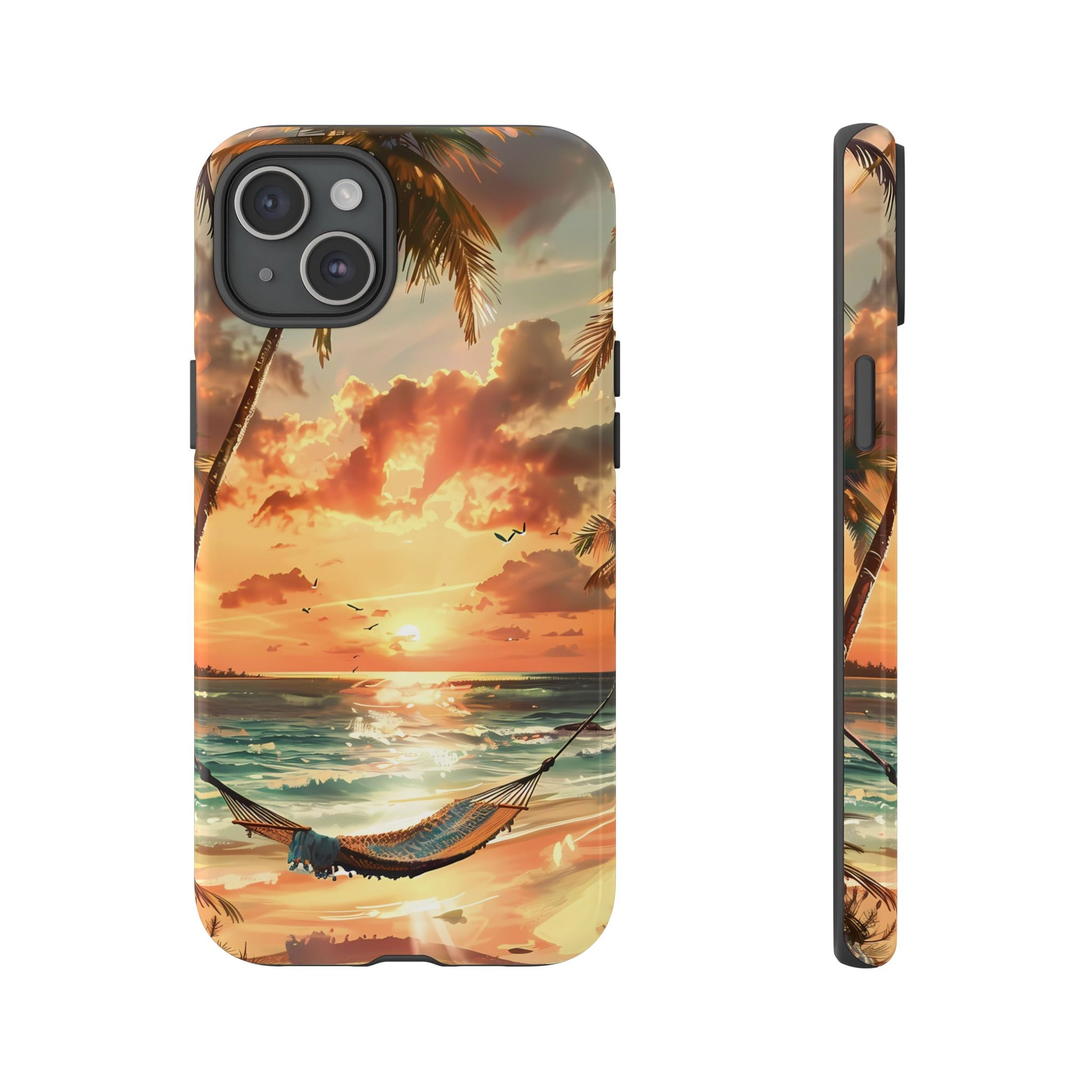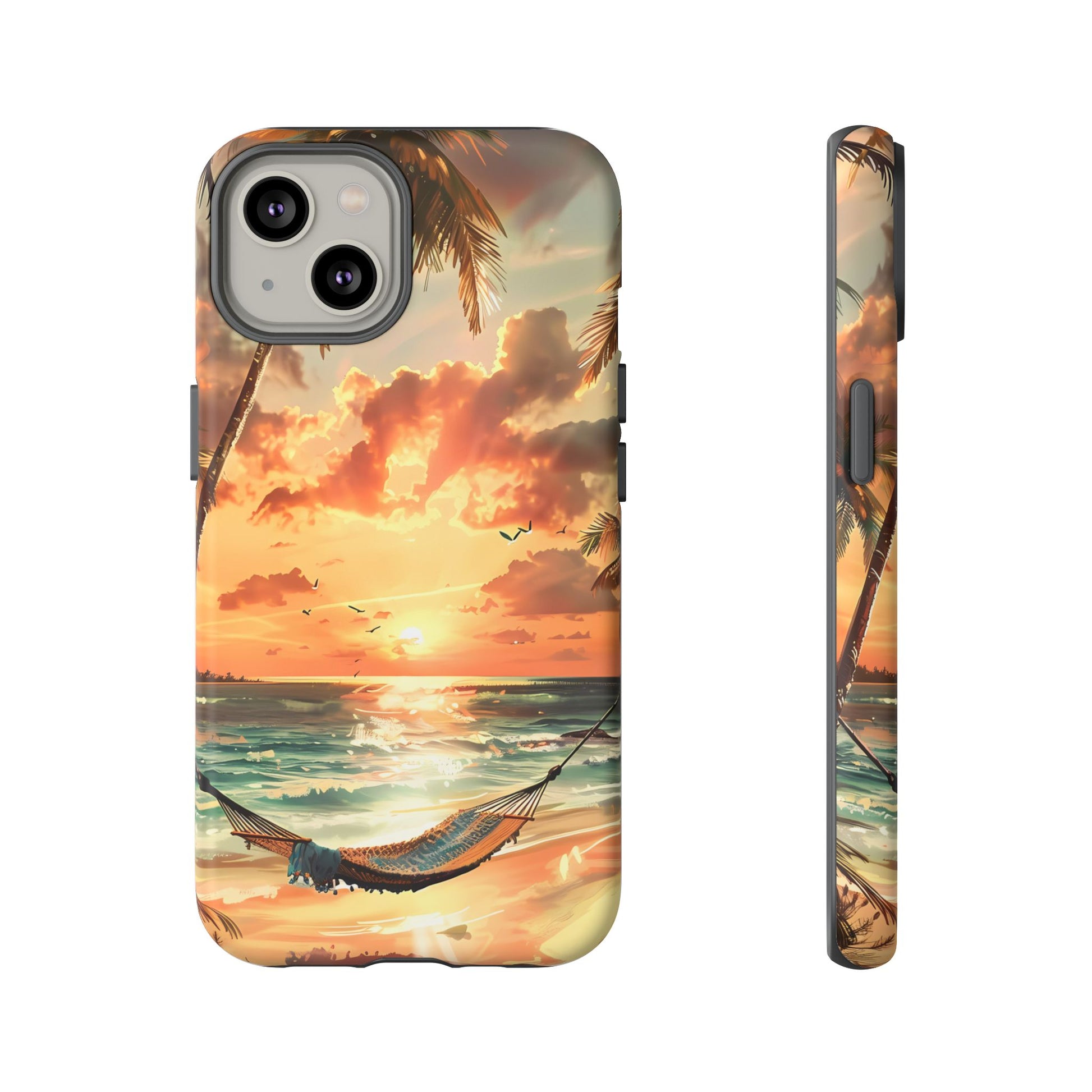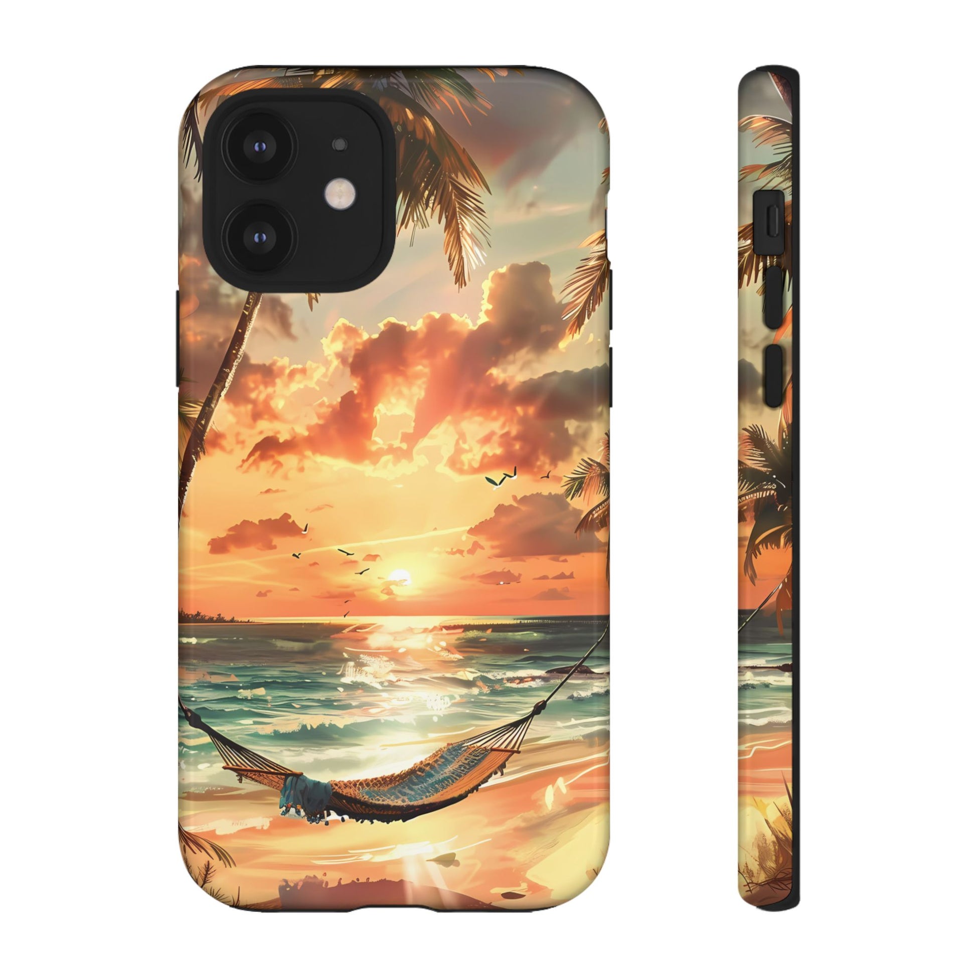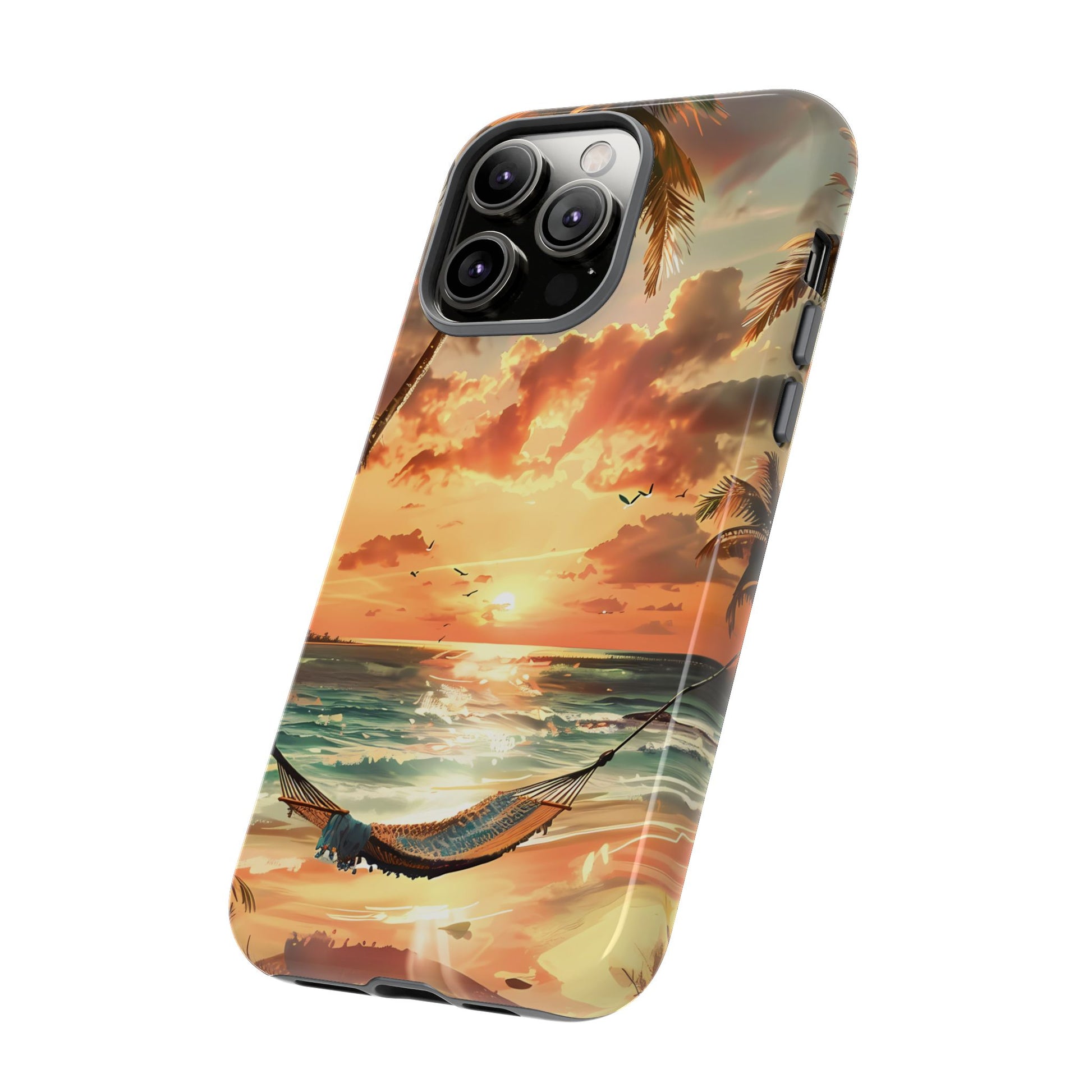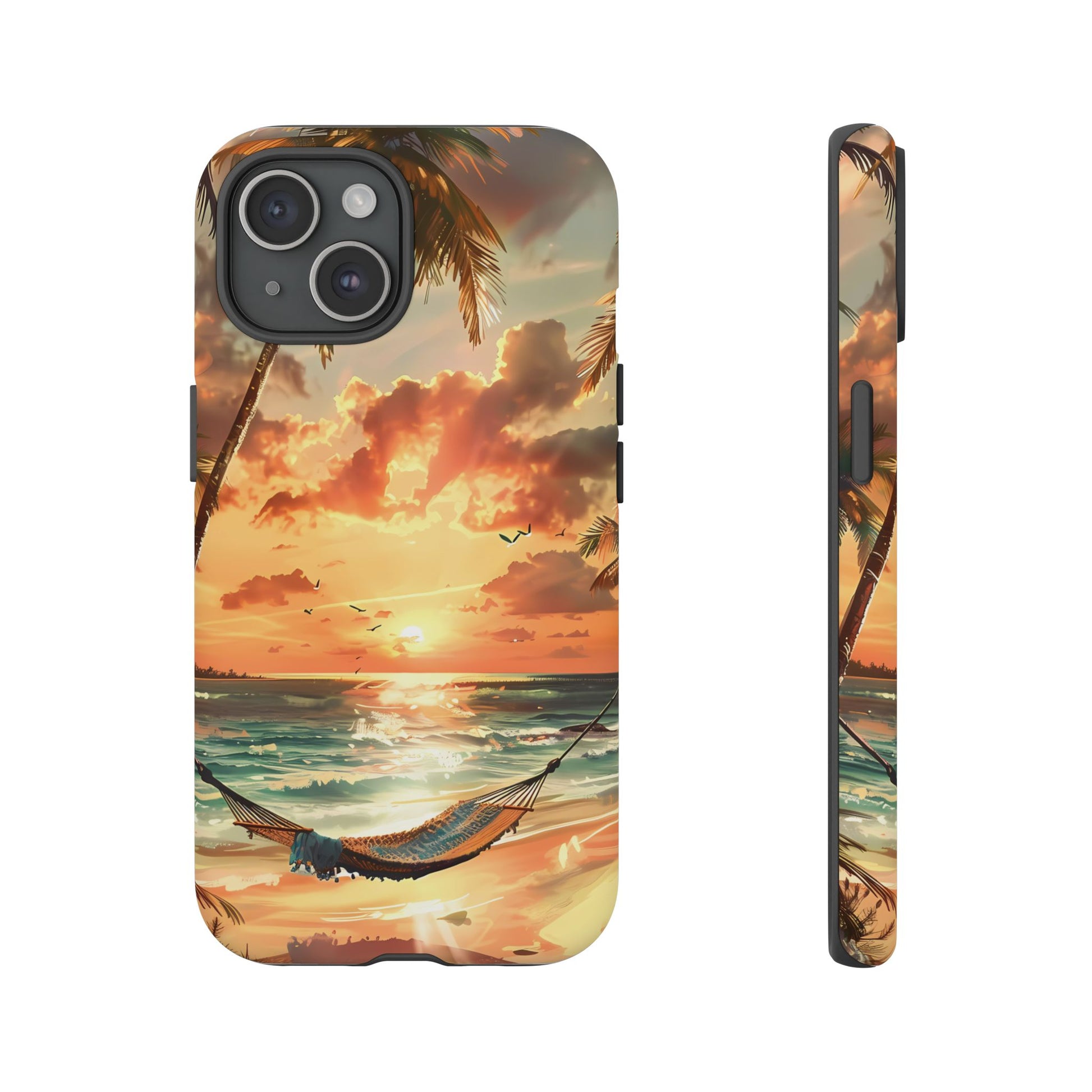 Experience the ultimate in relaxation with this stunning cell phone cover, featuring a watercolor scene of a tropical beach at sunset. The serene setting, with palm trees and a hammock swaying in the breeze, creates a calming and peaceful atmosphere, perfect for those who love the beach life.