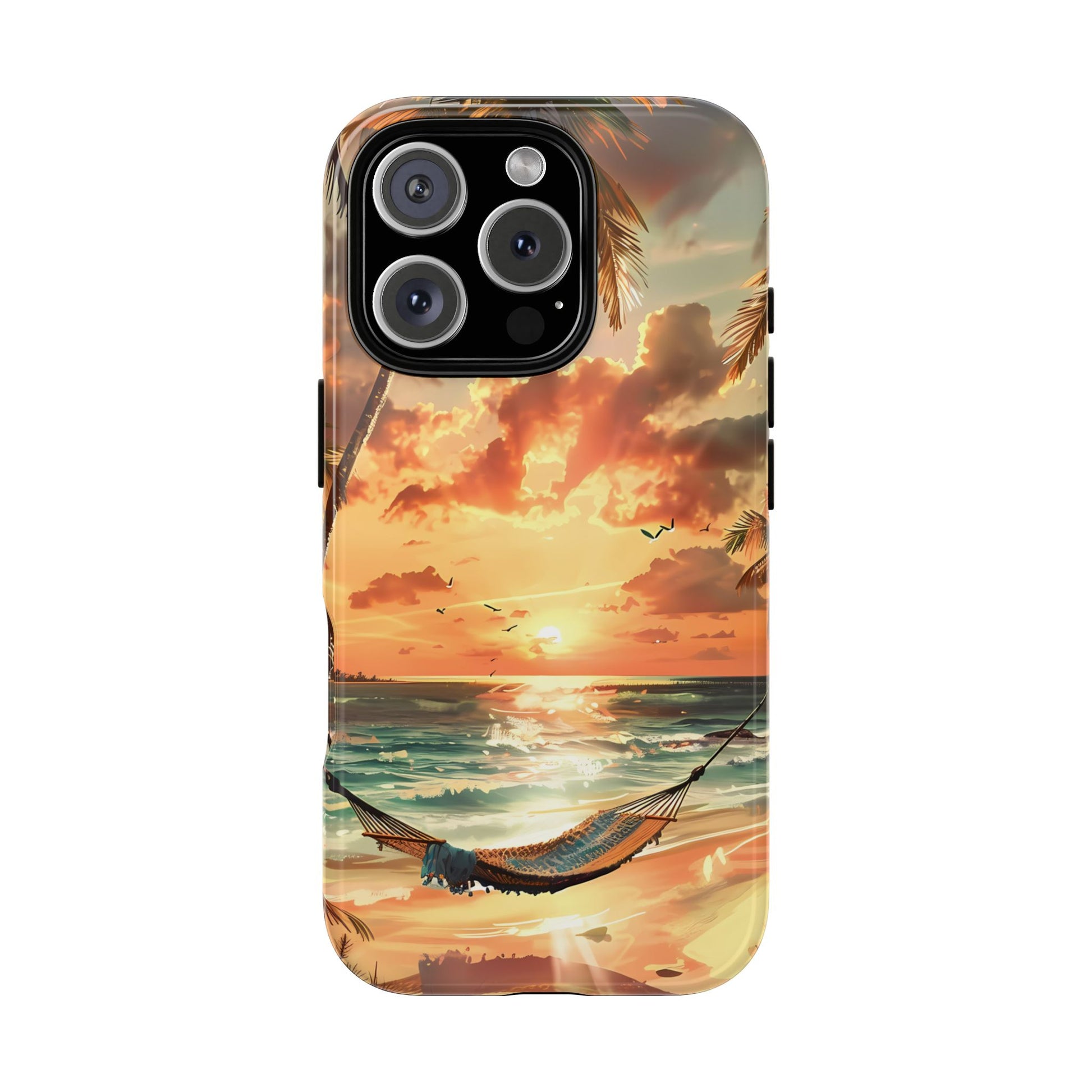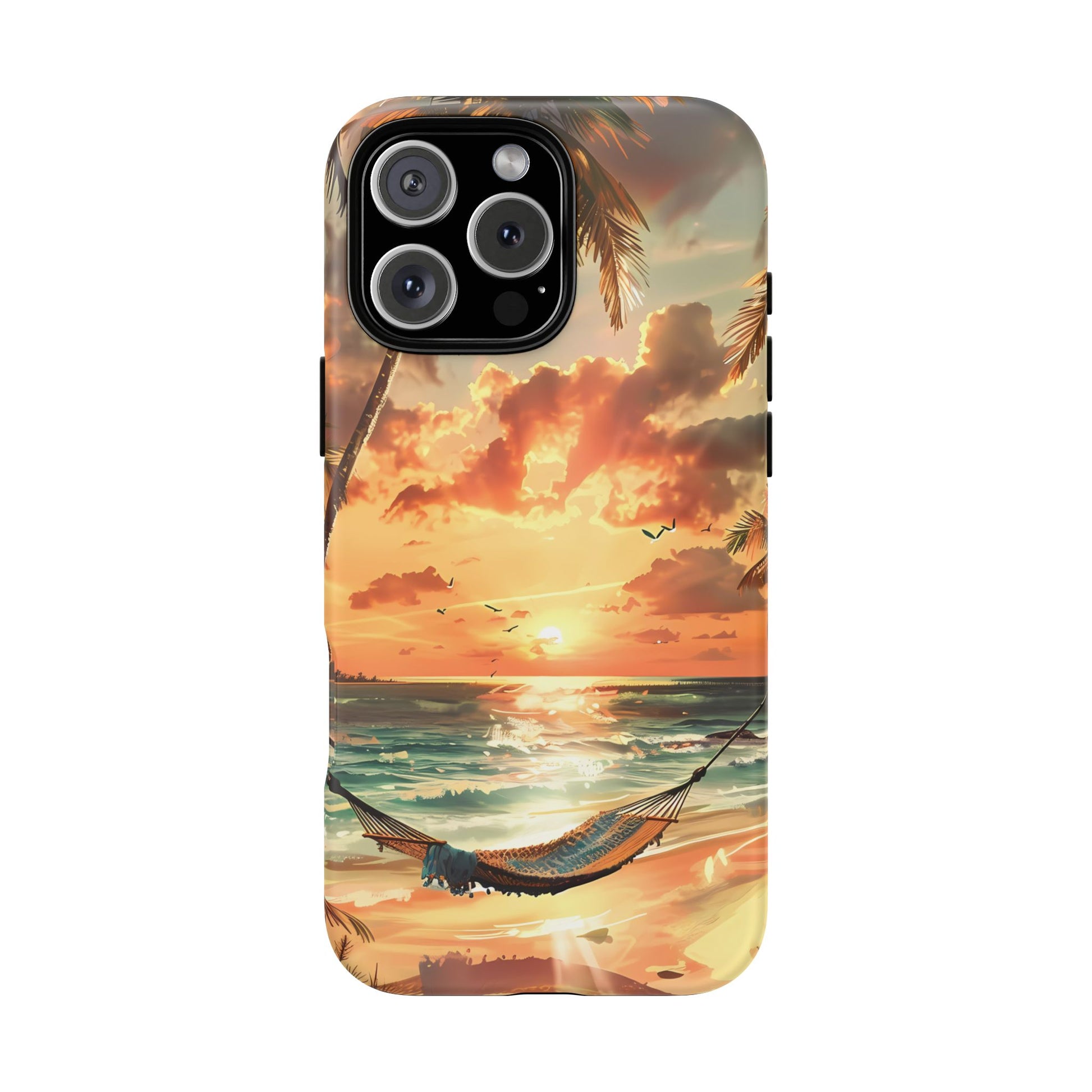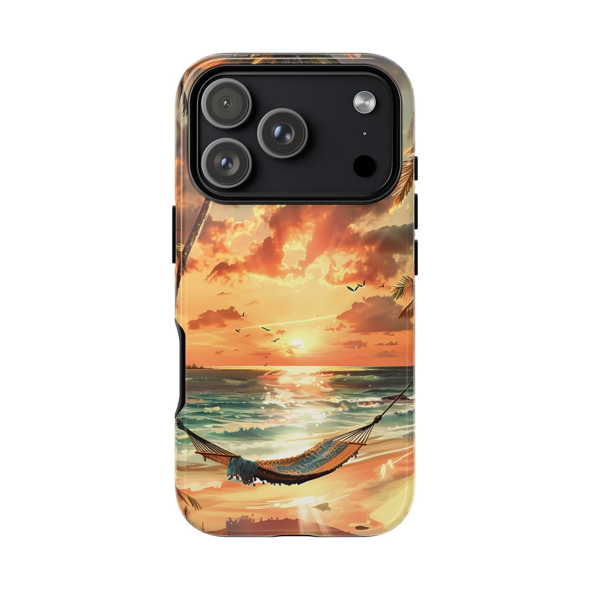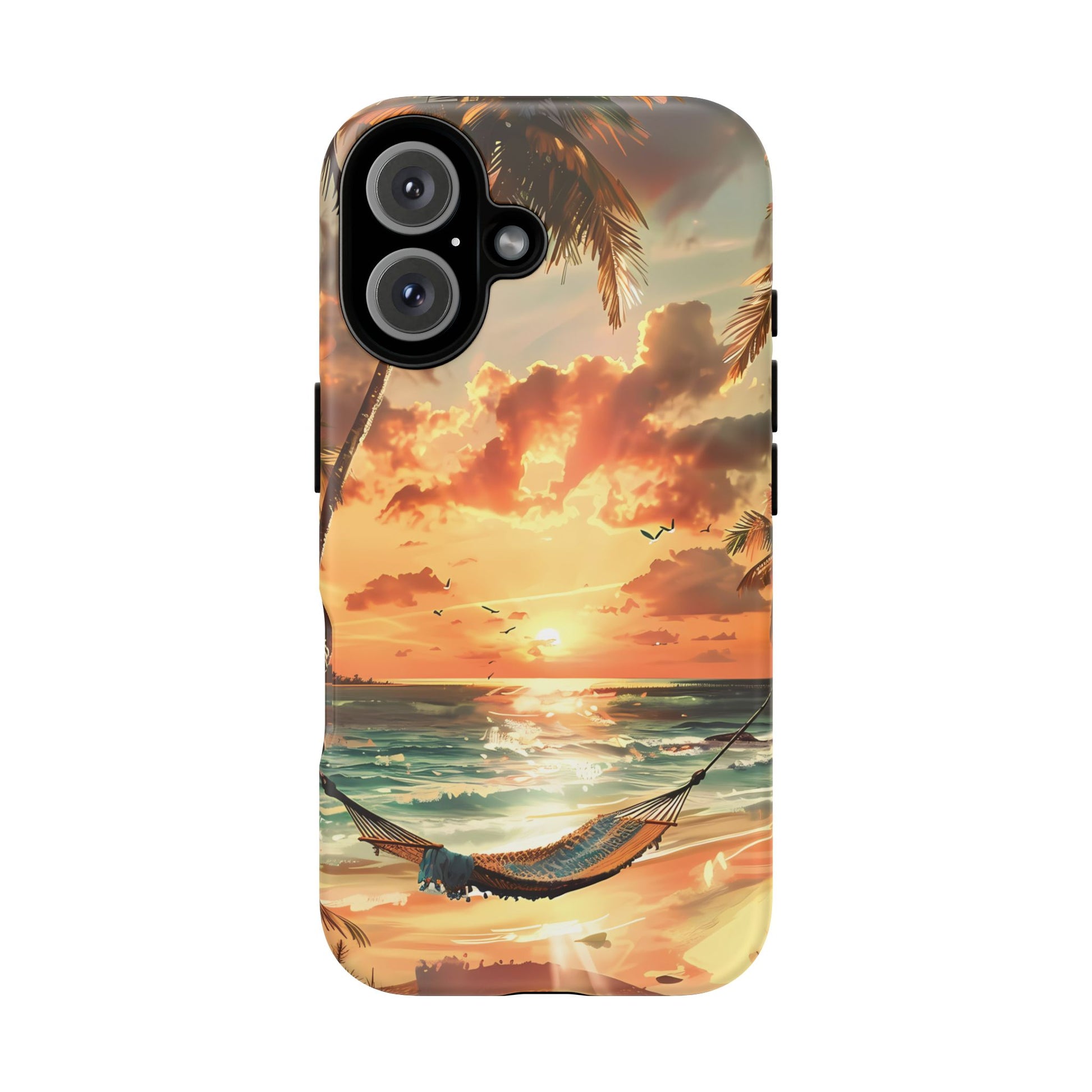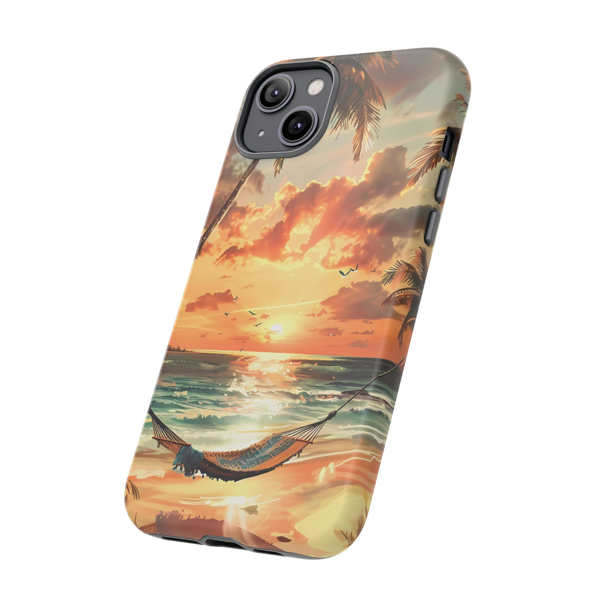 Experience the ultimate in relaxation with this stunning cell phone cover, featuring a watercolor scene of a tropical beach at sunset. The serene setting, with palm trees and a hammock swaying in the breeze, creates a calming and peaceful atmosphere, perfect for those who love the beach life.