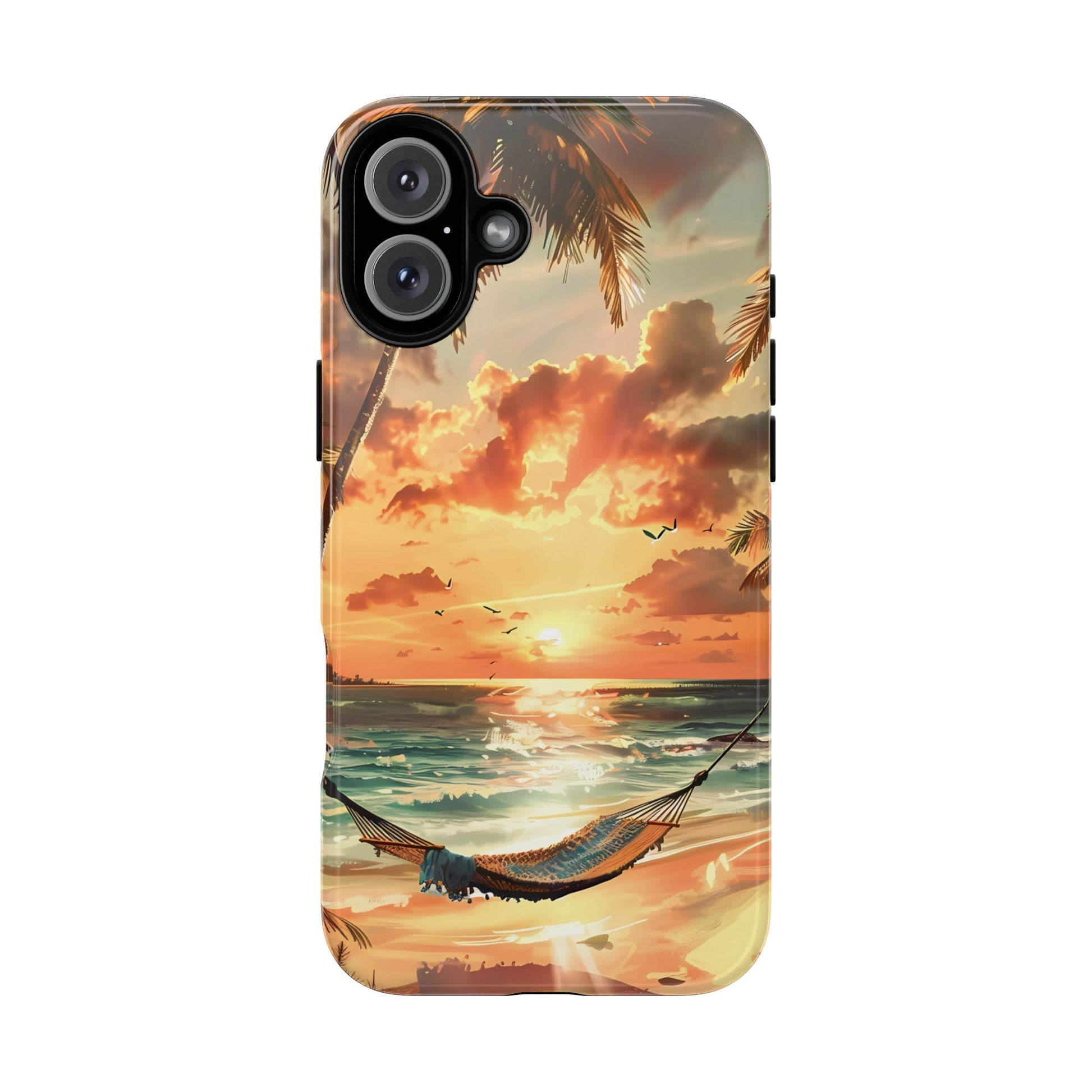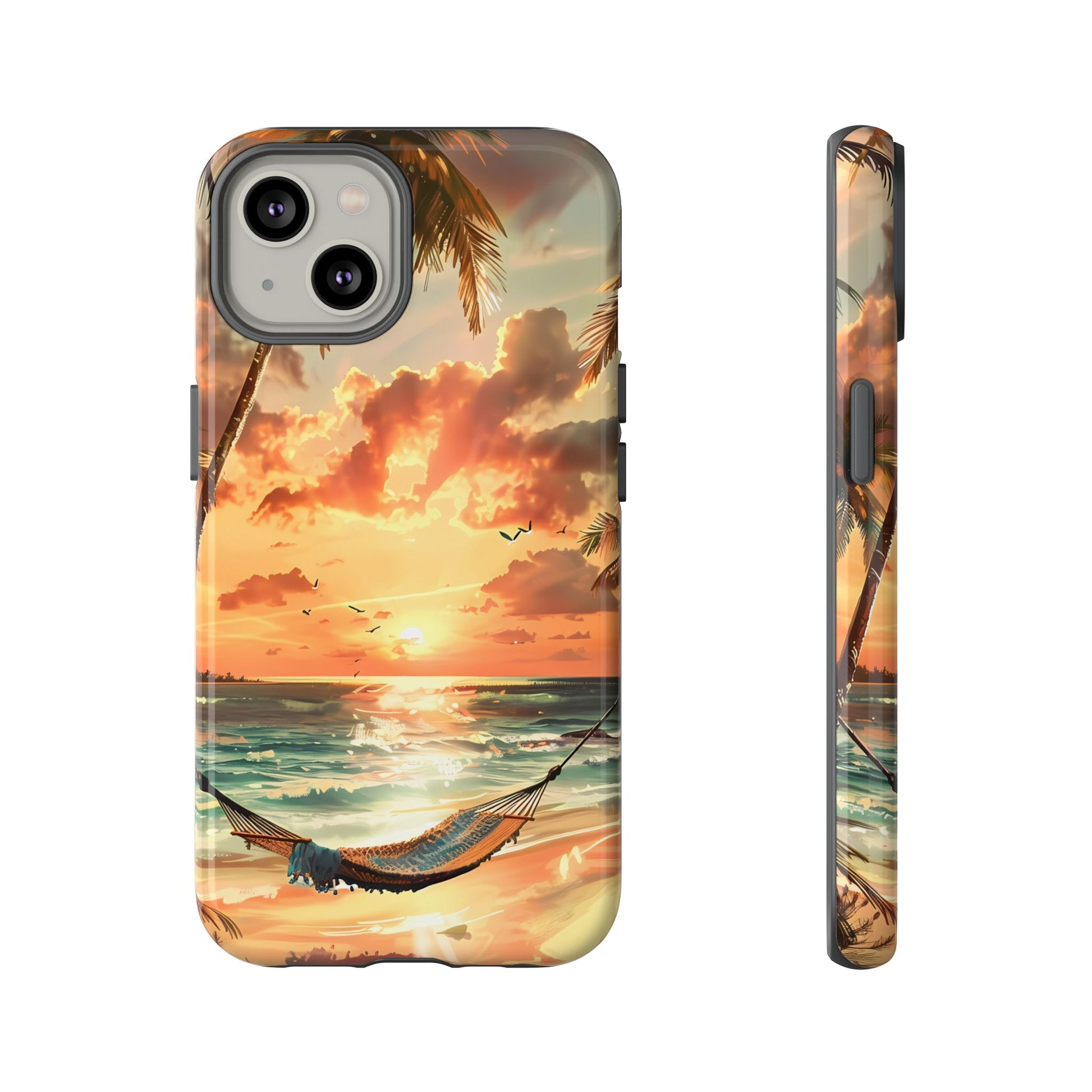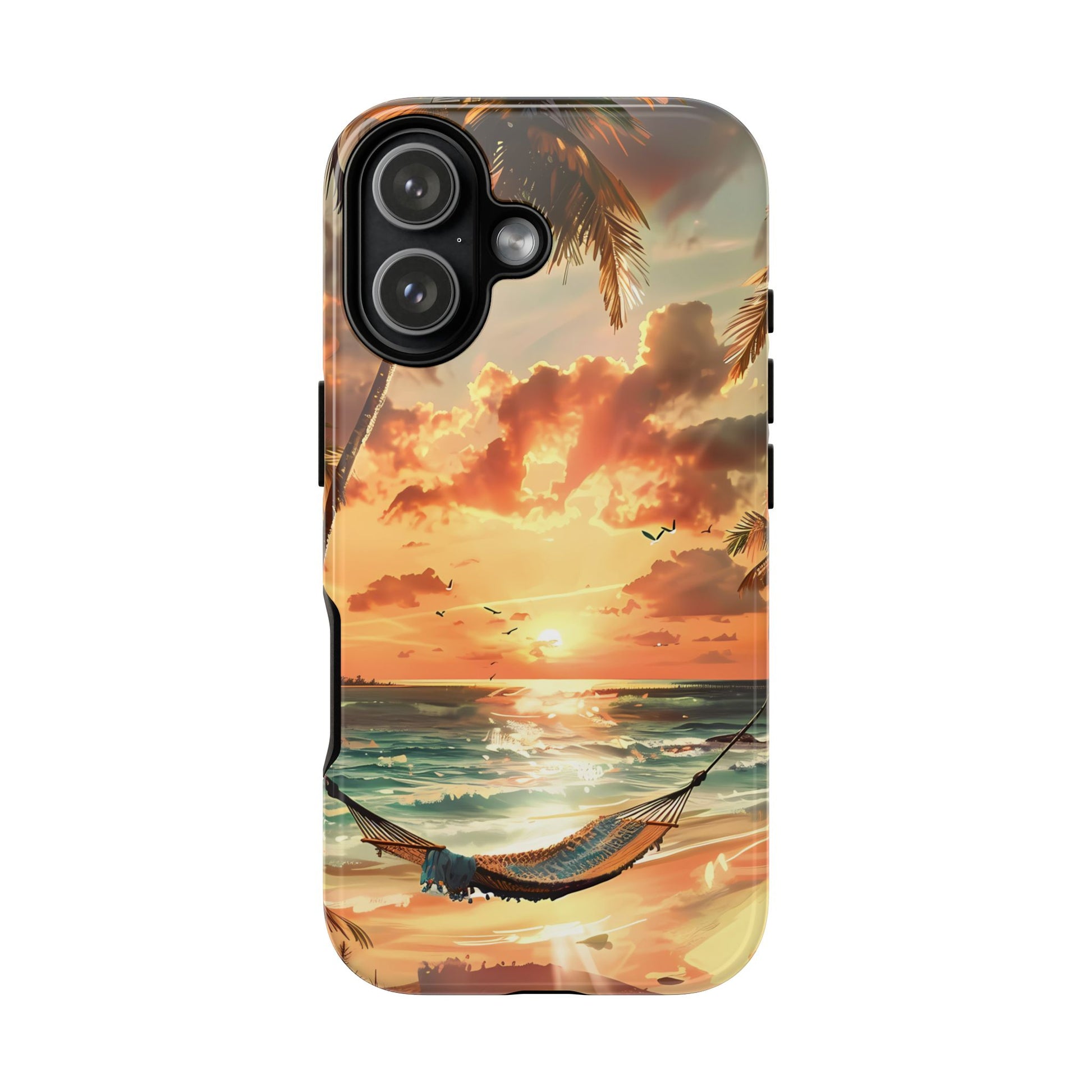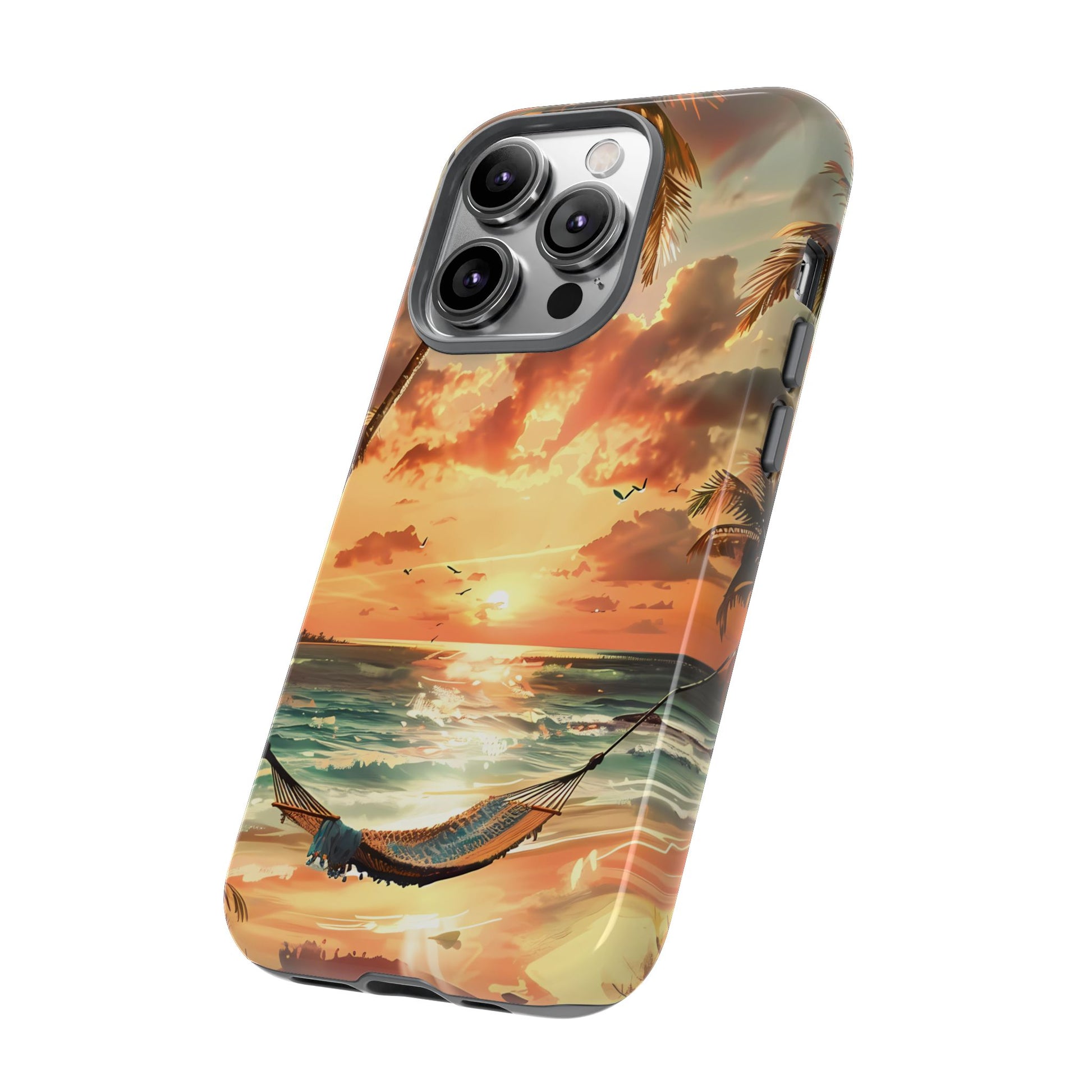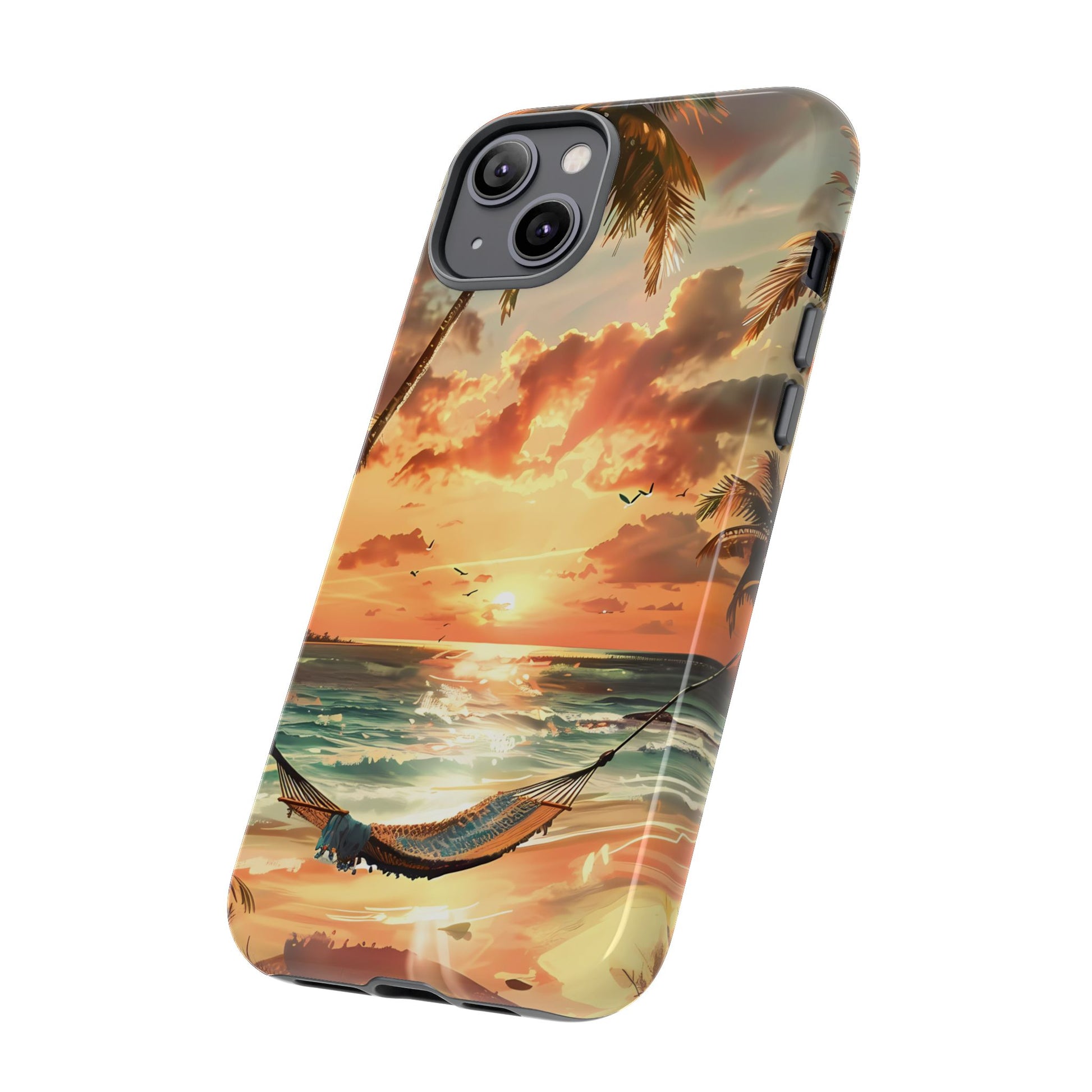 Experience the ultimate in relaxation with this stunning cell phone cover, featuring a watercolor scene of a tropical beach at sunset. The serene setting, with palm trees and a hammock swaying in the breeze, creates a calming and peaceful atmosphere, perfect for those who love the beach life.