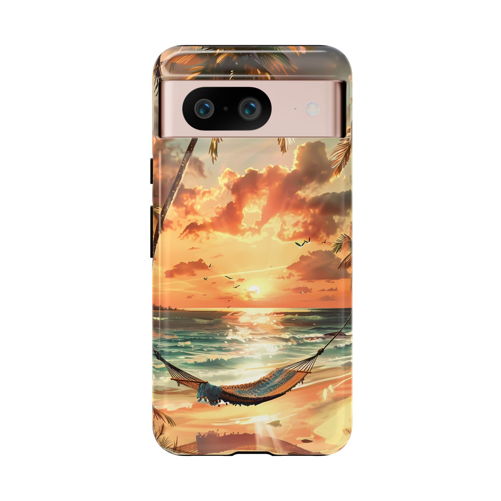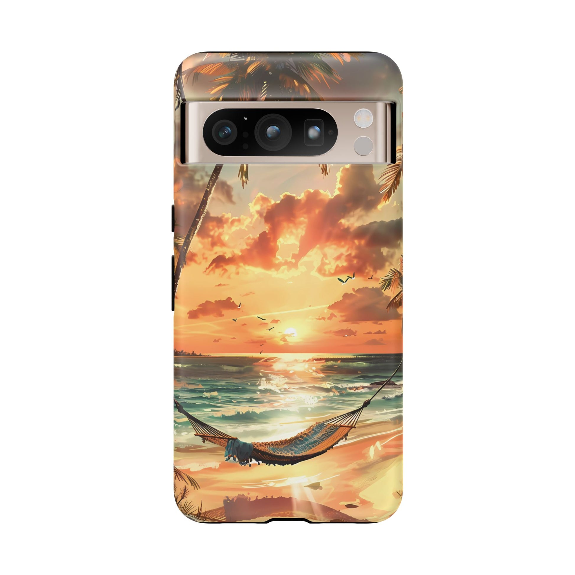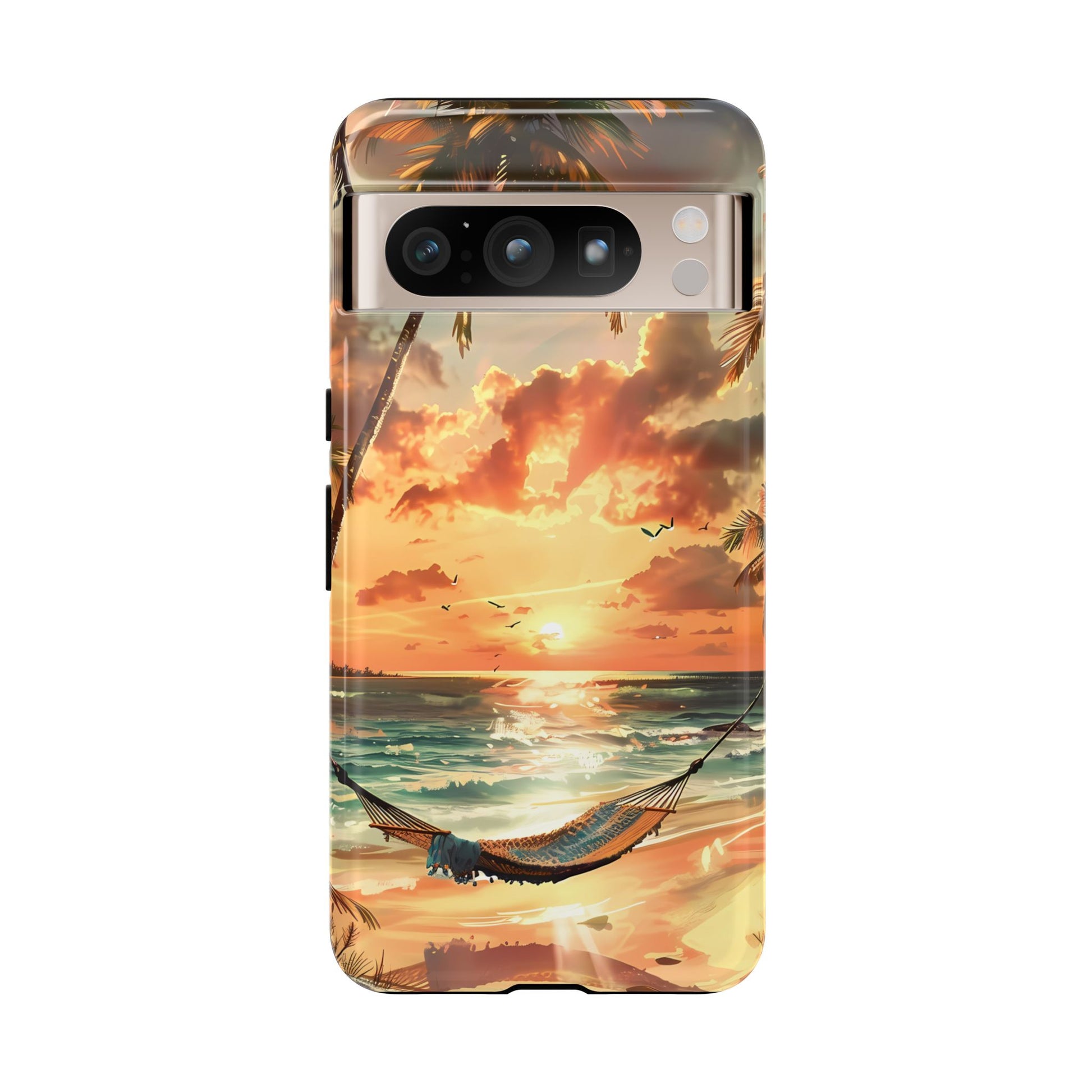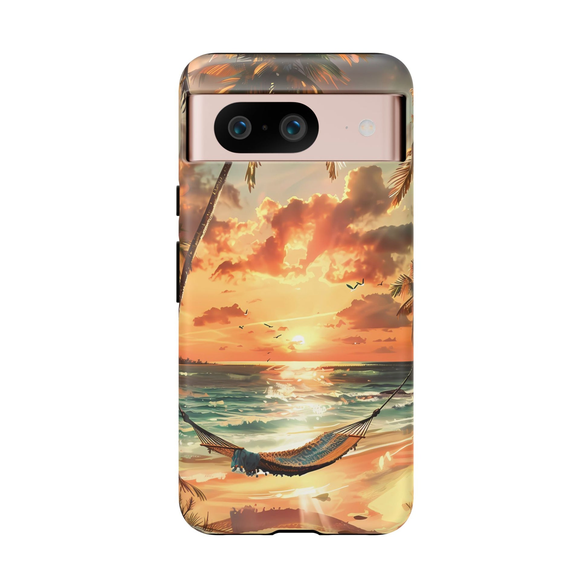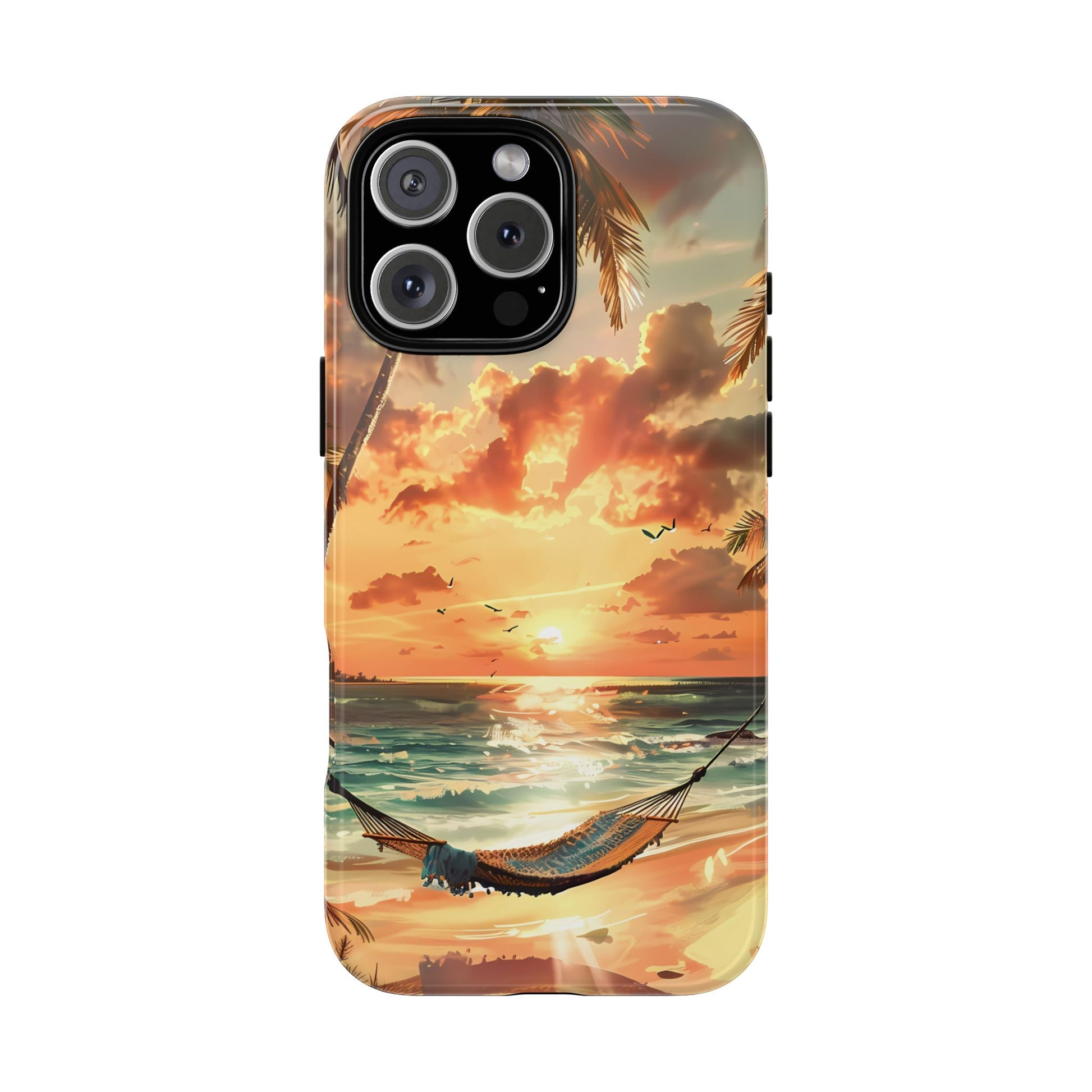 Experience the ultimate in relaxation with this stunning cell phone cover, featuring a watercolor scene of a tropical beach at sunset. The serene setting, with palm trees and a hammock swaying in the breeze, creates a calming and peaceful atmosphere, perfect for those who love the beach life.