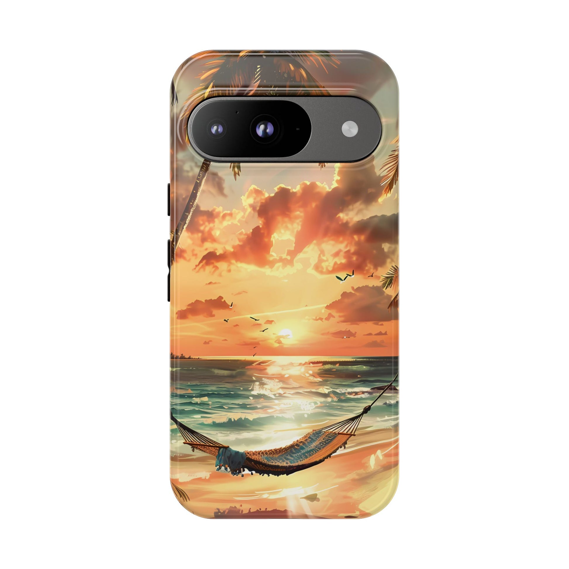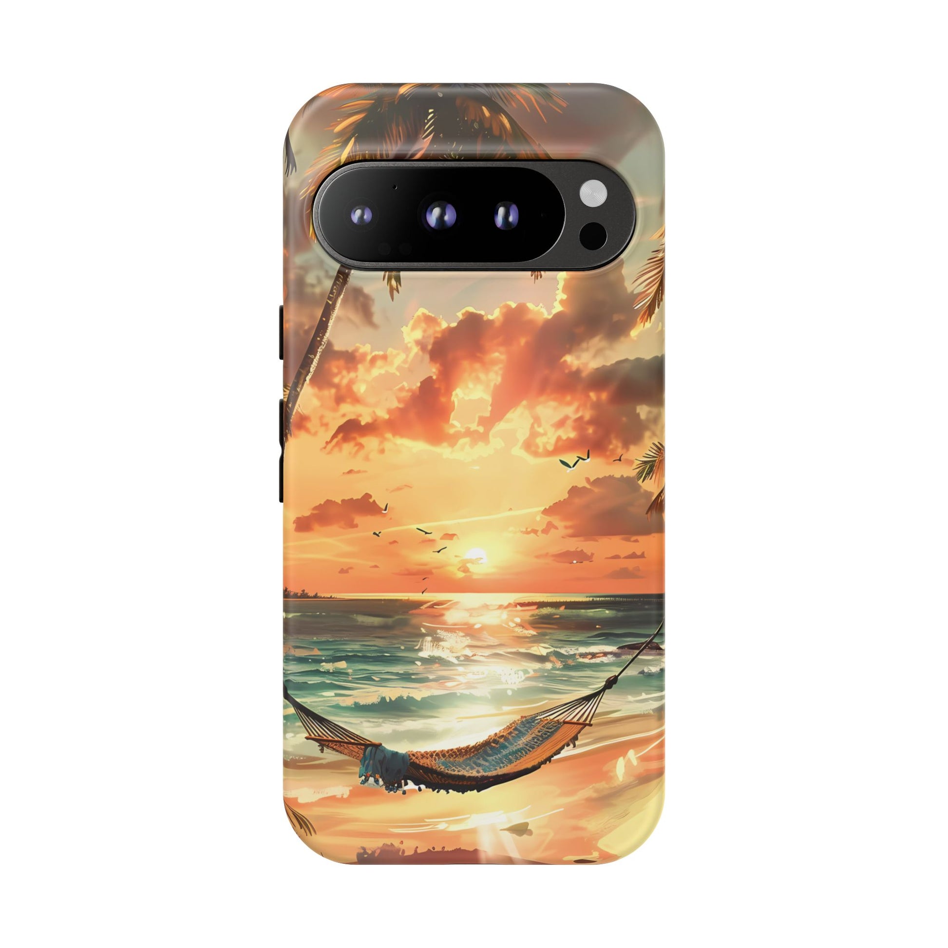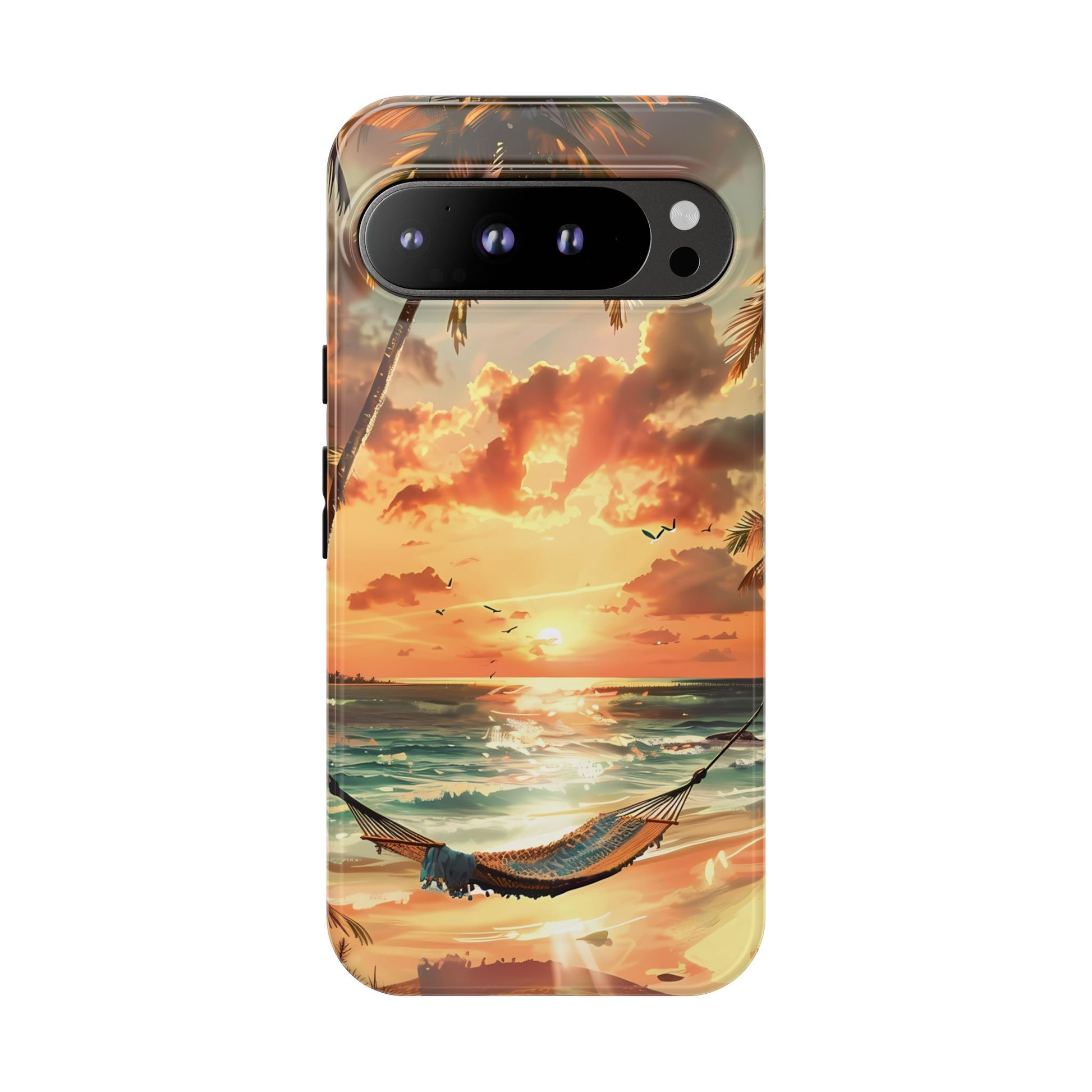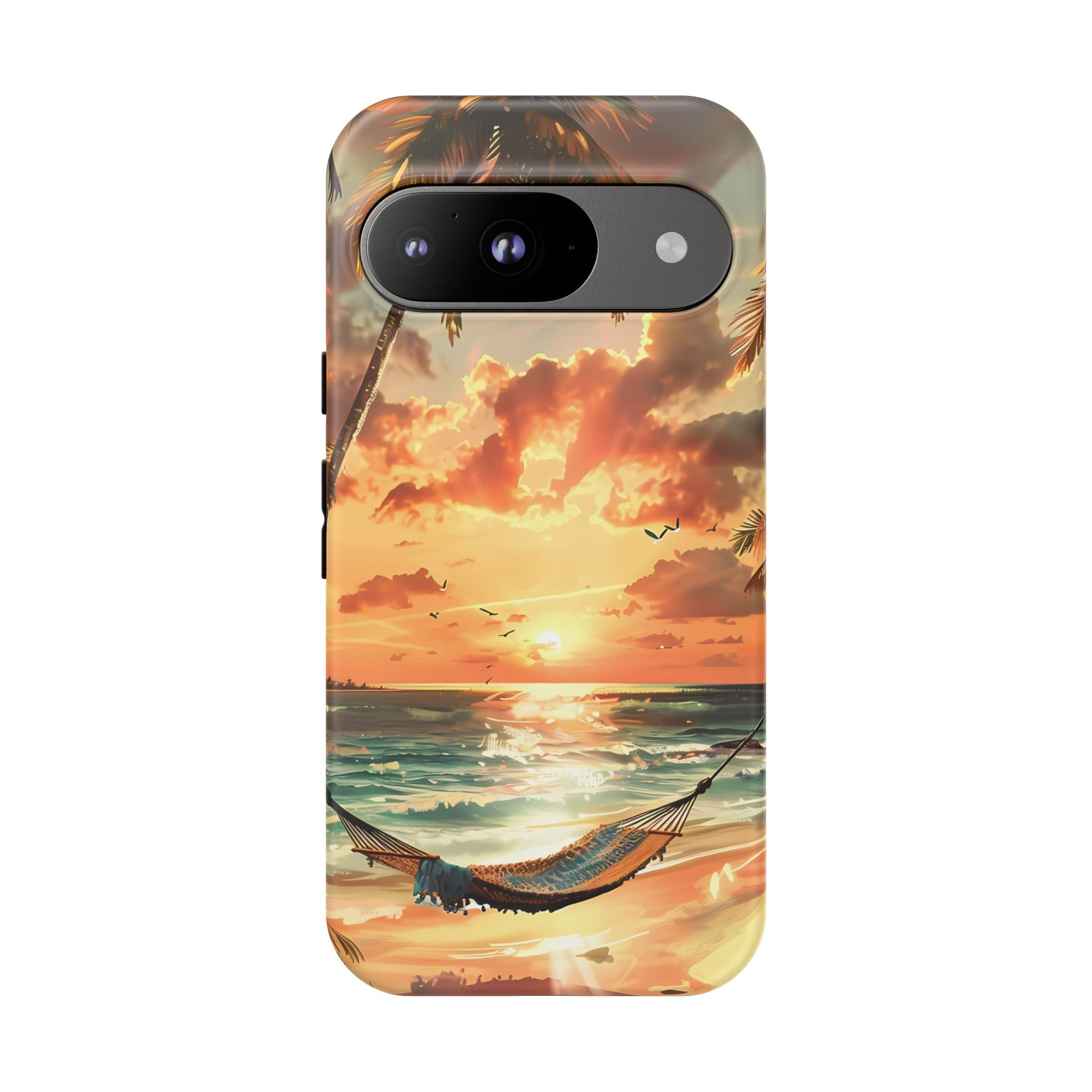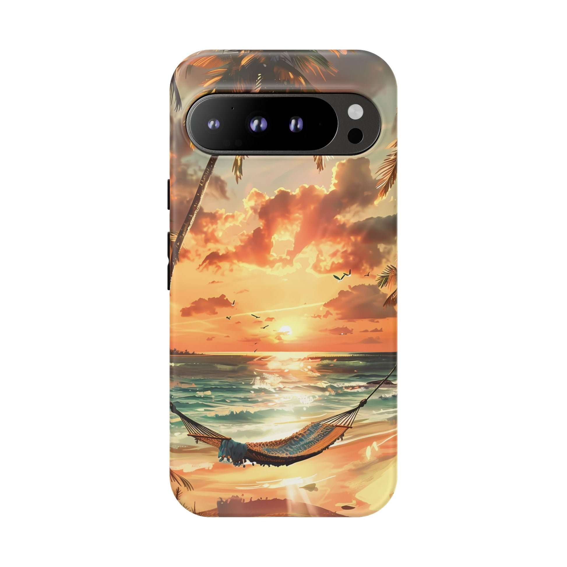 Experience the ultimate in relaxation with this stunning cell phone cover, featuring a watercolor scene of a tropical beach at sunset. The serene setting, with palm trees and a hammock swaying in the breeze, creates a calming and peaceful atmosphere, perfect for those who love the beach life.