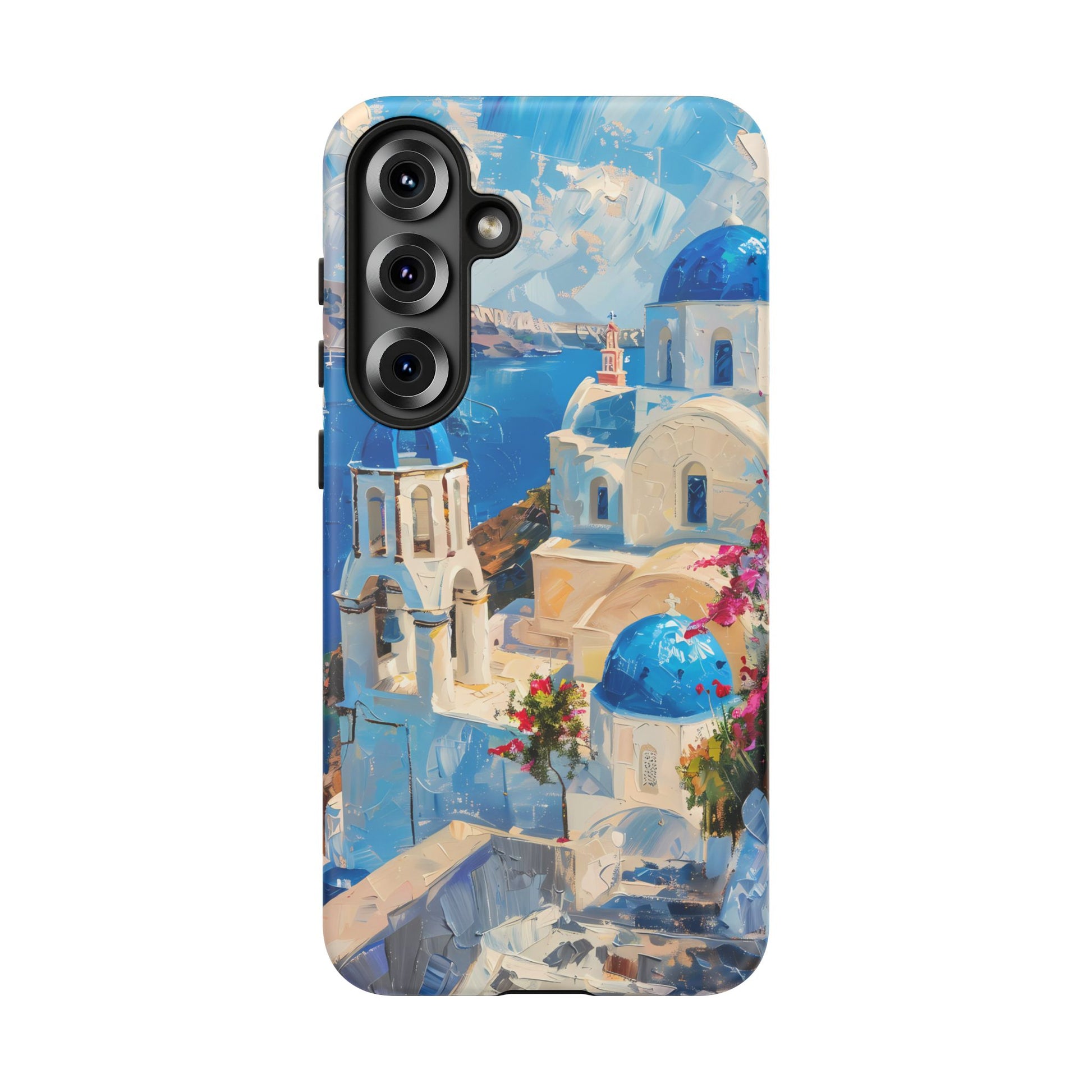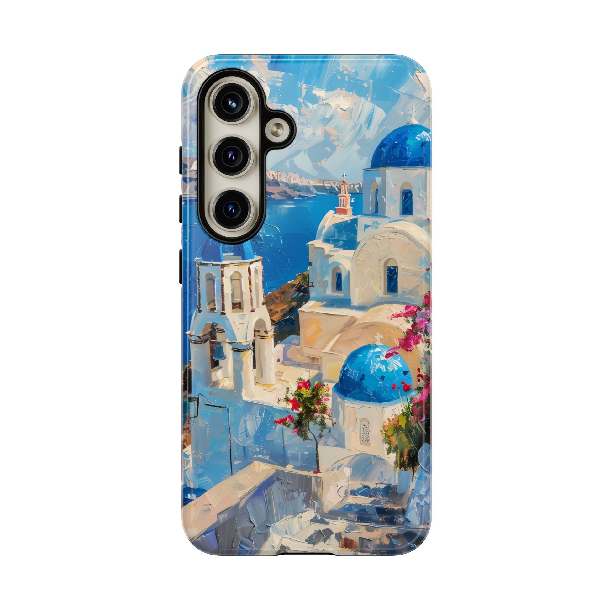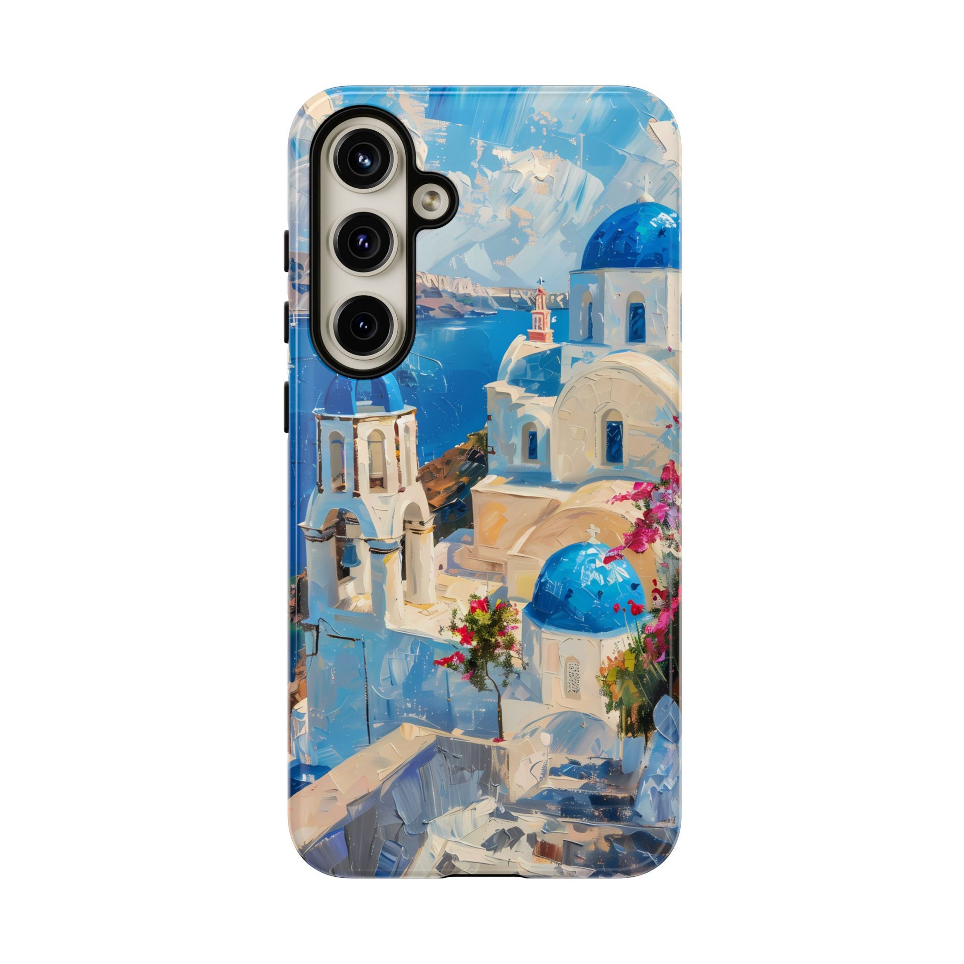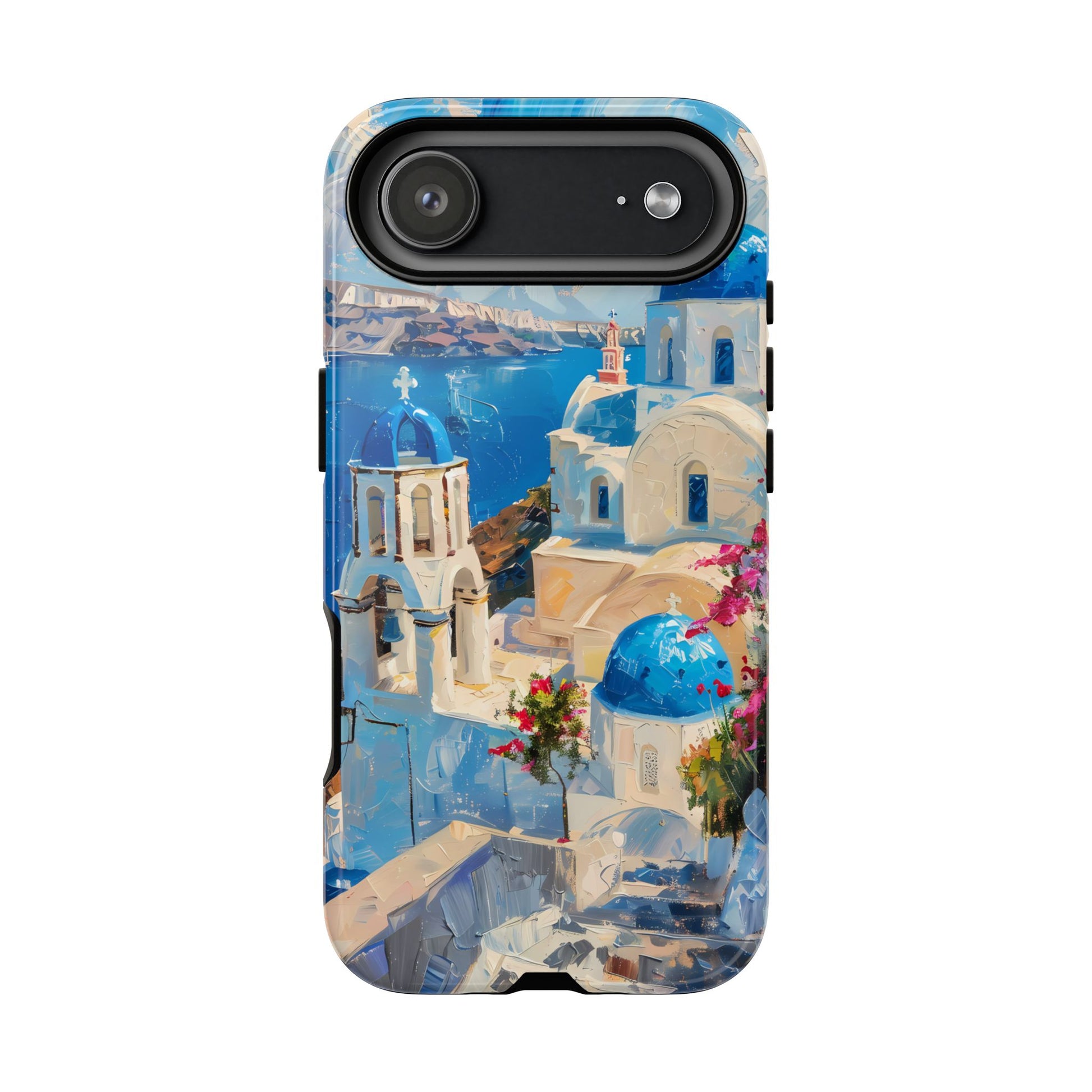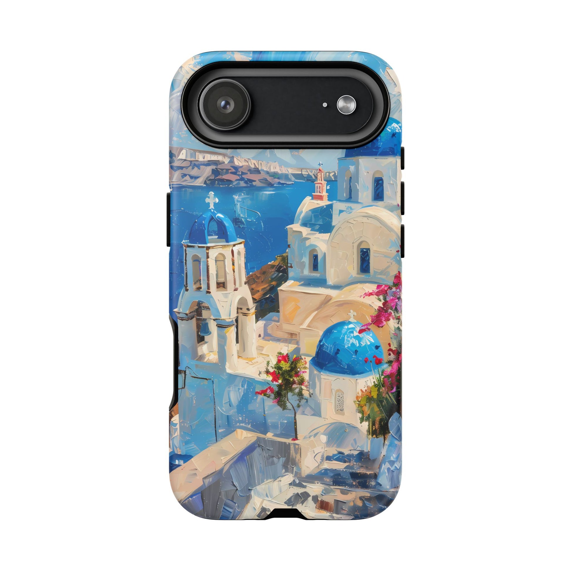 Celebrate the enchanting views of Santorini with this phone cover that features the iconic white-washed buildings and blue domes overlooking the Aegean Sea. The design’s soft pastel tones and serene composition make it a stylish accessory for anyone who loves the elegance of Mediterranean landscapes