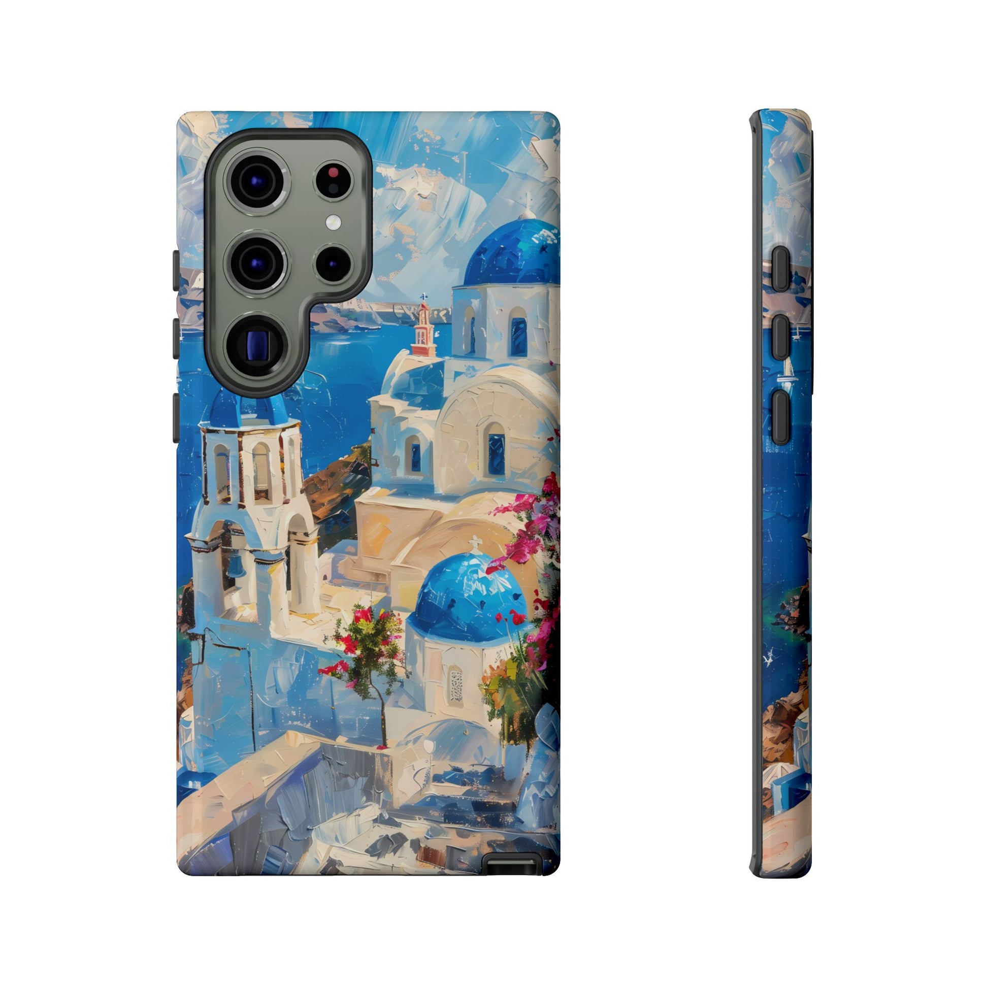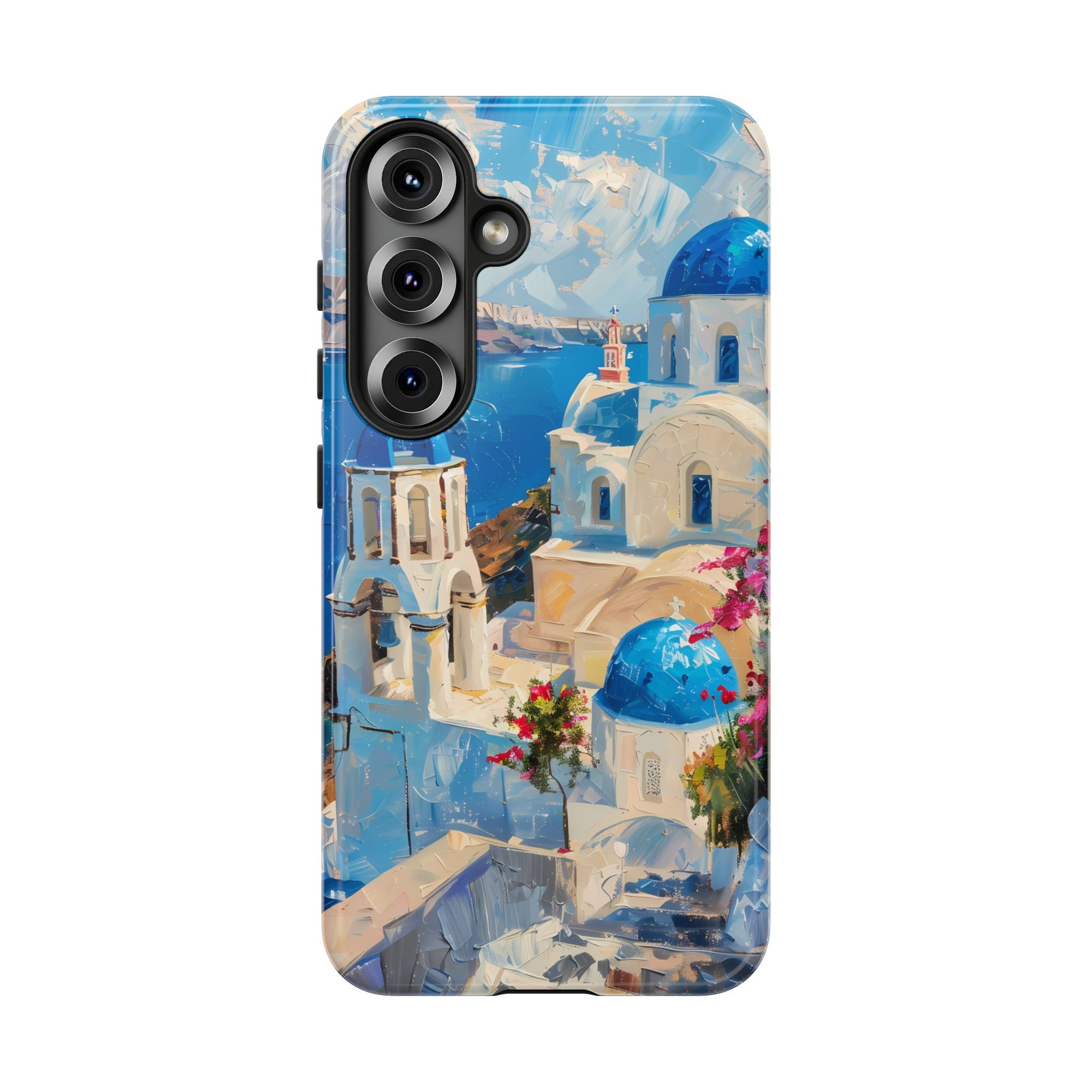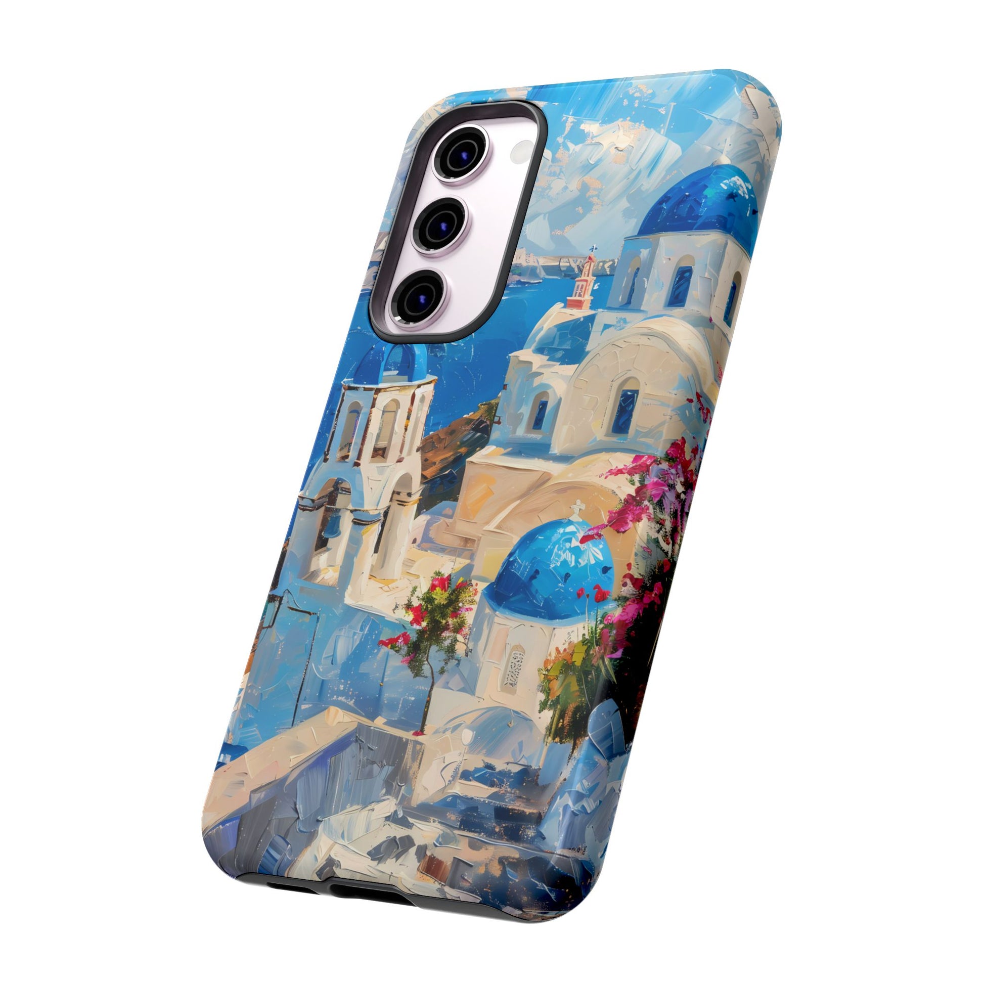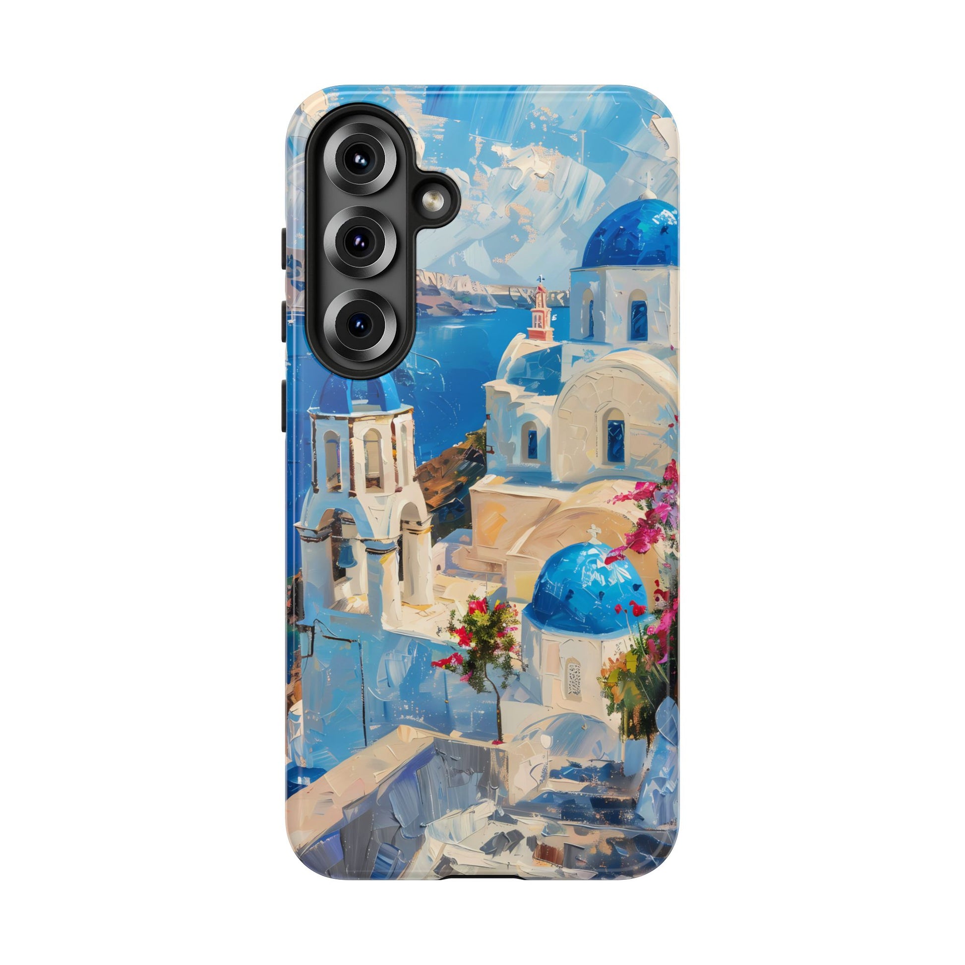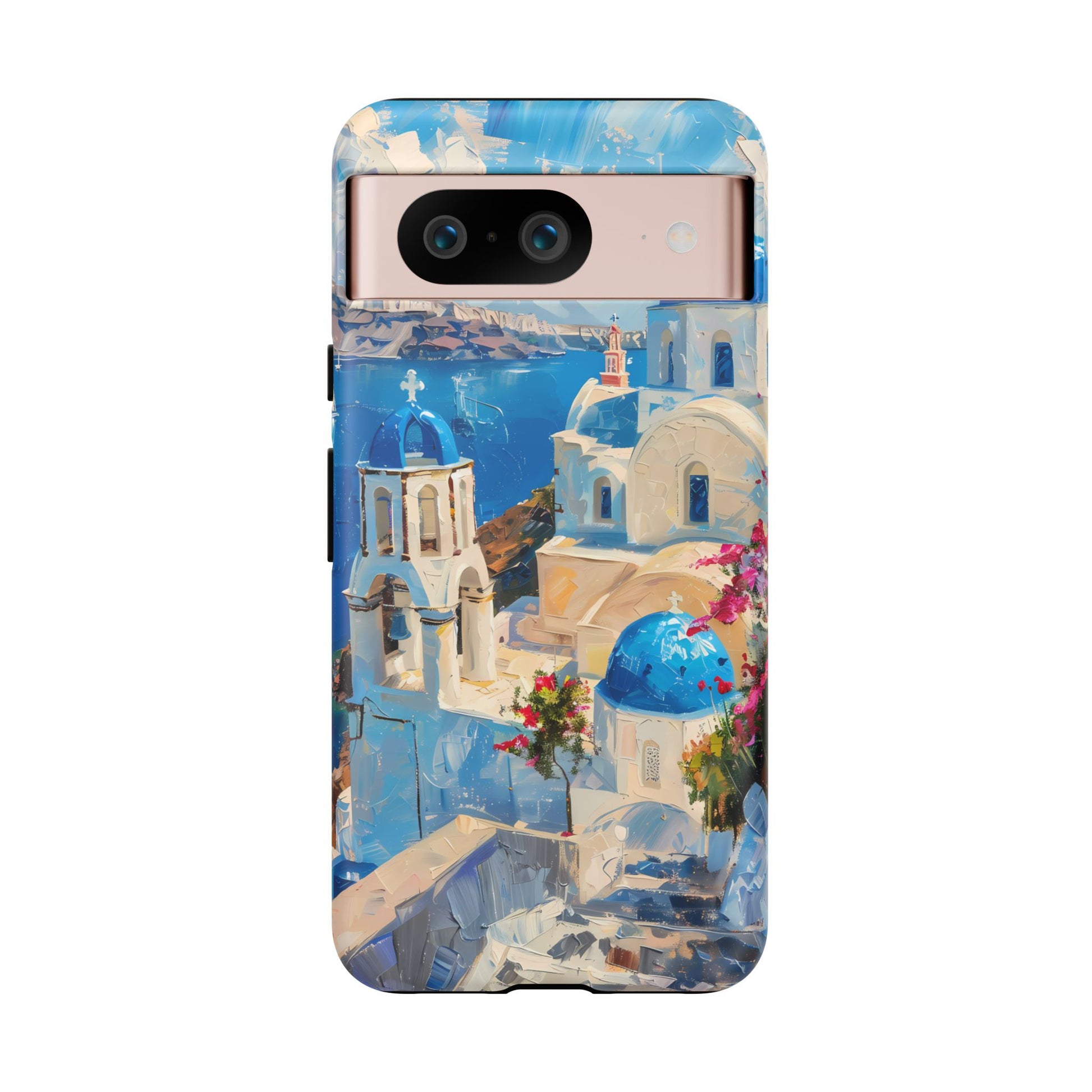 Celebrate the enchanting views of Santorini with this phone cover that features the iconic white-washed buildings and blue domes overlooking the Aegean Sea. The design’s soft pastel tones and serene composition make it a stylish accessory for anyone who loves the elegance of Mediterranean landscapes