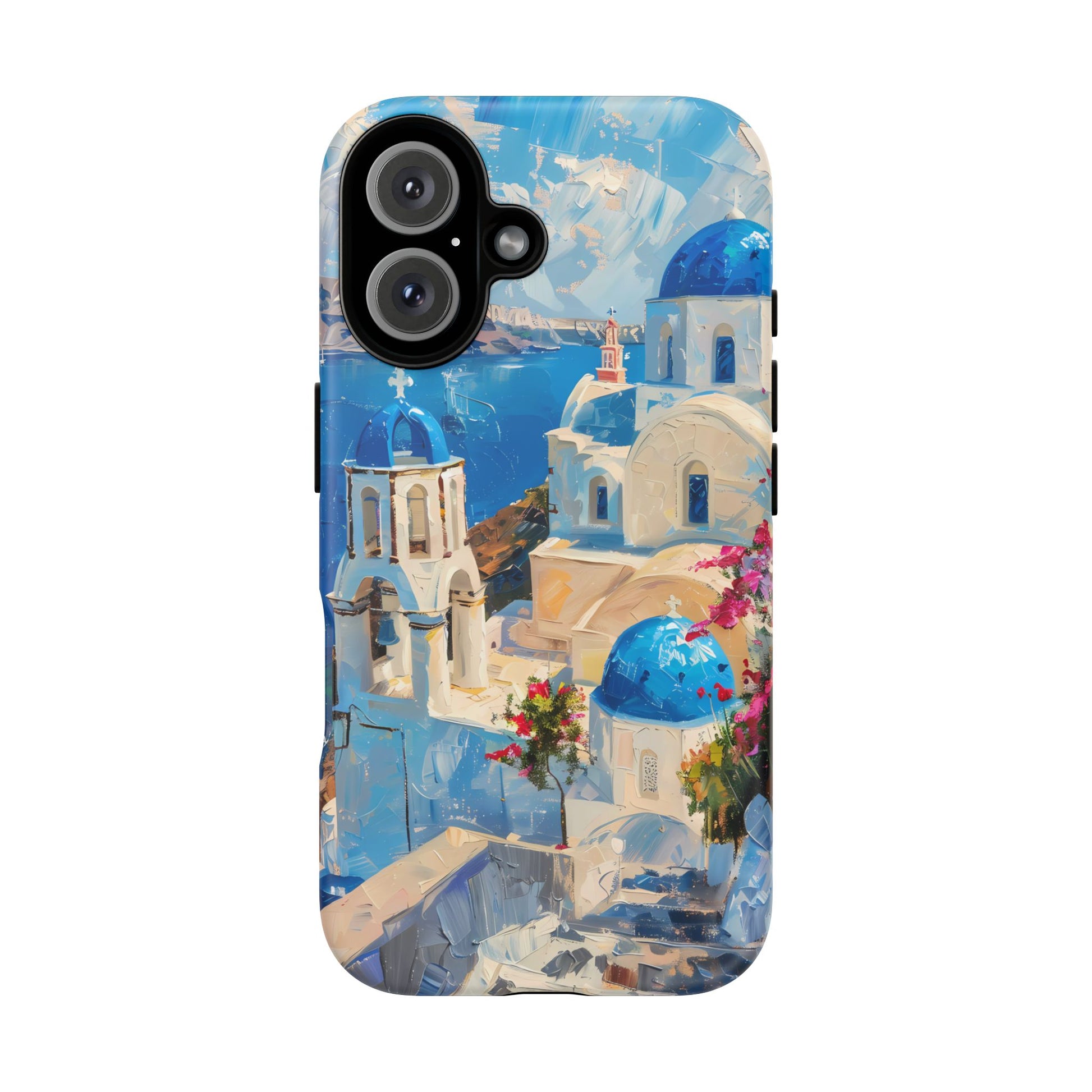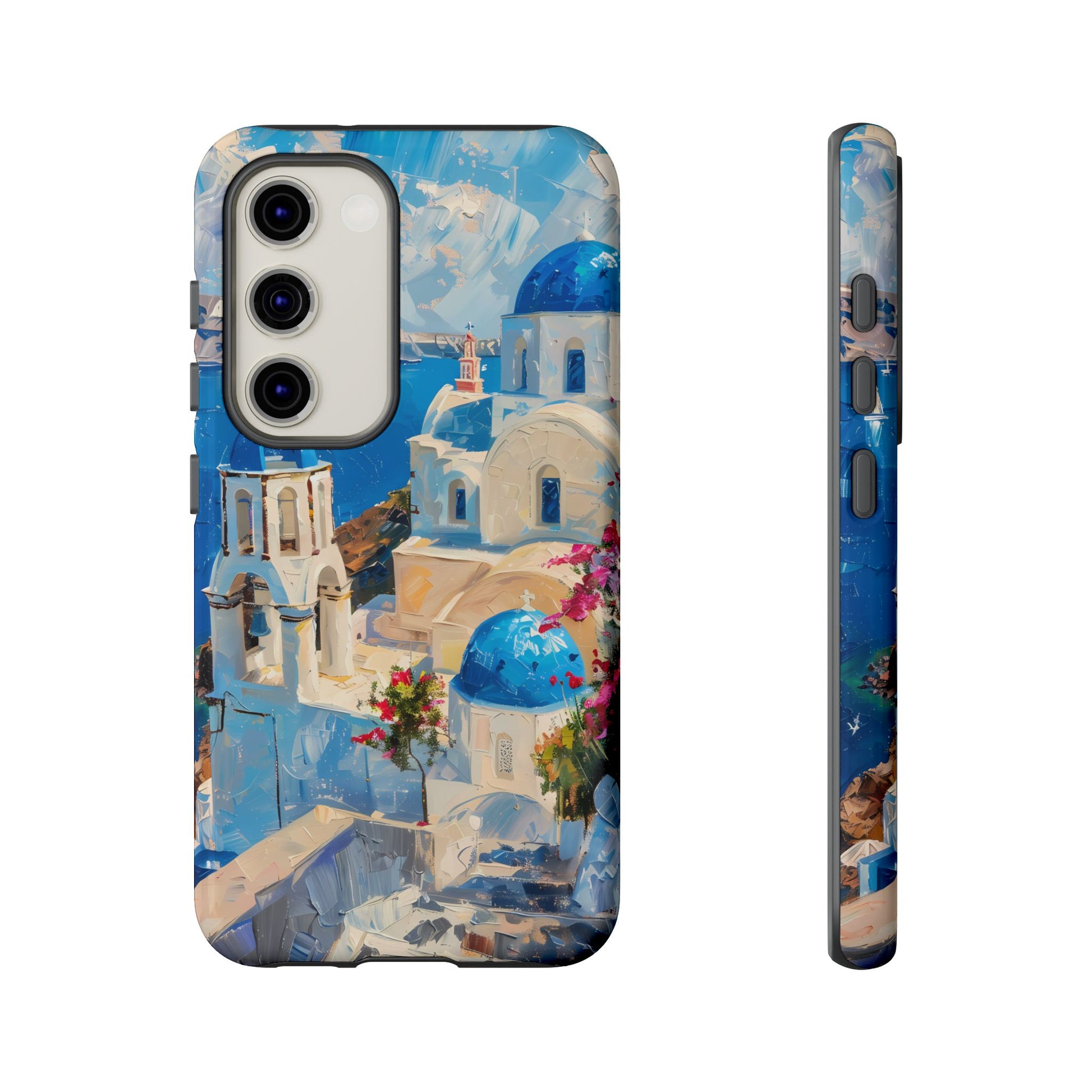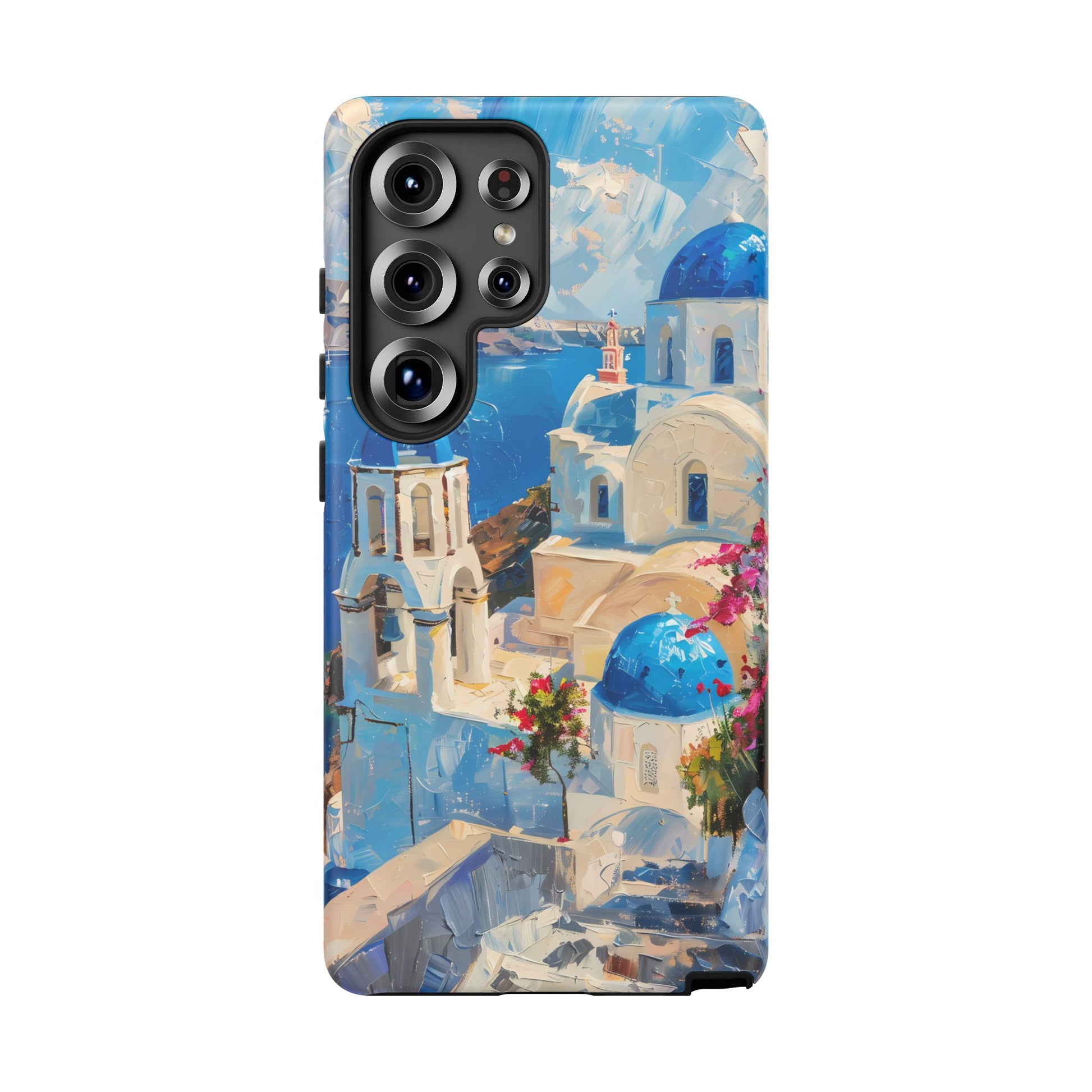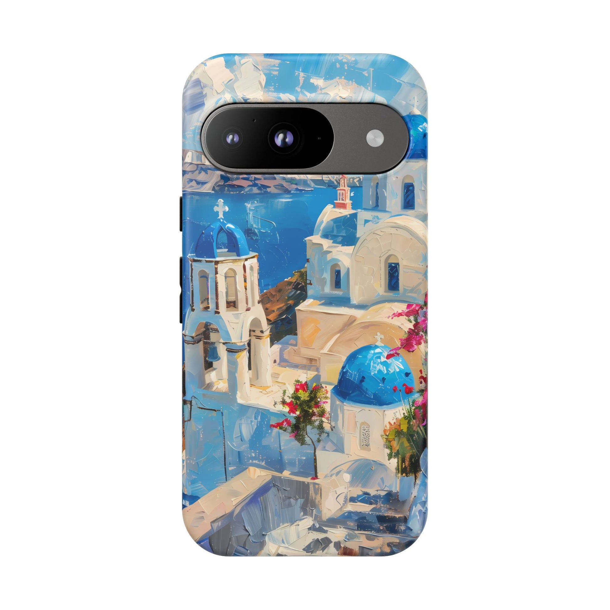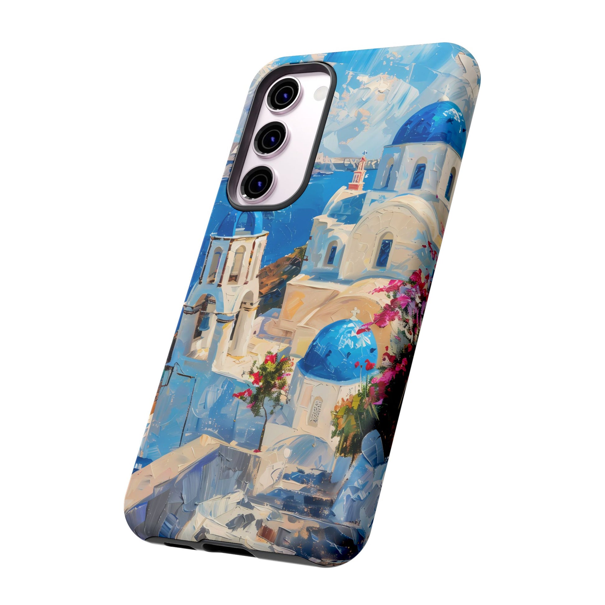 Celebrate the enchanting views of Santorini with this phone cover that features the iconic white-washed buildings and blue domes overlooking the Aegean Sea. The design’s soft pastel tones and serene composition make it a stylish accessory for anyone who loves the elegance of Mediterranean landscapes