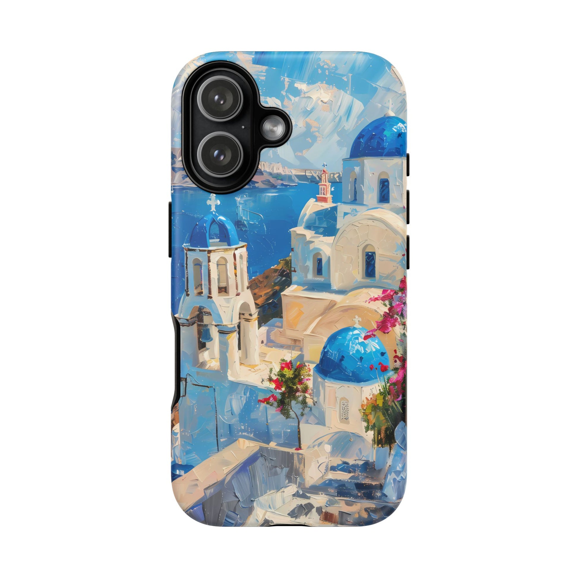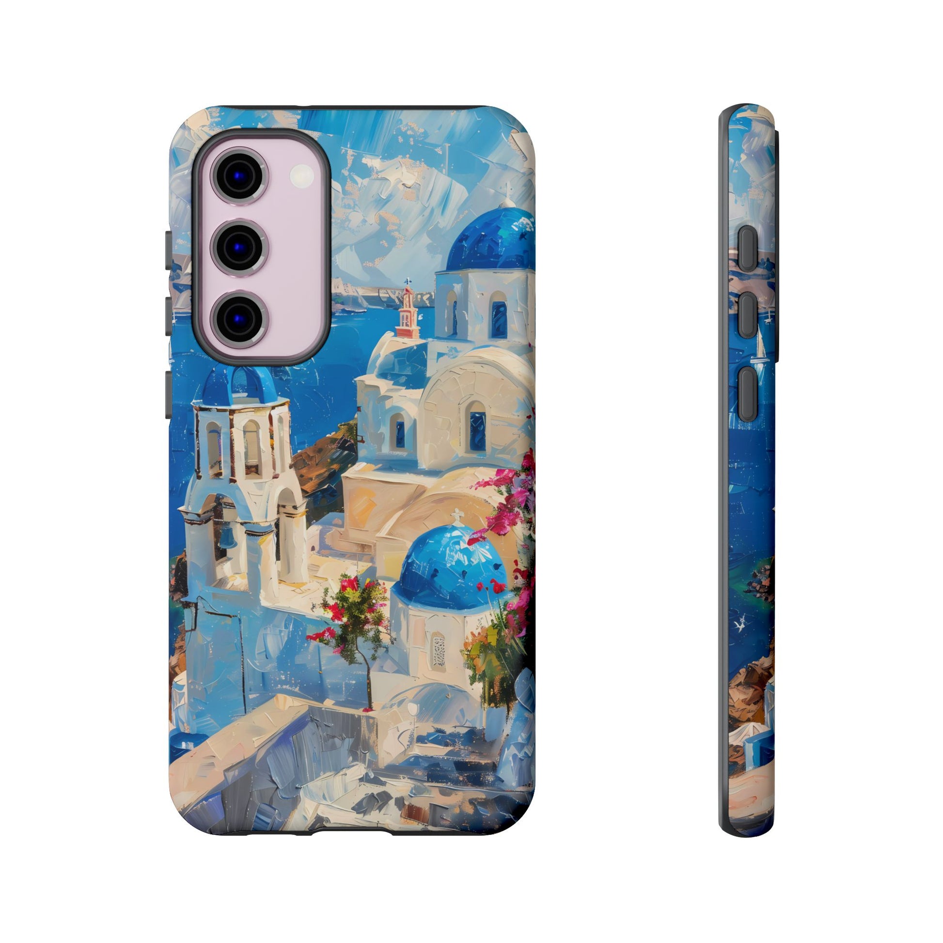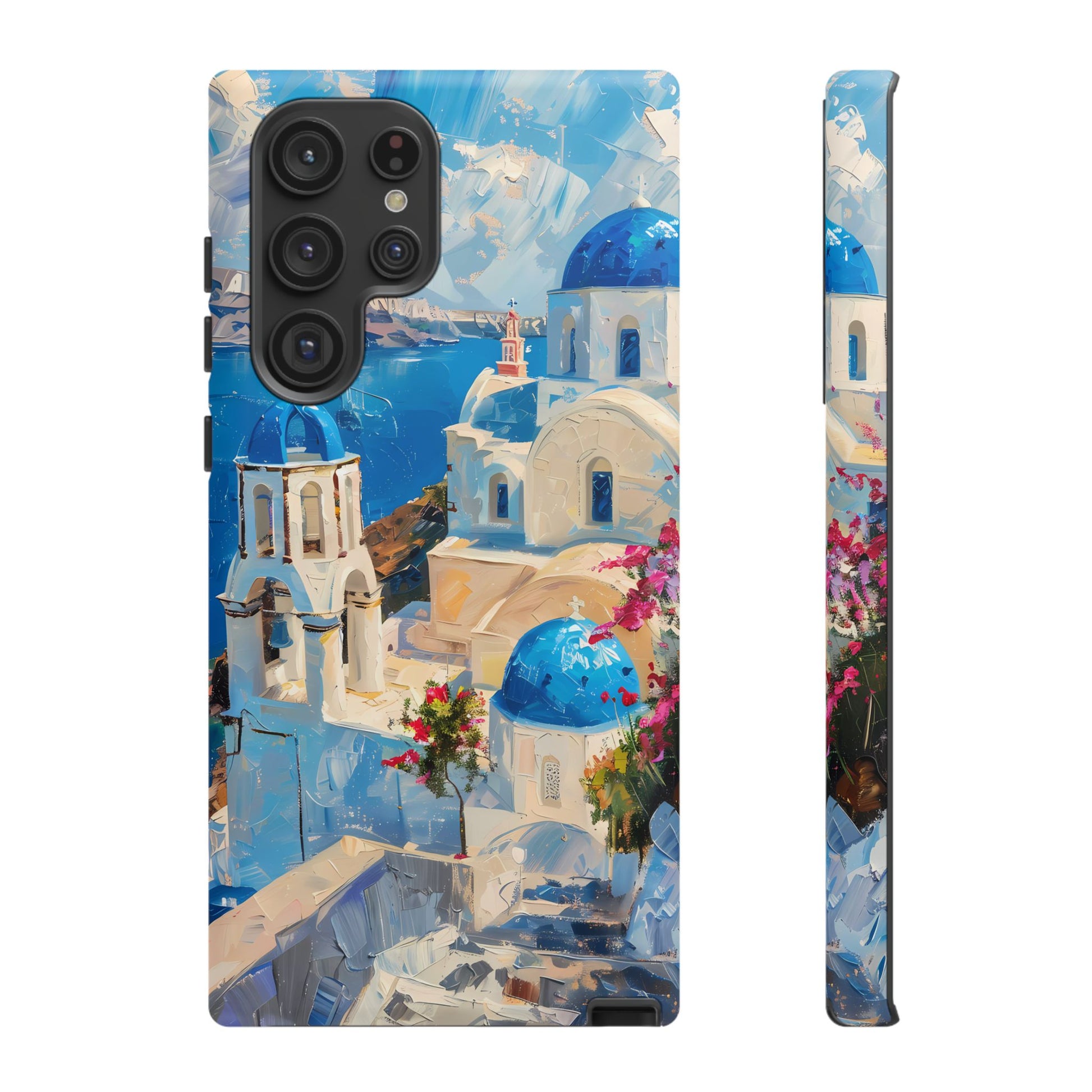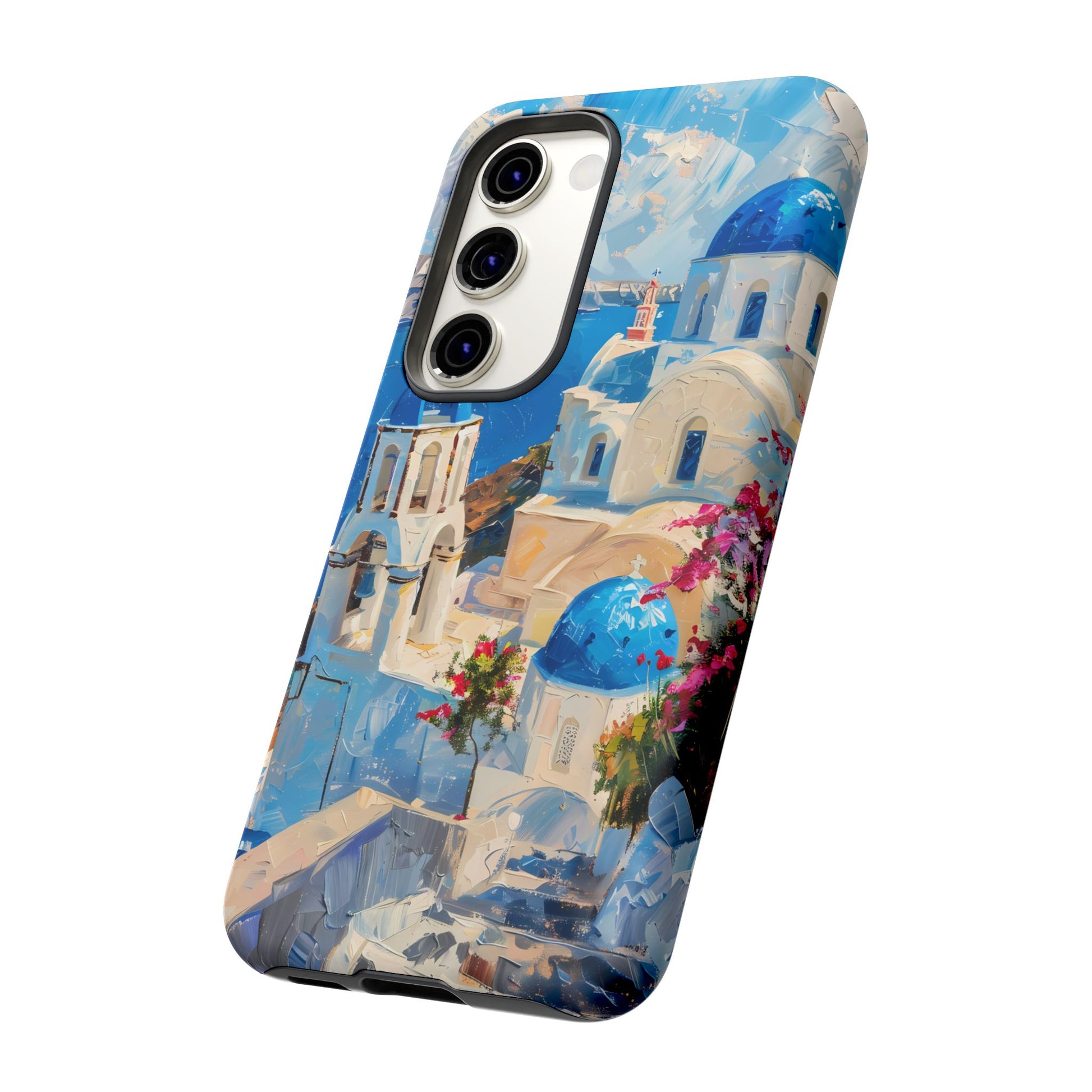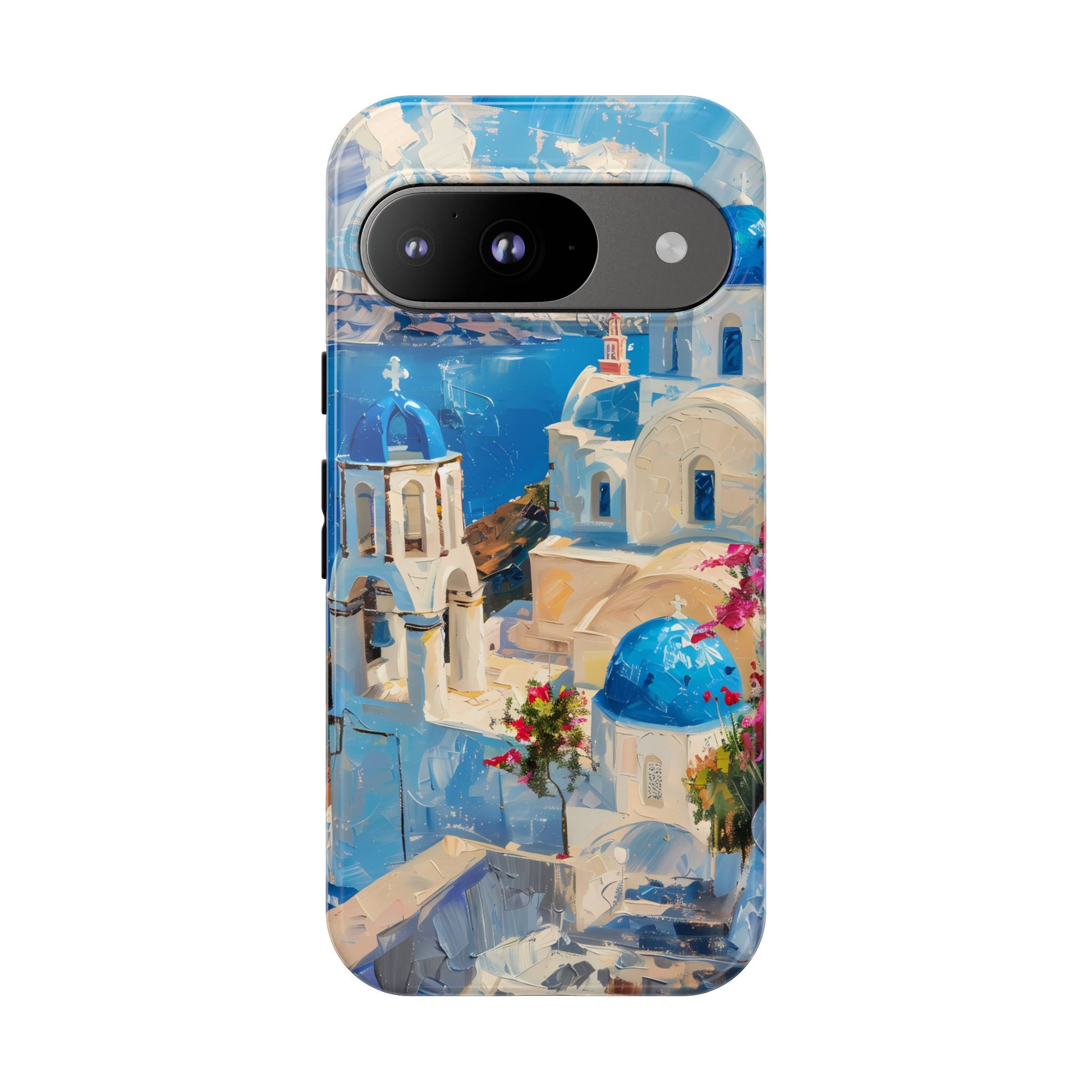 Celebrate the enchanting views of Santorini with this phone cover that features the iconic white-washed buildings and blue domes overlooking the Aegean Sea. The design’s soft pastel tones and serene composition make it a stylish accessory for anyone who loves the elegance of Mediterranean landscapes