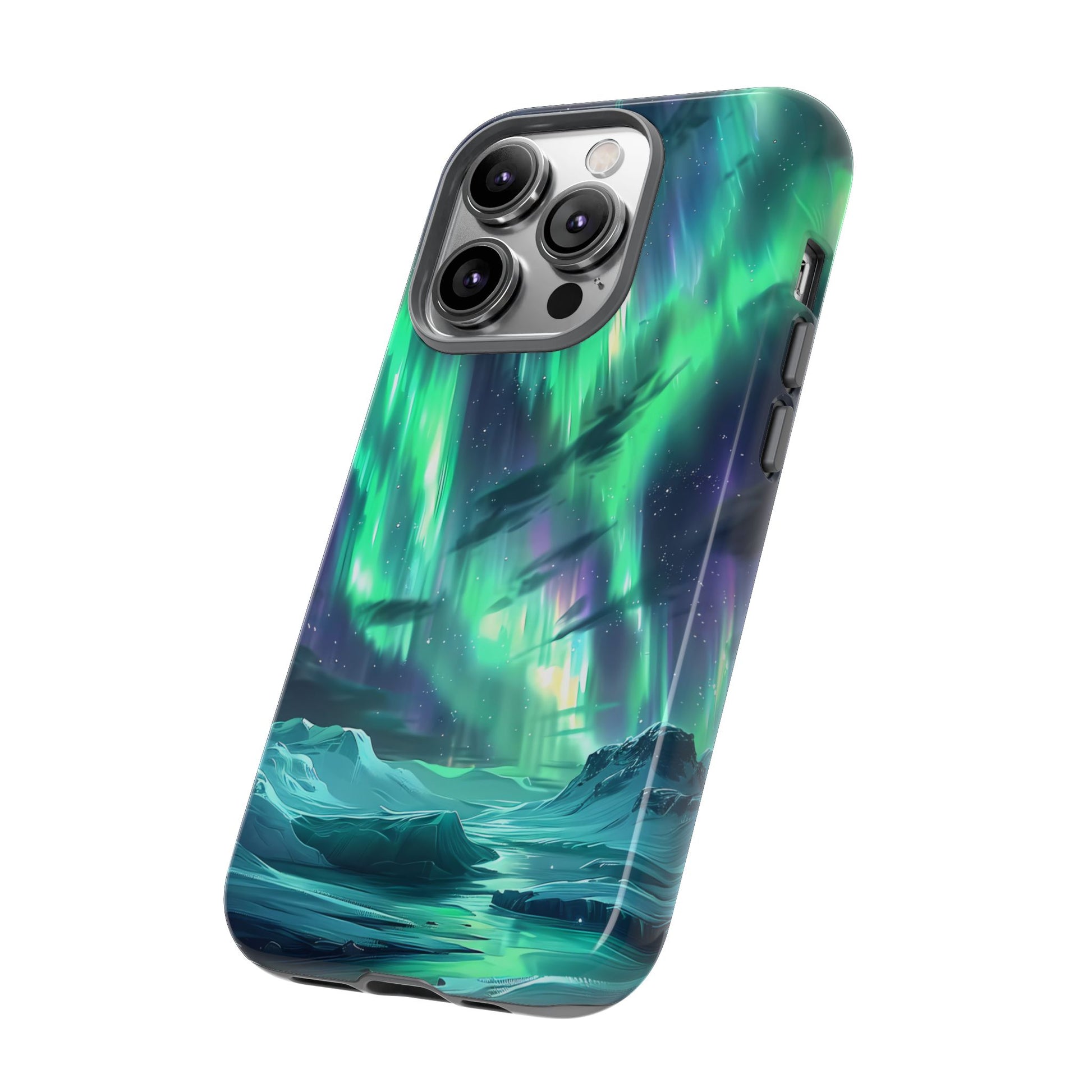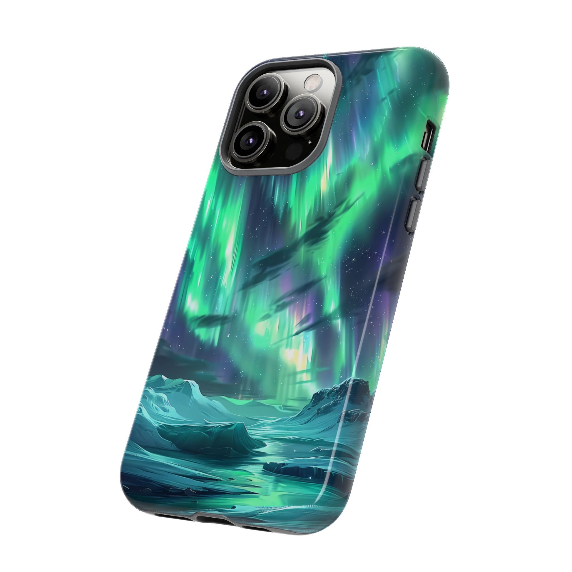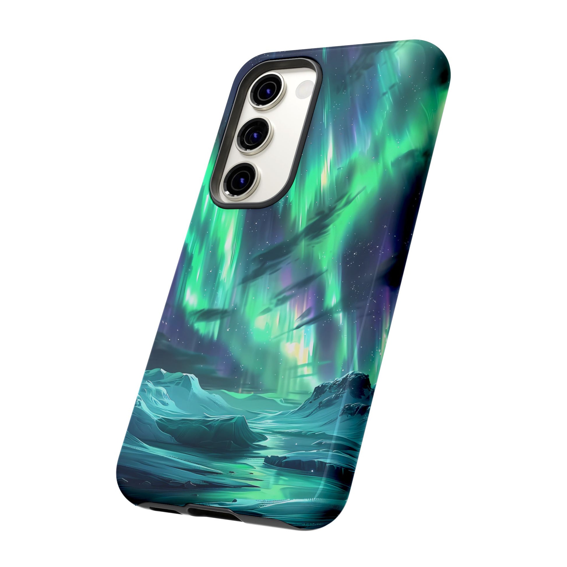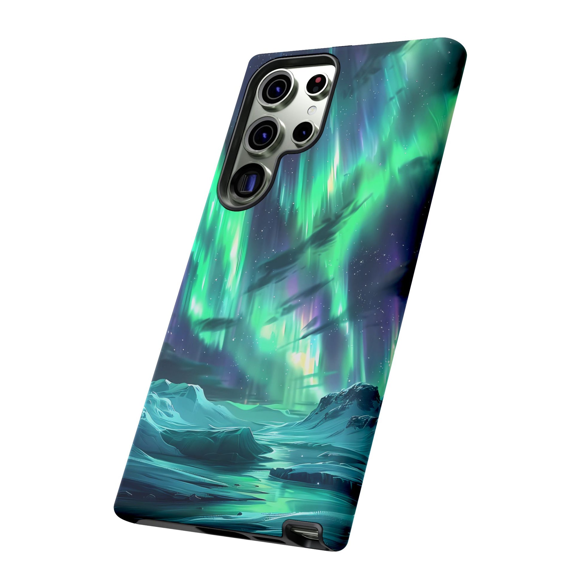Delight in the wonder of the Northern Lights with this enchanting cell phone cover. Featuring a snowy Icelandic landscape bathed in the vibrant hues of the aurora, this design combines glowing greens and purples for a truly mesmerizing visual experience.