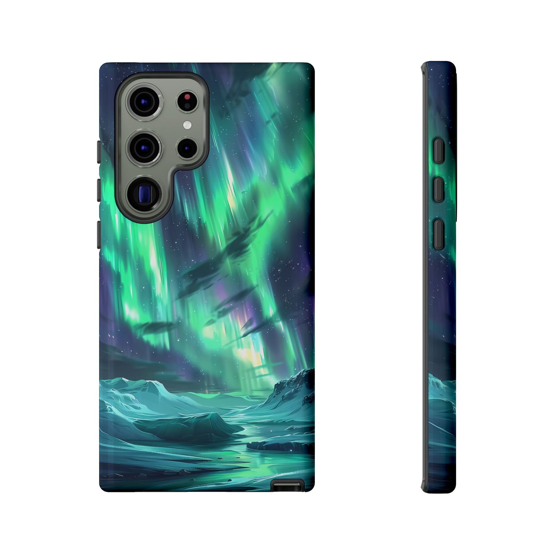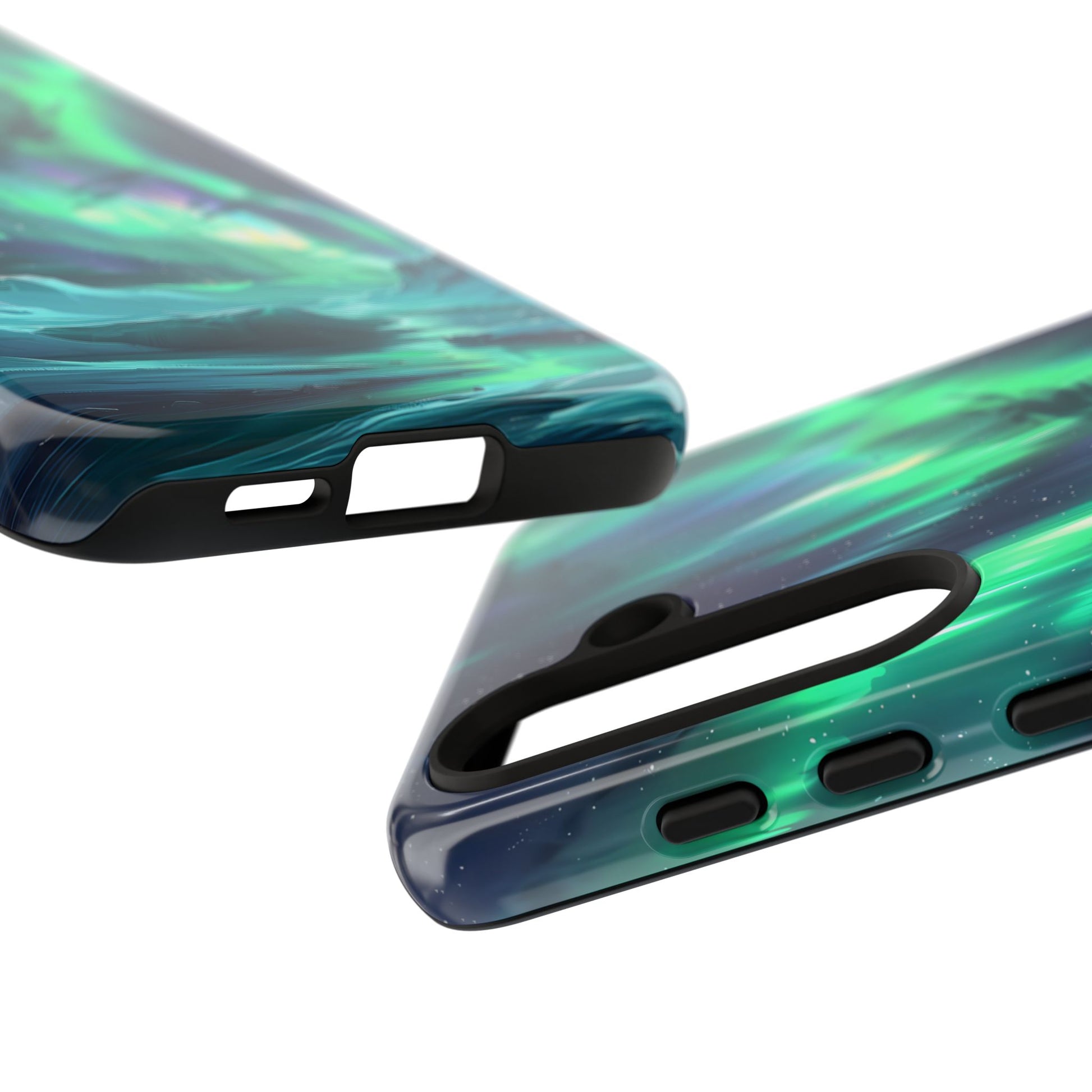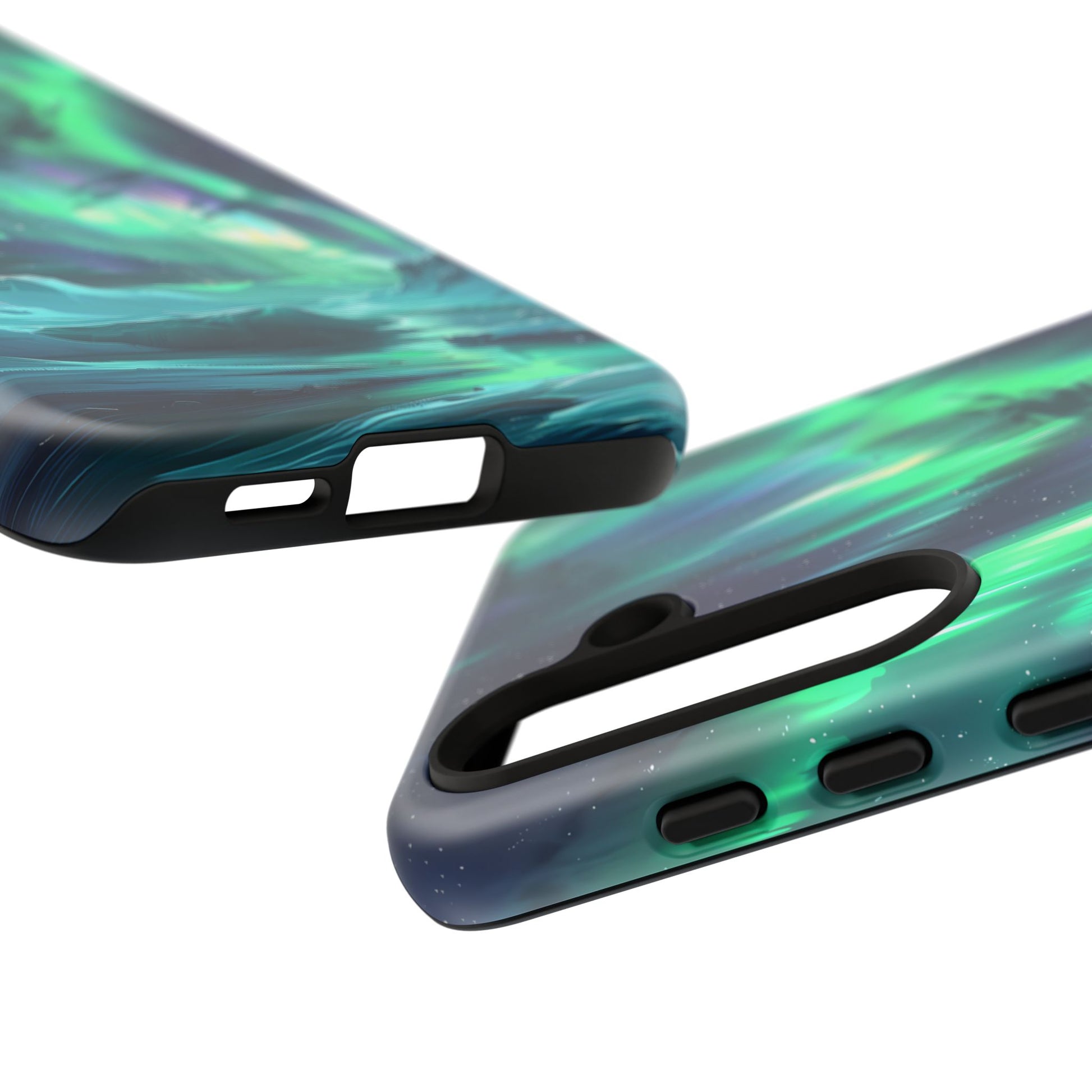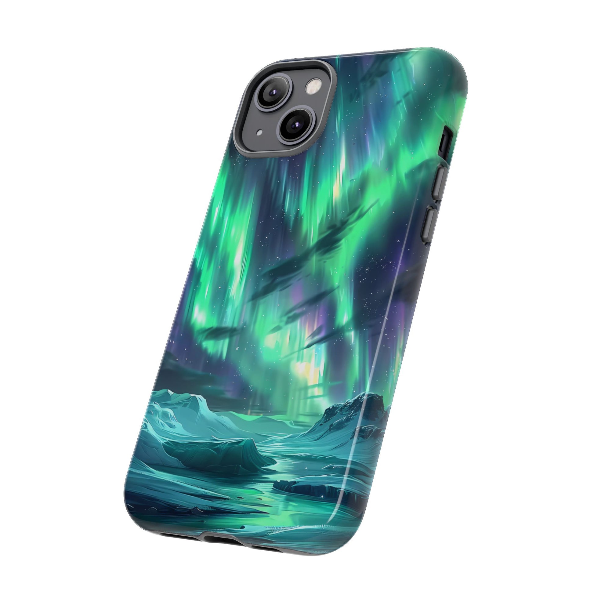 Delight in the wonder of the Northern Lights with this enchanting cell phone cover. Featuring a snowy Icelandic landscape bathed in the vibrant hues of the aurora, this design combines glowing greens and purples for a truly mesmerizing visual experience.